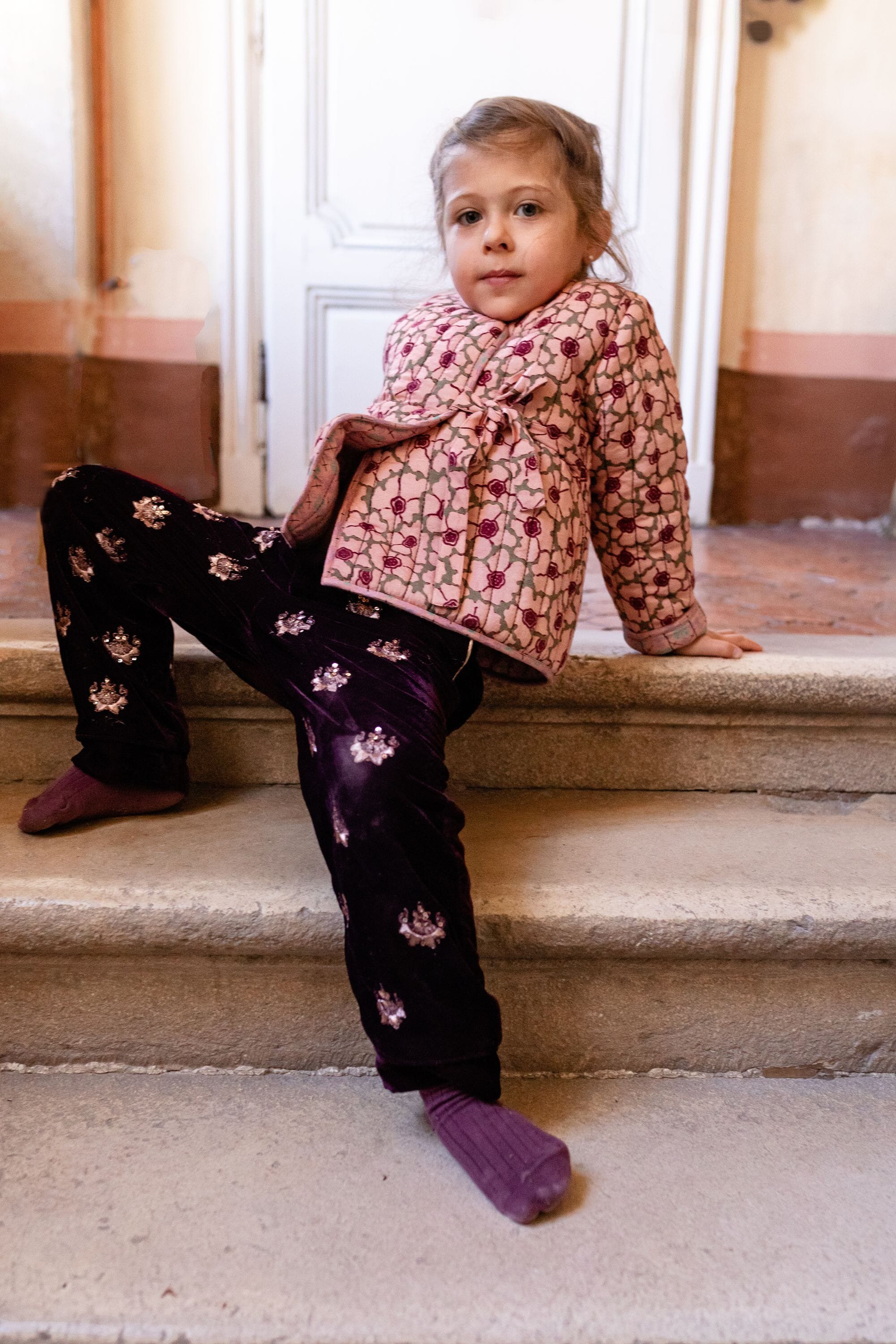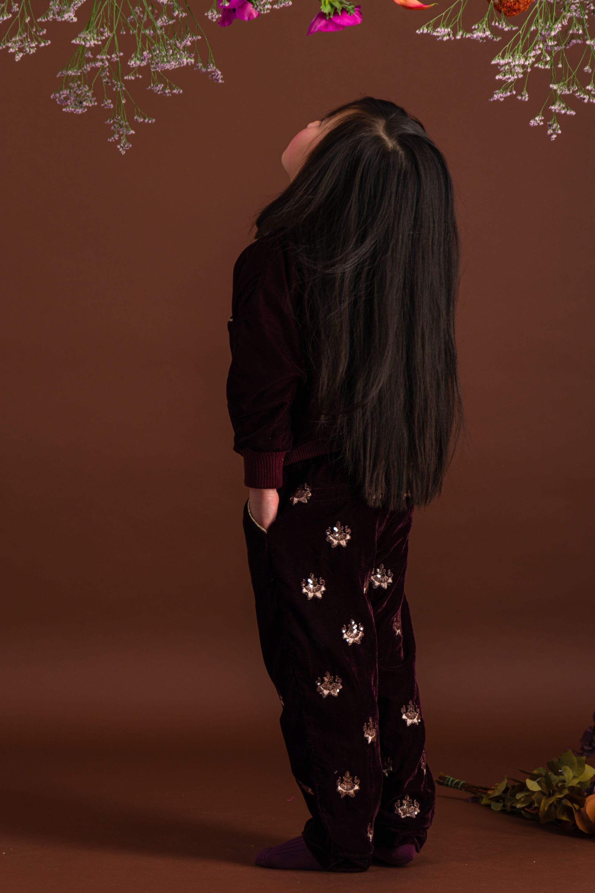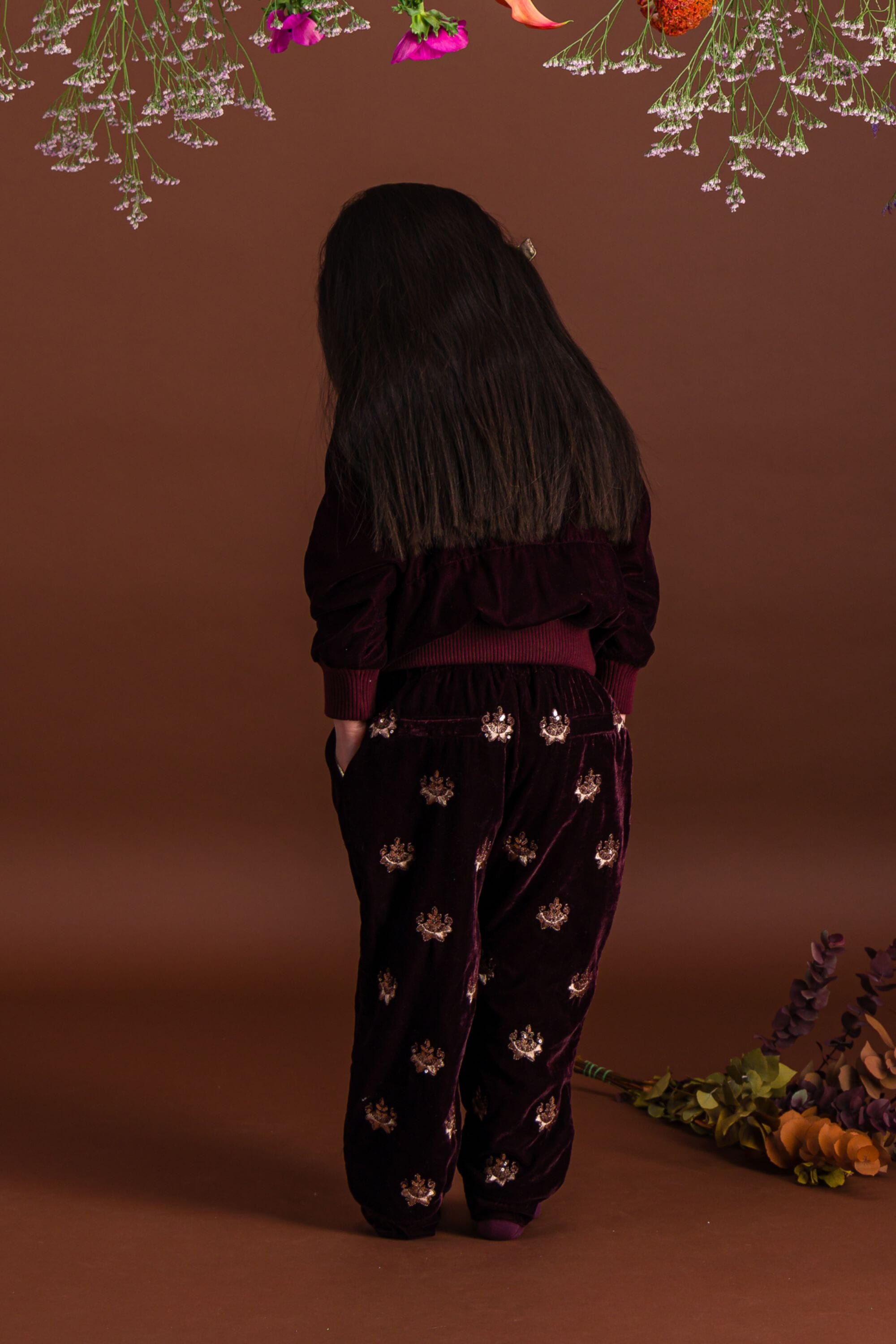 - Pant, Velvet, Prune color, Plain and contrasted lining in organic cotton voile, Fully hand-embroidered, Golden piping on the pockets, Front pockets, Back pockets, Elasticated at the waist, Elasticated bottom legs.