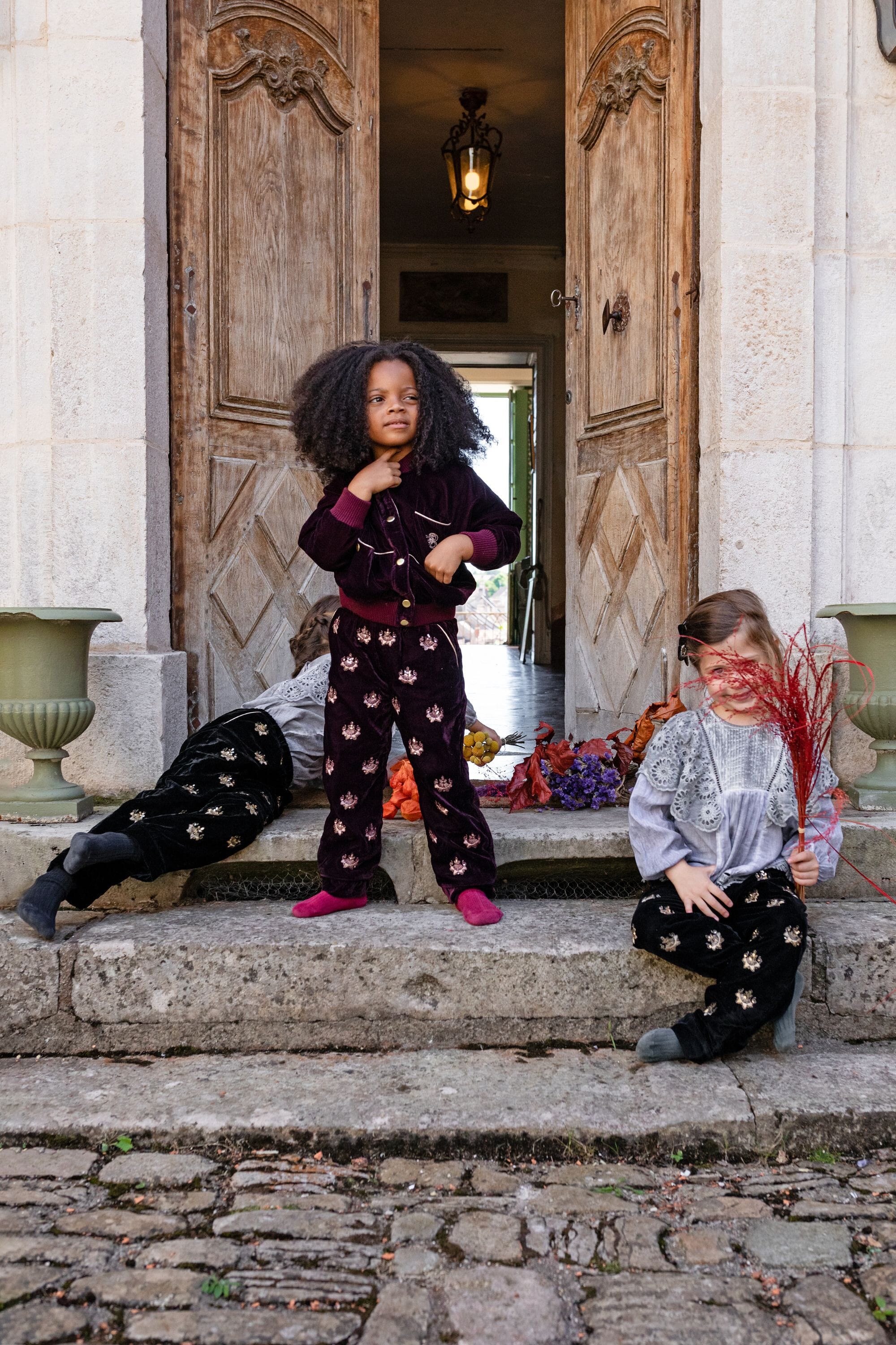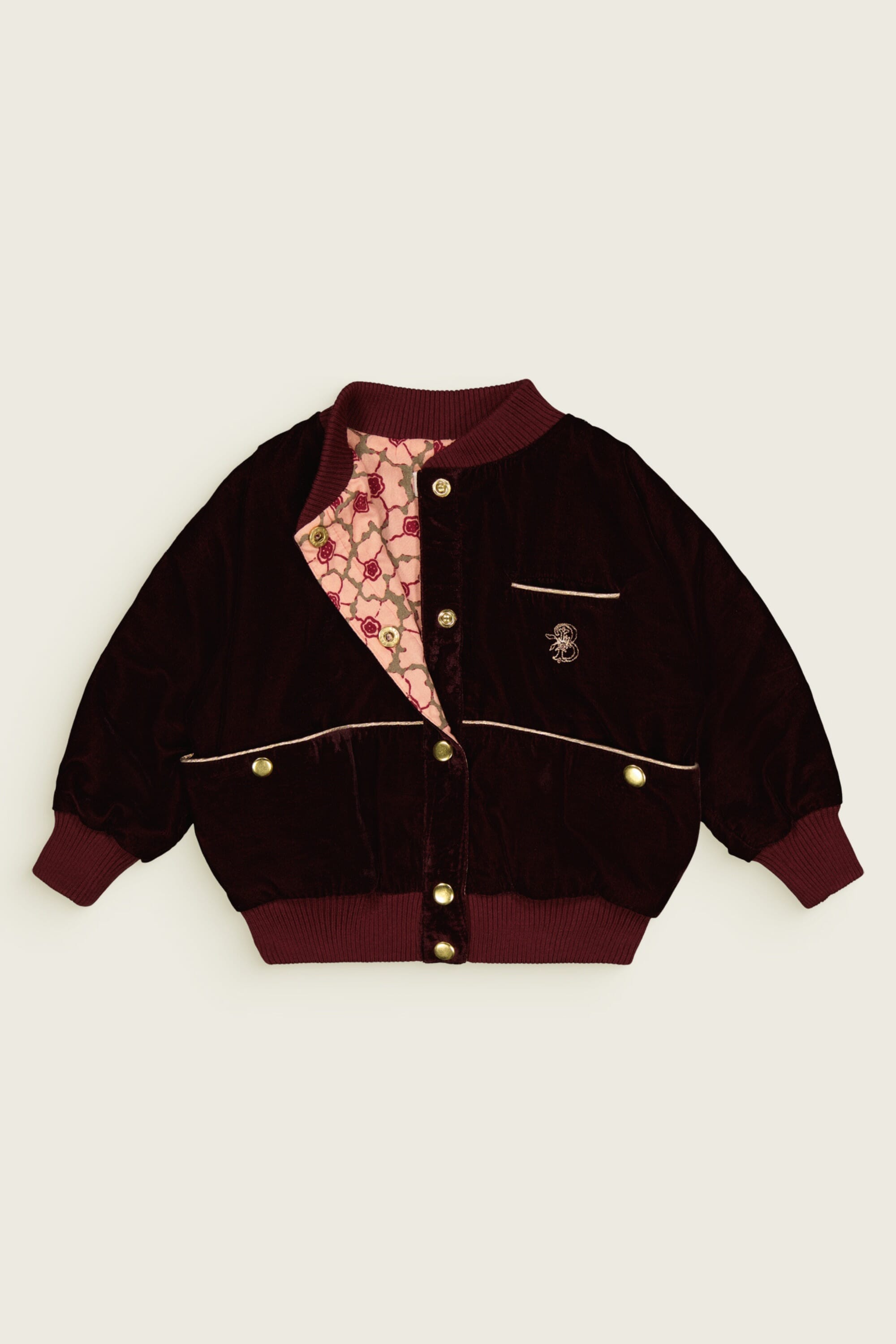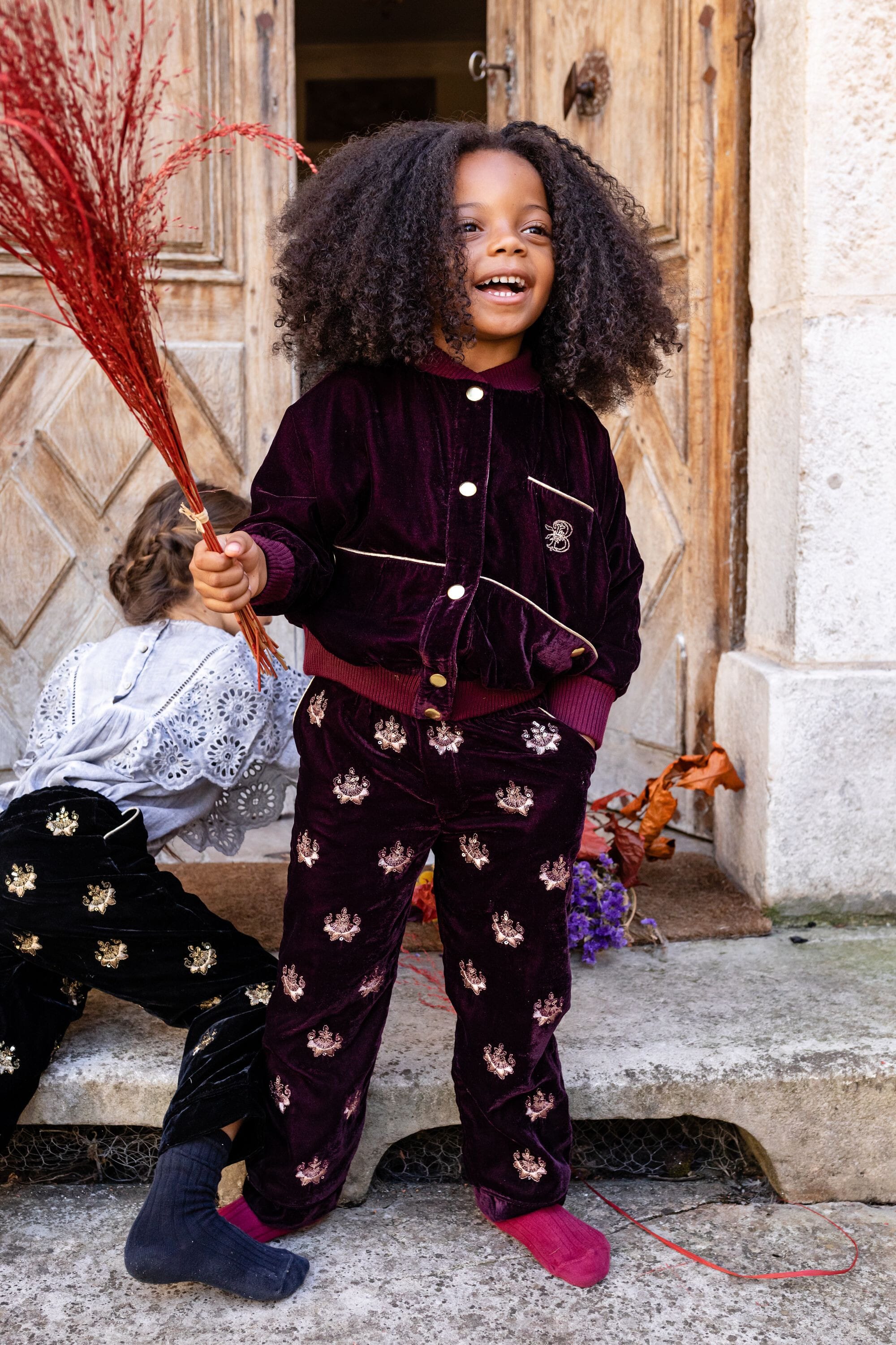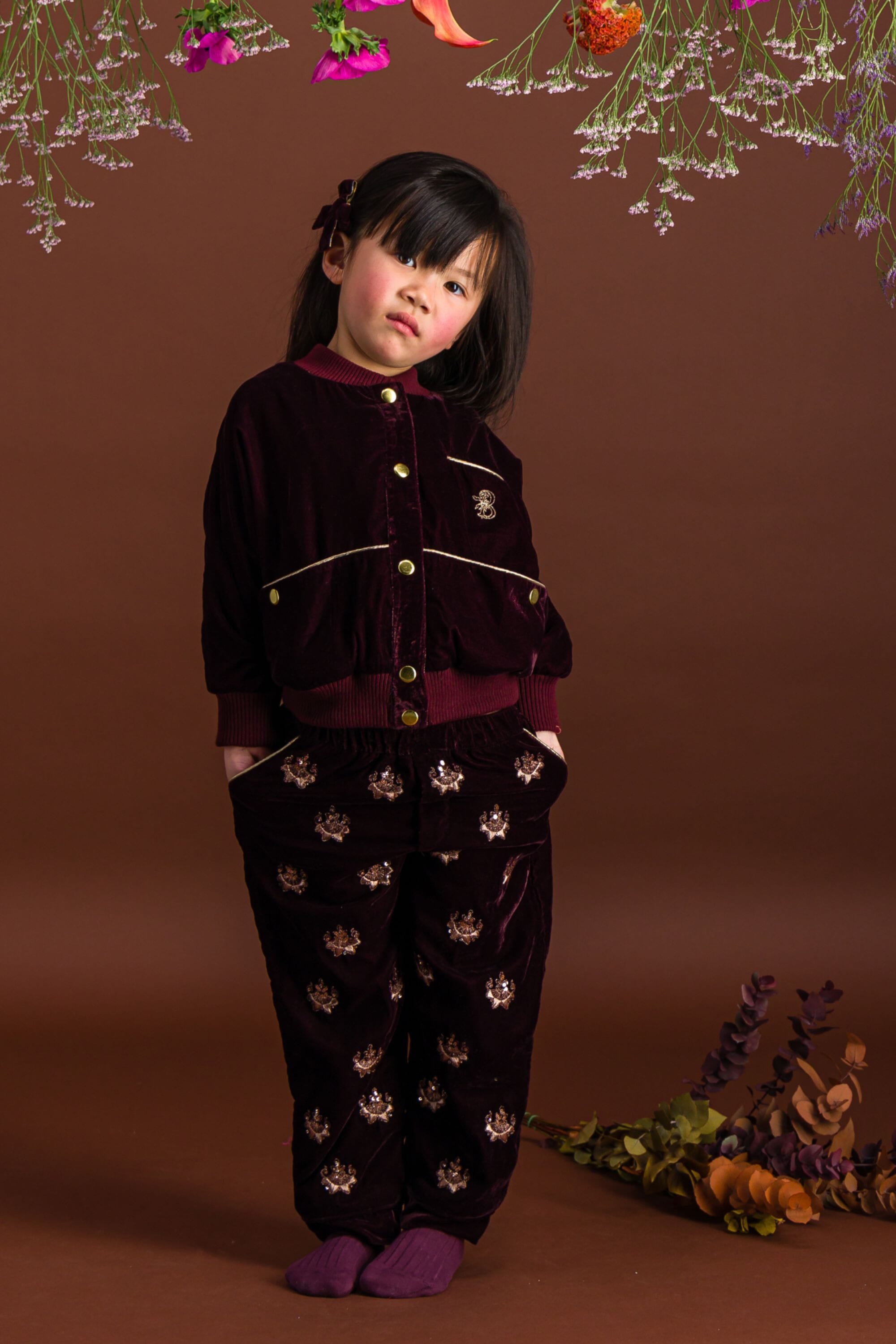 A pant in a Prune velvet color fully hand-embroidered with a golden piping on the pockets. The great novelty of our collection!