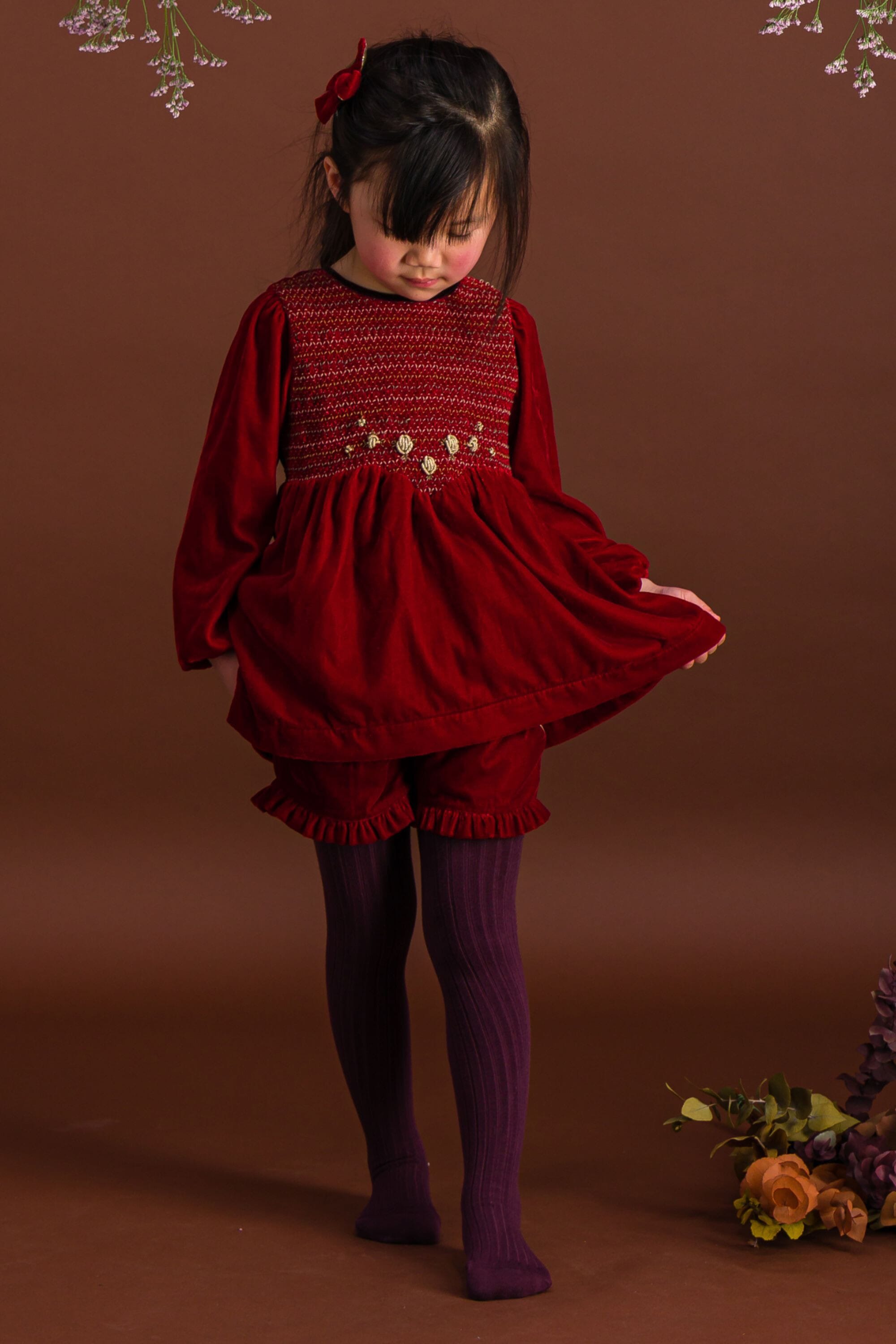 A very comfortable shorts in a Pomme d’amour color velvet with a multicolor embroidered smocks with lace finishing and a golden lining on the pockets.