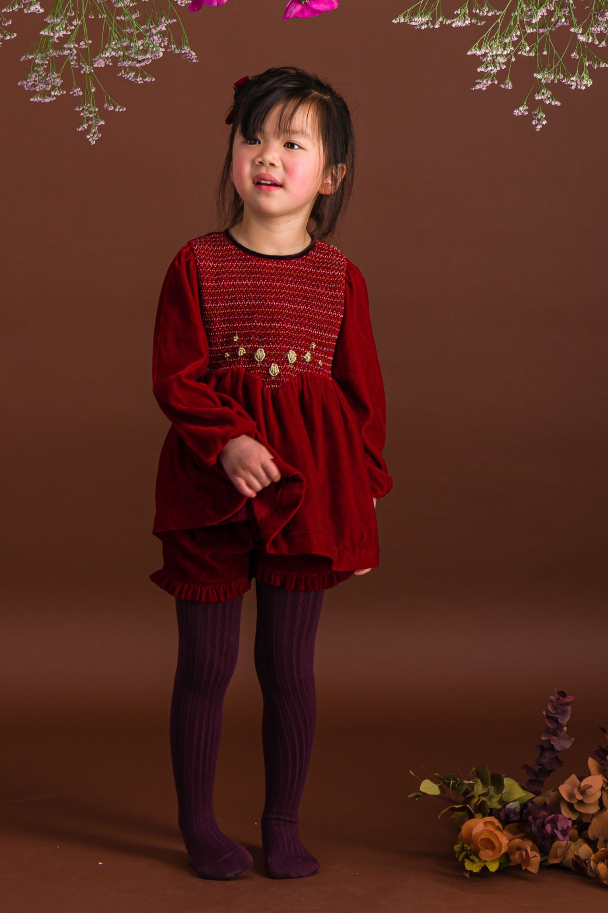 - Shorts, Velvet, Pomme d’amour color, Plain and contrasted lining in organic cotton voile, Multicolor embroidered smocks at the waist with lace finishing, Ruffles on the leg opening, Side pockets with golden piping.
