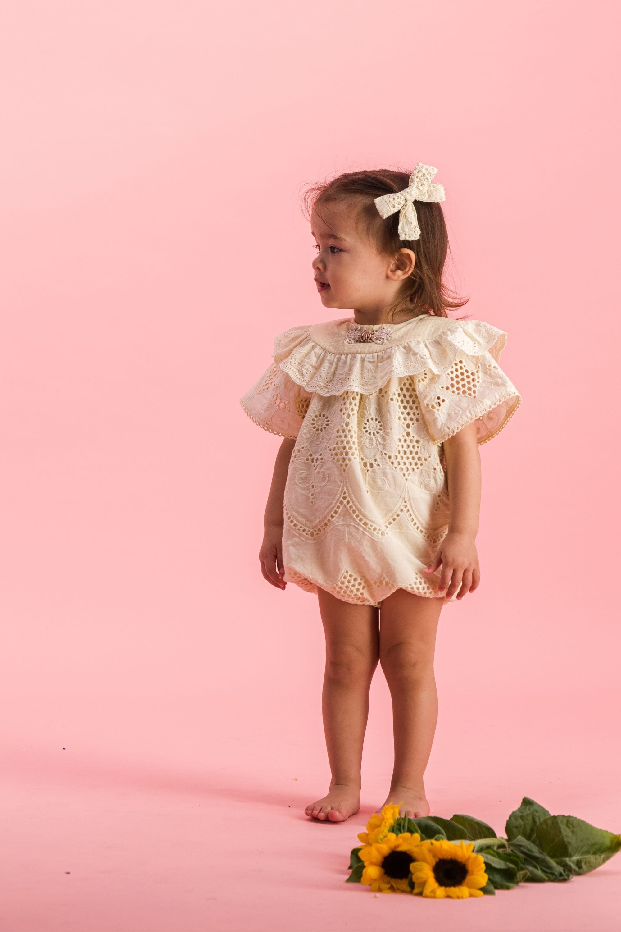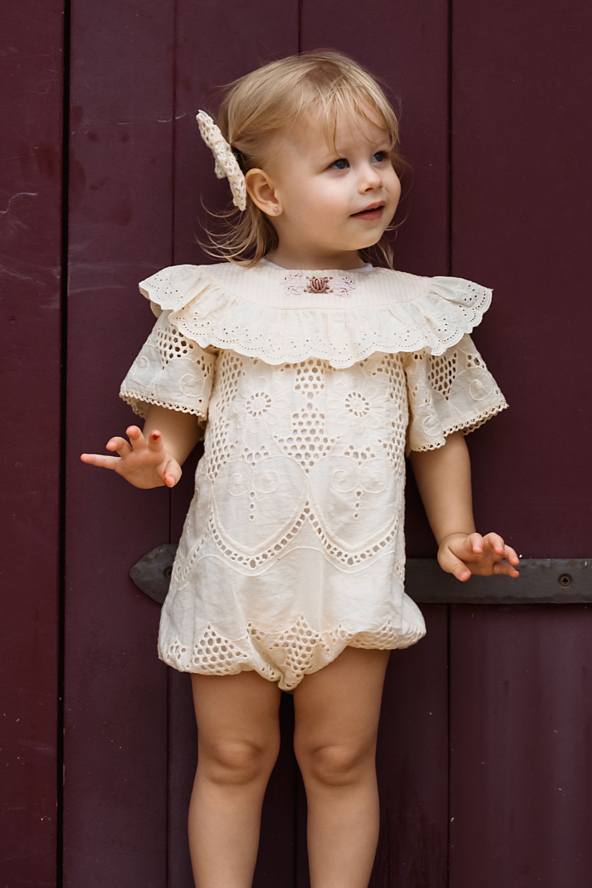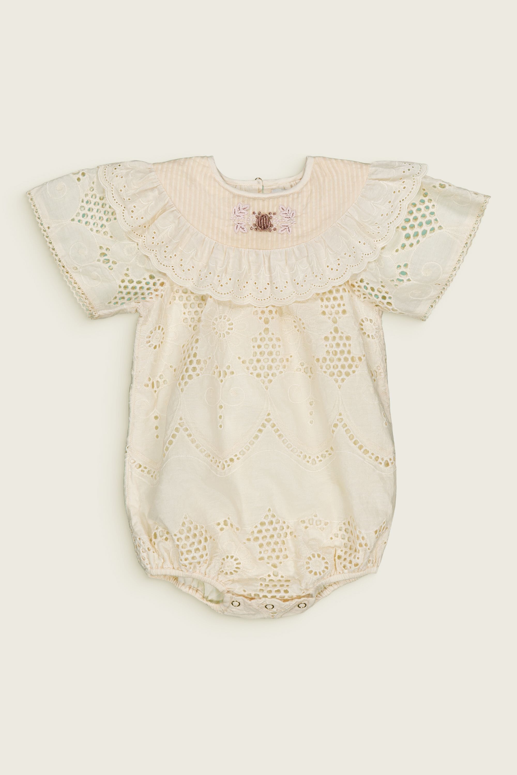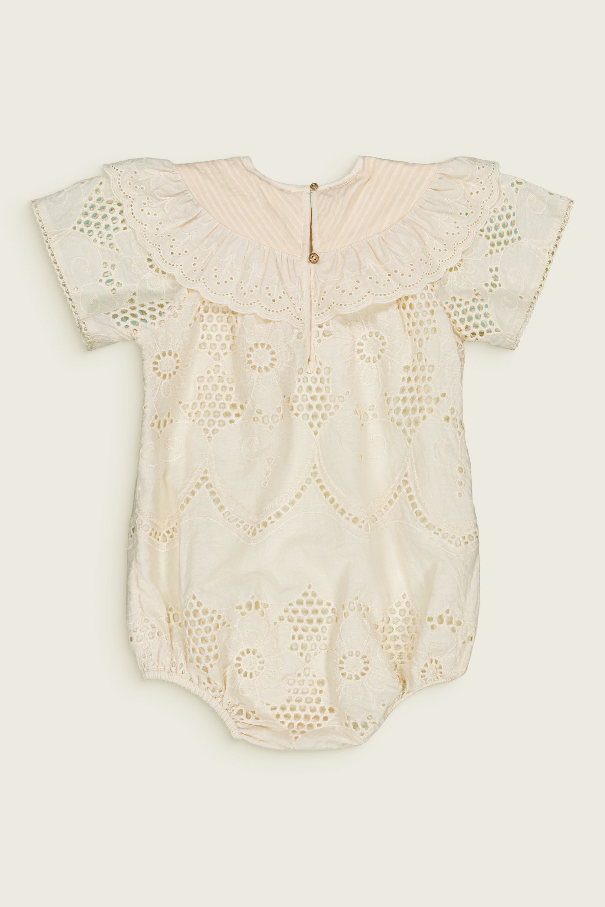 An extraordinary short sleeves romper in organic cotton with a hand embroidered collar and entirely decorated with Broderie anglaise.
