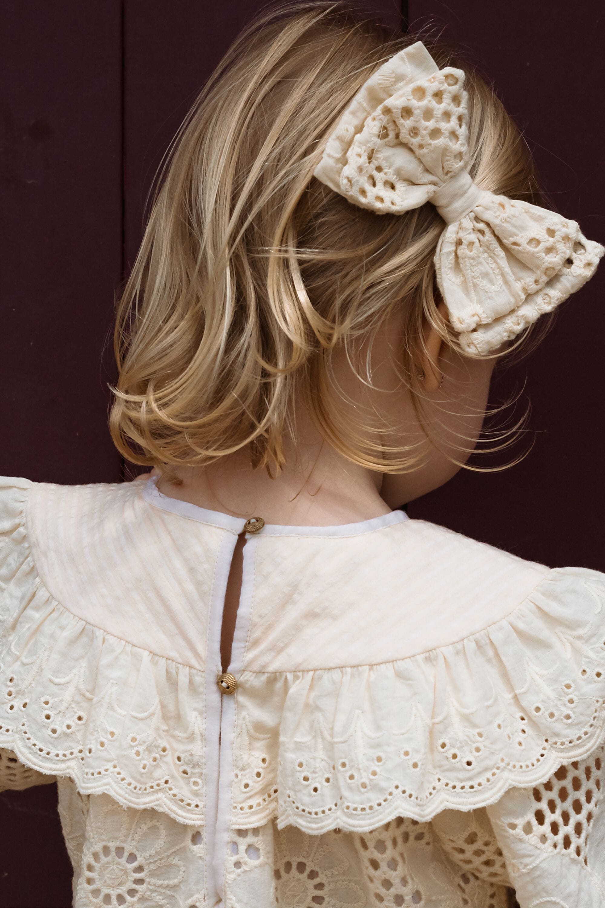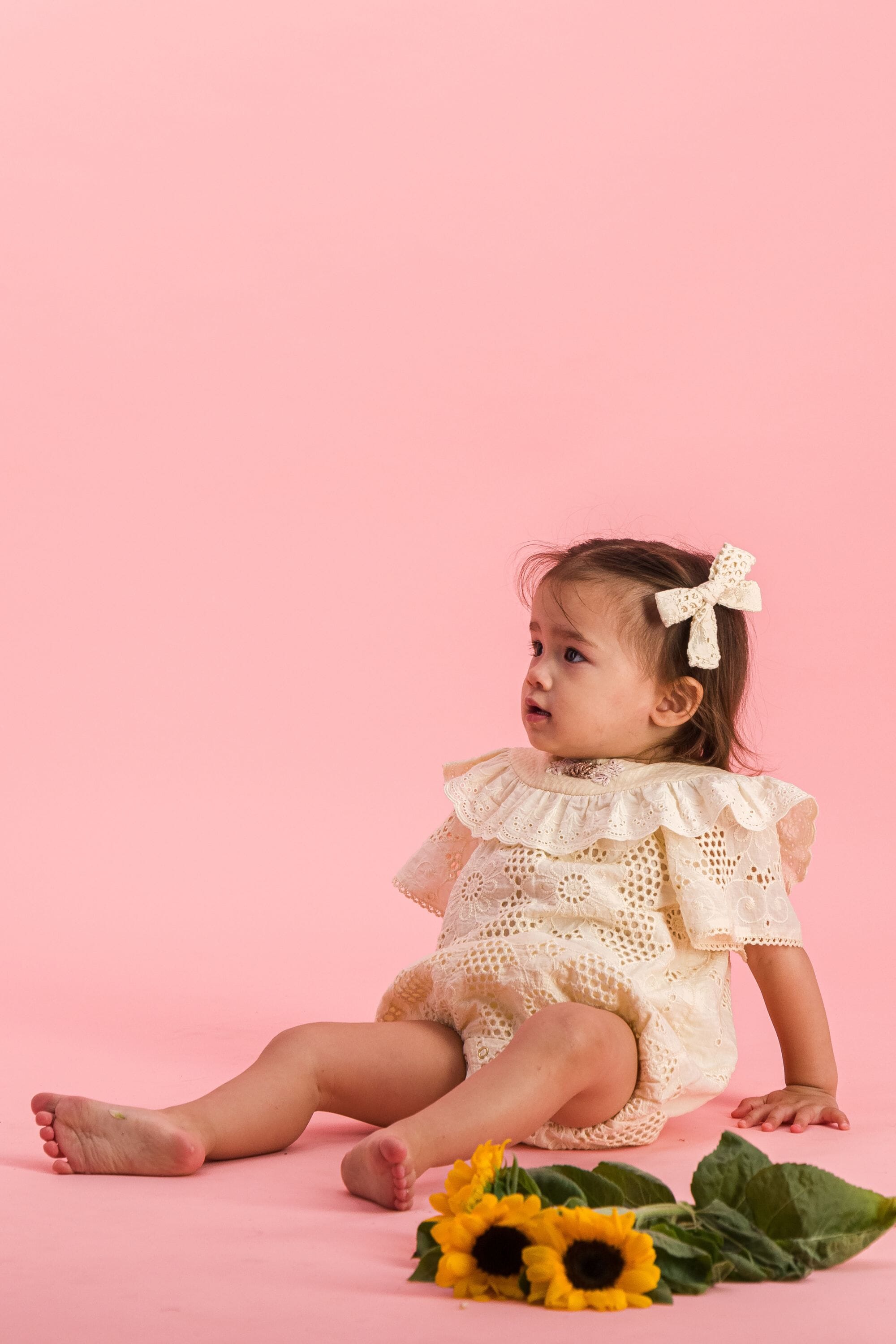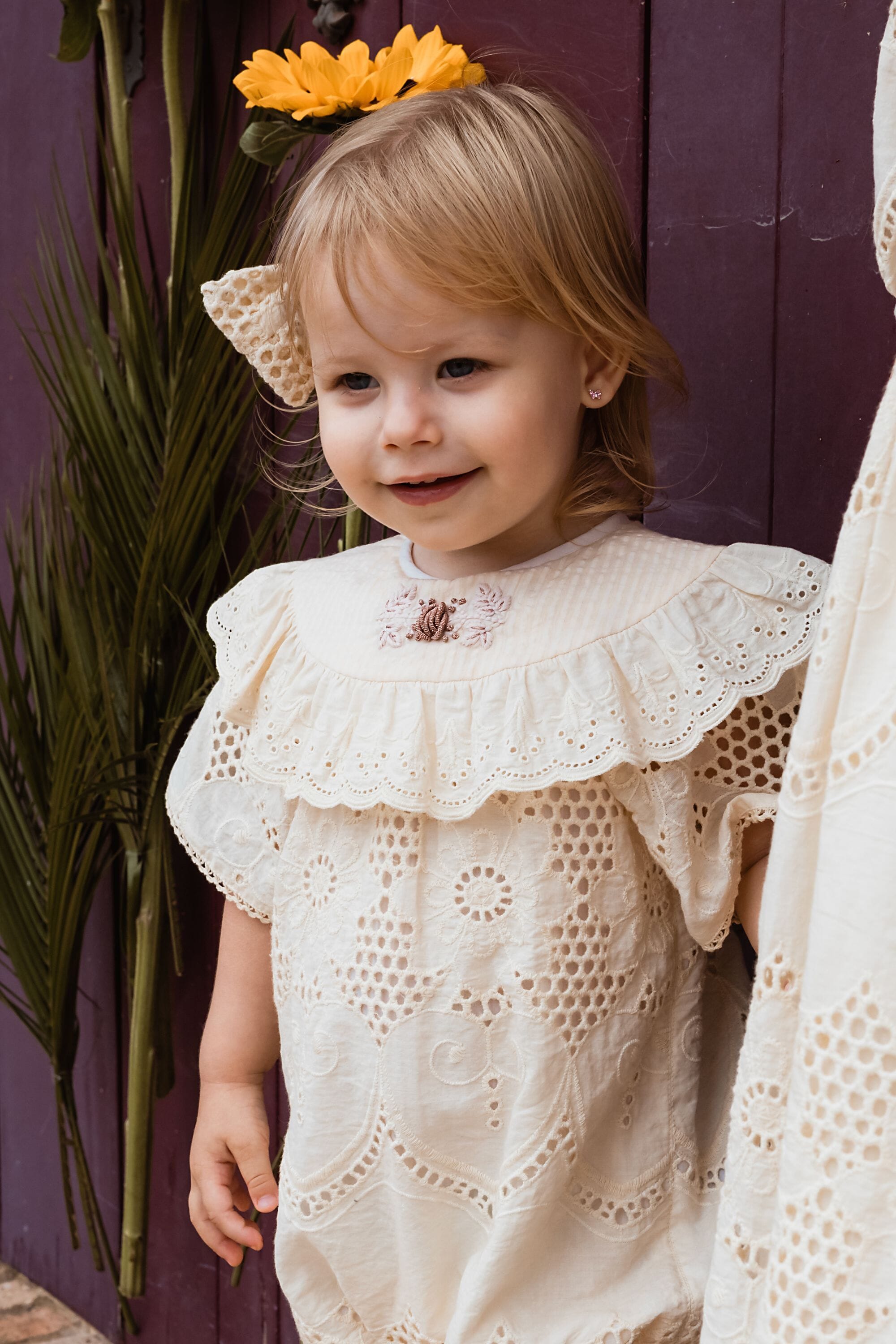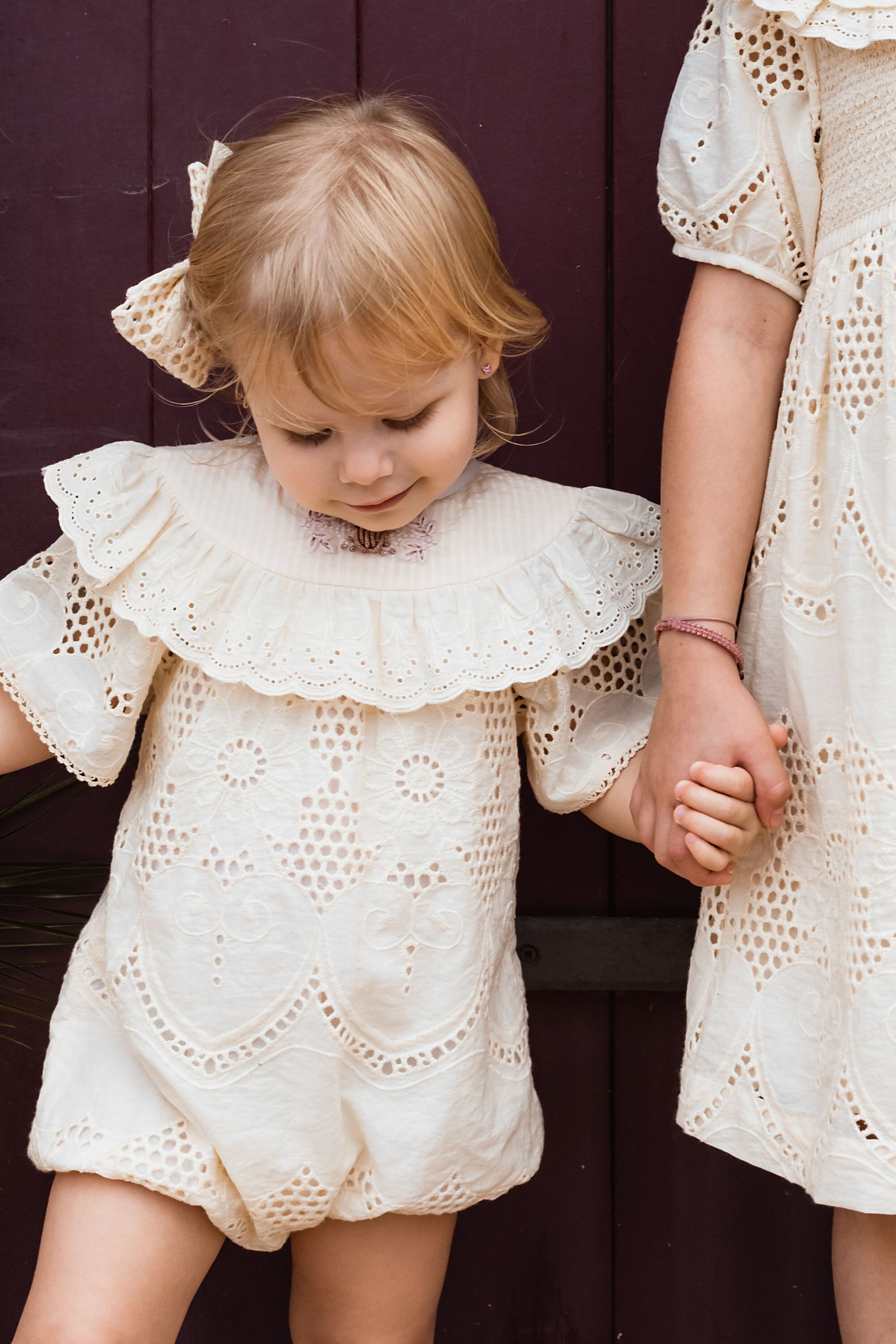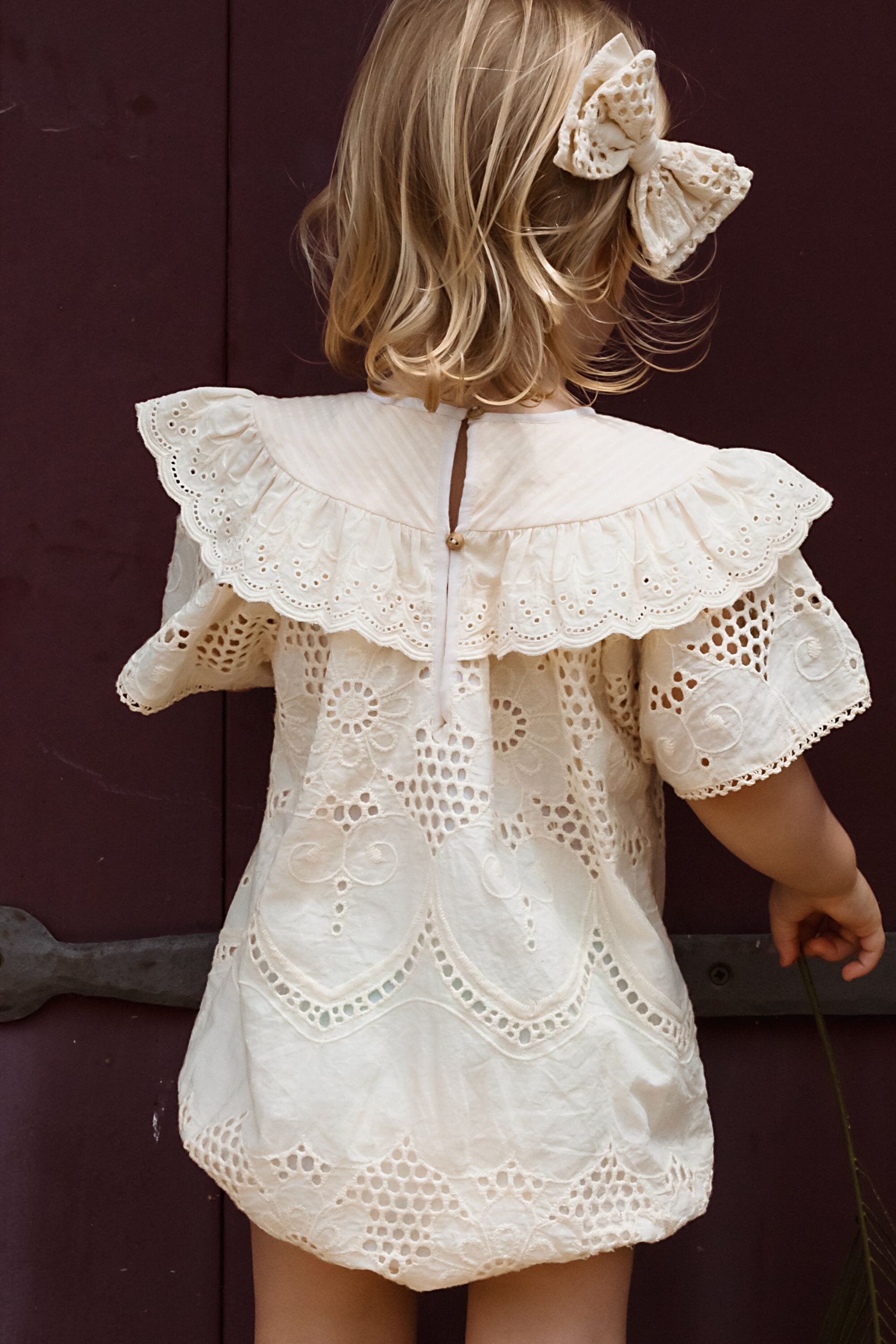 An extraordinary short sleeves romper in organic cotton with a hand embroidered collar and entirely decorated with Broderie anglaise.