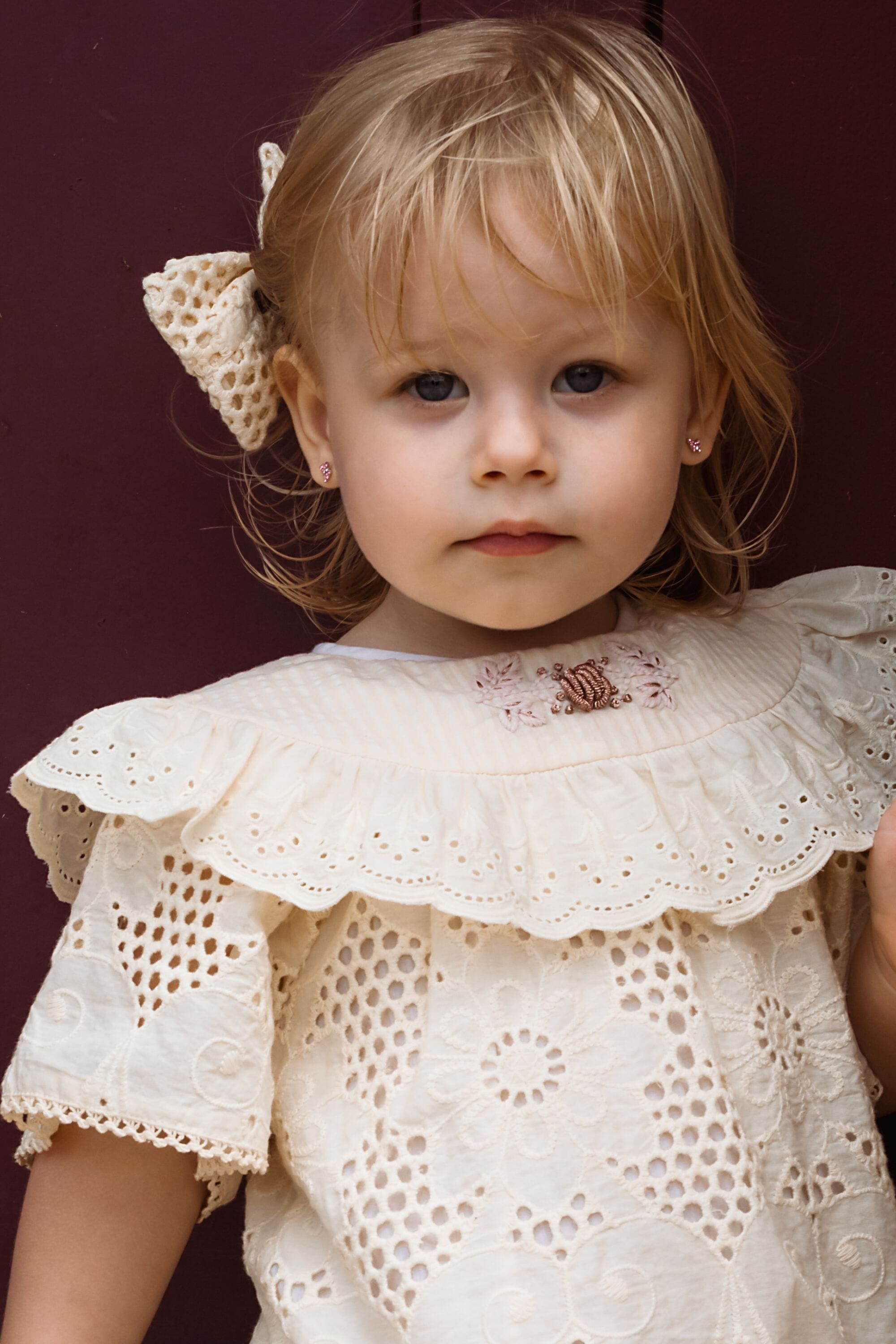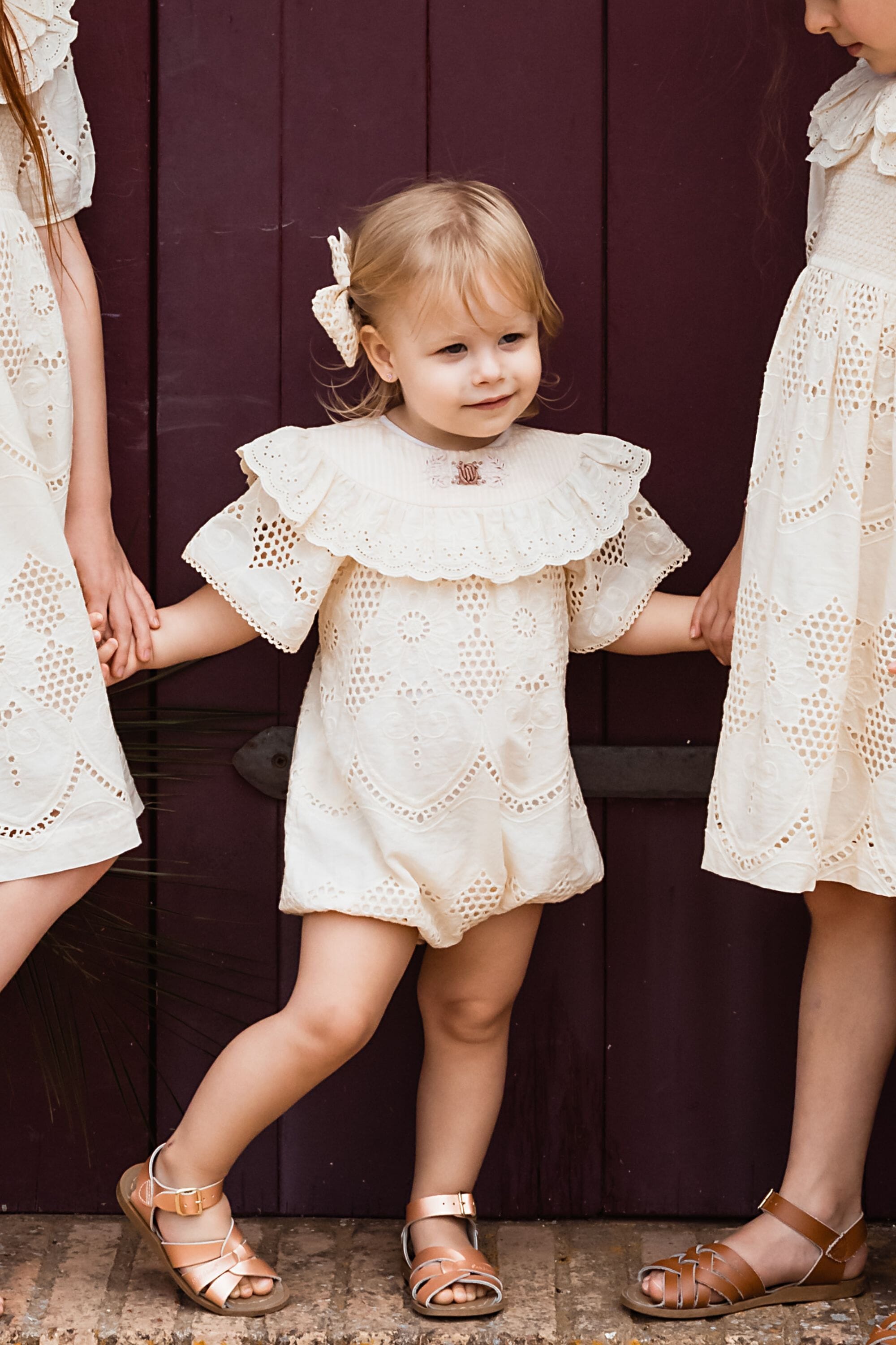 - Romper, 100% organic cotton Broderie anglaise, Champagne color, Plain lining in organic cotton voile, Hand embroidery on the collar, Short sleeves with lace finishing, Golden snap buttons at the crotch, Golden buttons on the back.