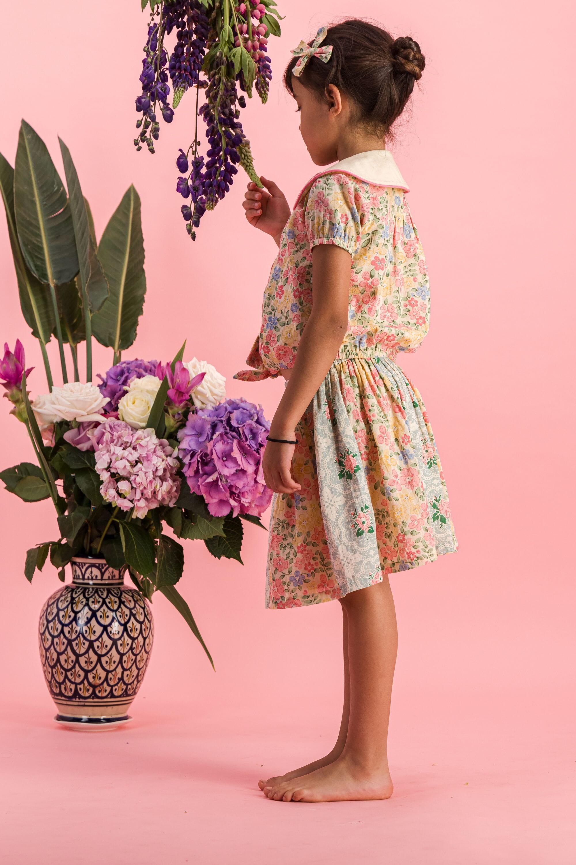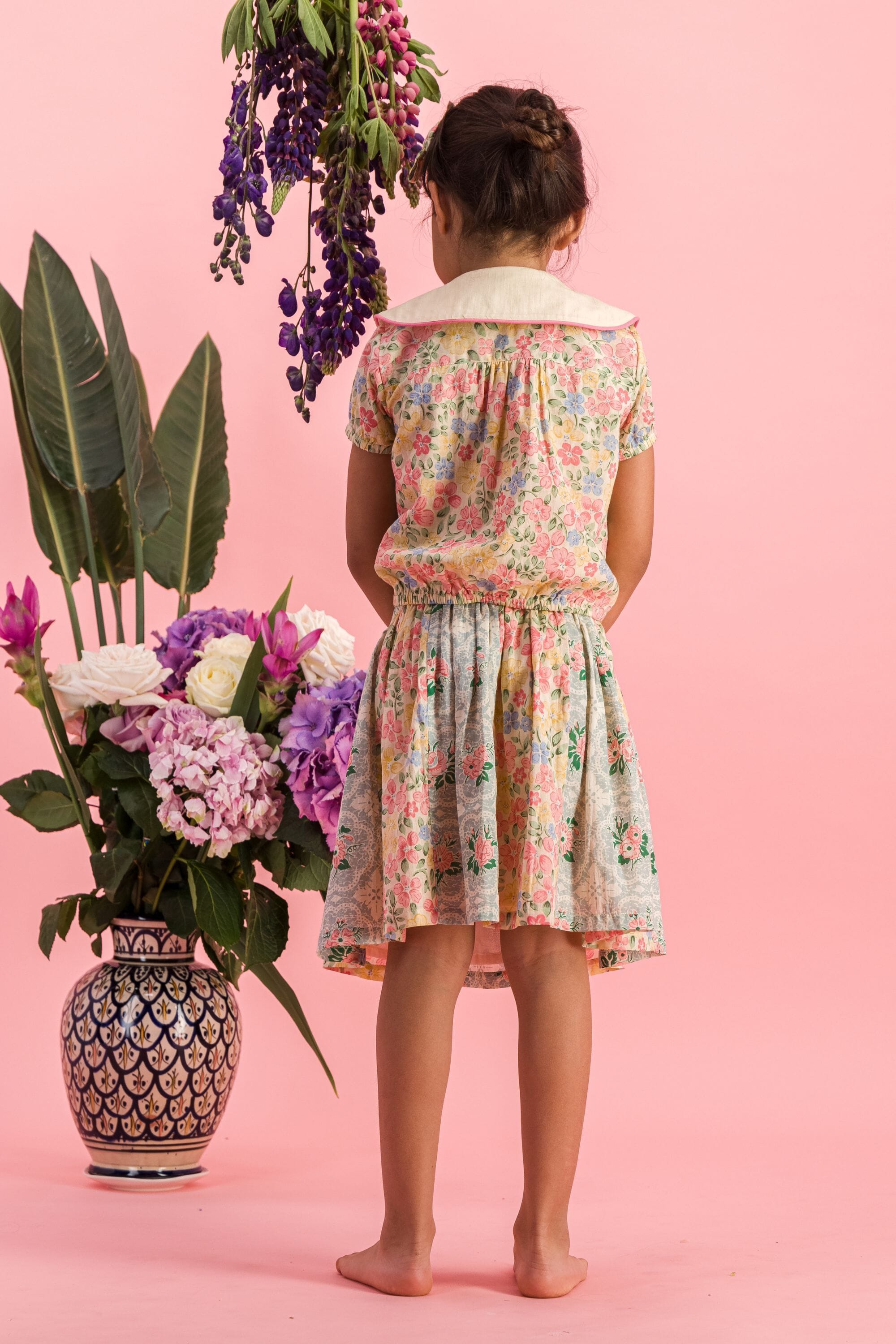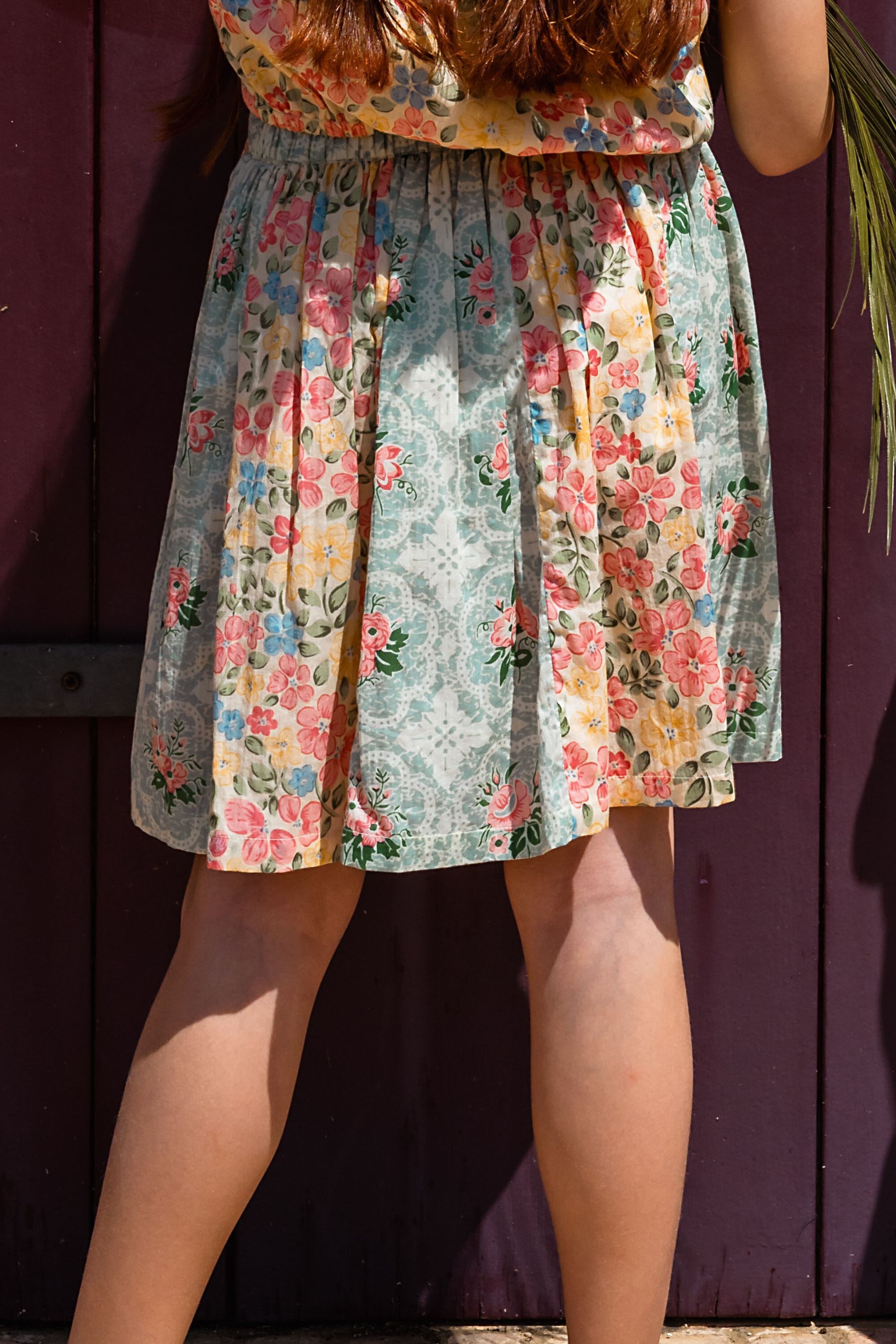 An organic cotton spinning skirt made with two different block prints.
