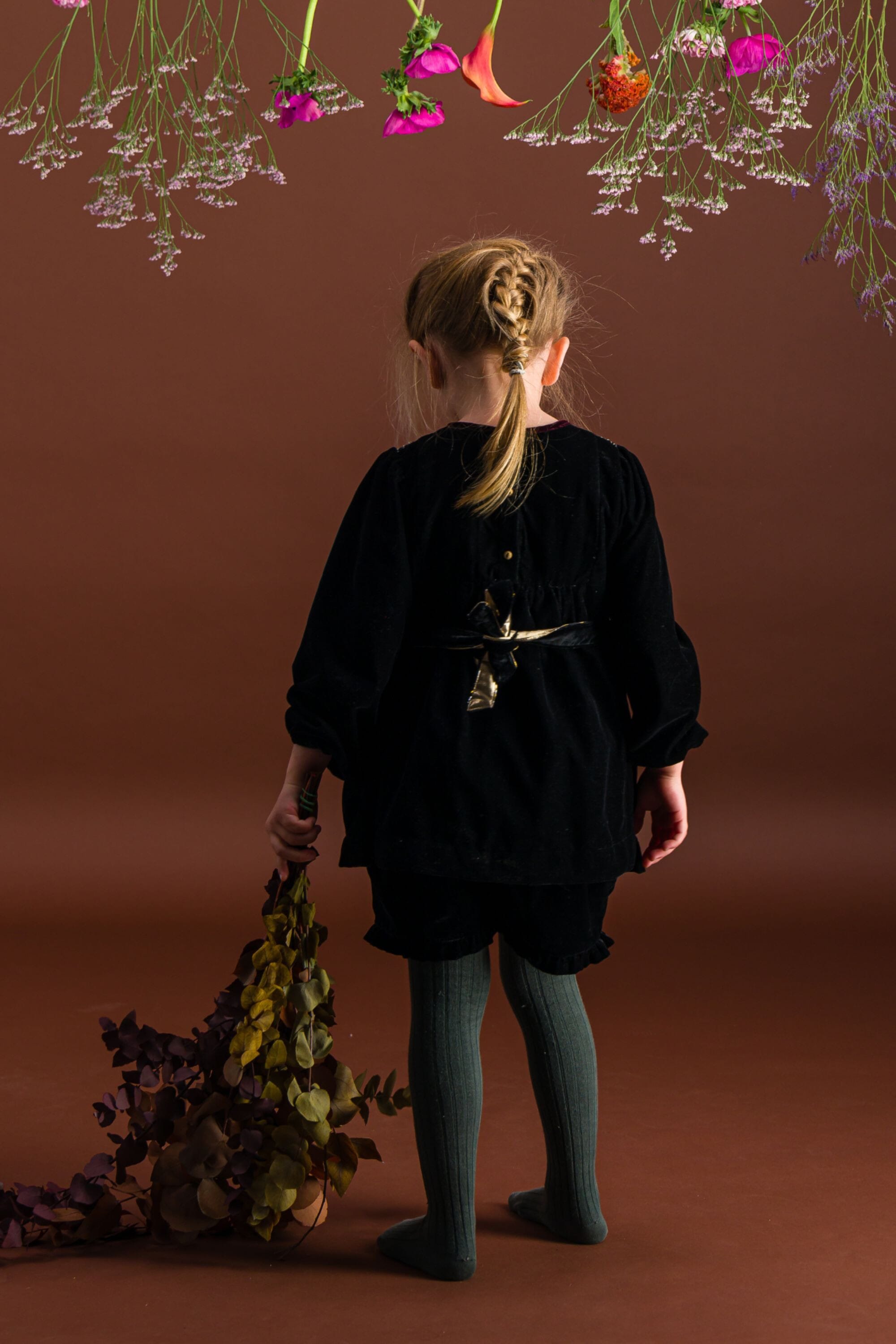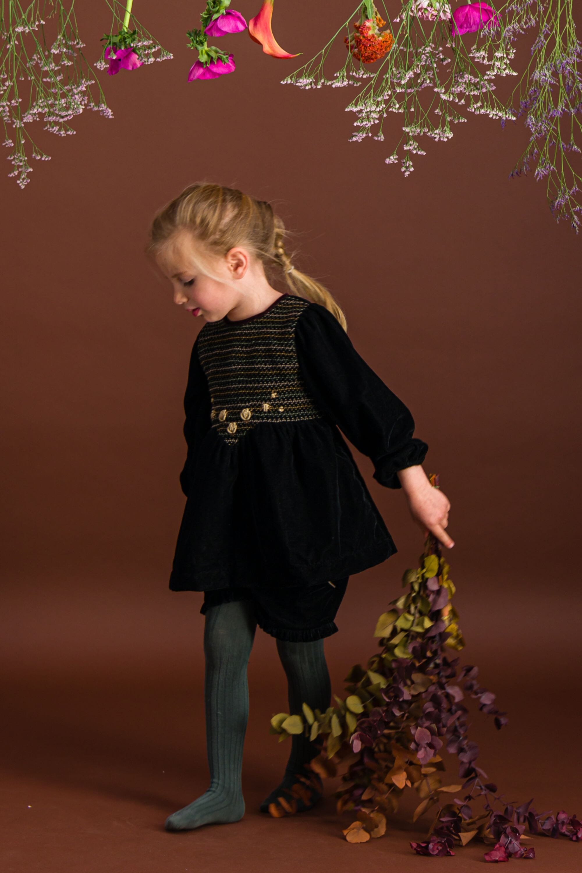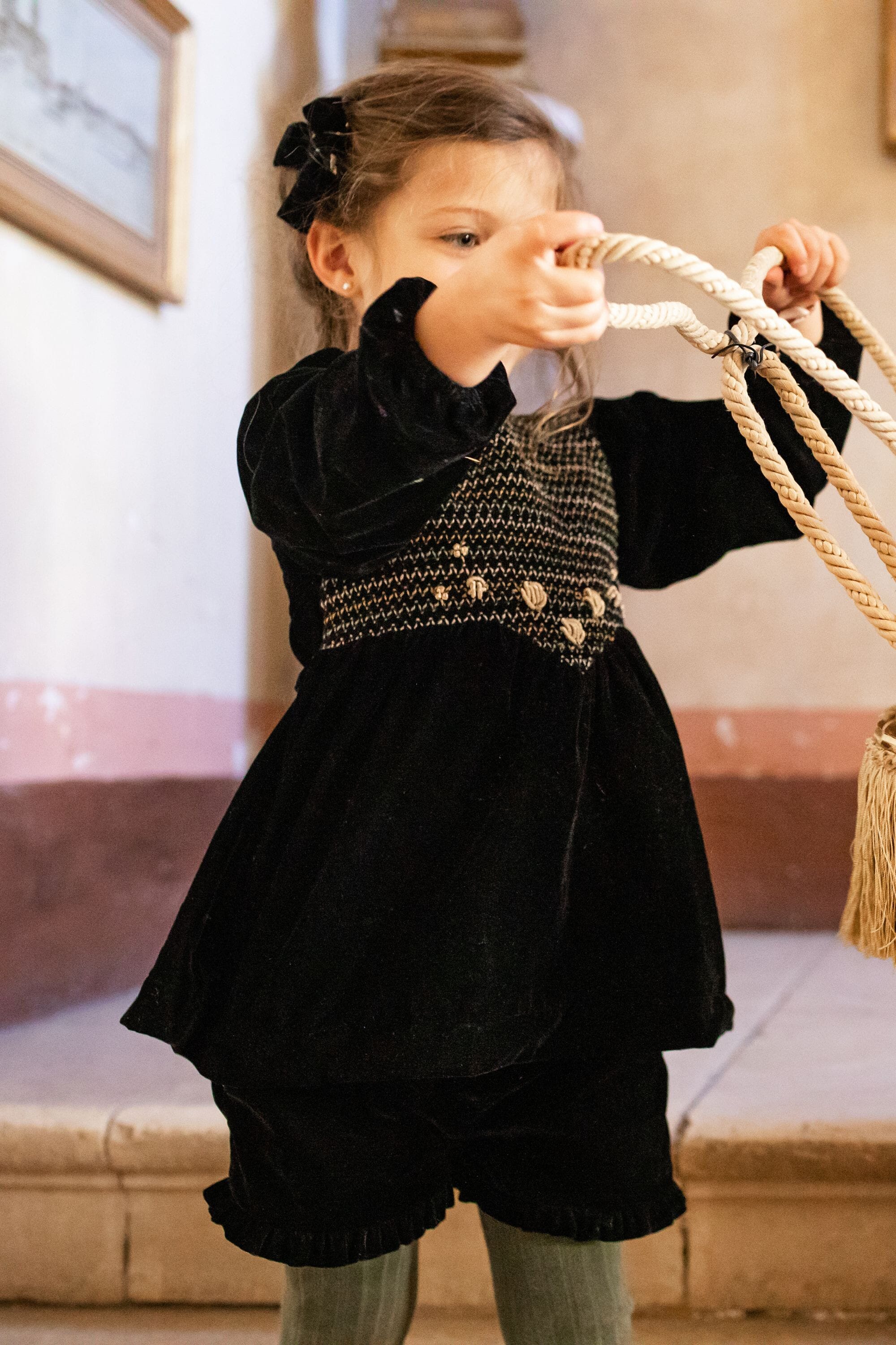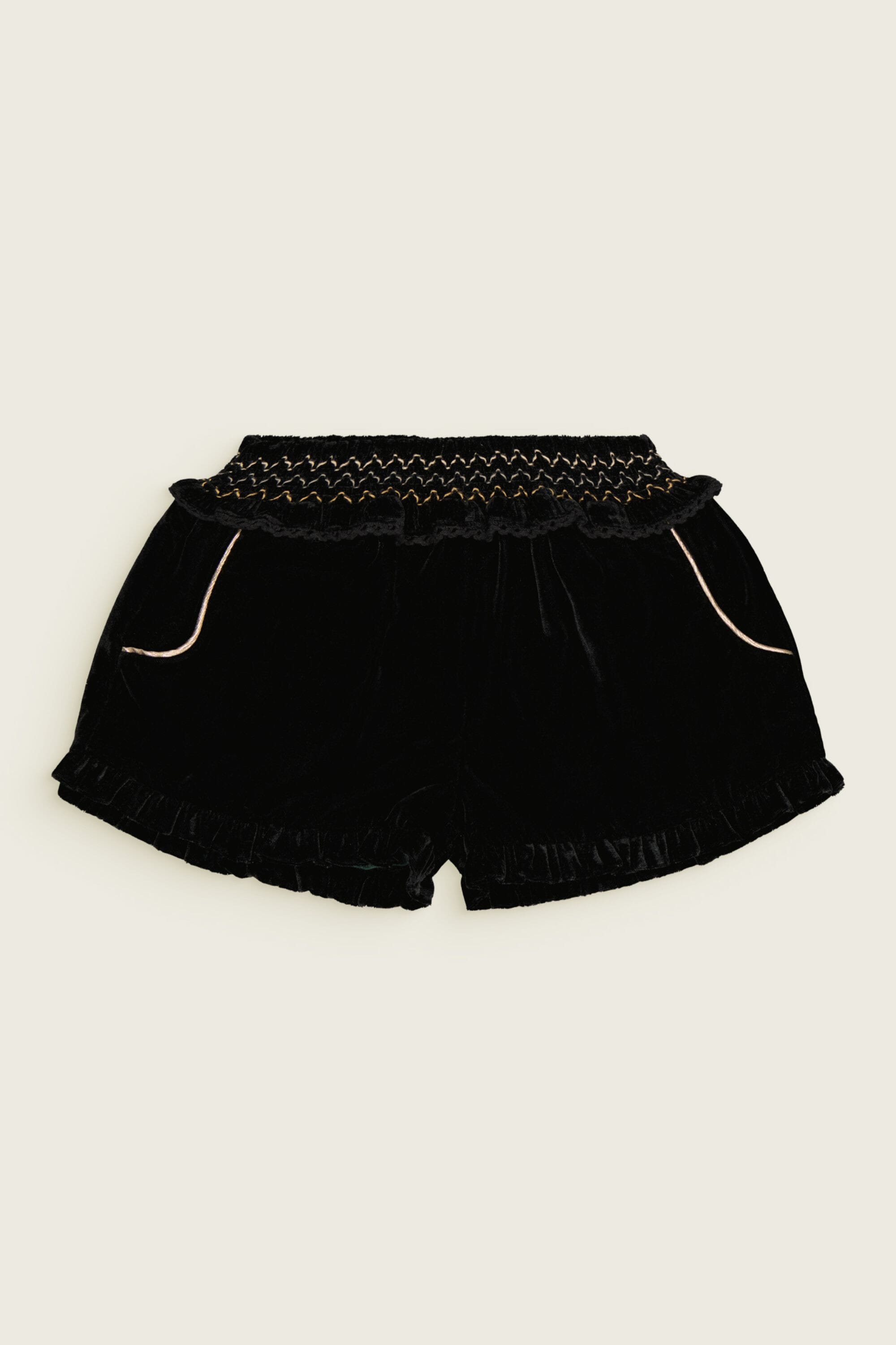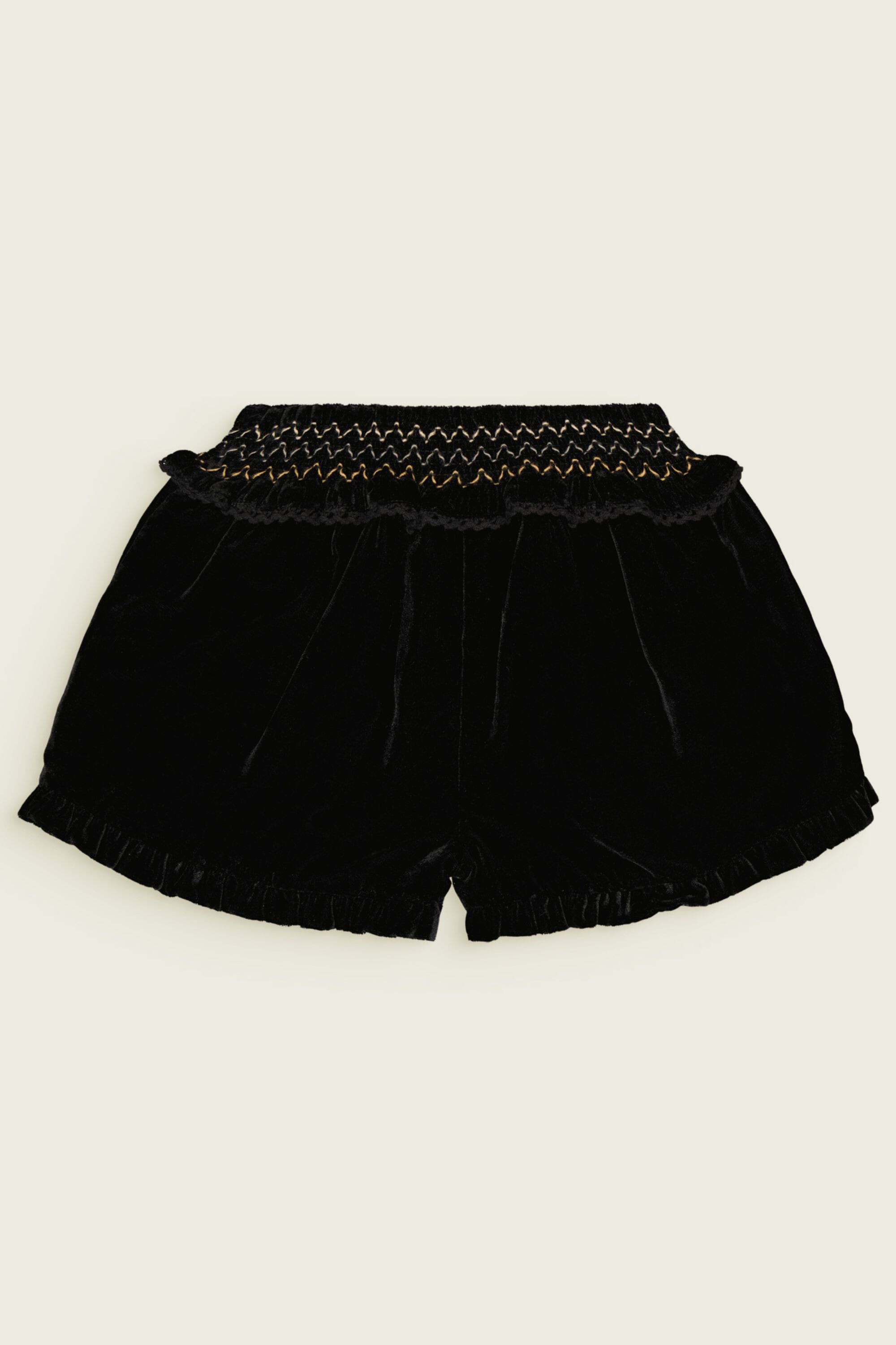 - Shorts, Velvet, Black color, Plain and contrasted lining in organic cotton voile, Multicolor embroidered smocks at the waist with lace finishing, Ruffles on the leg opening, Side pockets with golden piping.