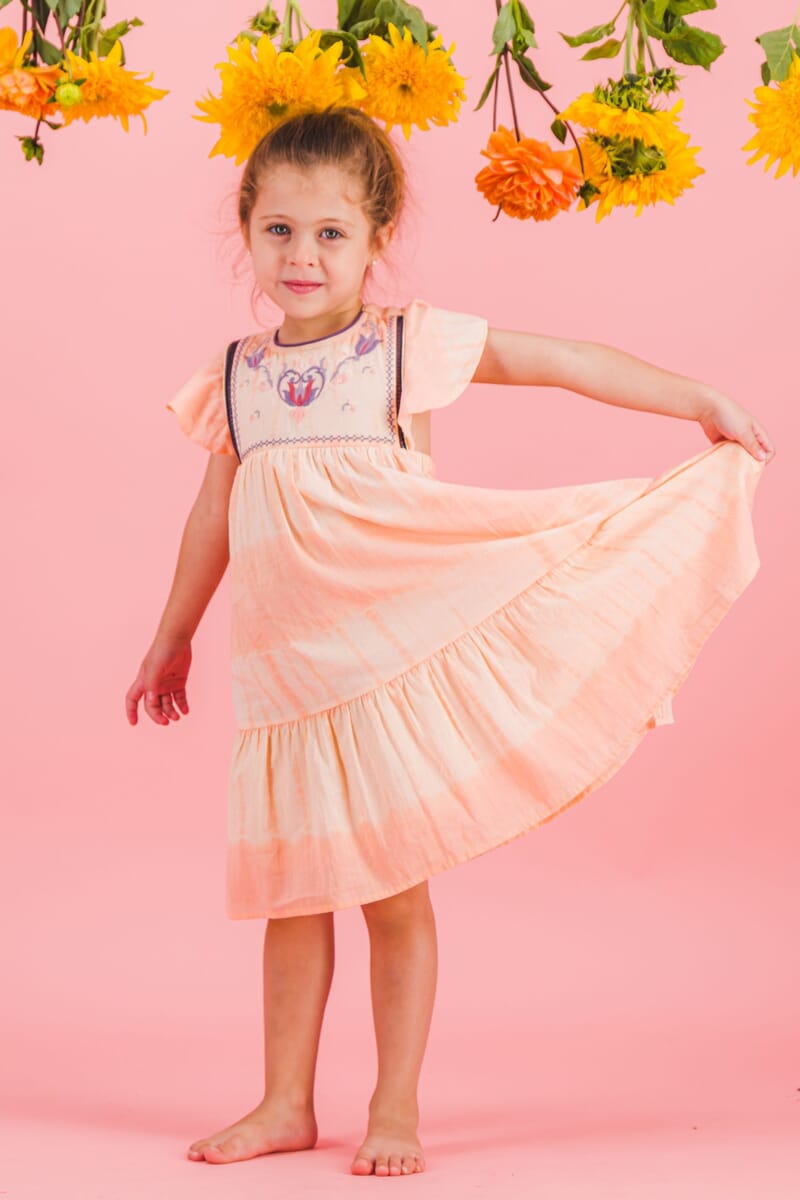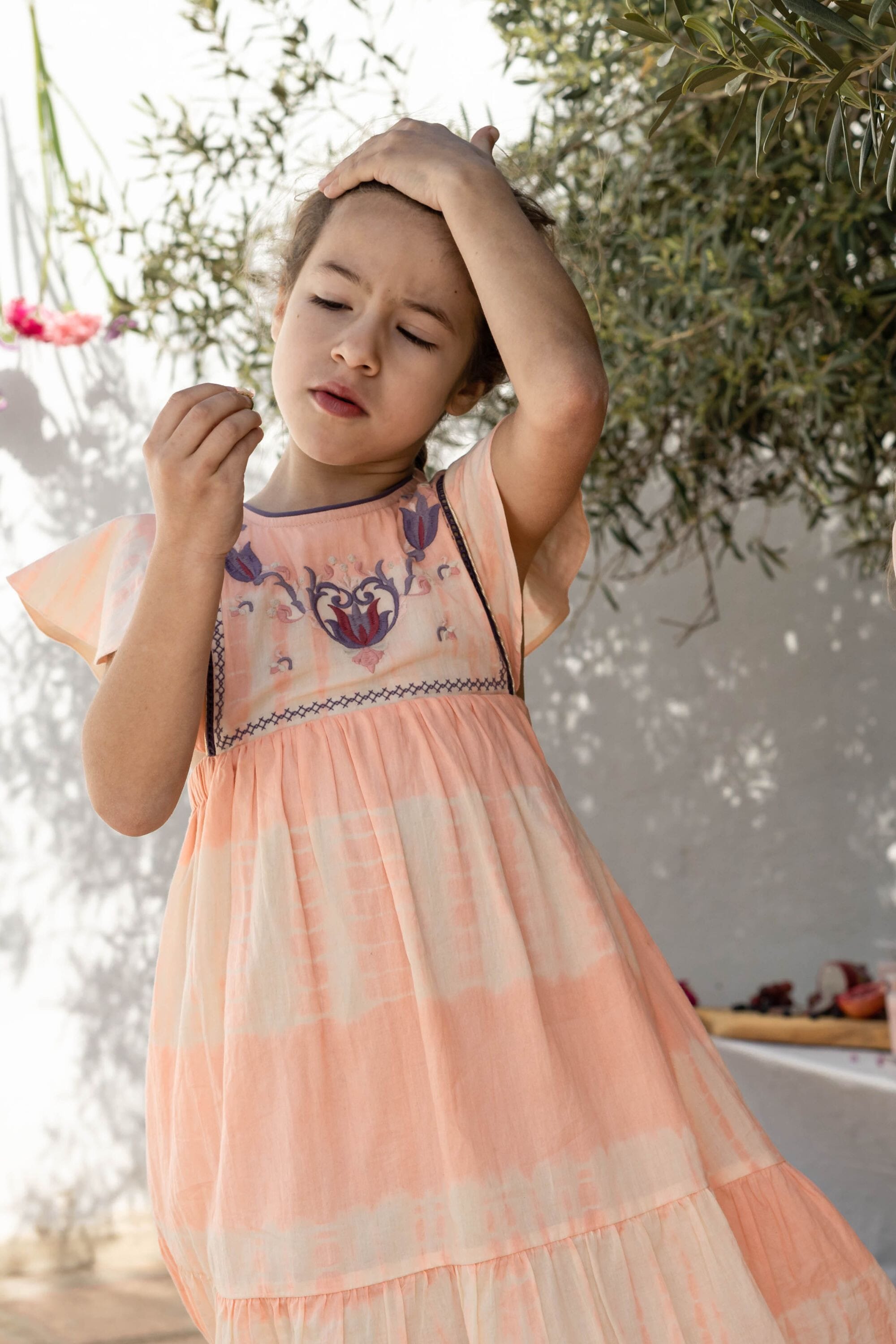- Long dress, 100% organic cotton, Plain lining in organic cotton voile, Tie and Dye, Embroidery, ladder lace and golden piping on the front, Crossed straps at the back, Gathers on the front & back, Ruffled and lined sleeves, Contrasted belt at the back.