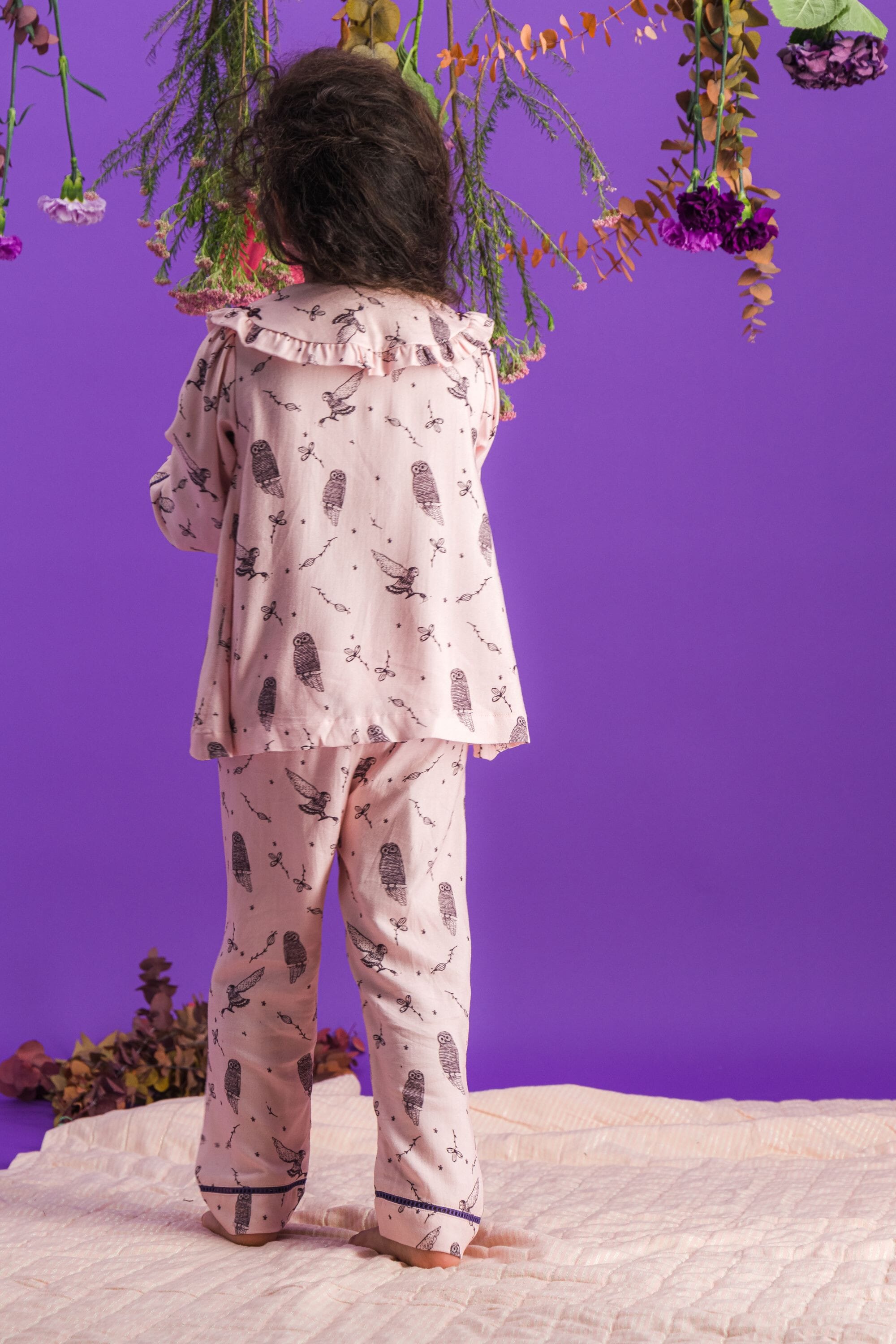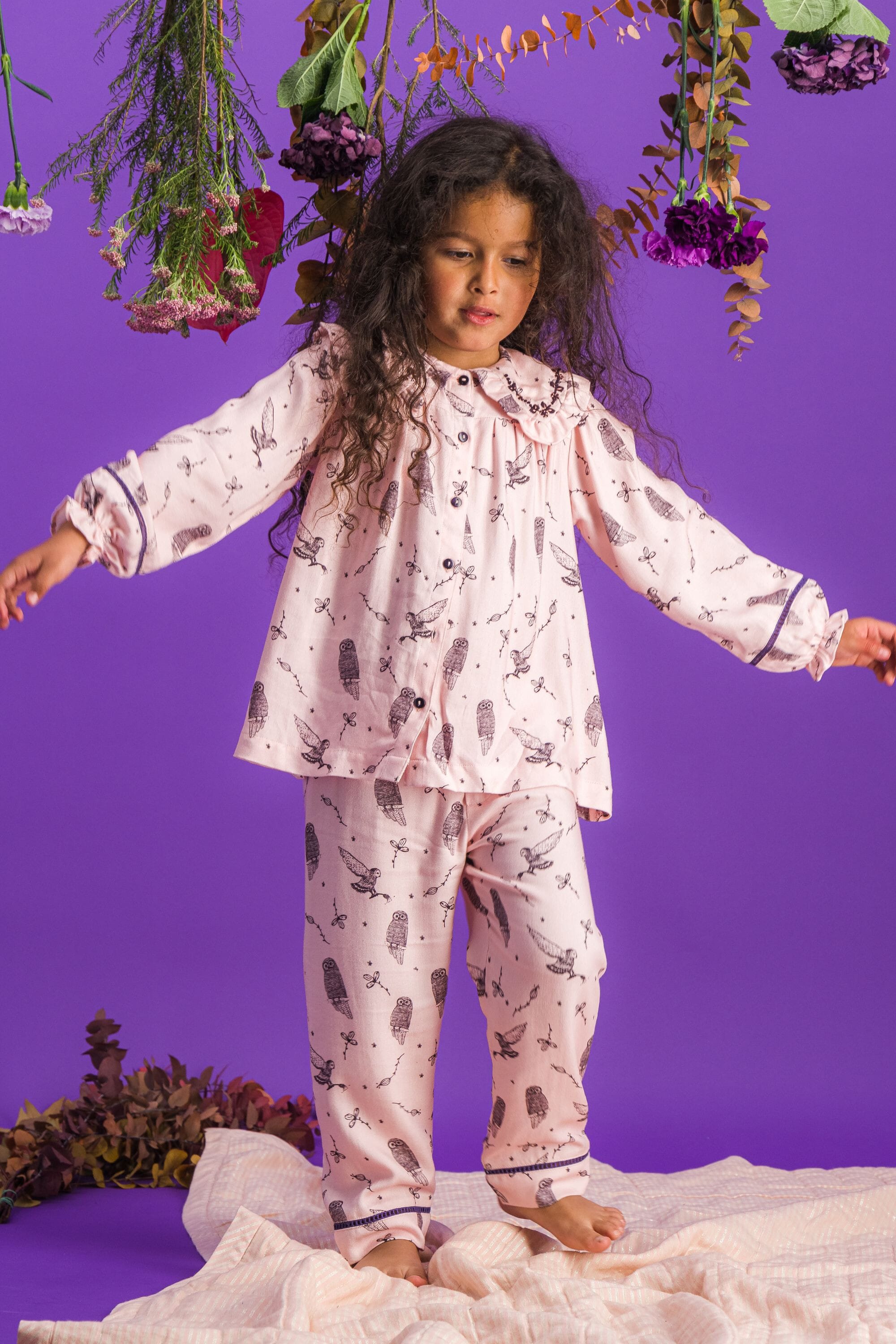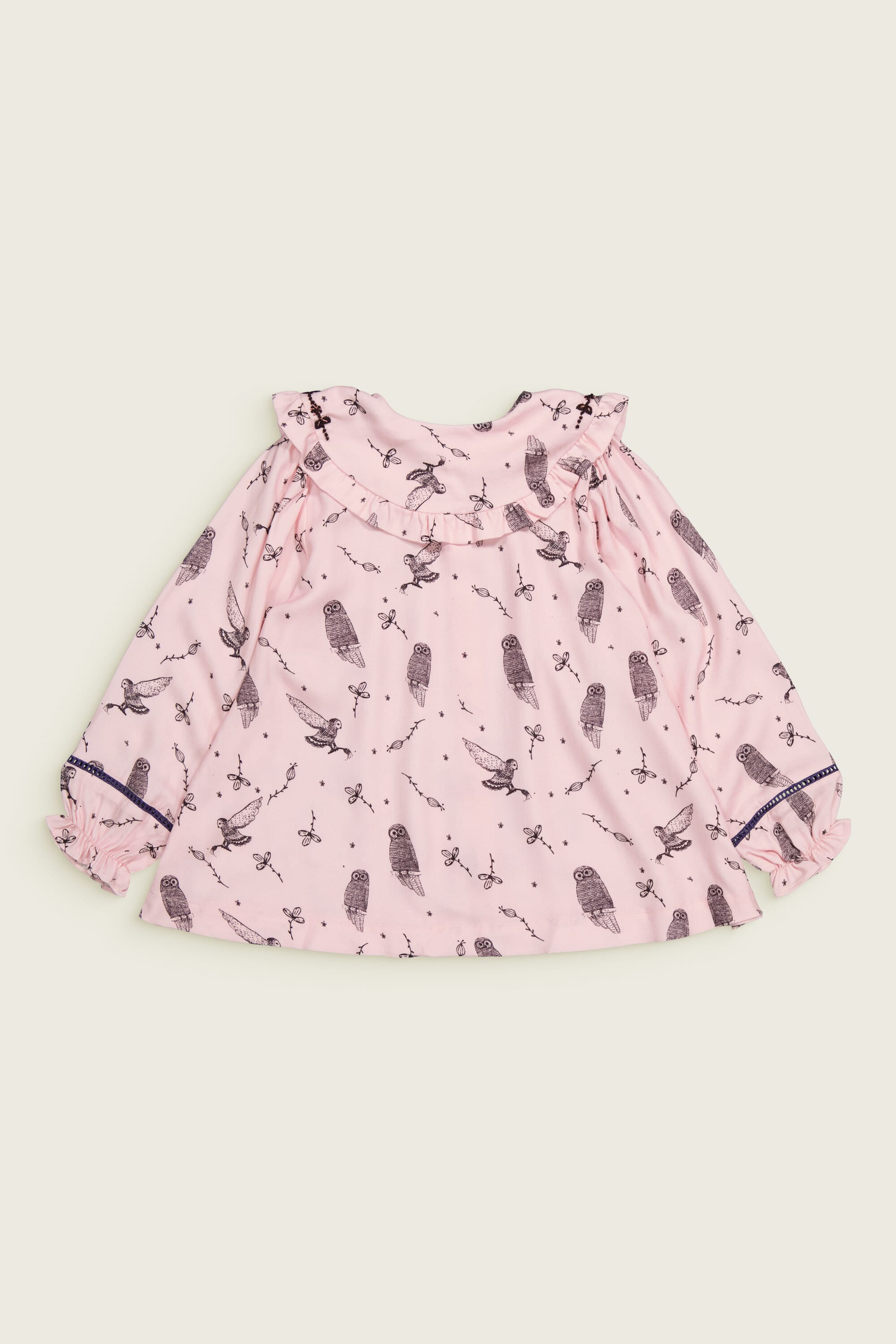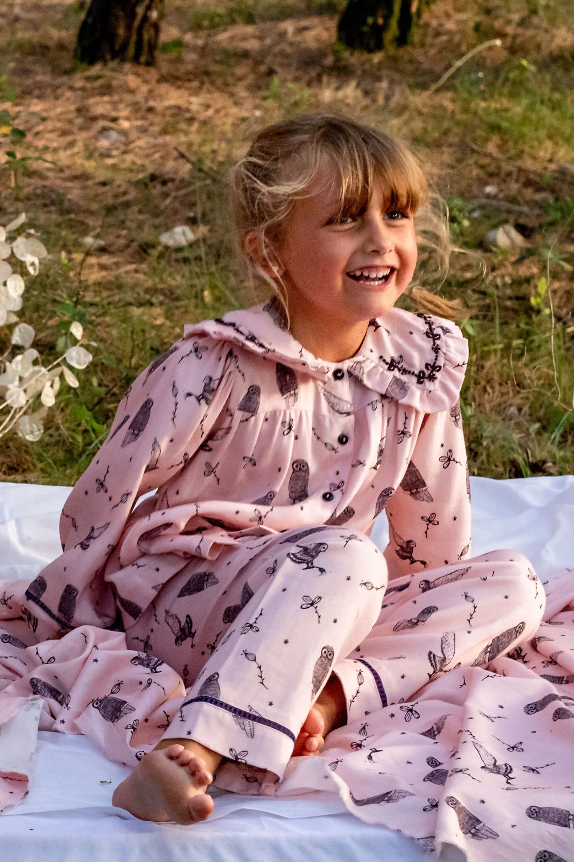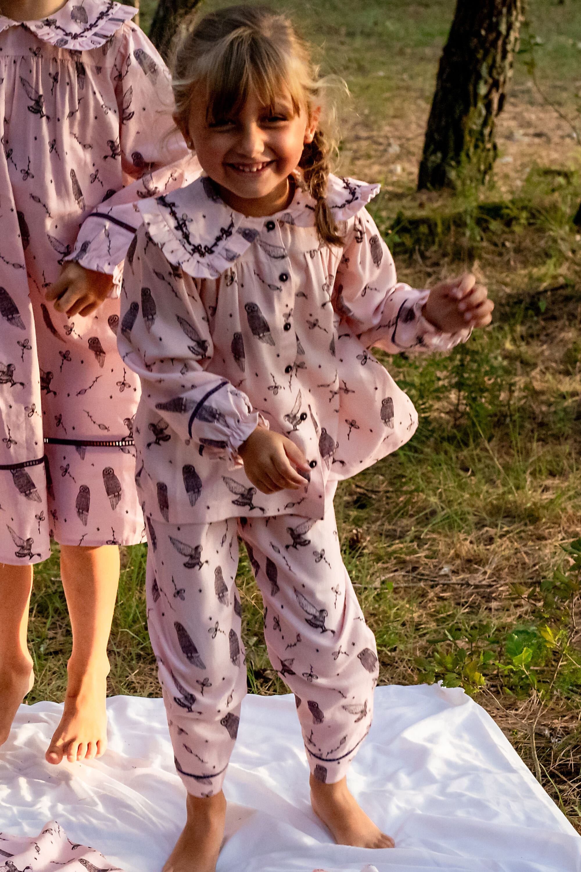 - Pajamas (Pant & blouse), 100% cotton, Night print color, Hand embroideries on the collar, Ladder lace at the bottom of the sleeves and legs, Gathers on the front, Contrasted buttons.
