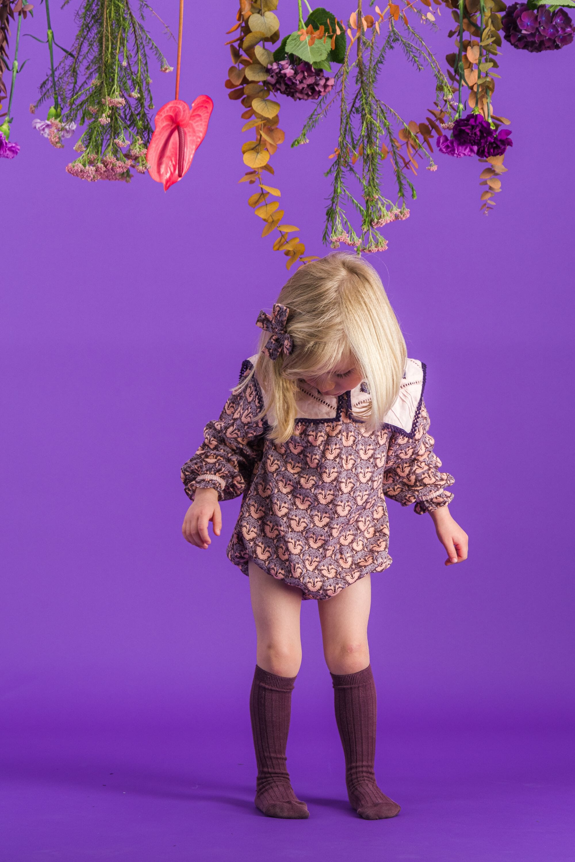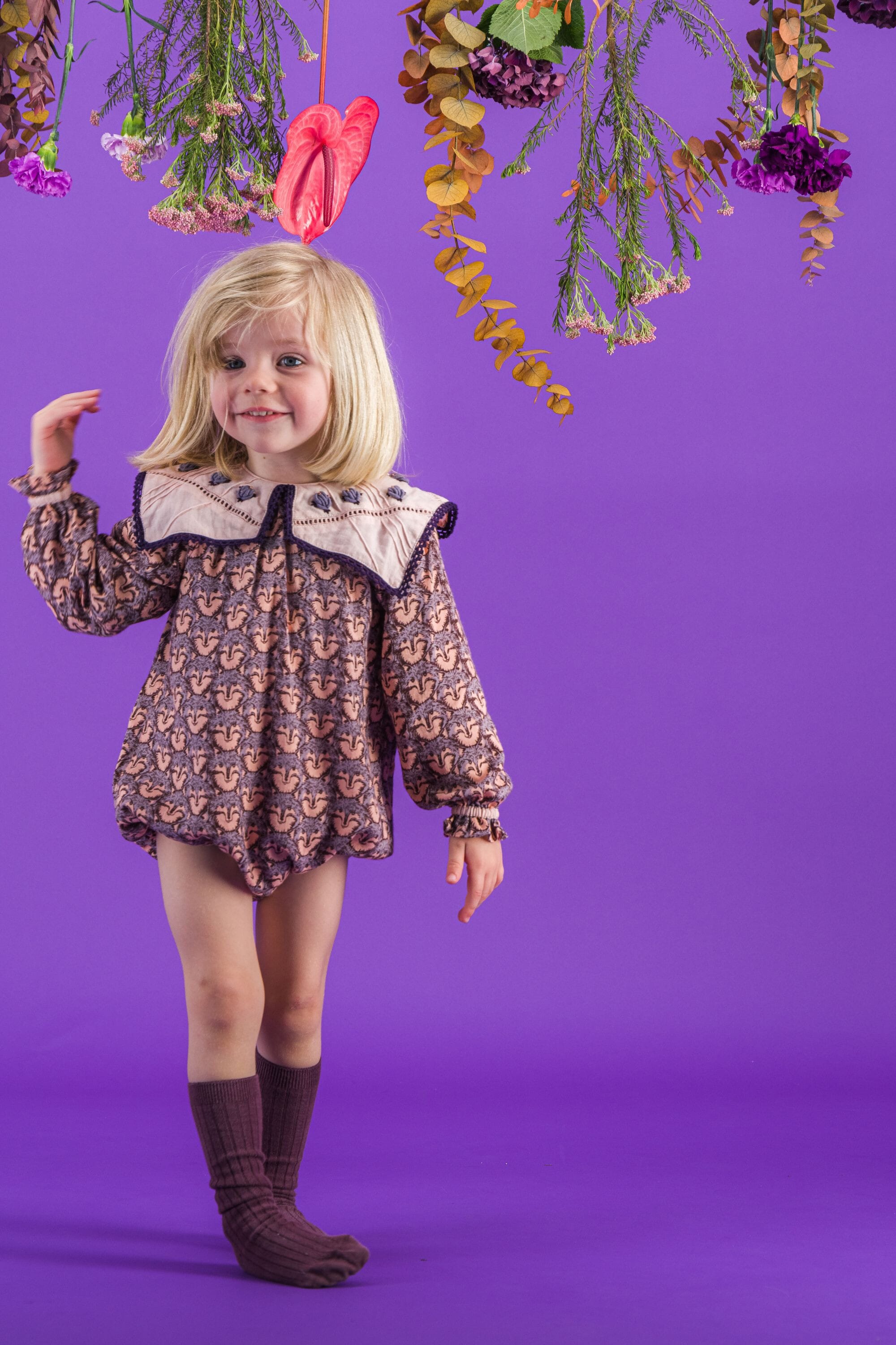 - Romper, 100% ECOVERO® Viscose, Block Print, Plain lining in organic cotton voile, Hand embroideries, pintucks and laces on the collar, Long elasticated sleeves, Golden snap buttons at the crotch, Golden buttons at the back.