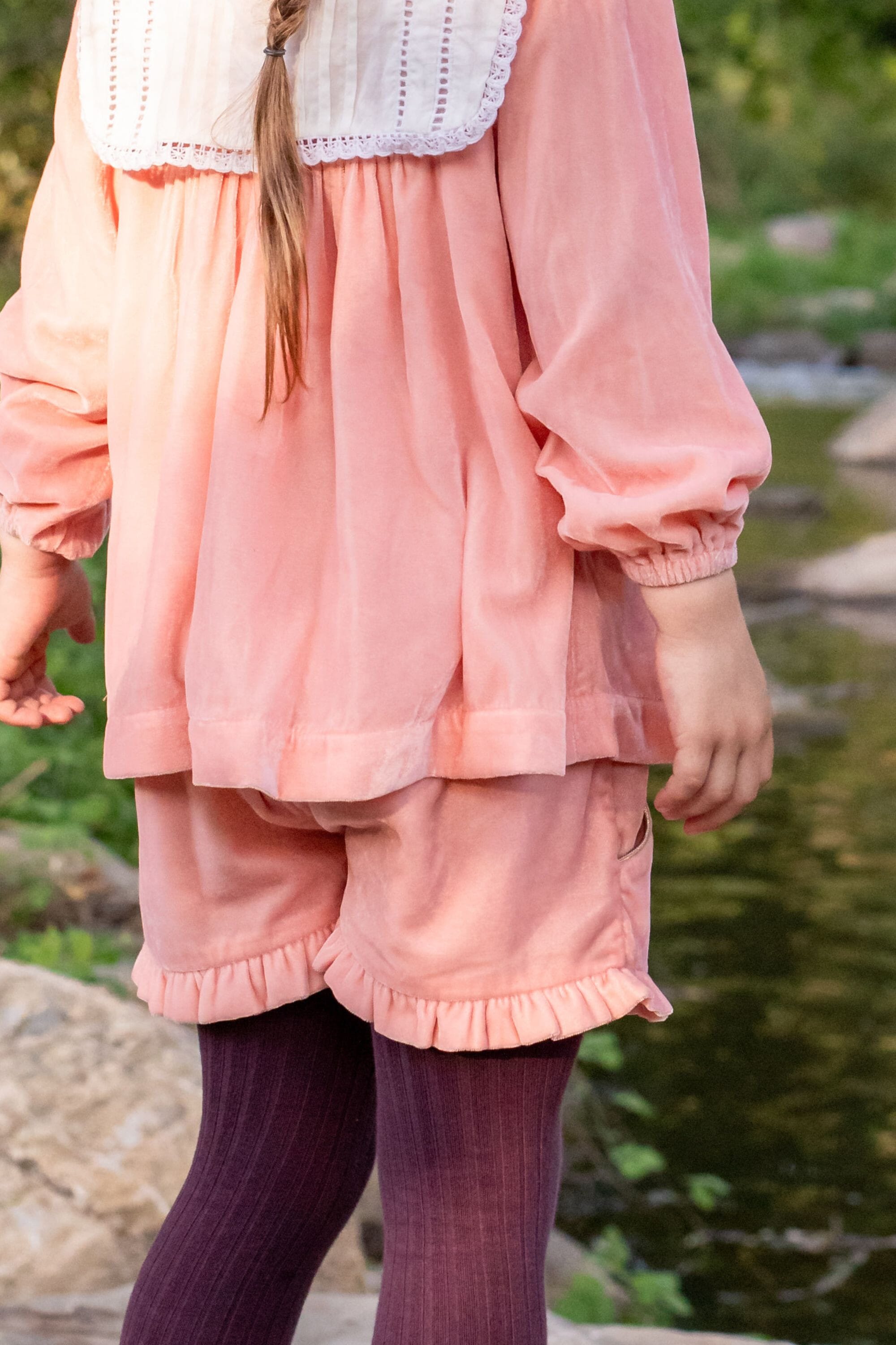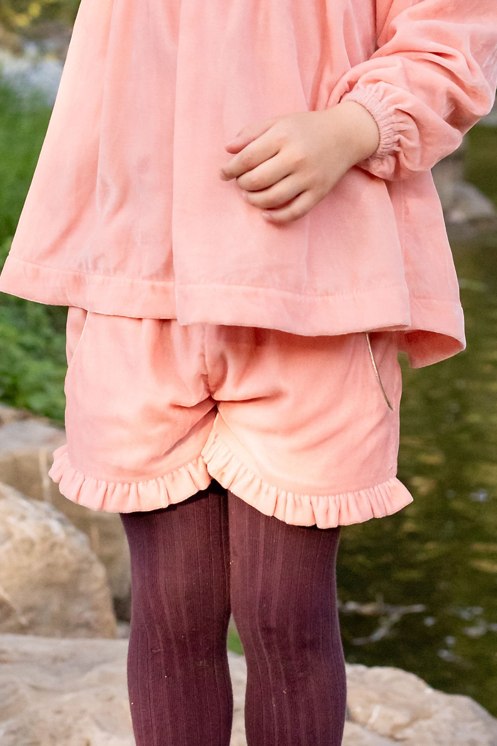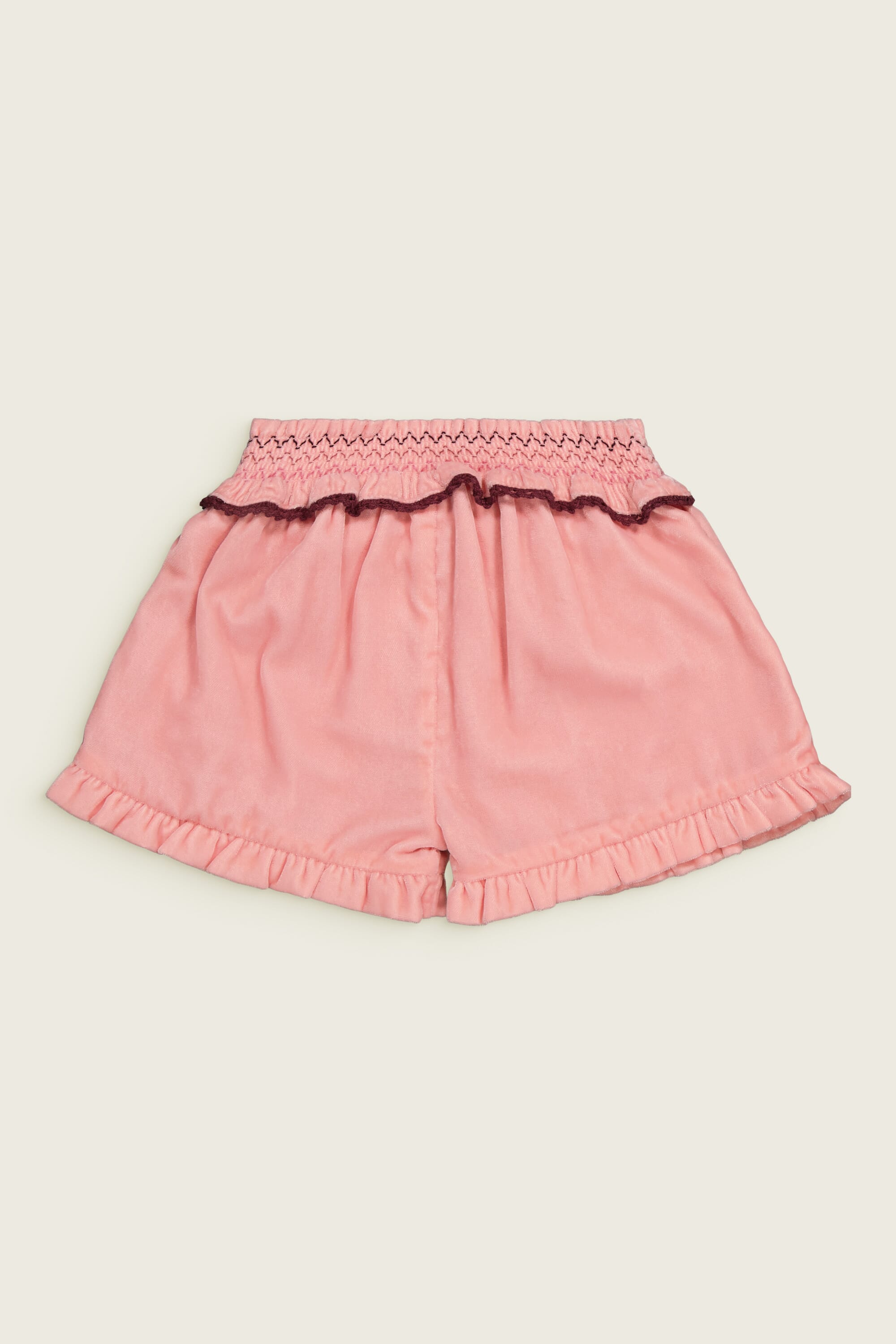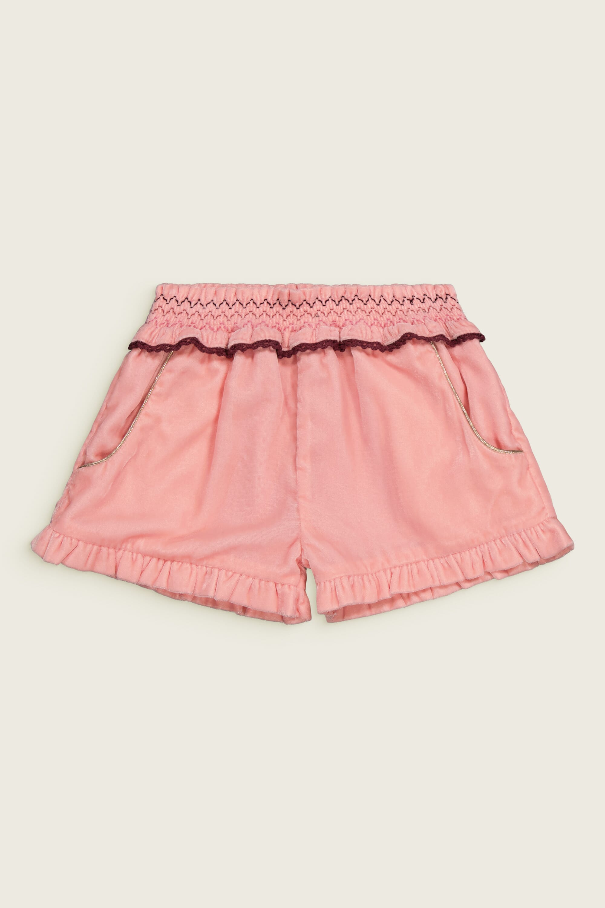 - Details: Shorts, Light rose colored velvet, Plain lining in organic cotton voile, Multicolor embroidered smocks at the waist with lace finishing, Ruffles on the leg opening, Side pockets with golden piping.