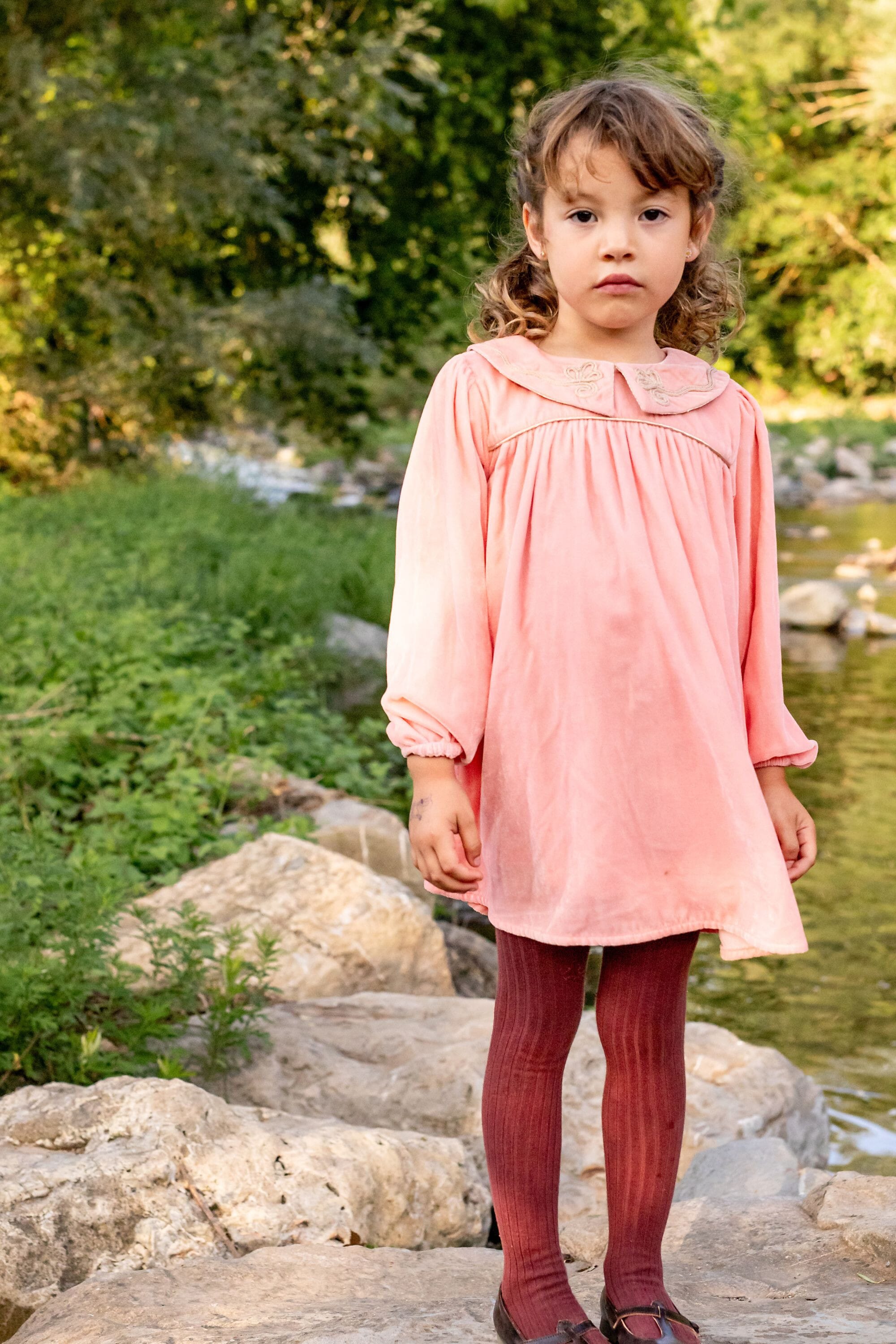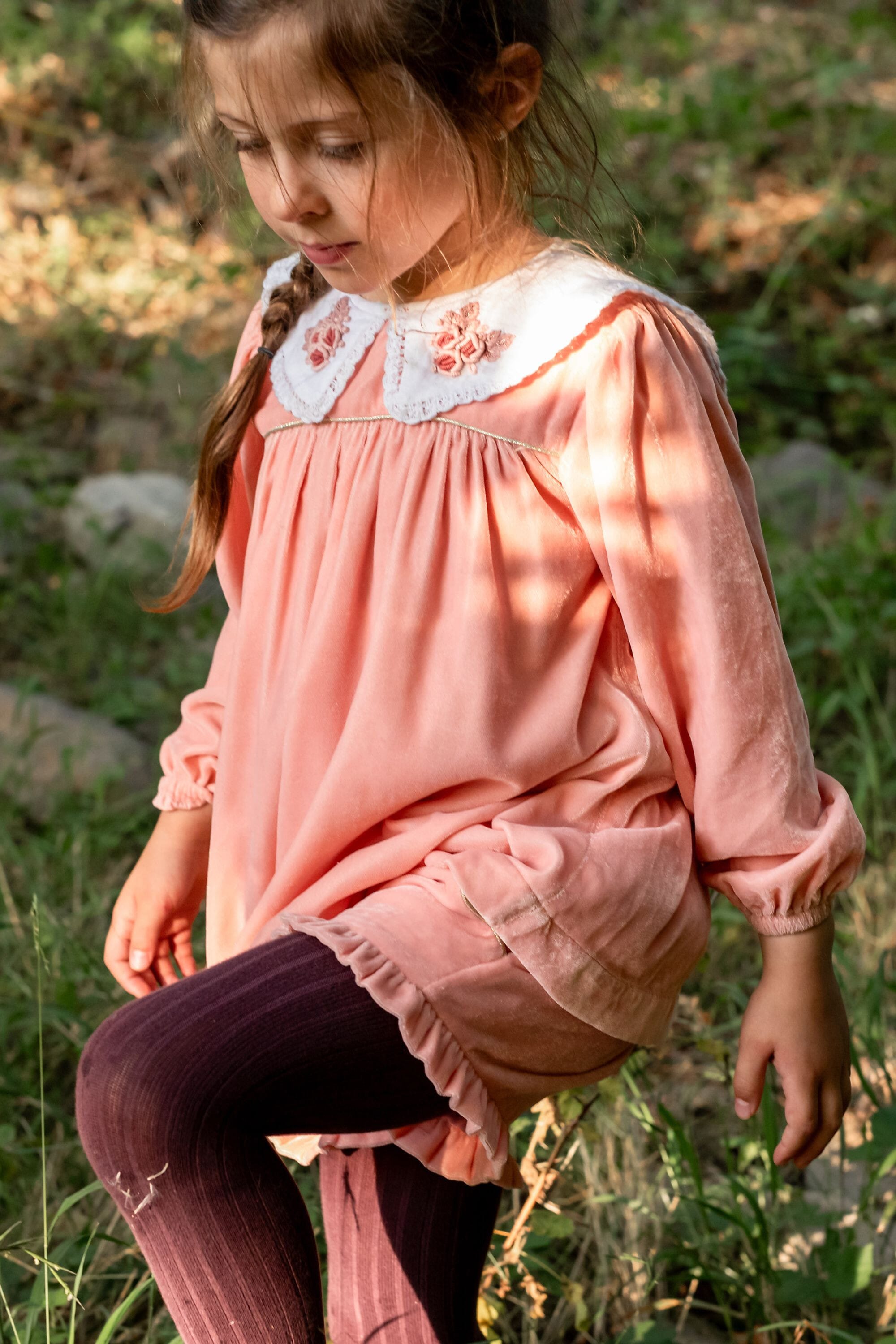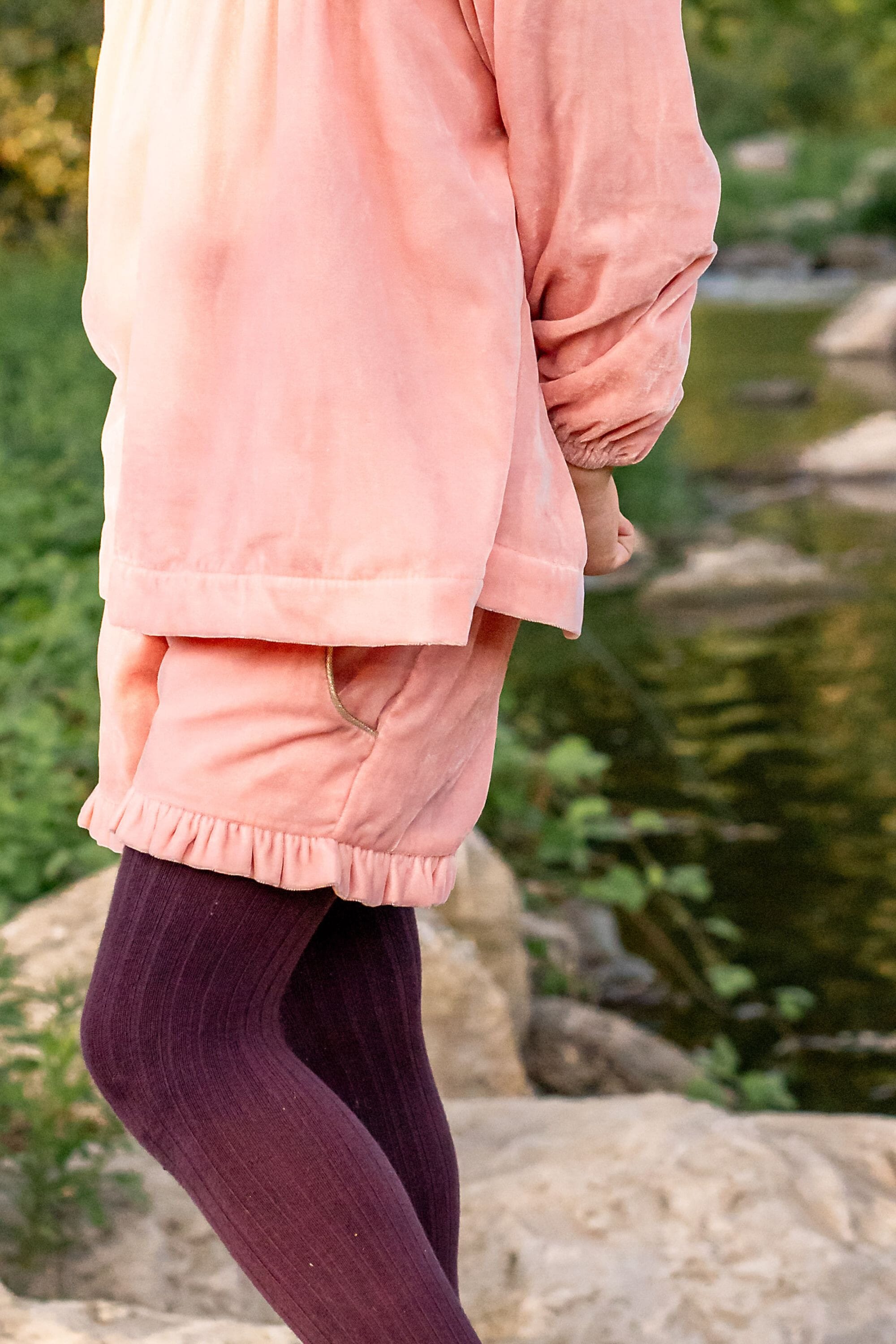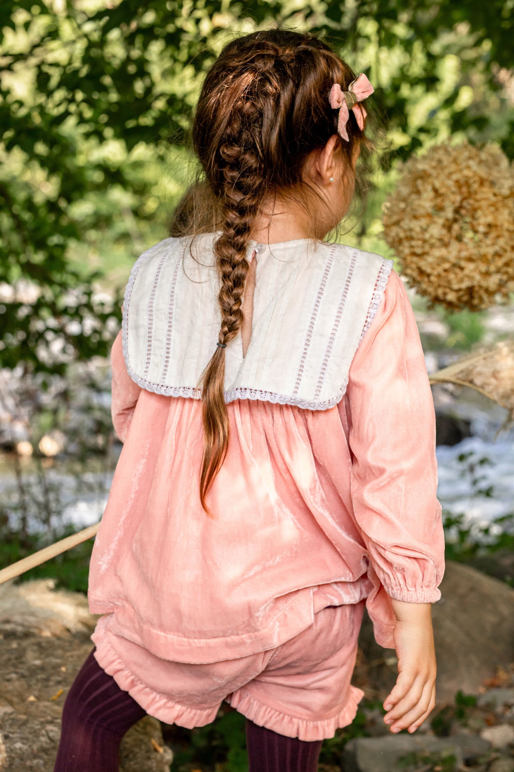 - Details: Shorts, Light rose colored velvet, Plain lining in organic cotton voile, Multicolor embroidered smocks at the waist with lace finishing, Ruffles on the leg opening, Side pockets with golden piping.