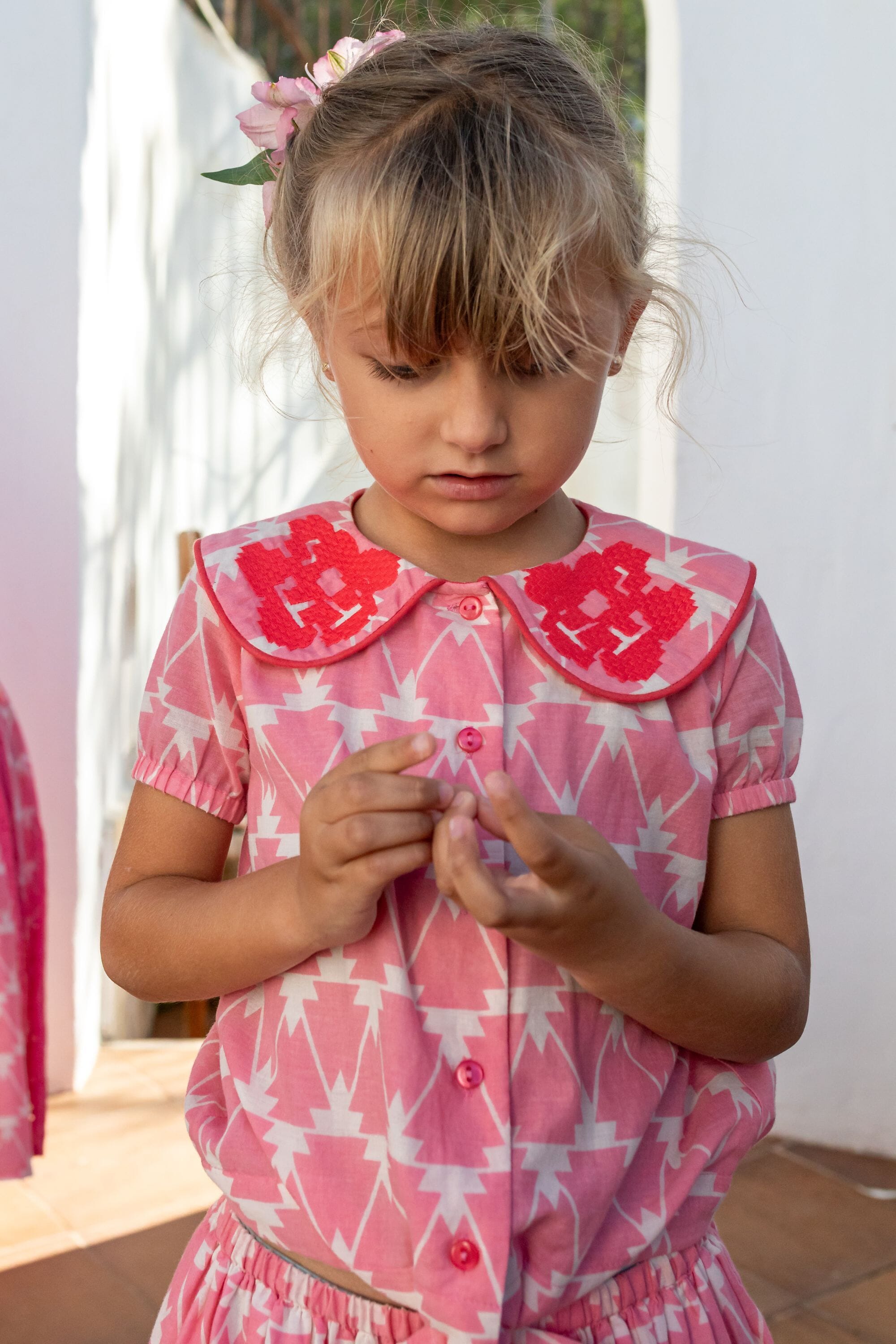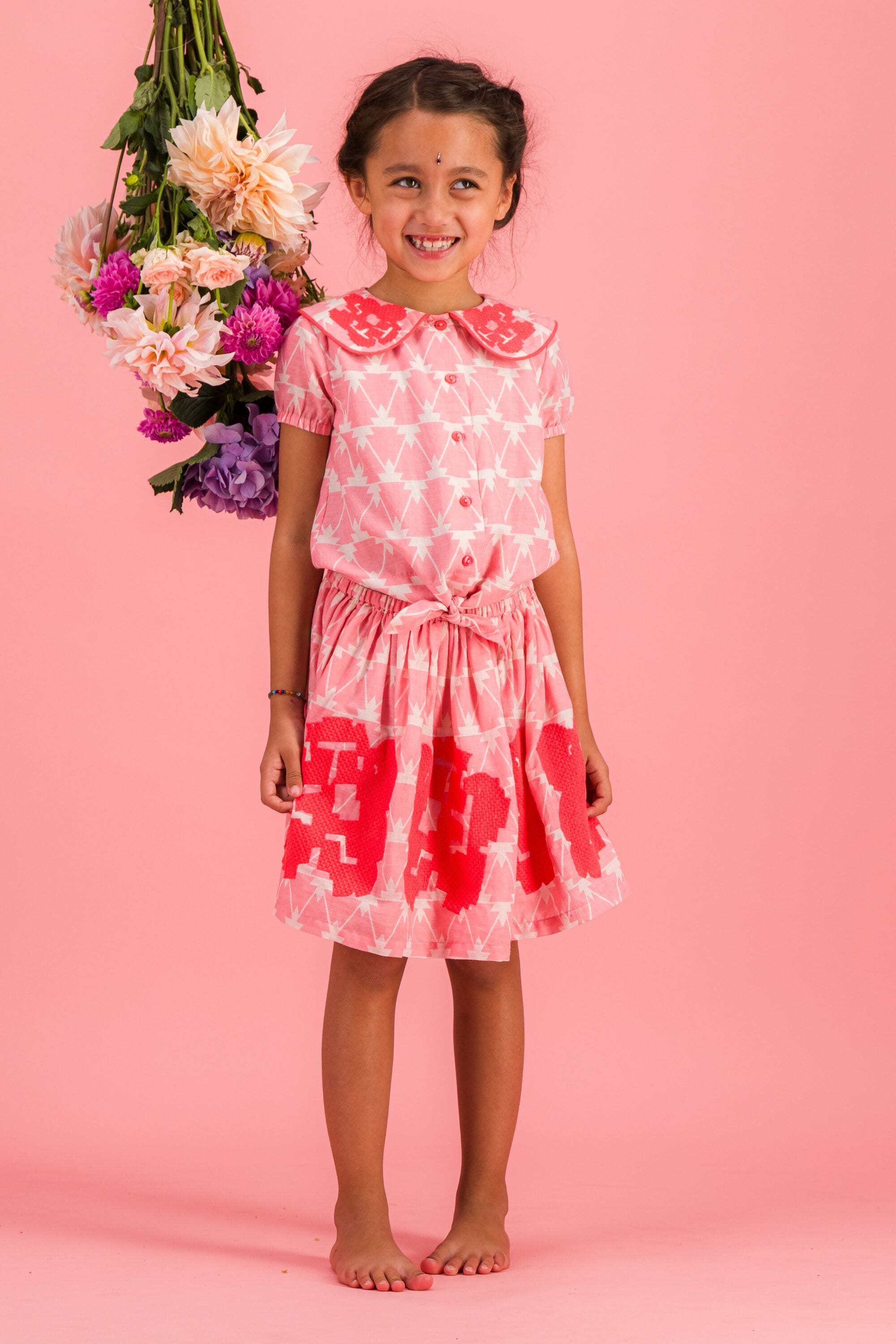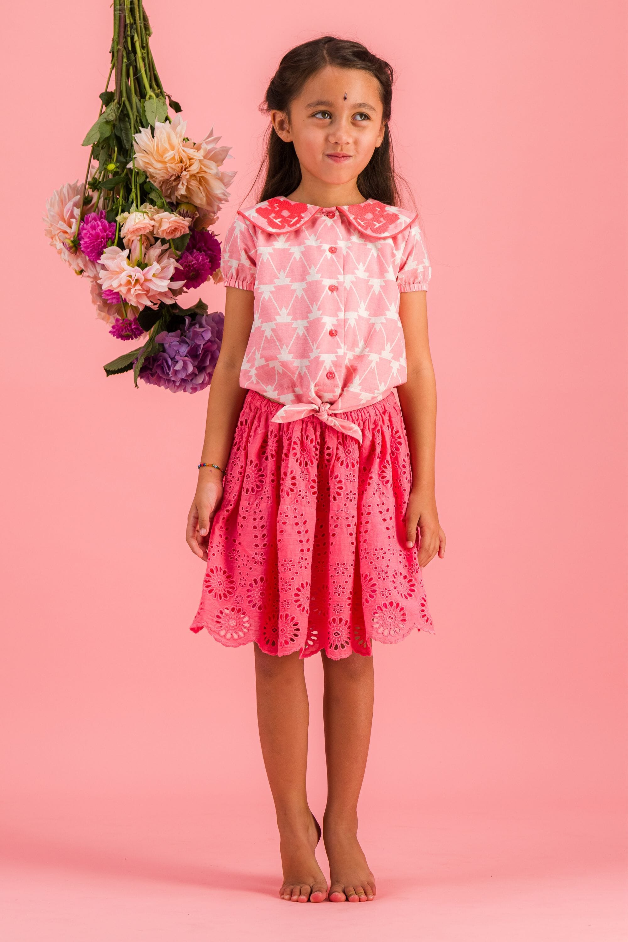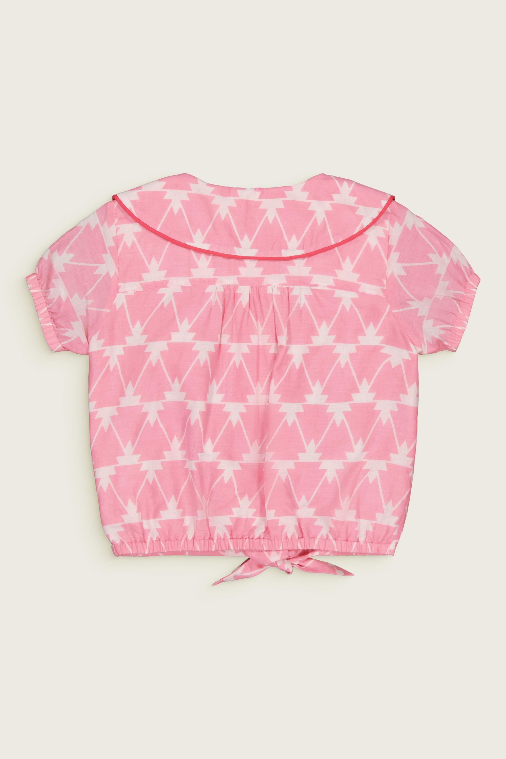 - Blouse, 100% organic cotton, Block print, Embroidery and contrasted piping, Gathers on the back, Elasticated short sleeves, Knot on the front, Contrasted button on the front.