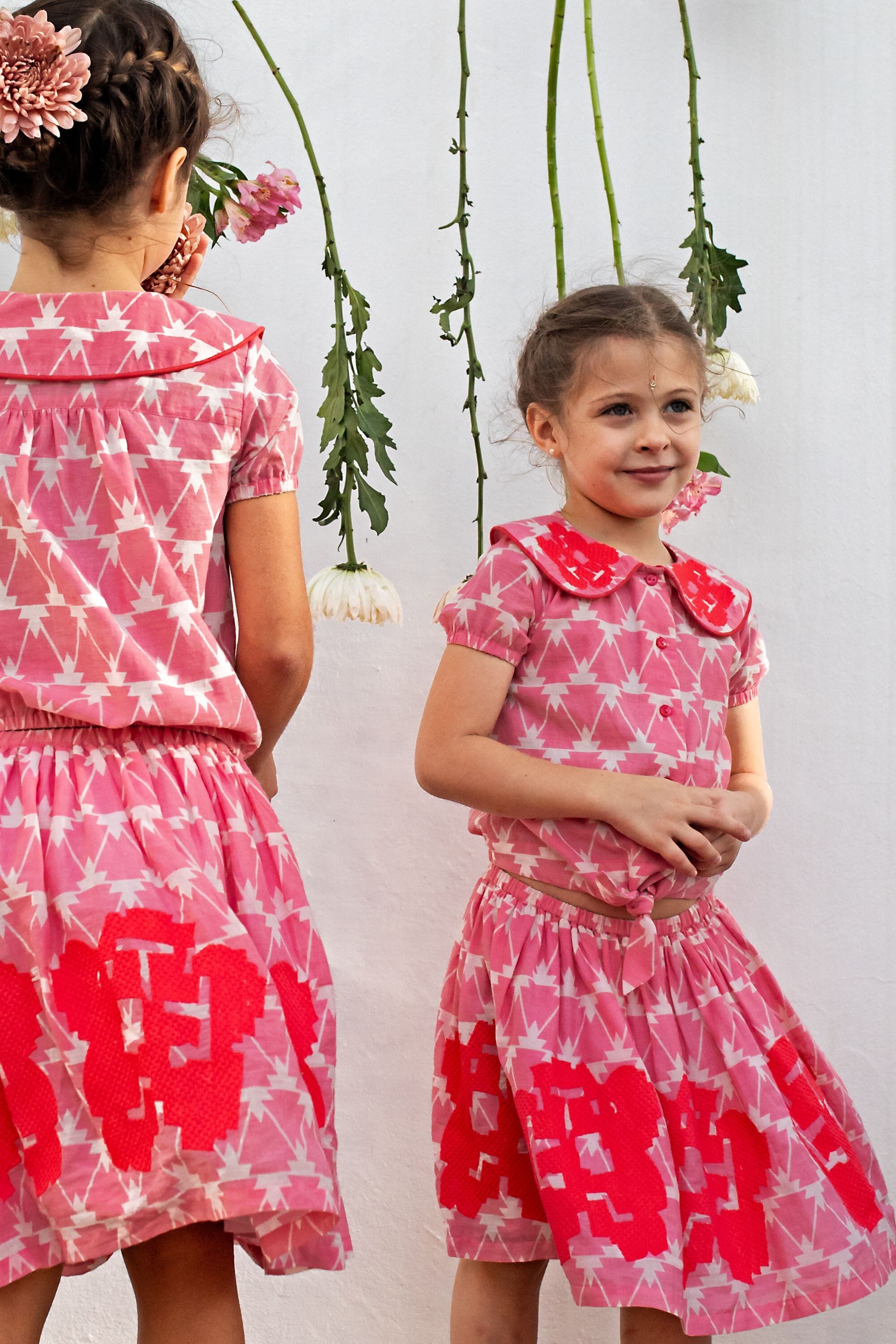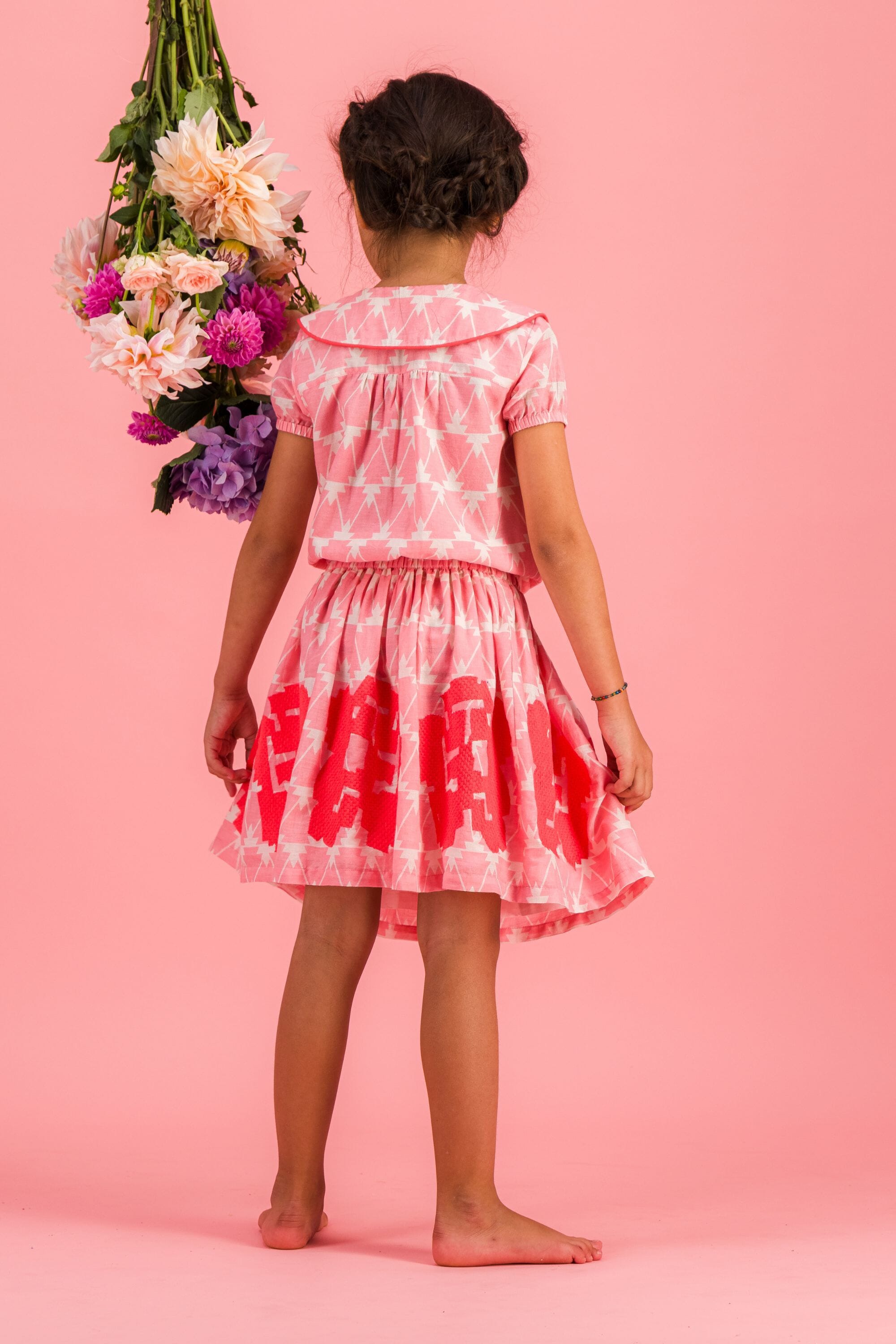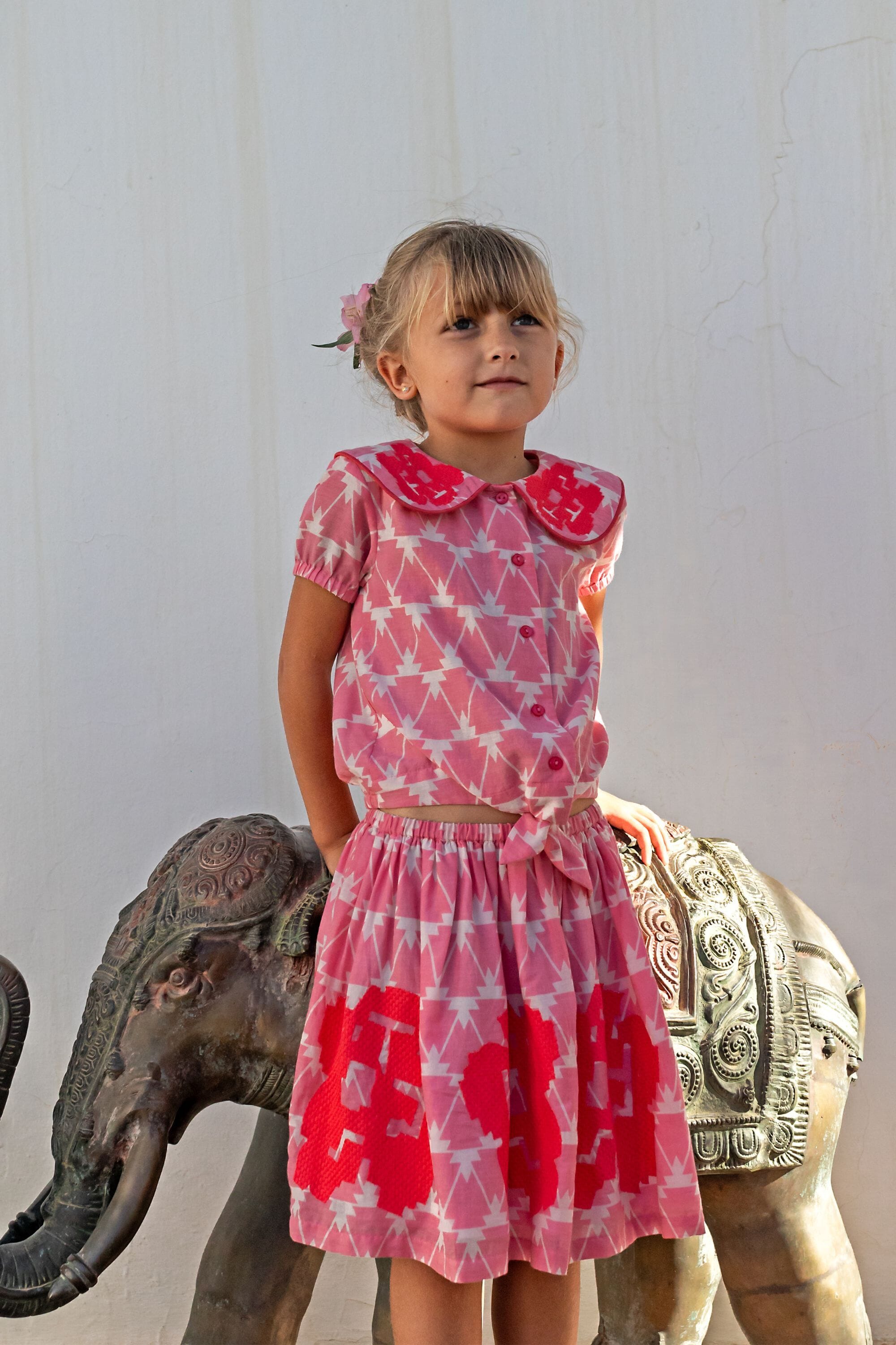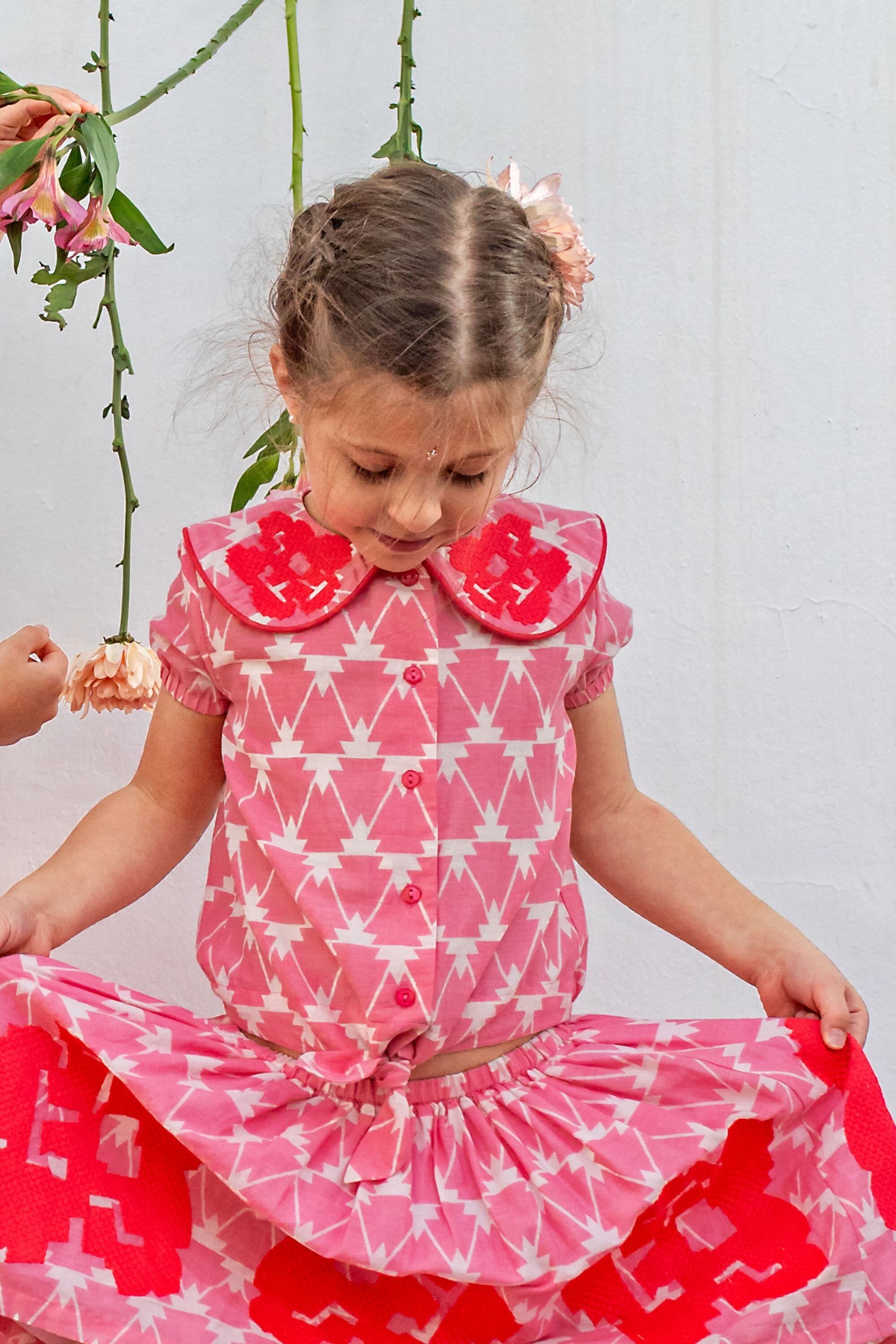 - Blouse, 100% organic cotton, Block print, Embroidery and contrasted piping, Gathers on the back, Elasticated short sleeves, Knot on the front, Contrasted button on the front.