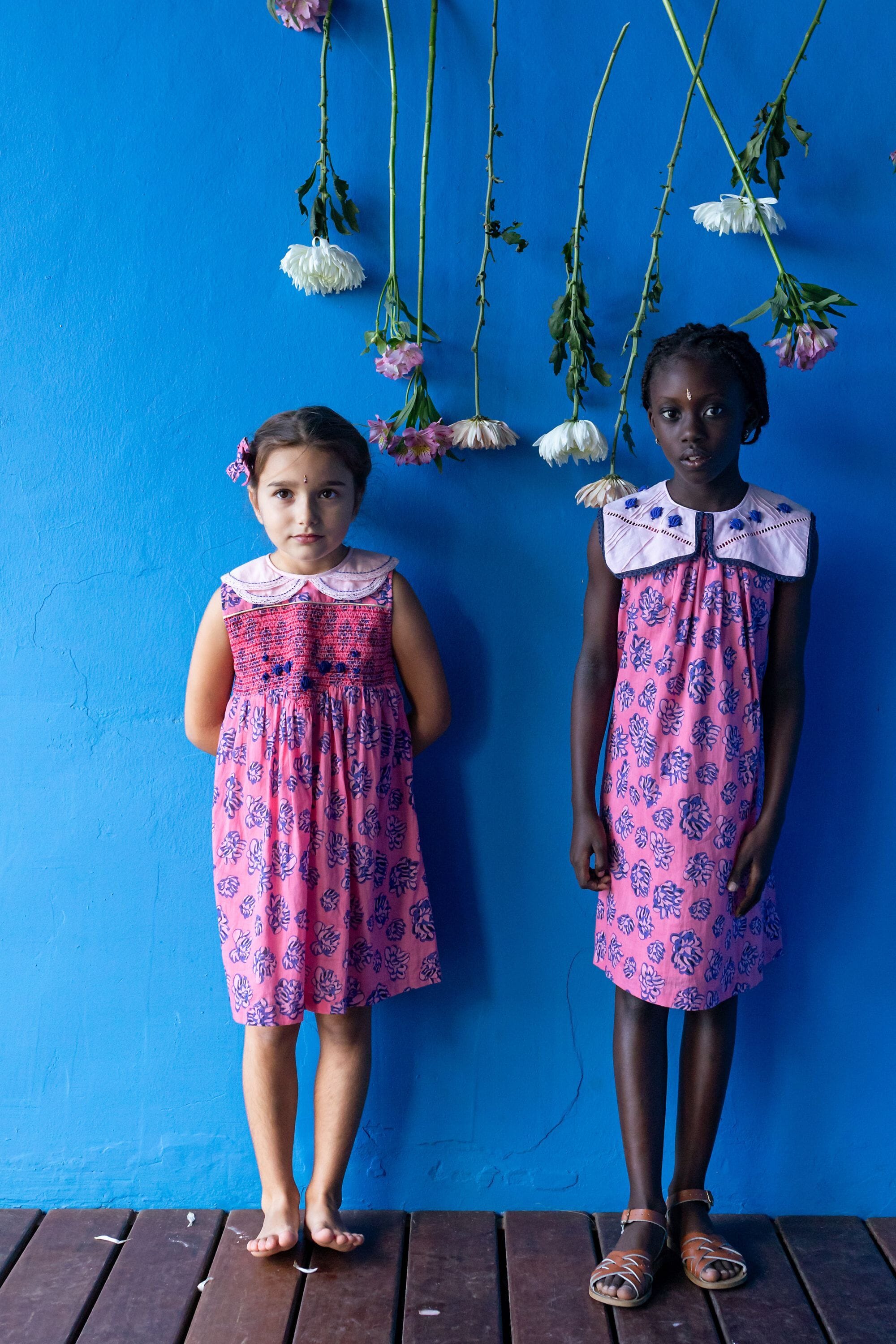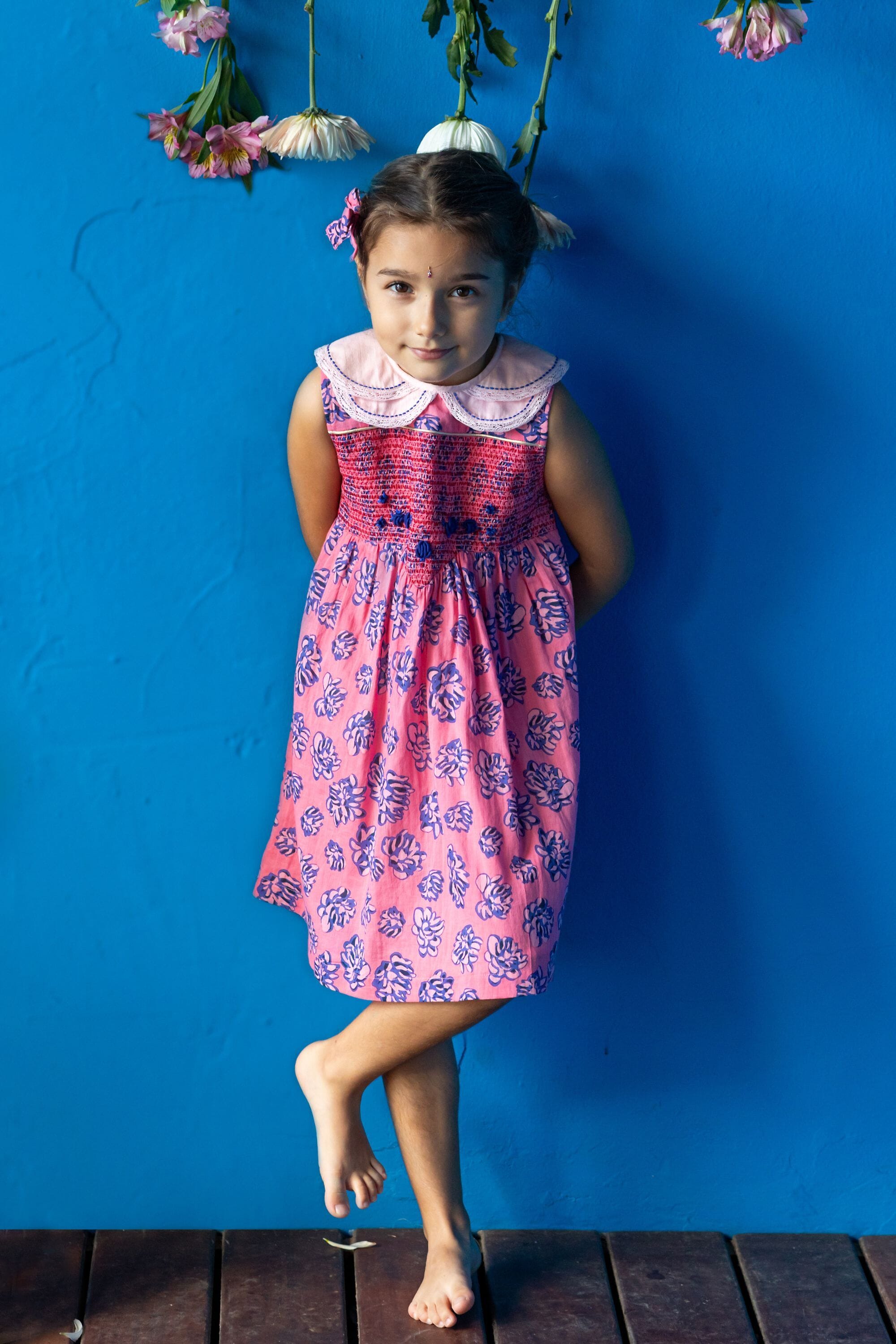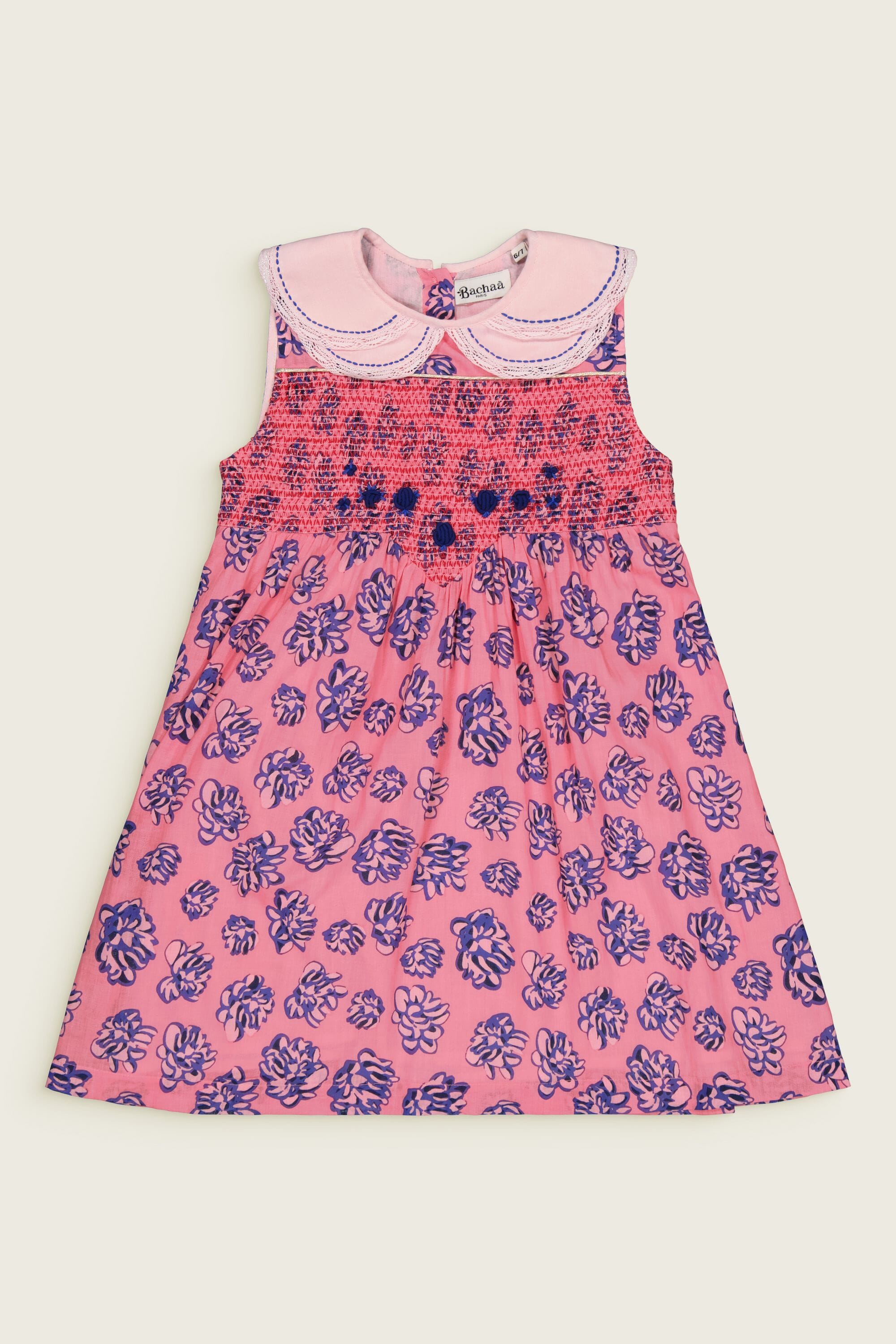 - Sleeveless dress, 100% organic cotton, Plain lining in organic cotton voile, Block print, Double hand-stitched Peter Pan collar and lace finishing, Smocks, Golden piping and hand-embroidered flowers on the front yoke, Contrasted buttons on the back.