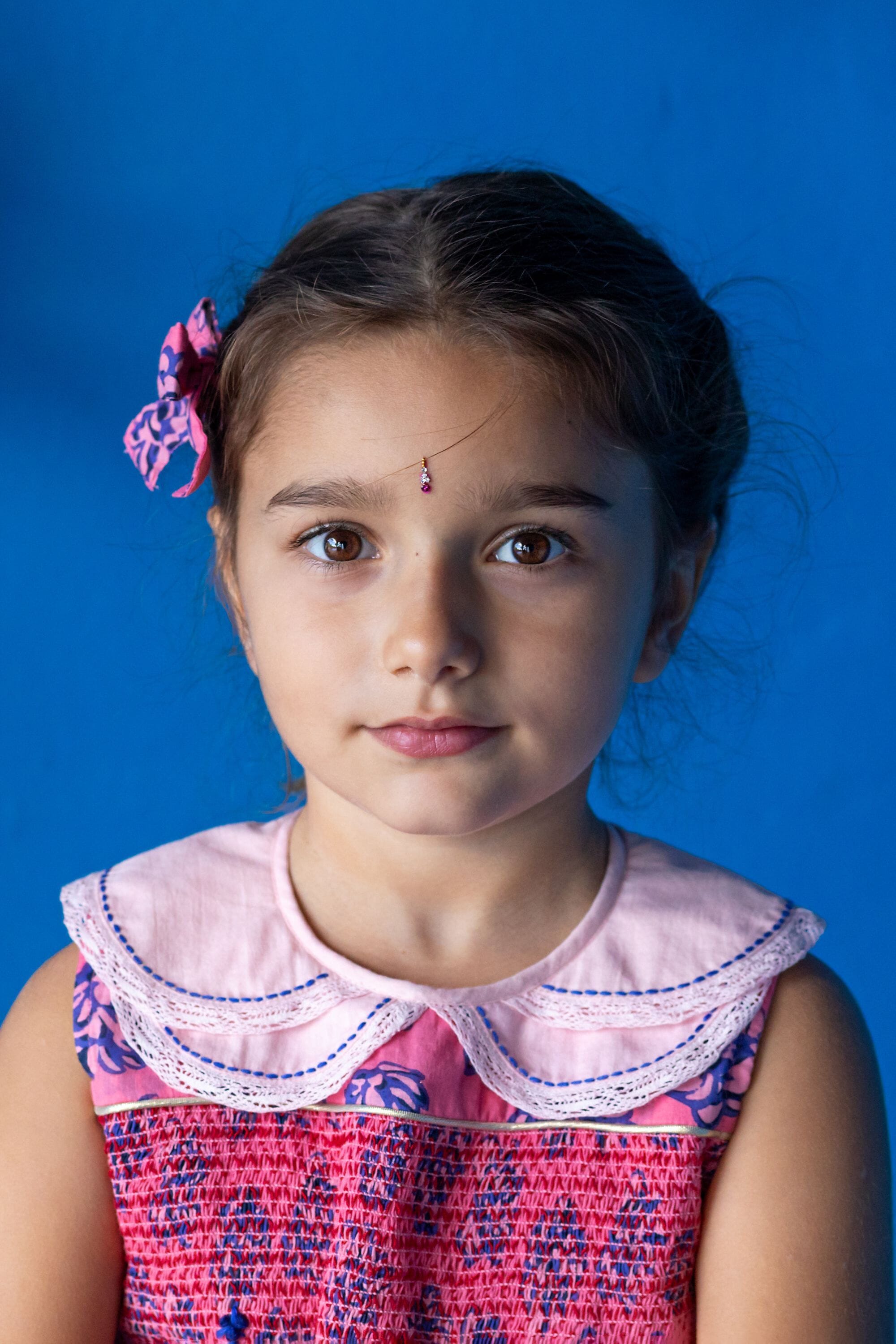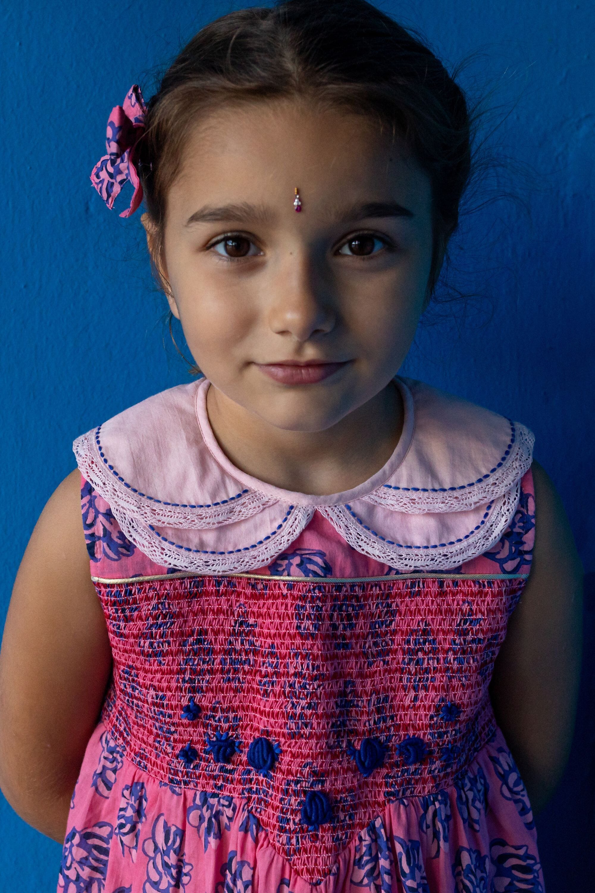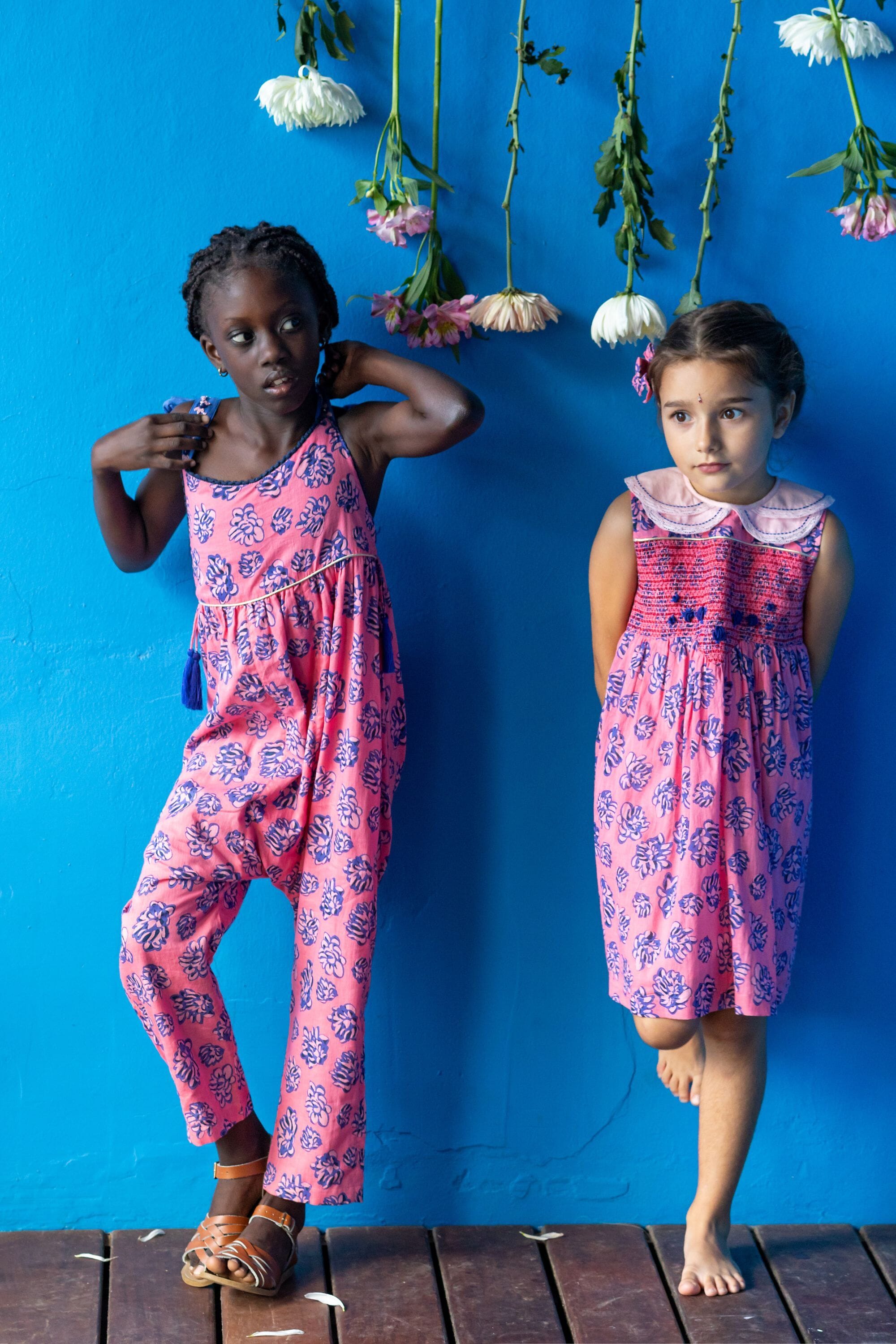 - Sleeveless dress, 100% organic cotton, Plain lining in organic cotton voile, Block print, Double hand-stitched Peter Pan collar and lace finishing, Smocks, Golden piping and hand-embroidered flowers on the front yoke, Contrasted buttons on the back.