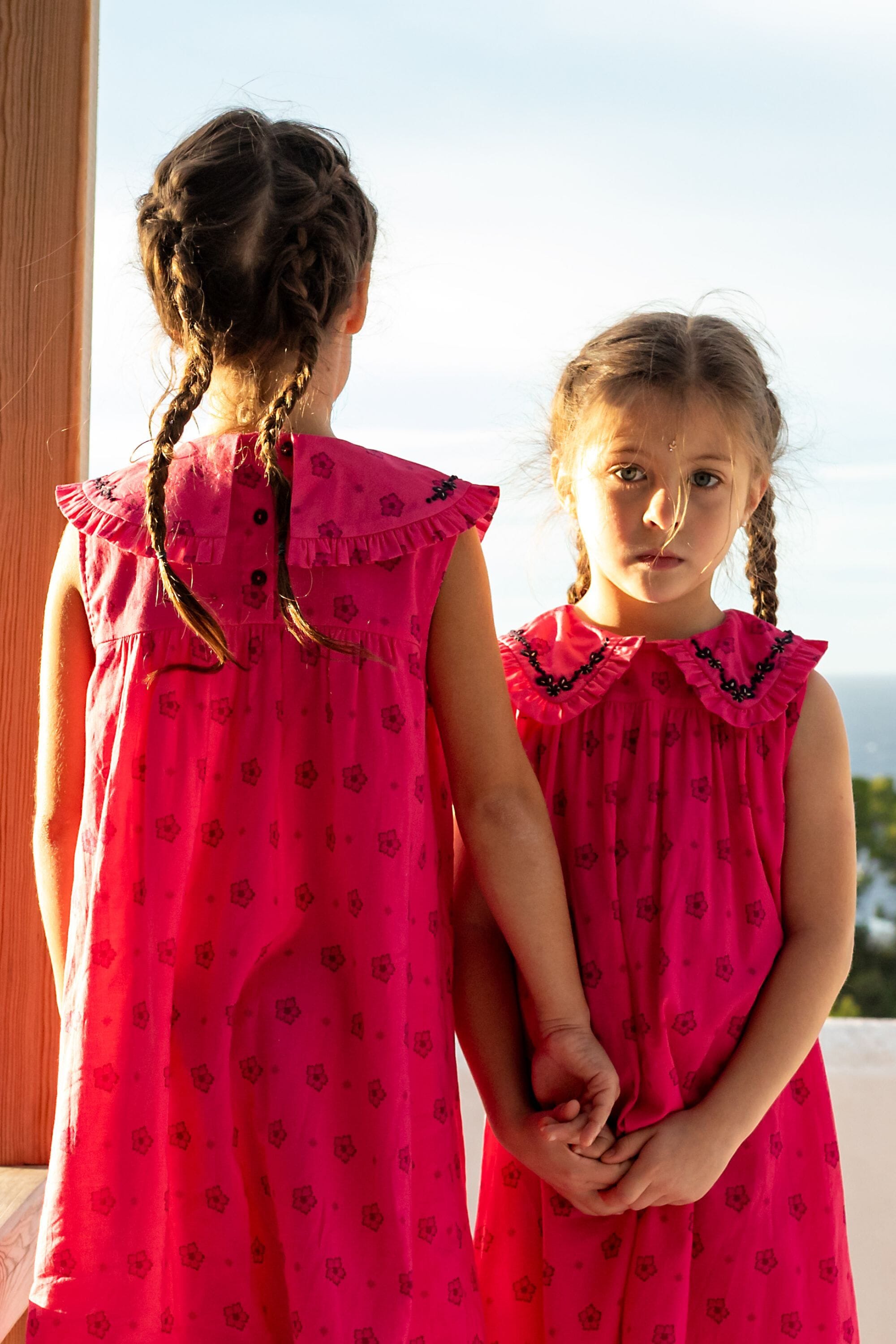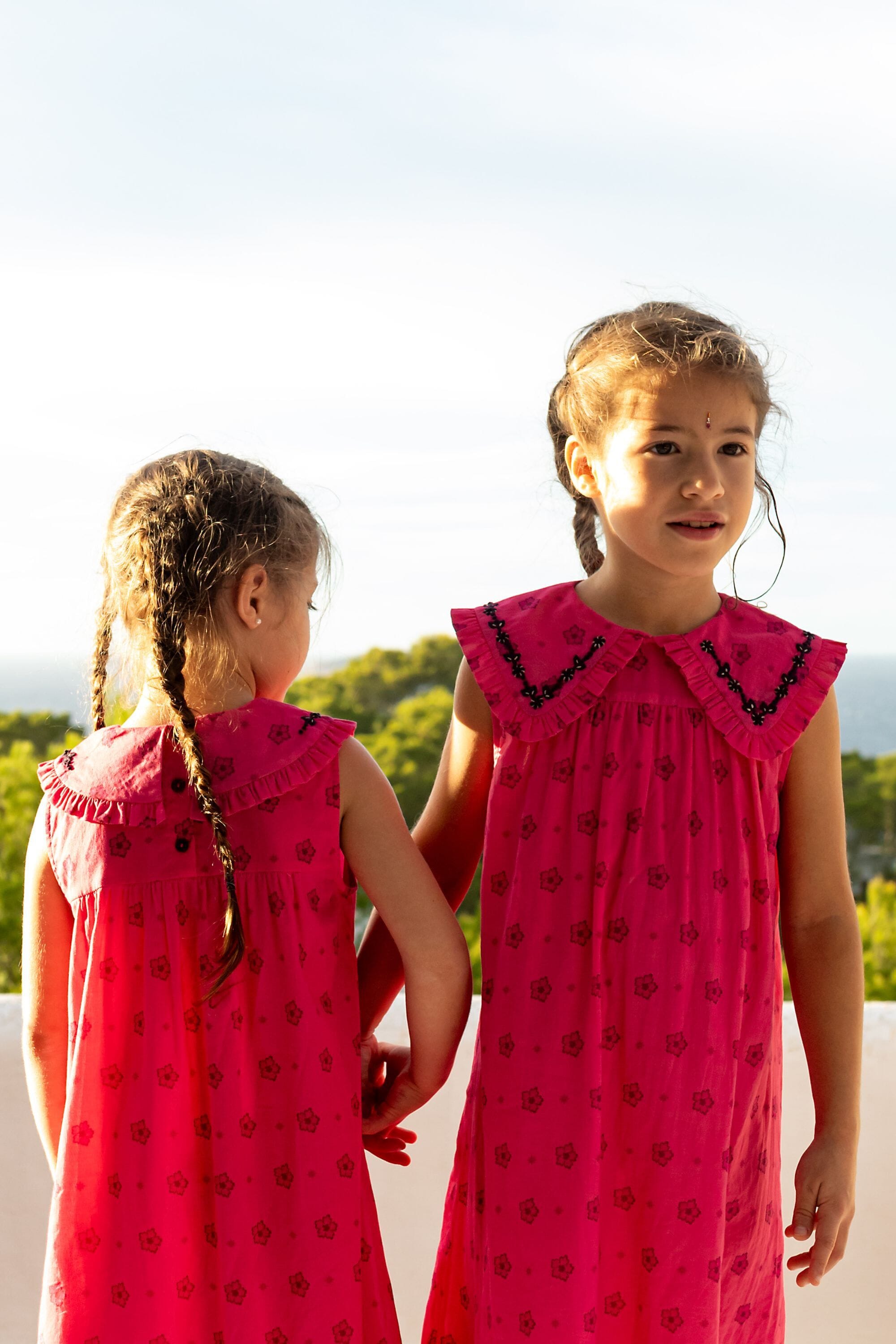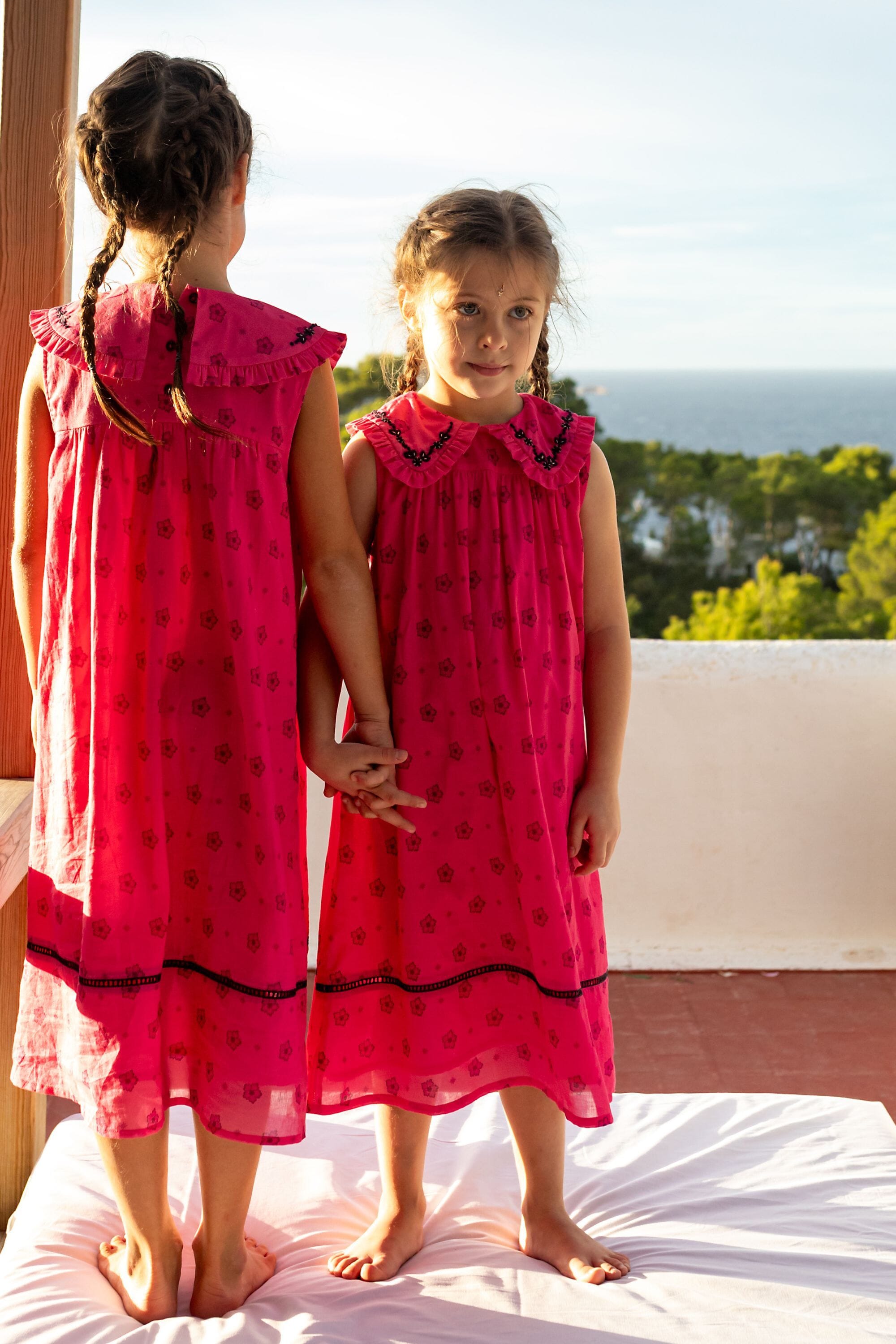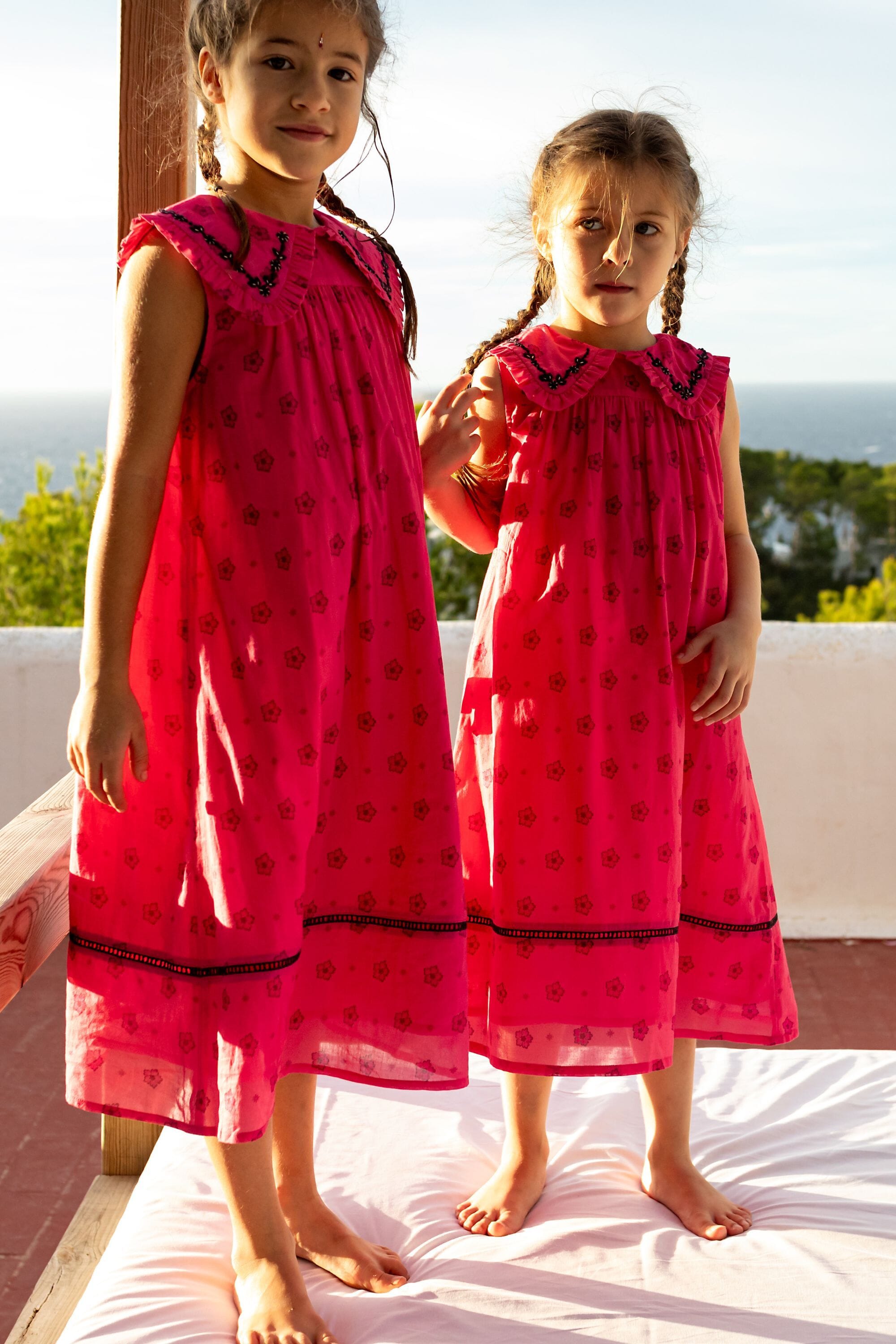 Sleeveless nightdress, 100% organic cotton, Plain lining in organic cotton voile, Block print, Hand embroidery on the collar, Ladder lace at the bottom of the sleeves and on the front, Gathers on the front and back, Contrasted buttons.