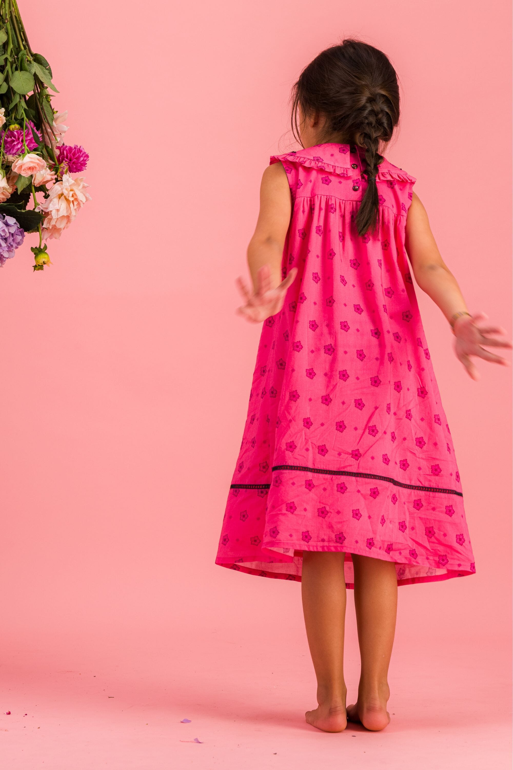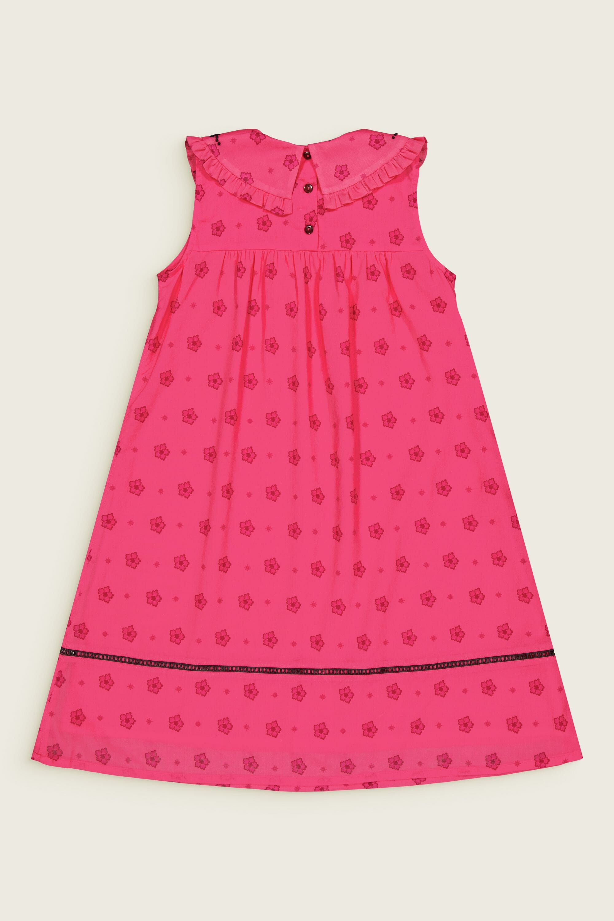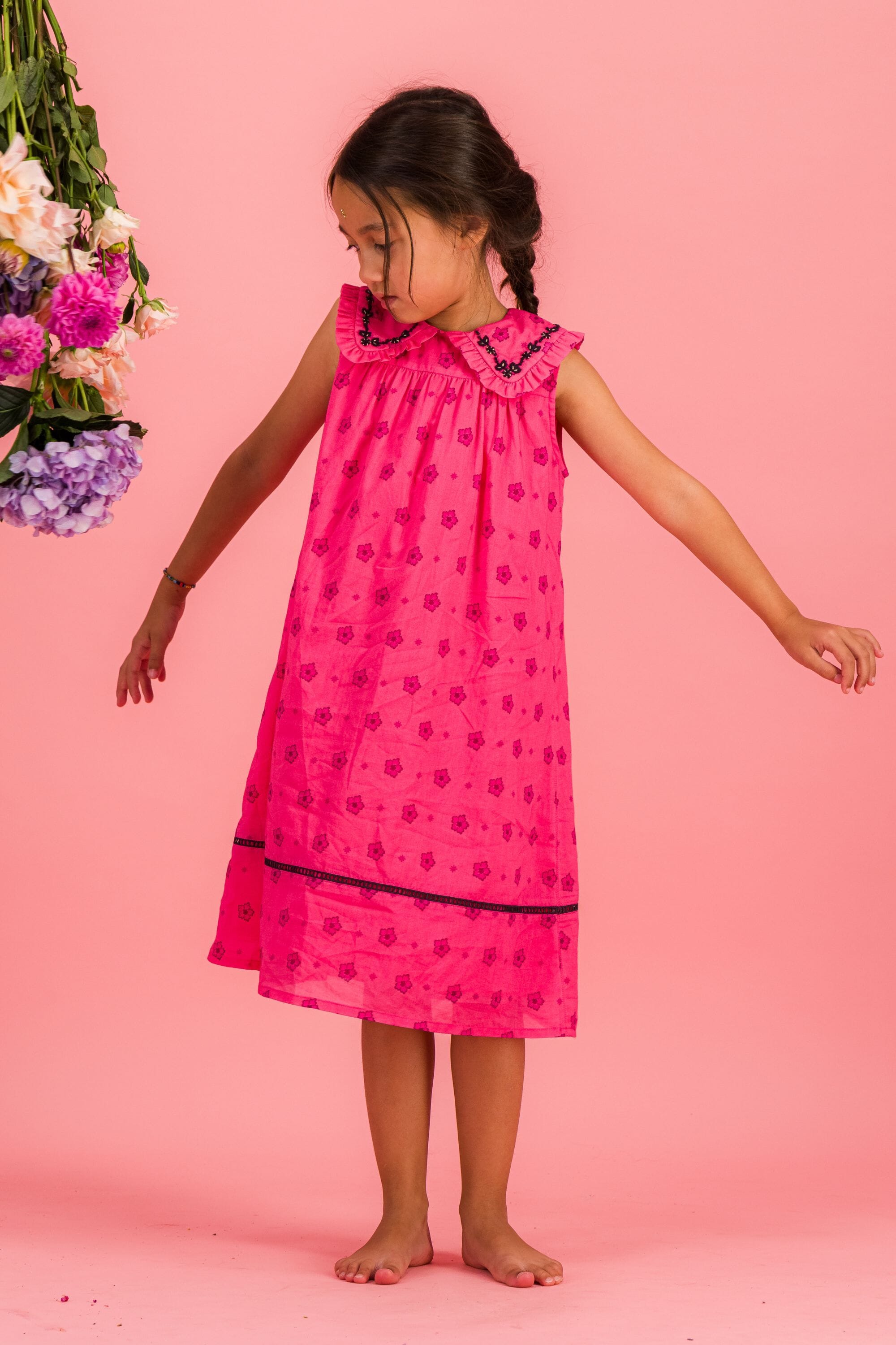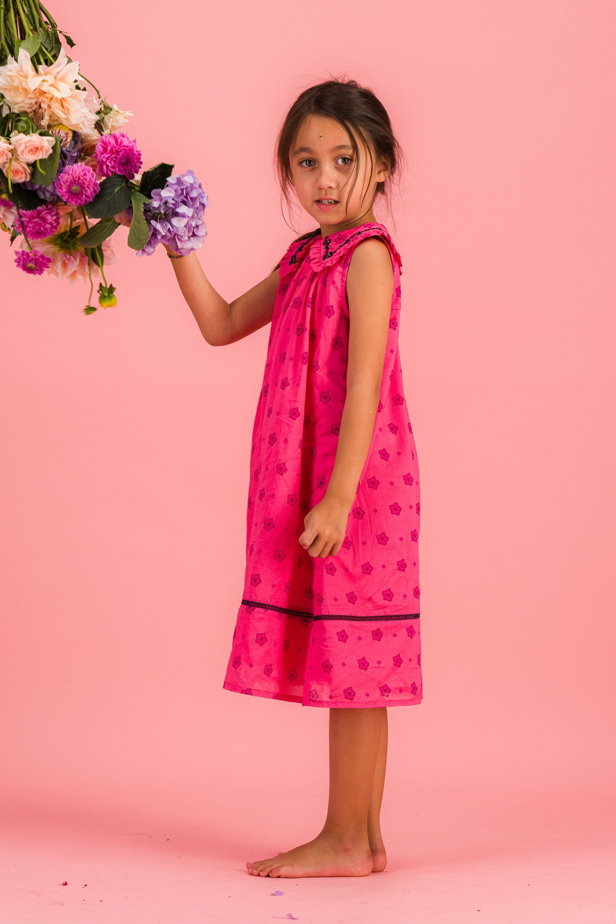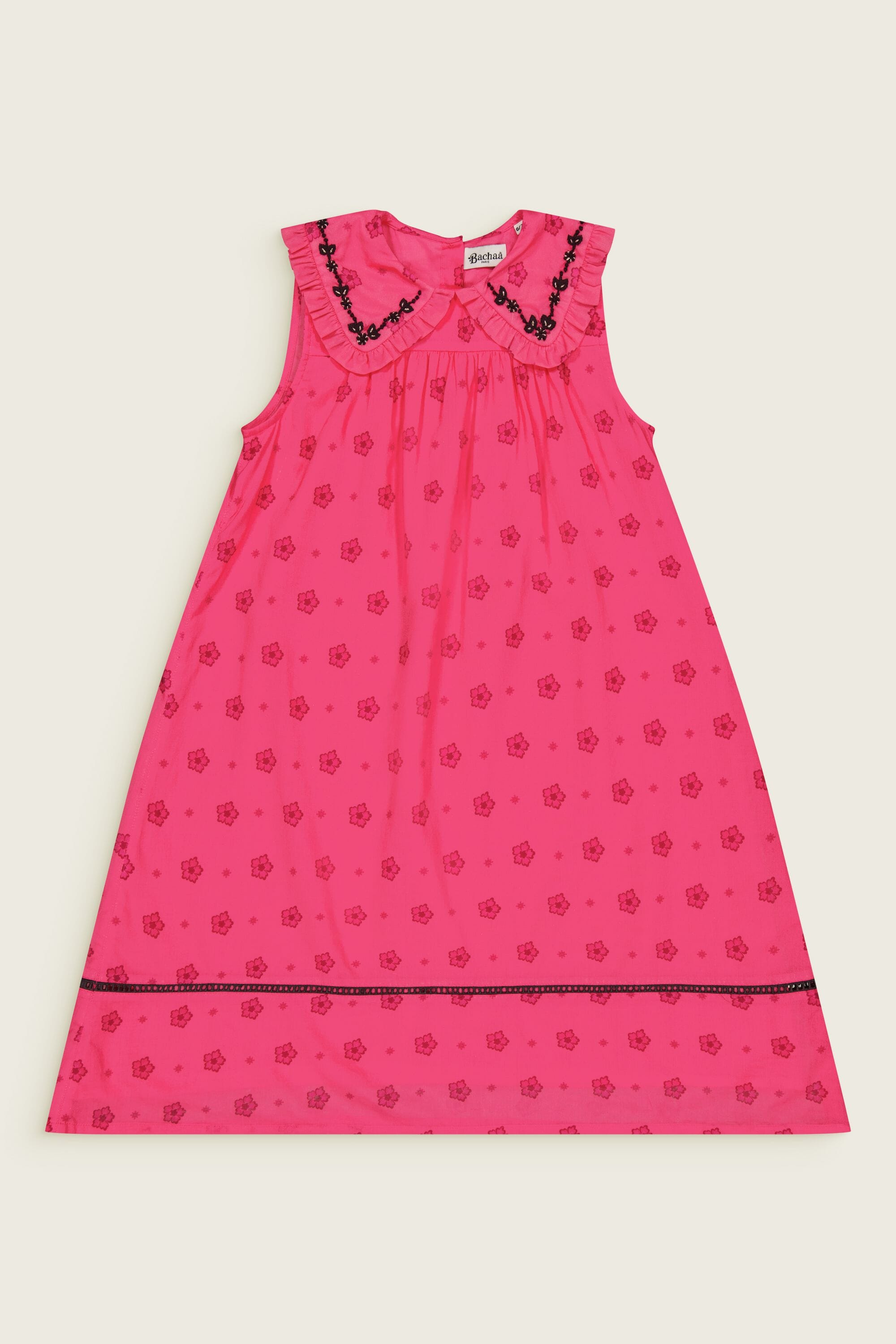 Sleeveless nightdress, 100% organic cotton, Plain lining in organic cotton voile, Block print, Hand embroidery on the collar, Ladder lace at the bottom of the sleeves and on the front, Gathers on the front and back, Contrasted buttons.