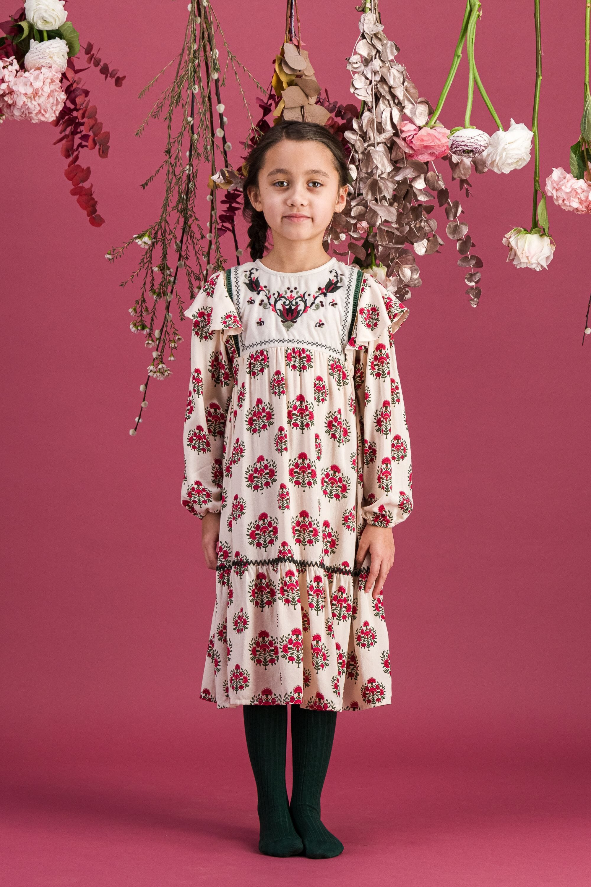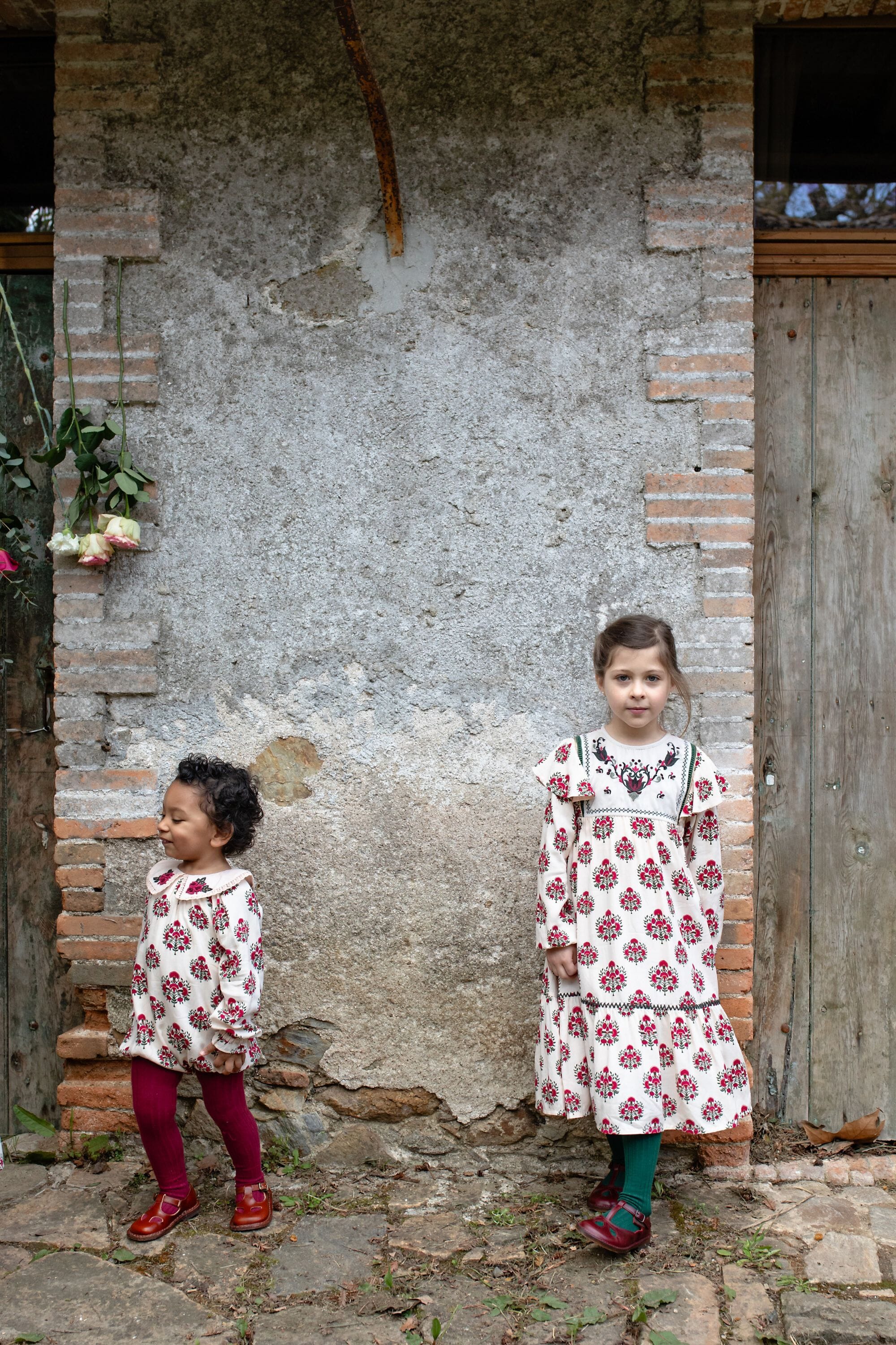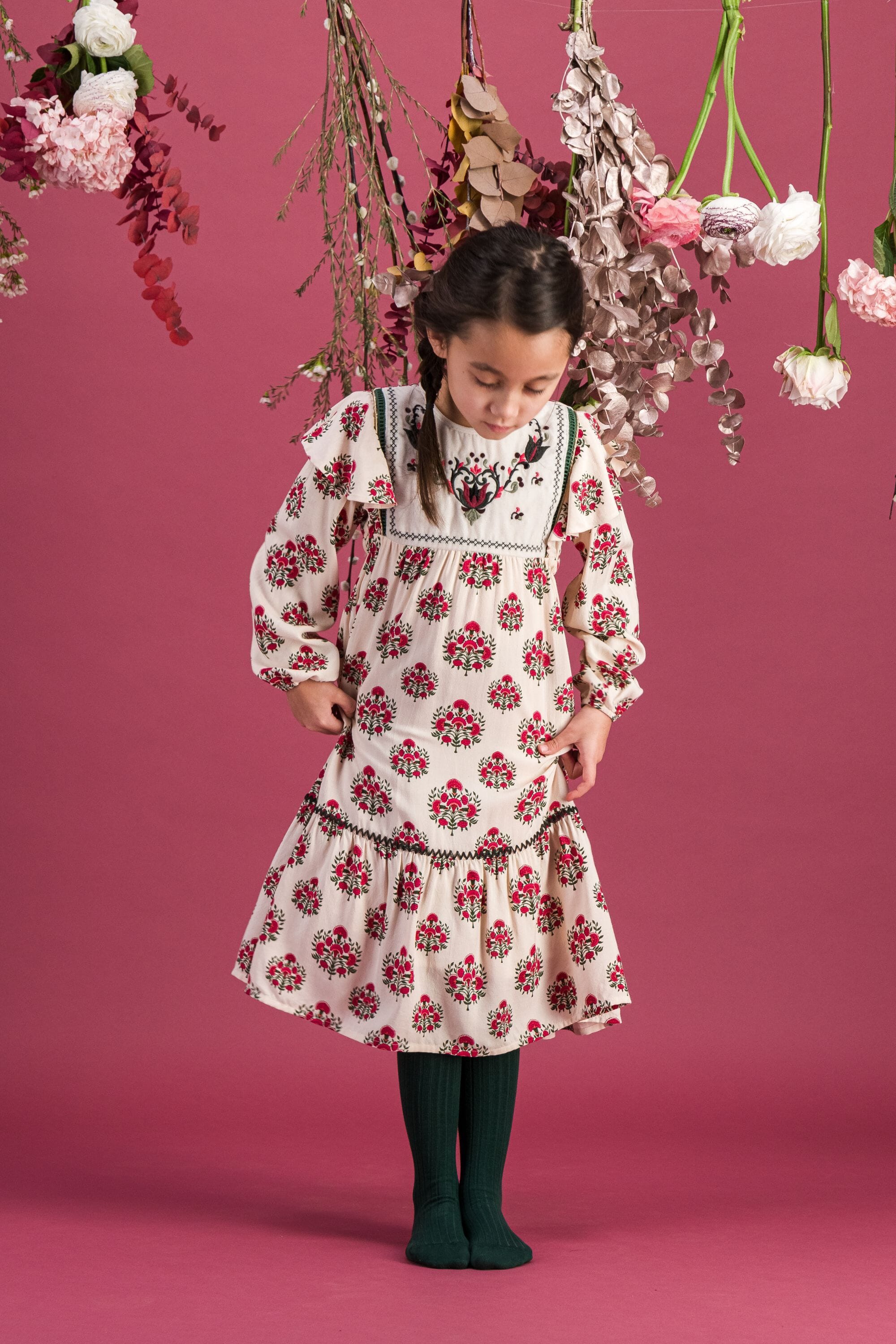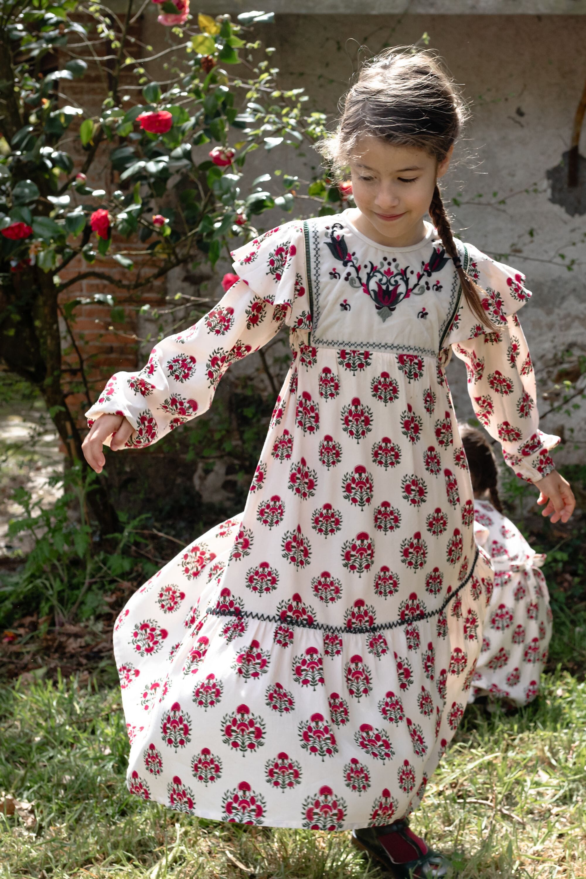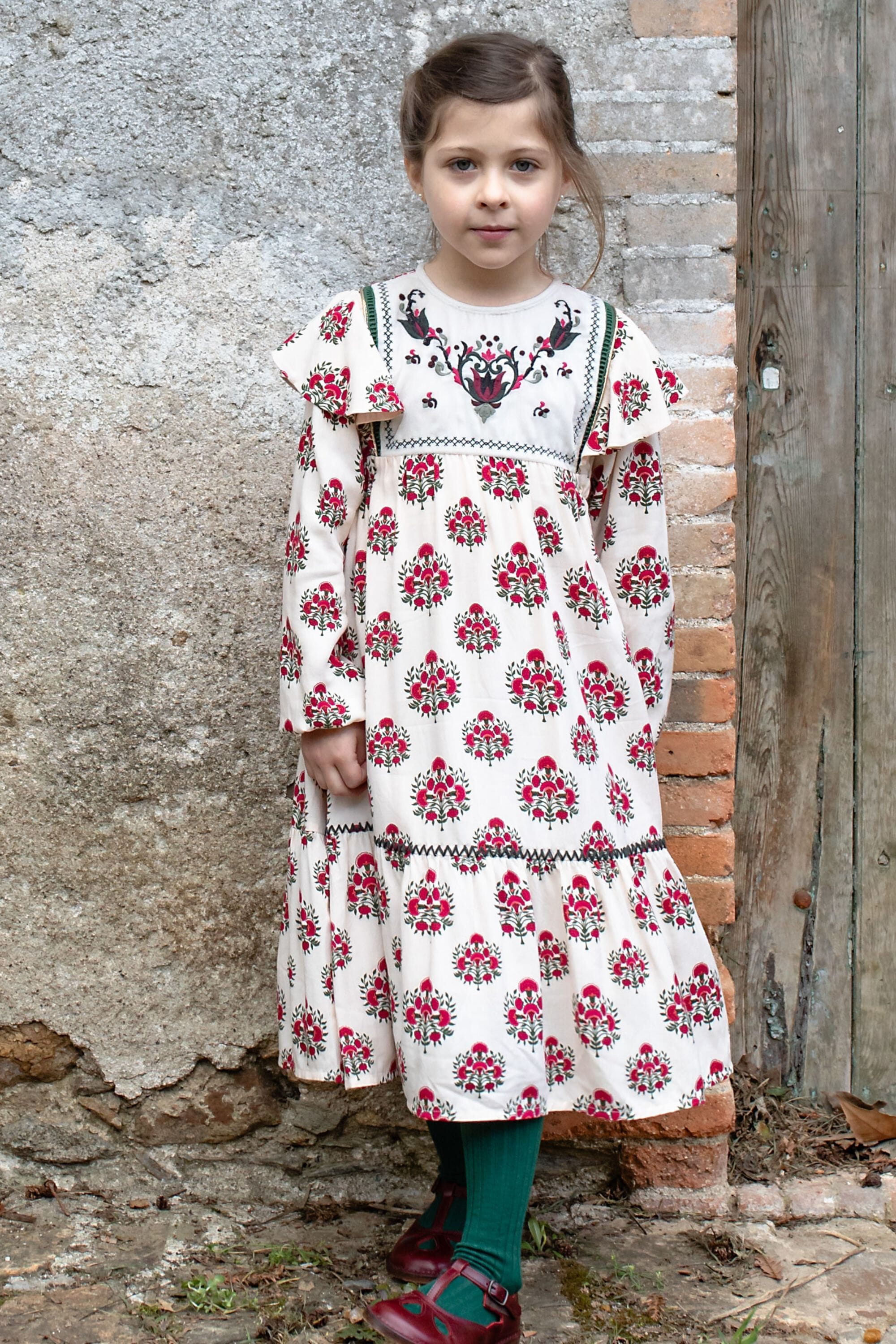 - Long dress, 100% ECOVERO® Viscose, Block print, Contrasted lining in organic cotton voile, Embroidery and ladder lace on the front, Golden piping, Long and lined ruffled sleeves, Golden buttons and Belt at the back.