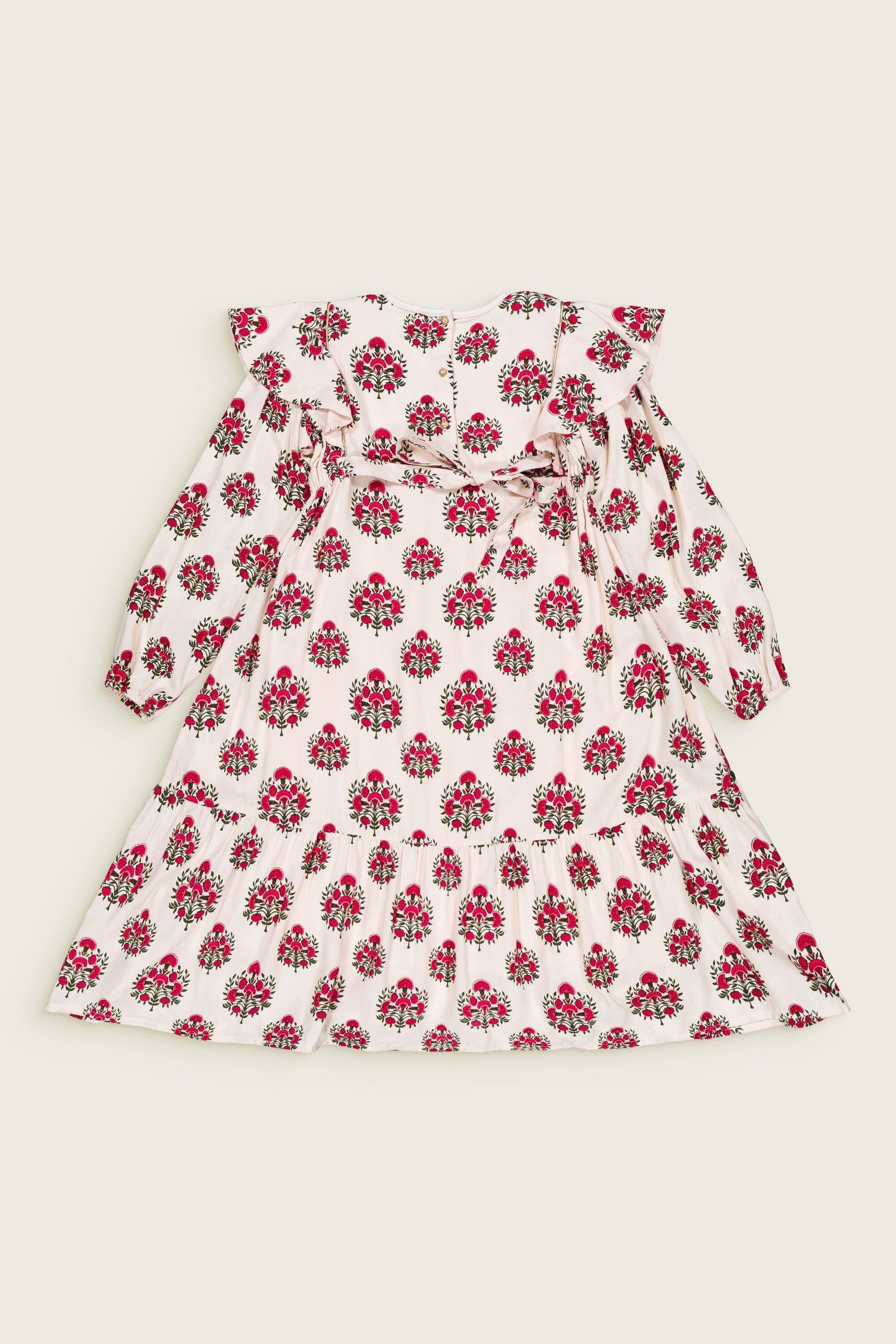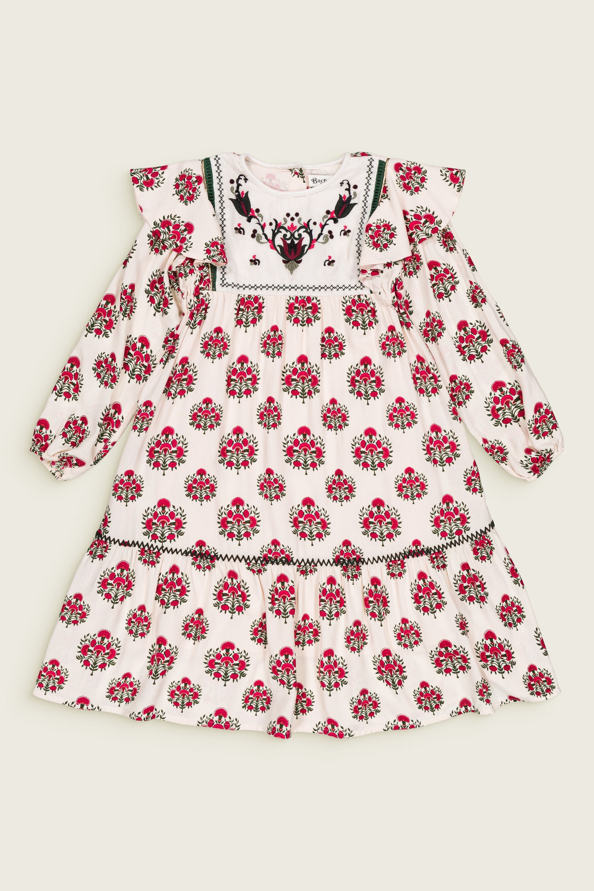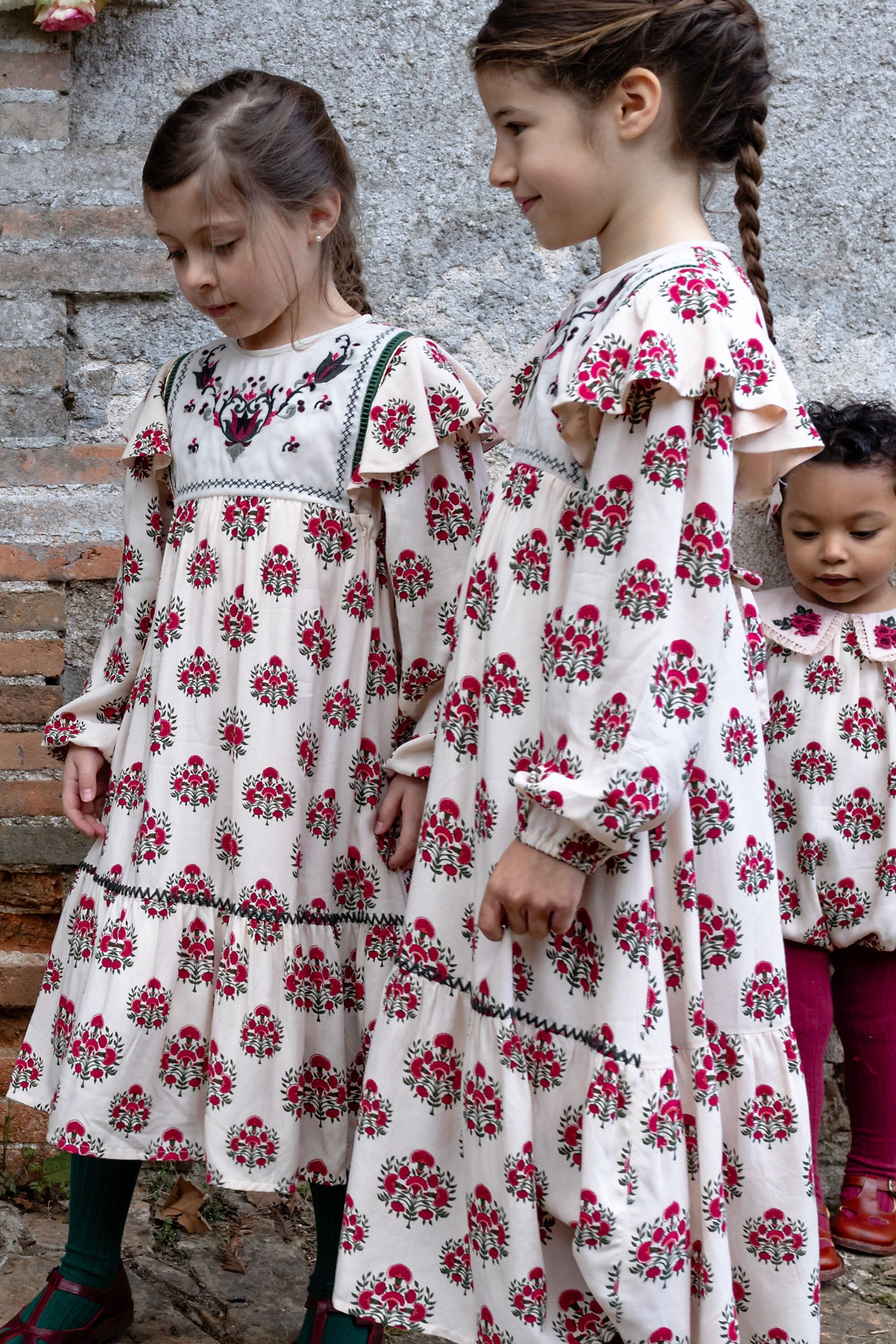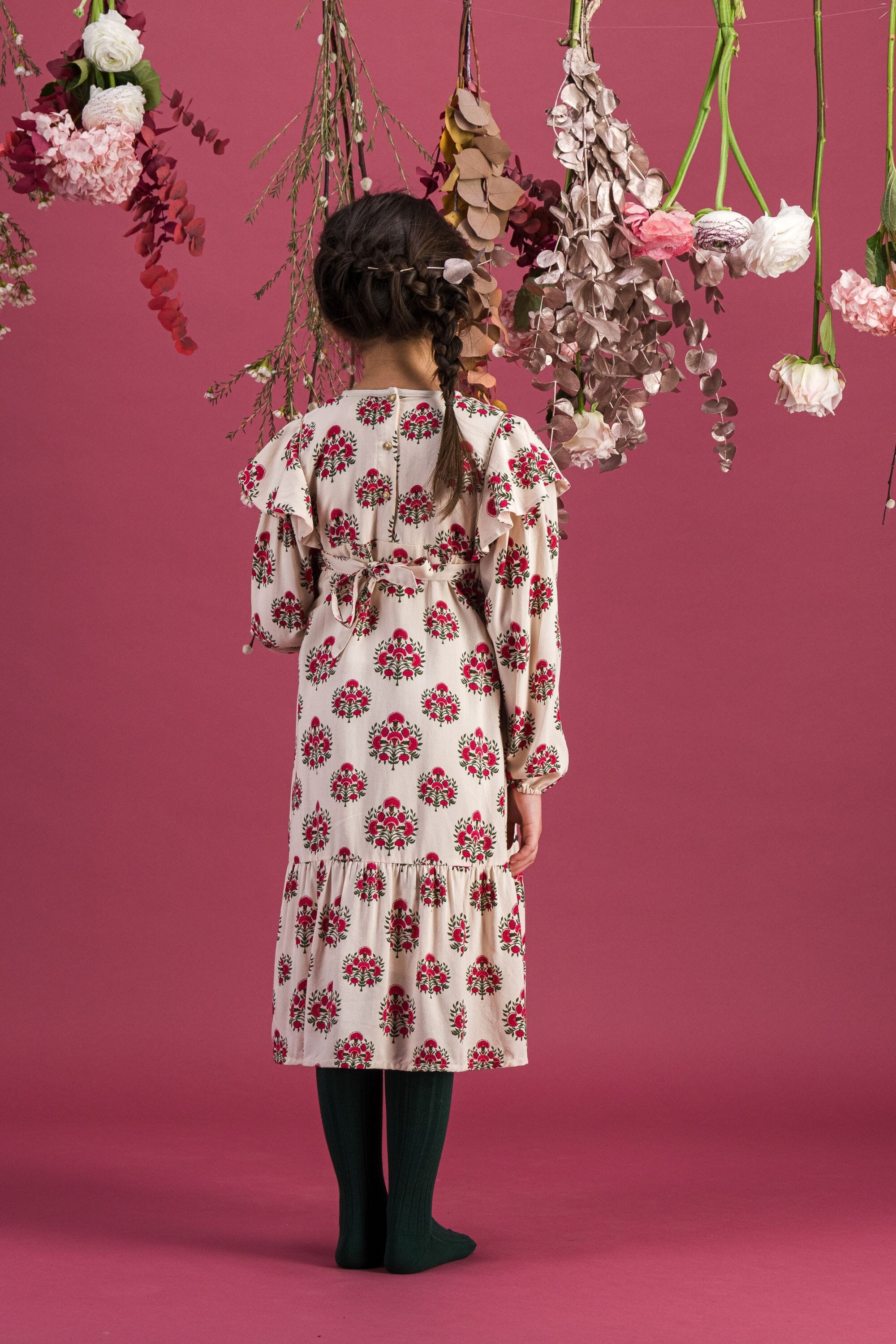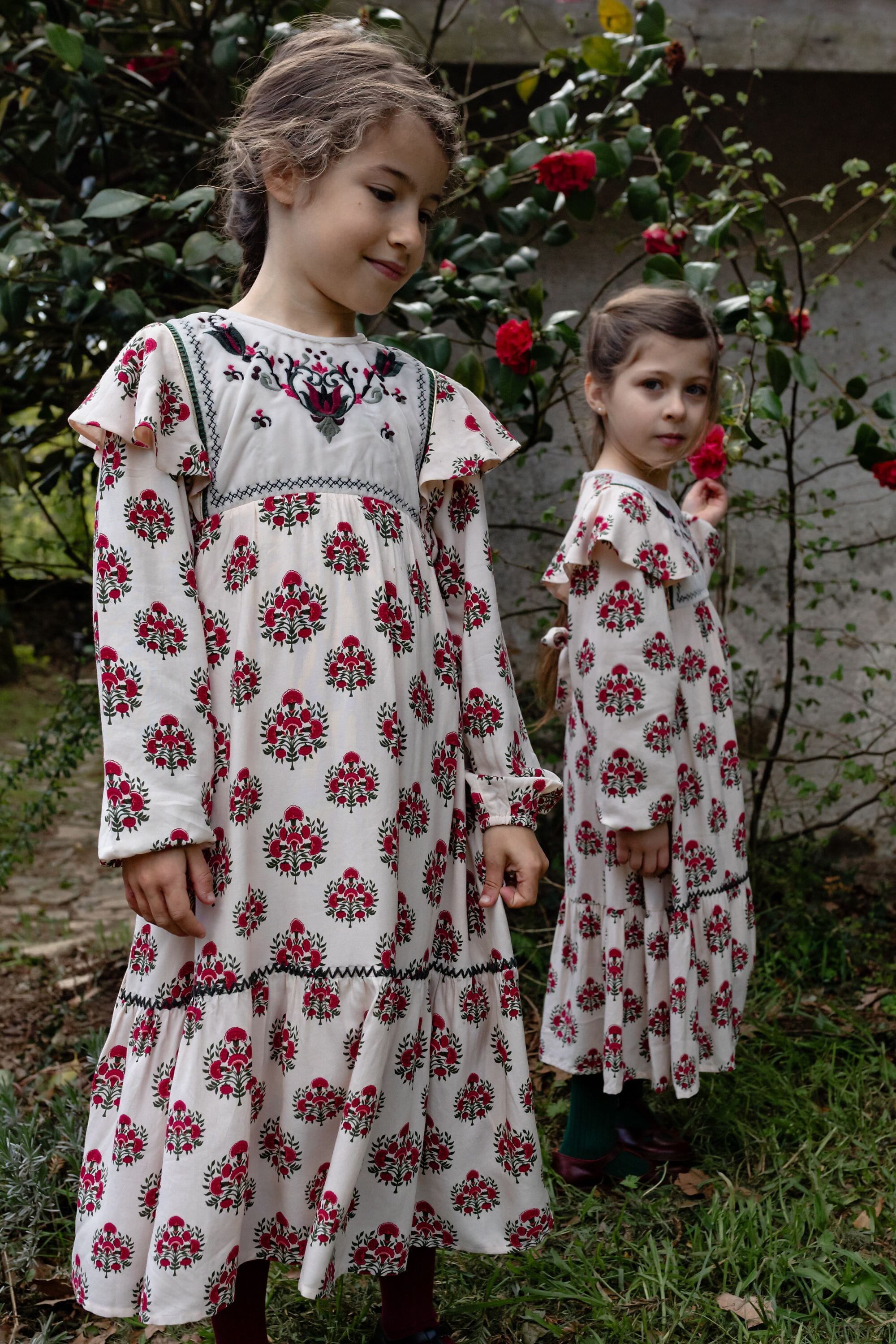 - Long dress, 100% ECOVERO® Viscose, Block print, Contrasted lining in organic cotton voile, Embroidery and ladder lace on the front, Golden piping, Long and lined ruffled sleeves, Golden buttons and Belt at the back.