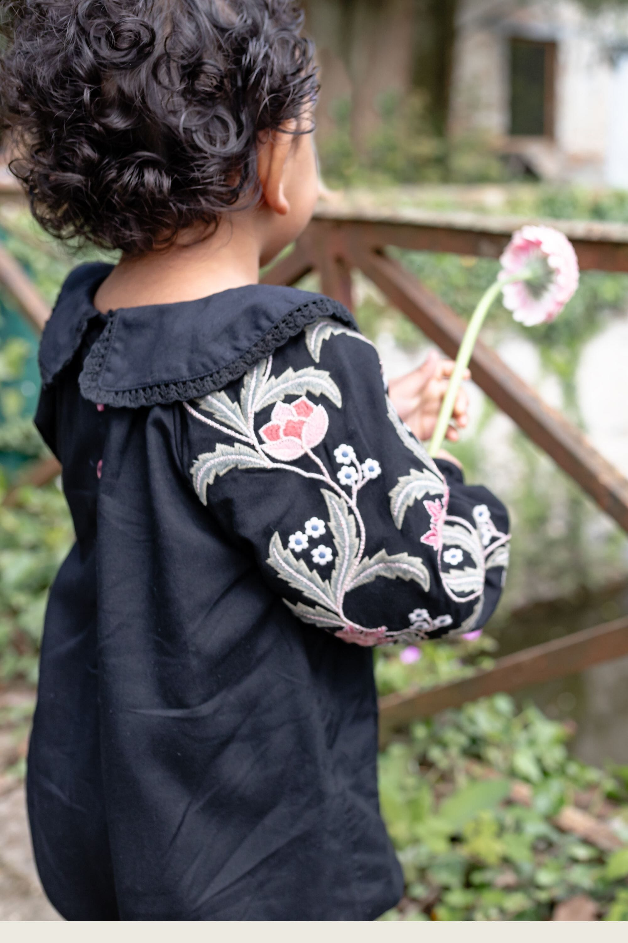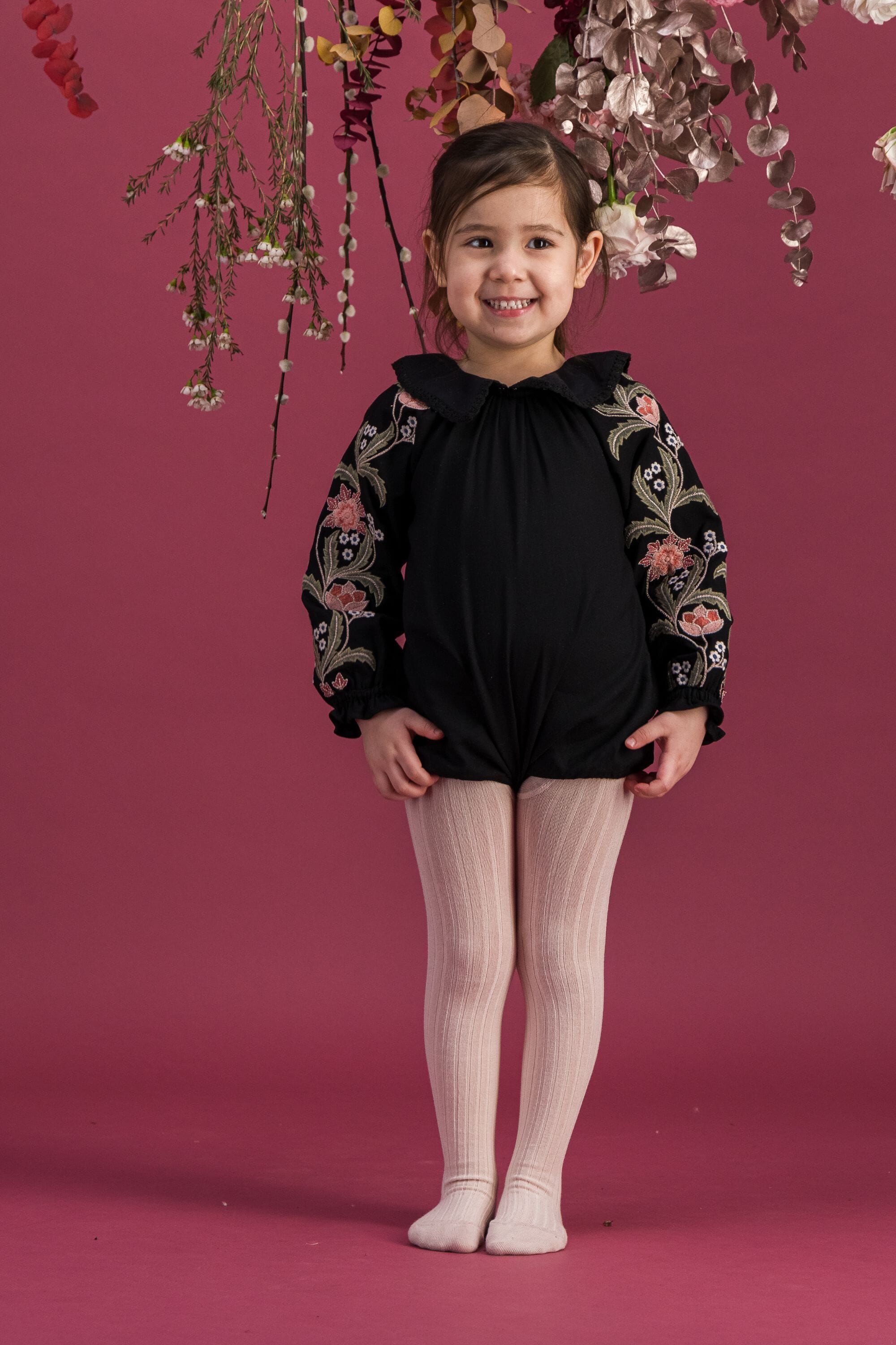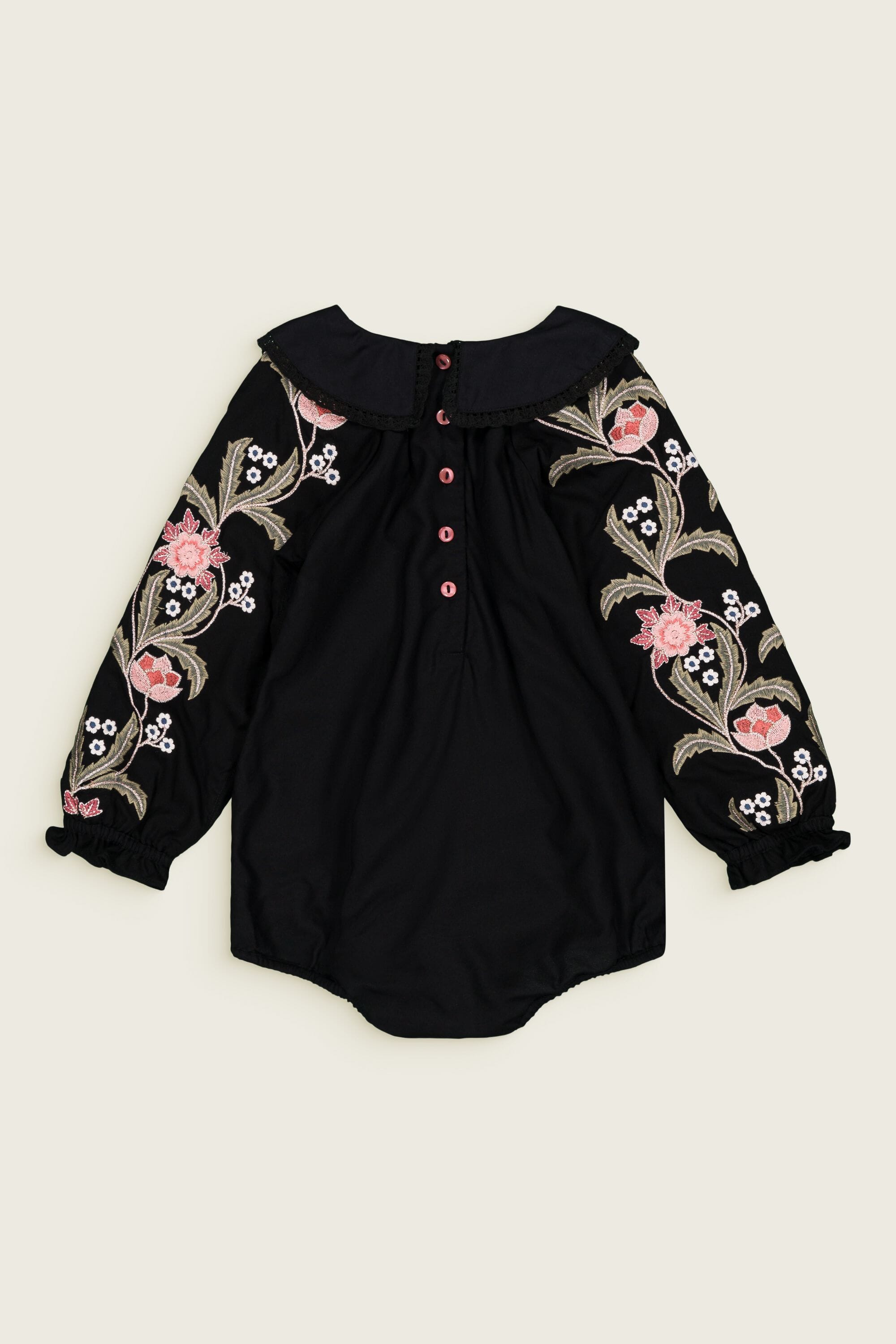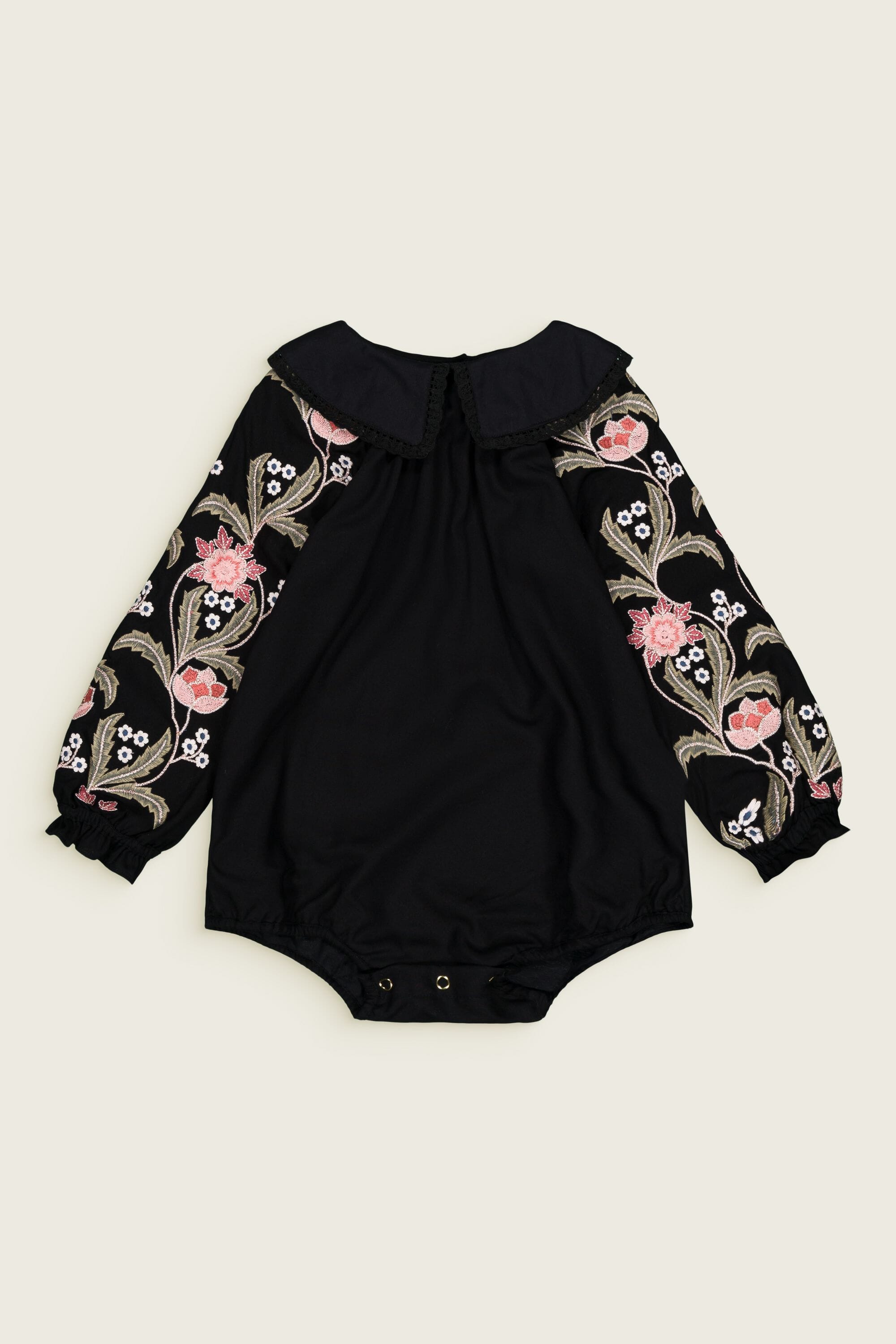 A Moon Stone colored romper in ECOVERO® Viscose with fully embroidered sleeves and a tone on tone collar with lace finishing.