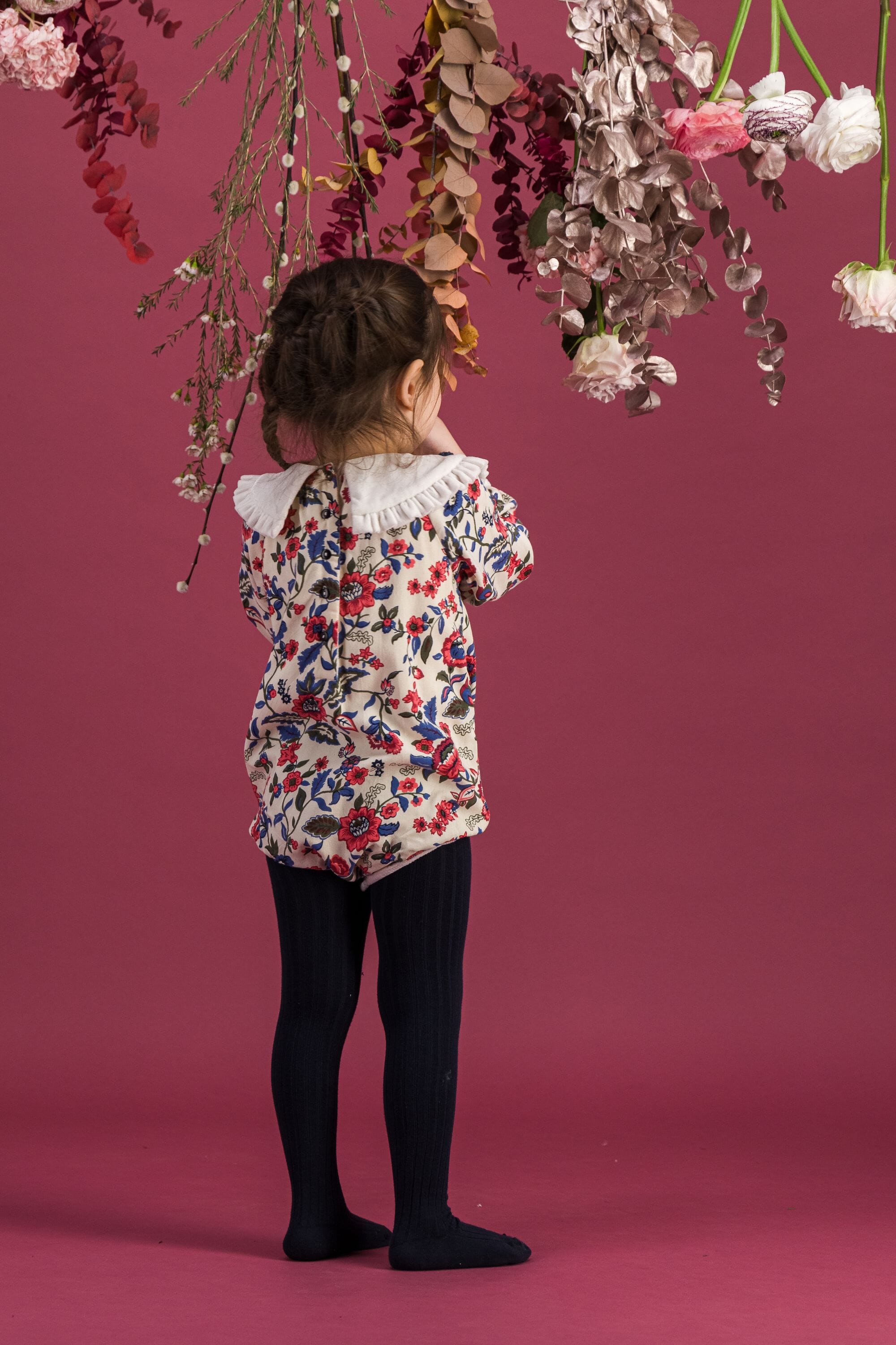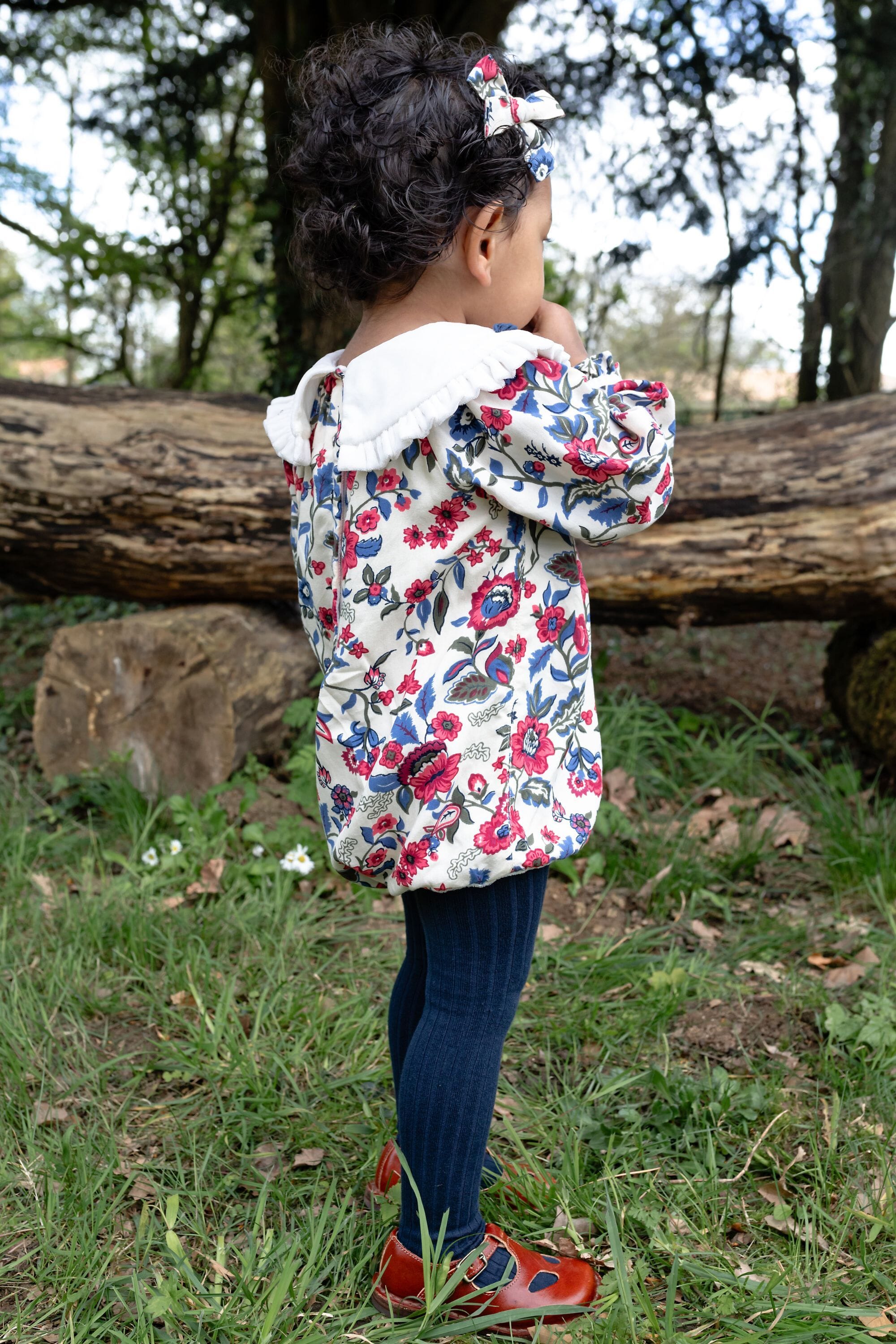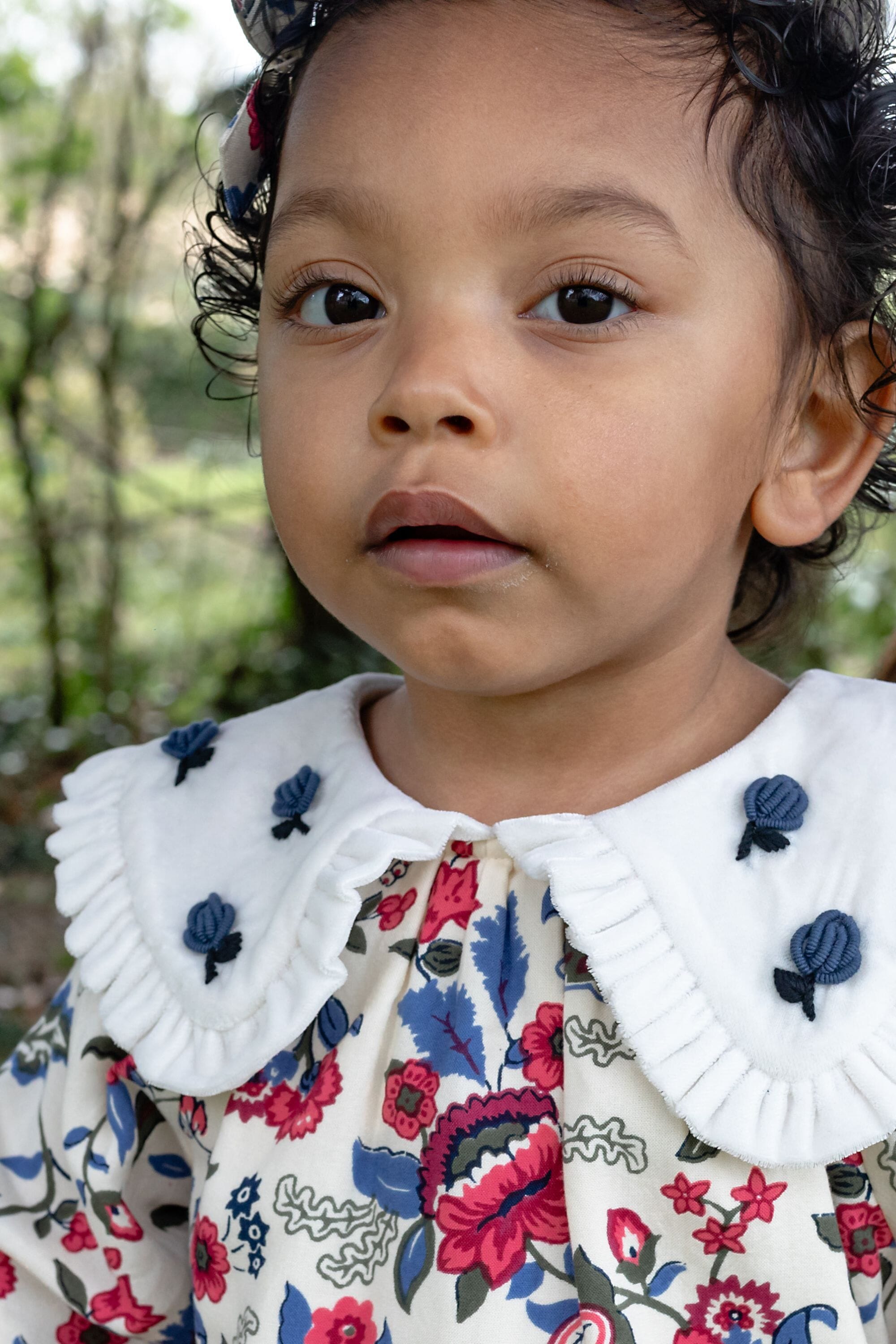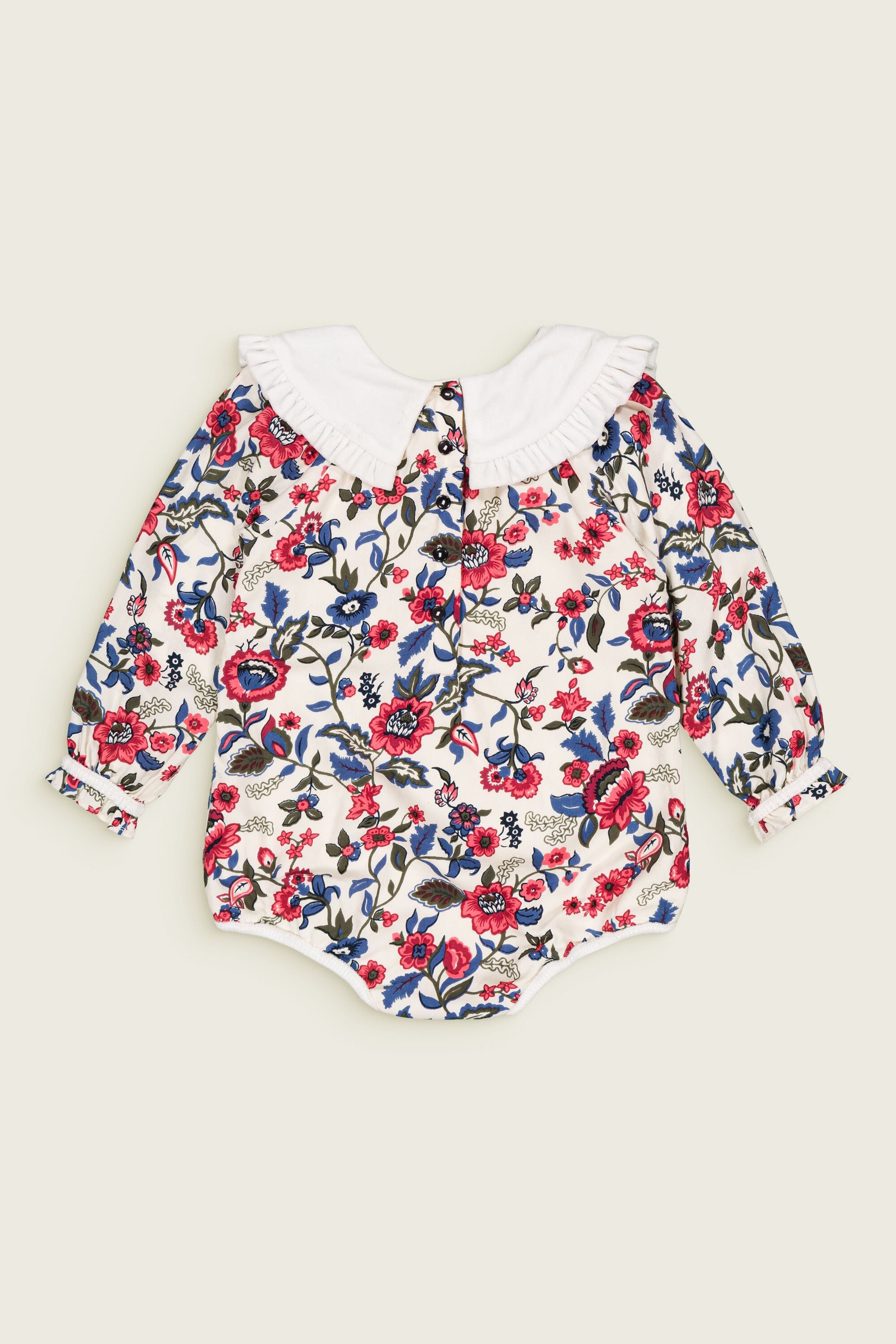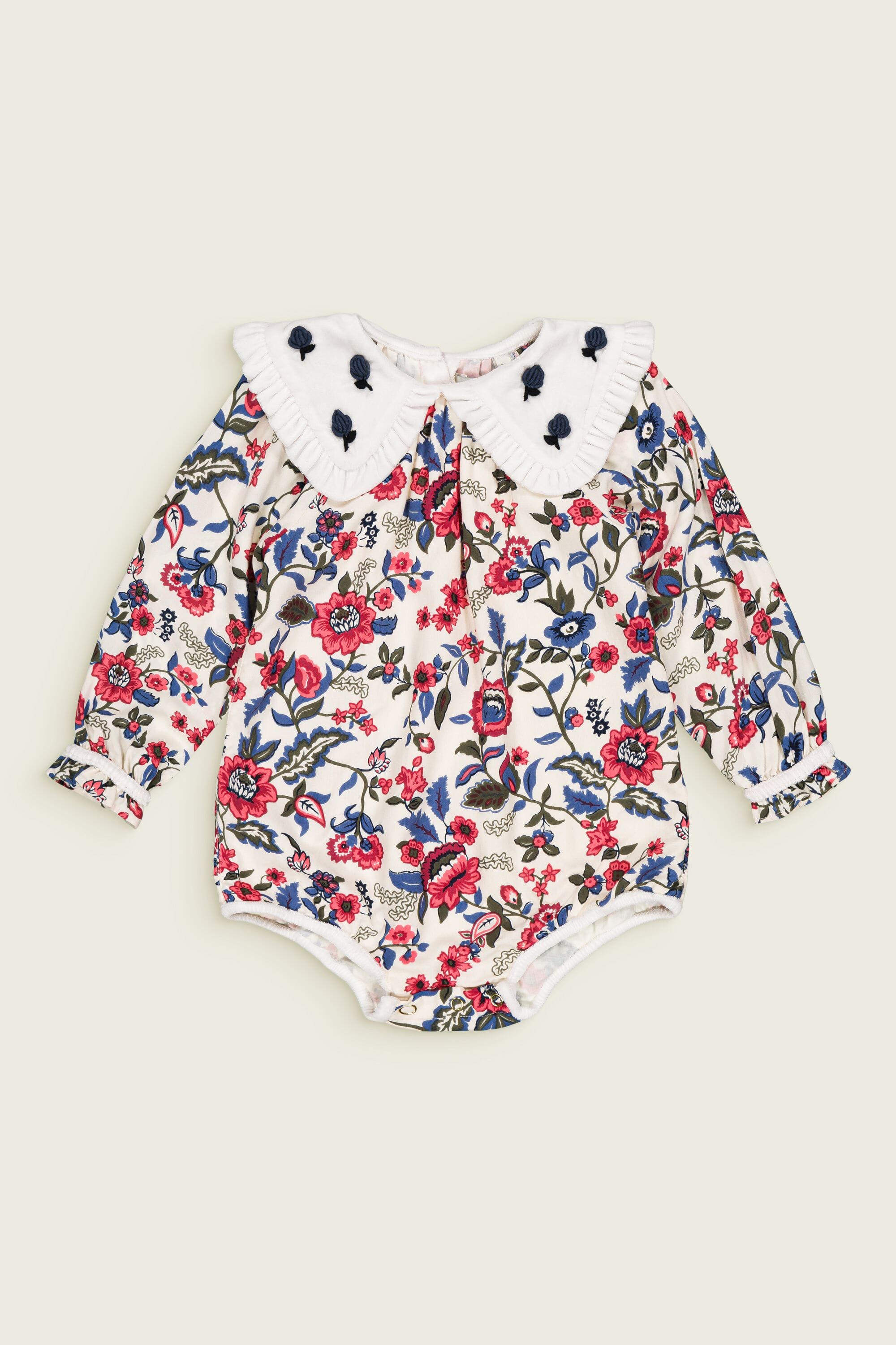 - Romper, 100% ECOVERO® Viscose, Block Print, Plain lining in organic cotton voile, Velvet collar in Snow color with hand embroidery, Long elasticated sleeves, Golden snap buttons at the crotch, Contrasted buttons at the back.