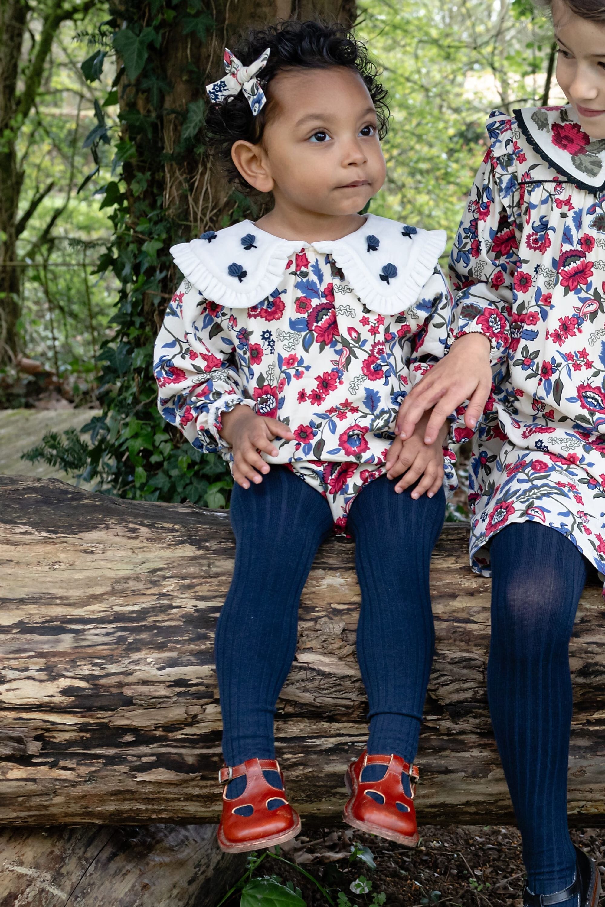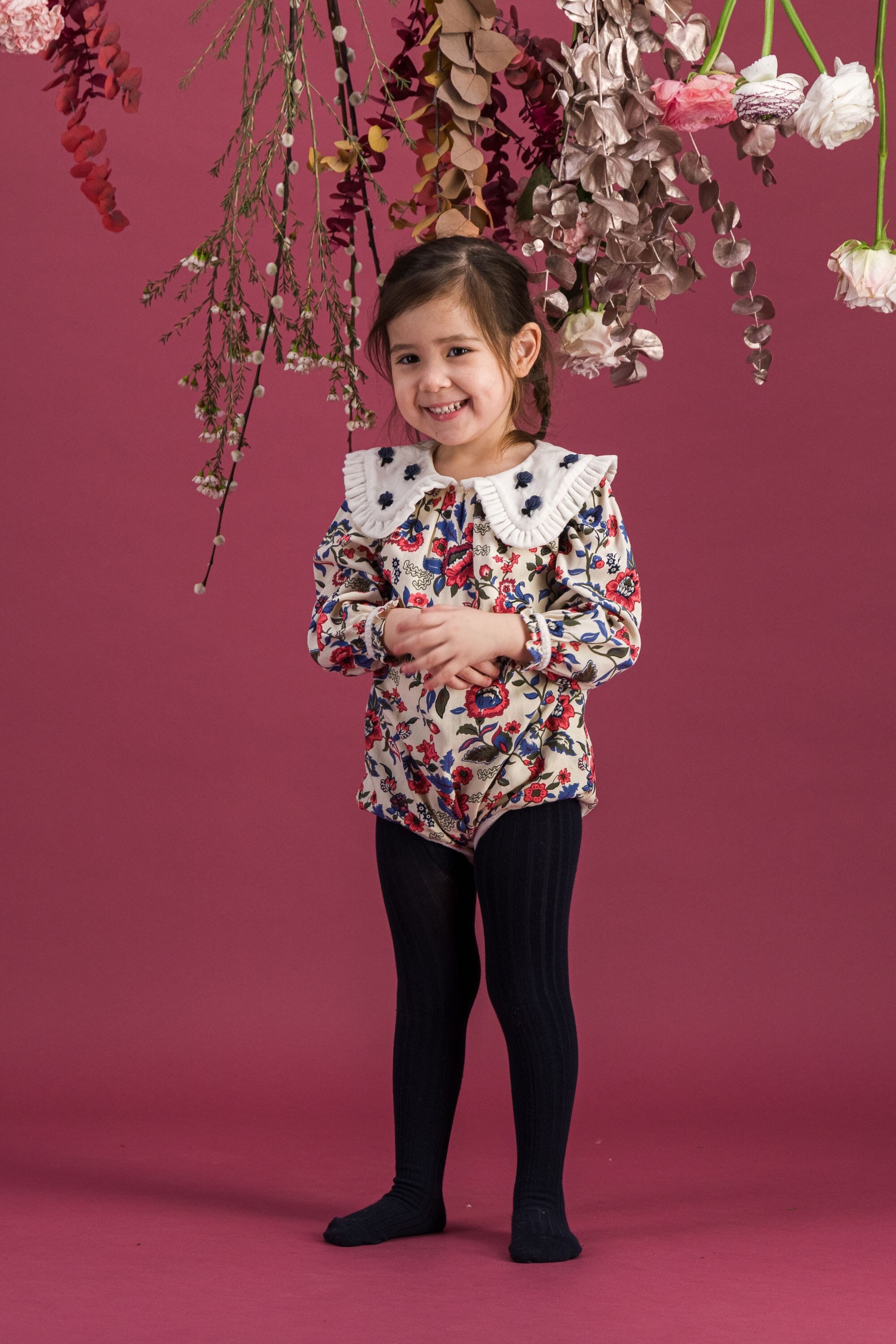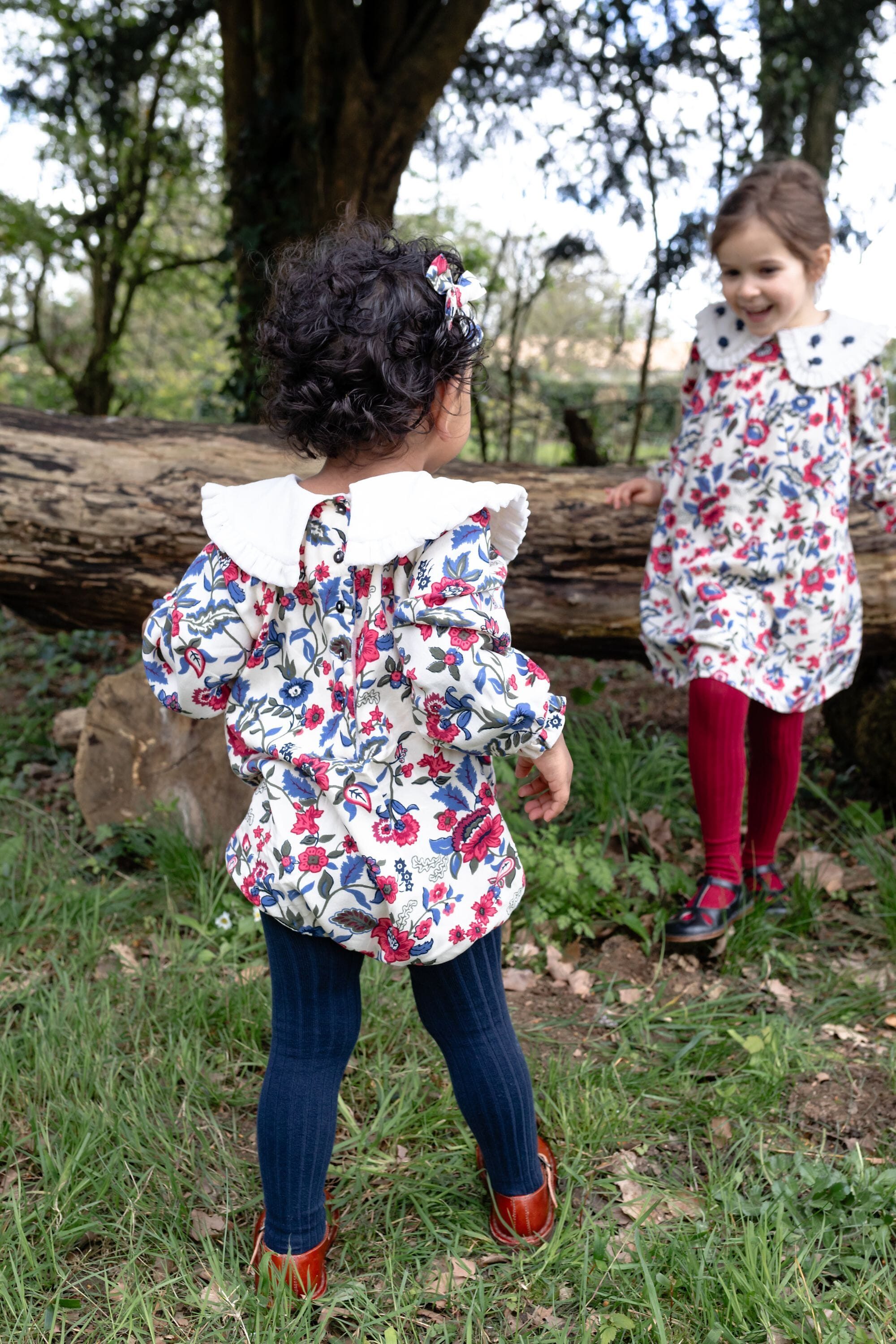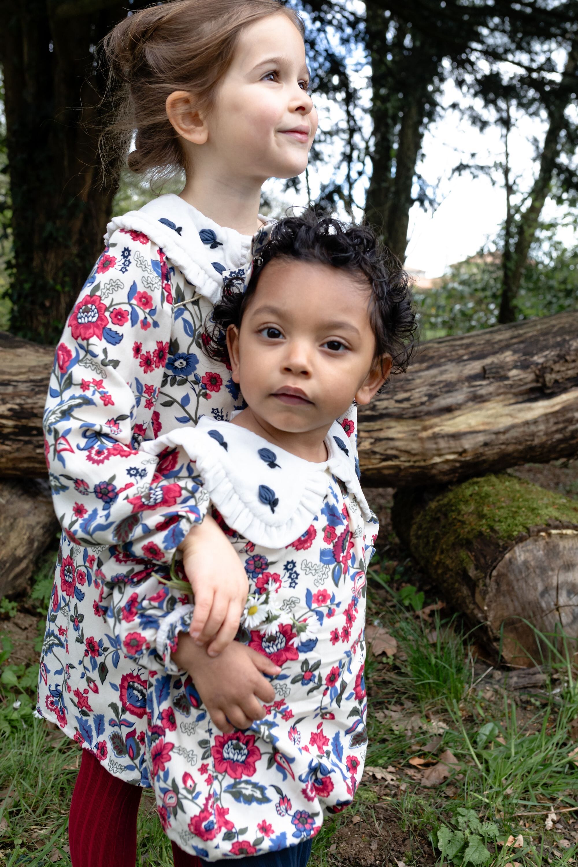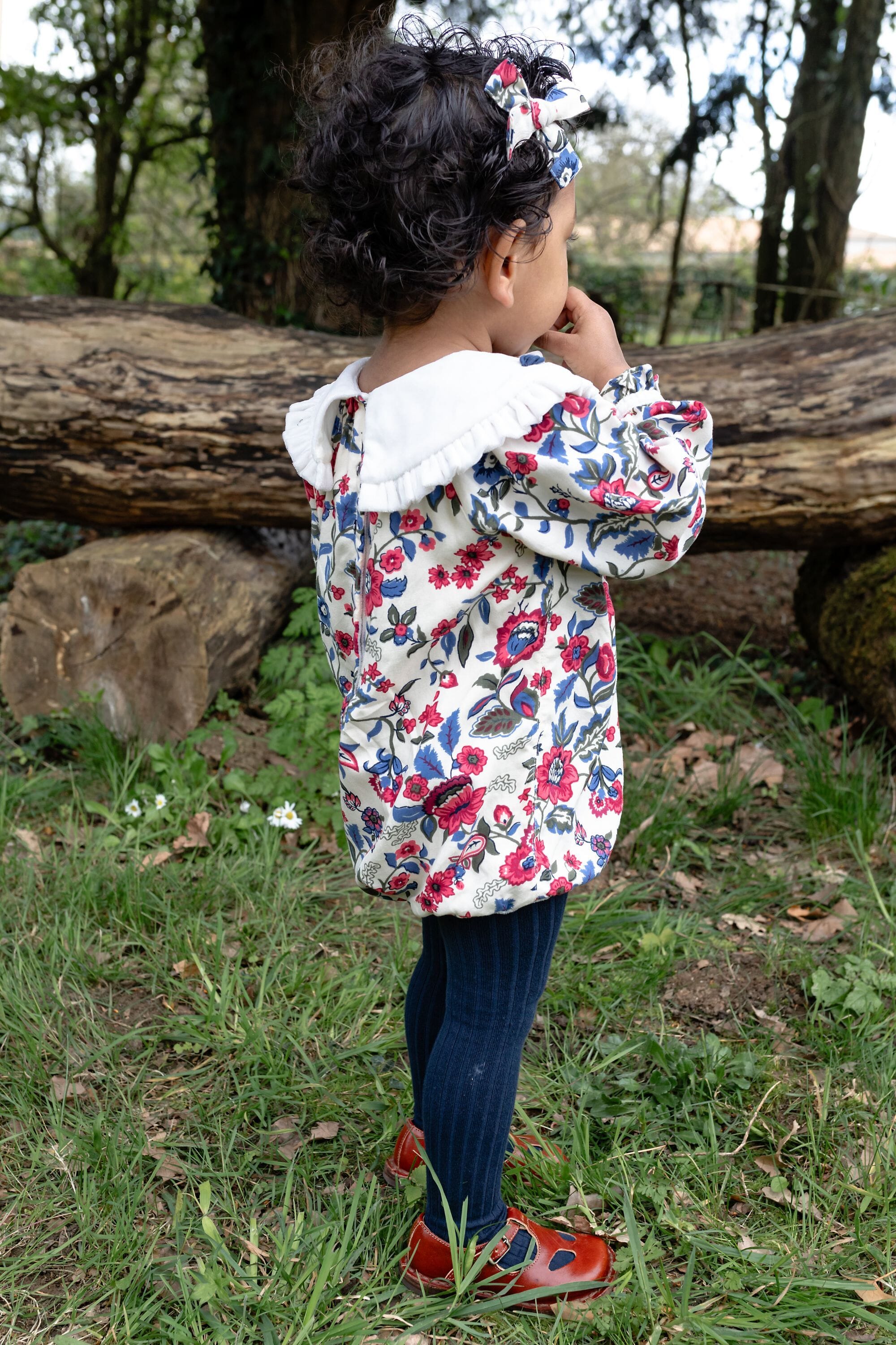 - Romper, 100% ECOVERO® Viscose, Block Print, Plain lining in organic cotton voile, Velvet collar in Snow color with hand embroidery, Long elasticated sleeves, Golden snap buttons at the crotch, Contrasted buttons at the back.