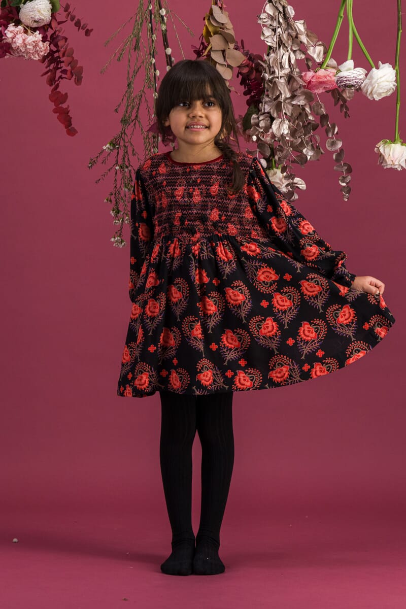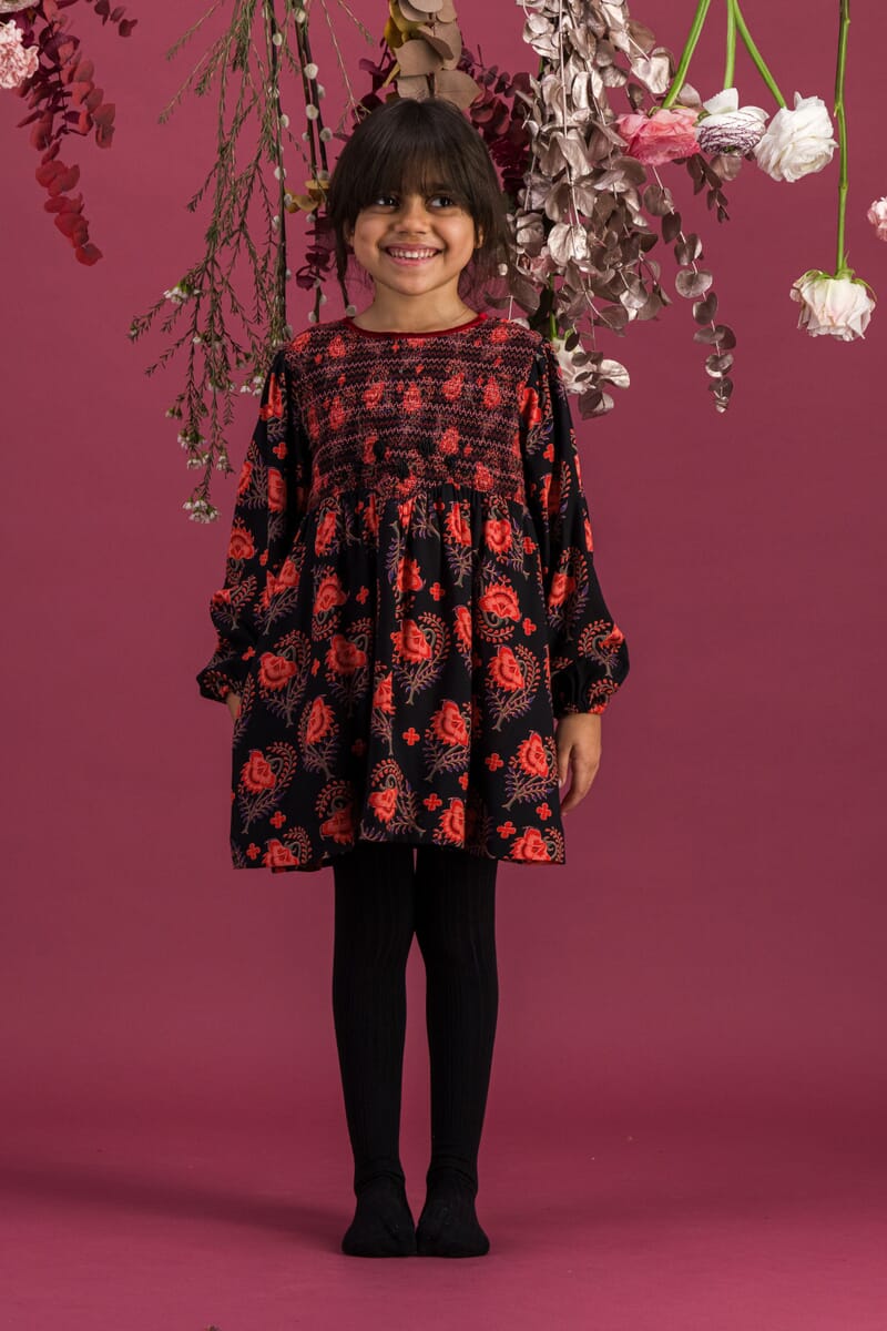 A dress in ECOVERO® Viscose fully smocked on the front with floral hand embroidery.