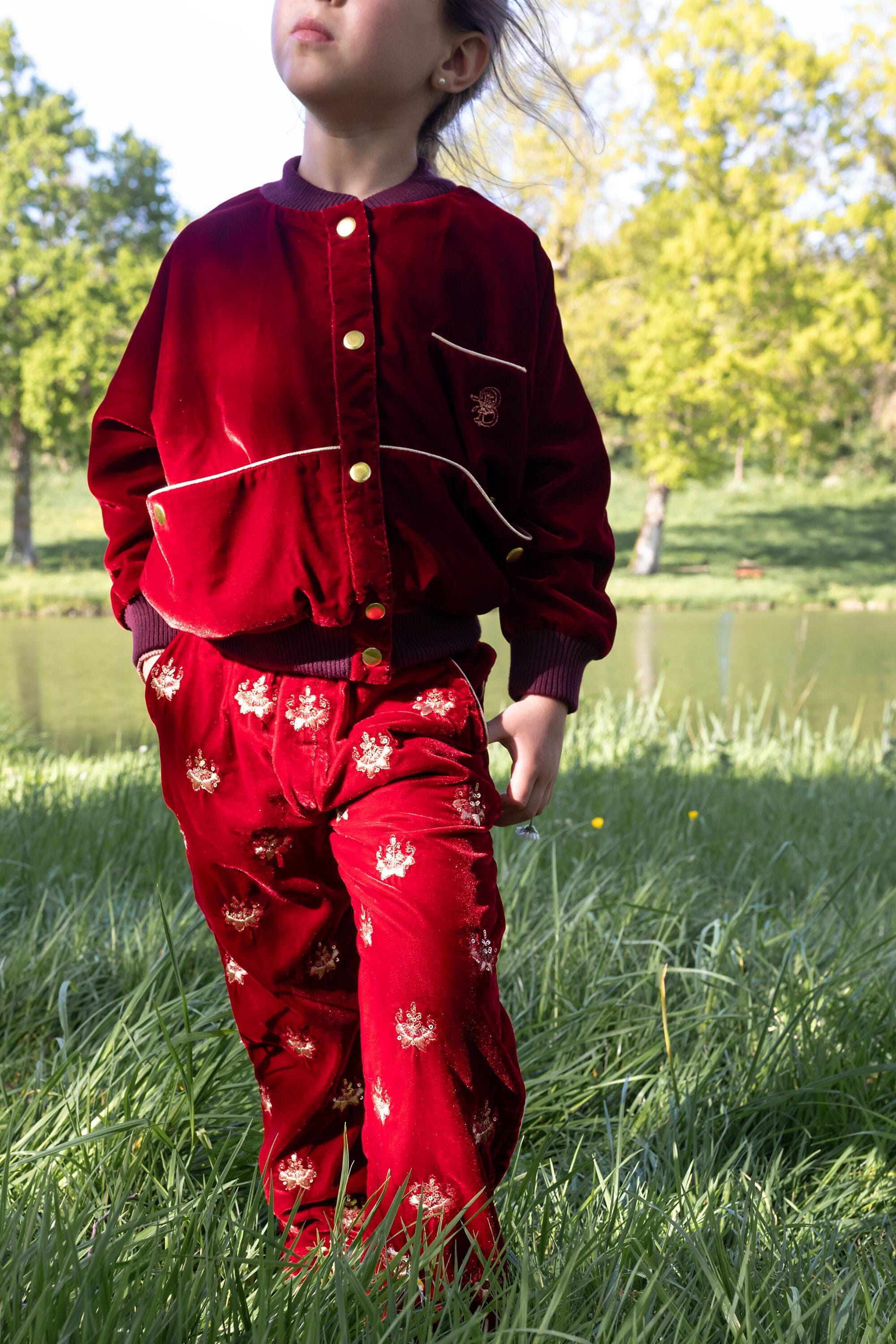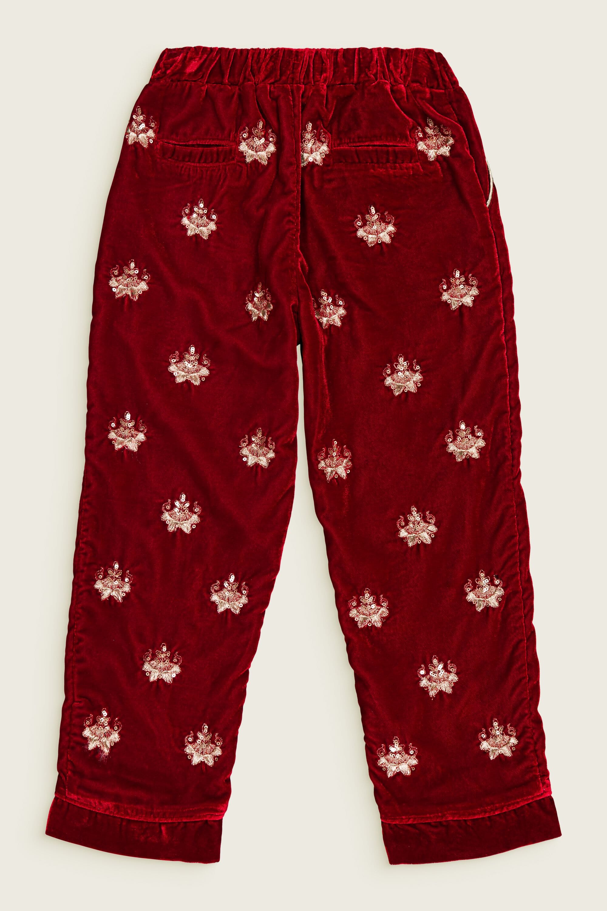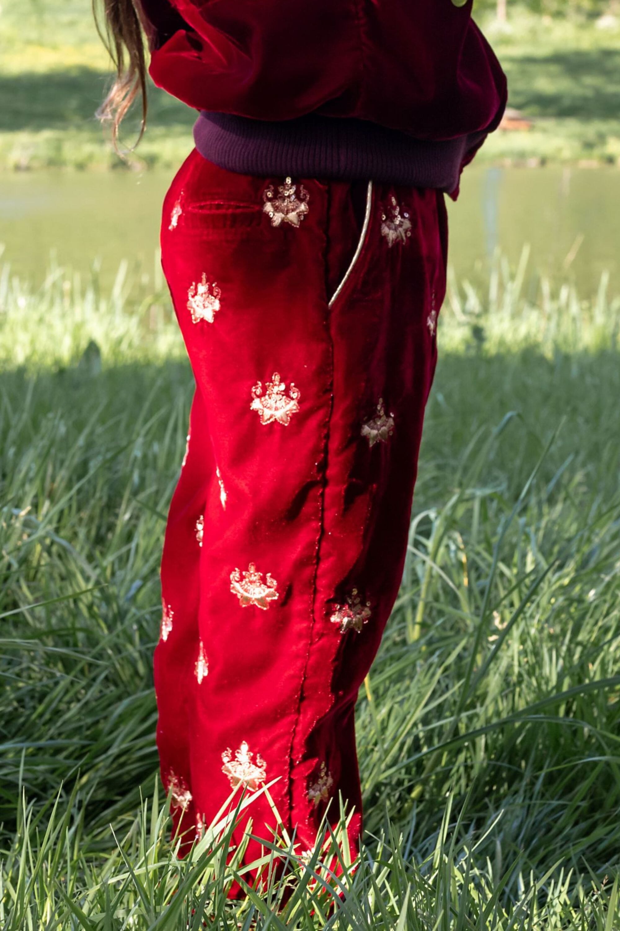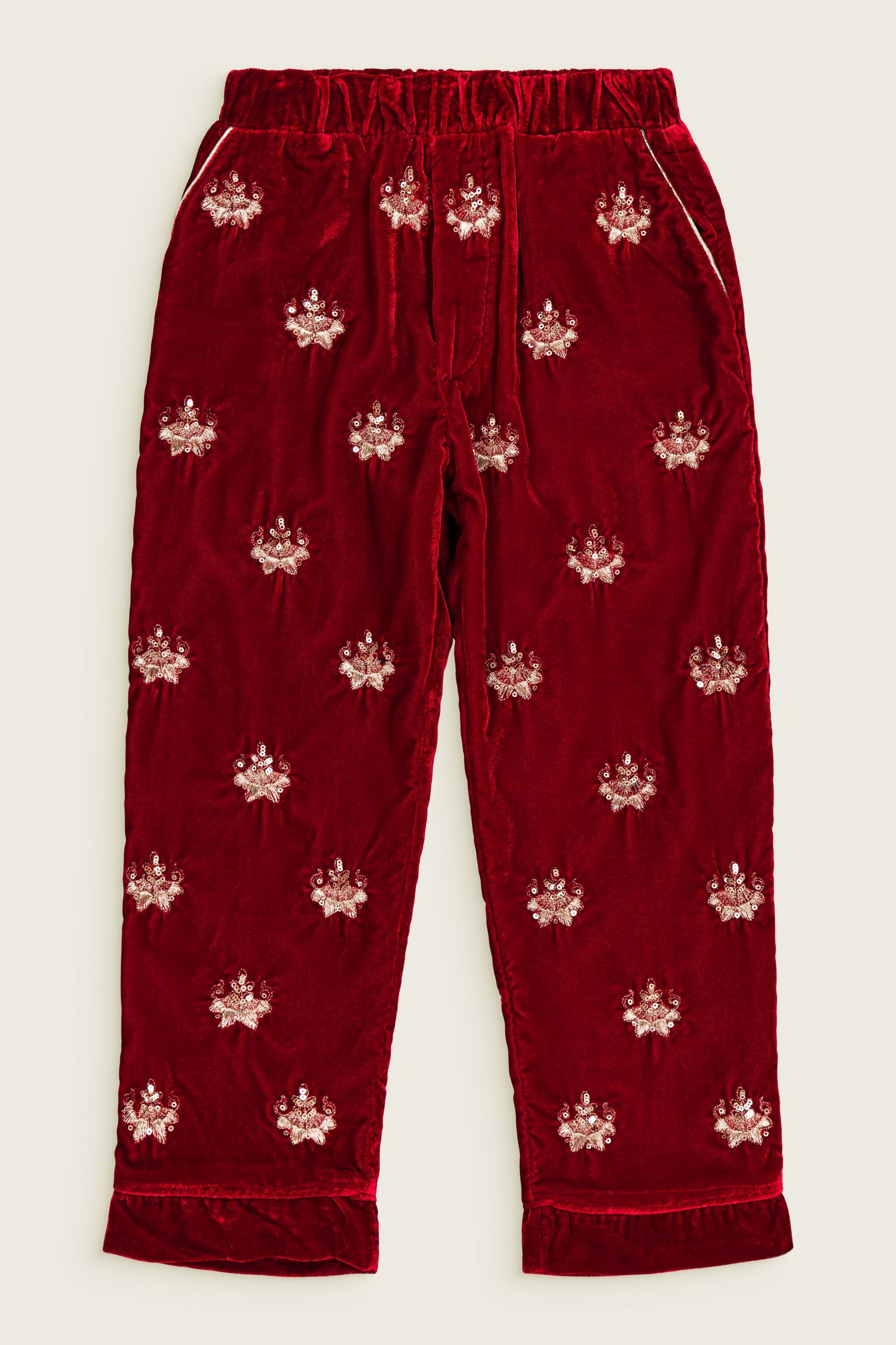 - Pant, Velvet, Rubis color, Plain lining in organic cotton voile, Fully hand embroidered, Golden piping on the pockets, Front pockets, Back pockets, Elasticated at the waist, Elasticated bottom legs.