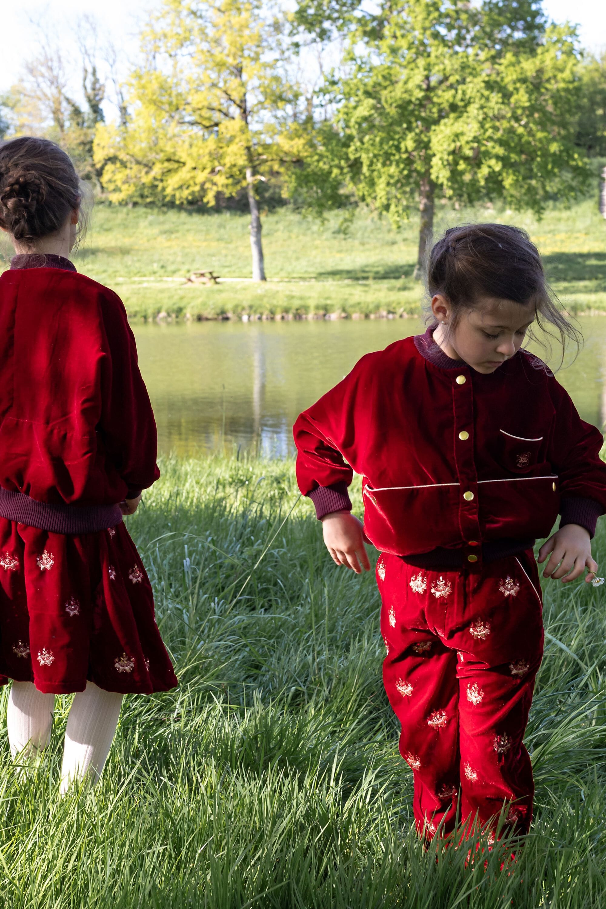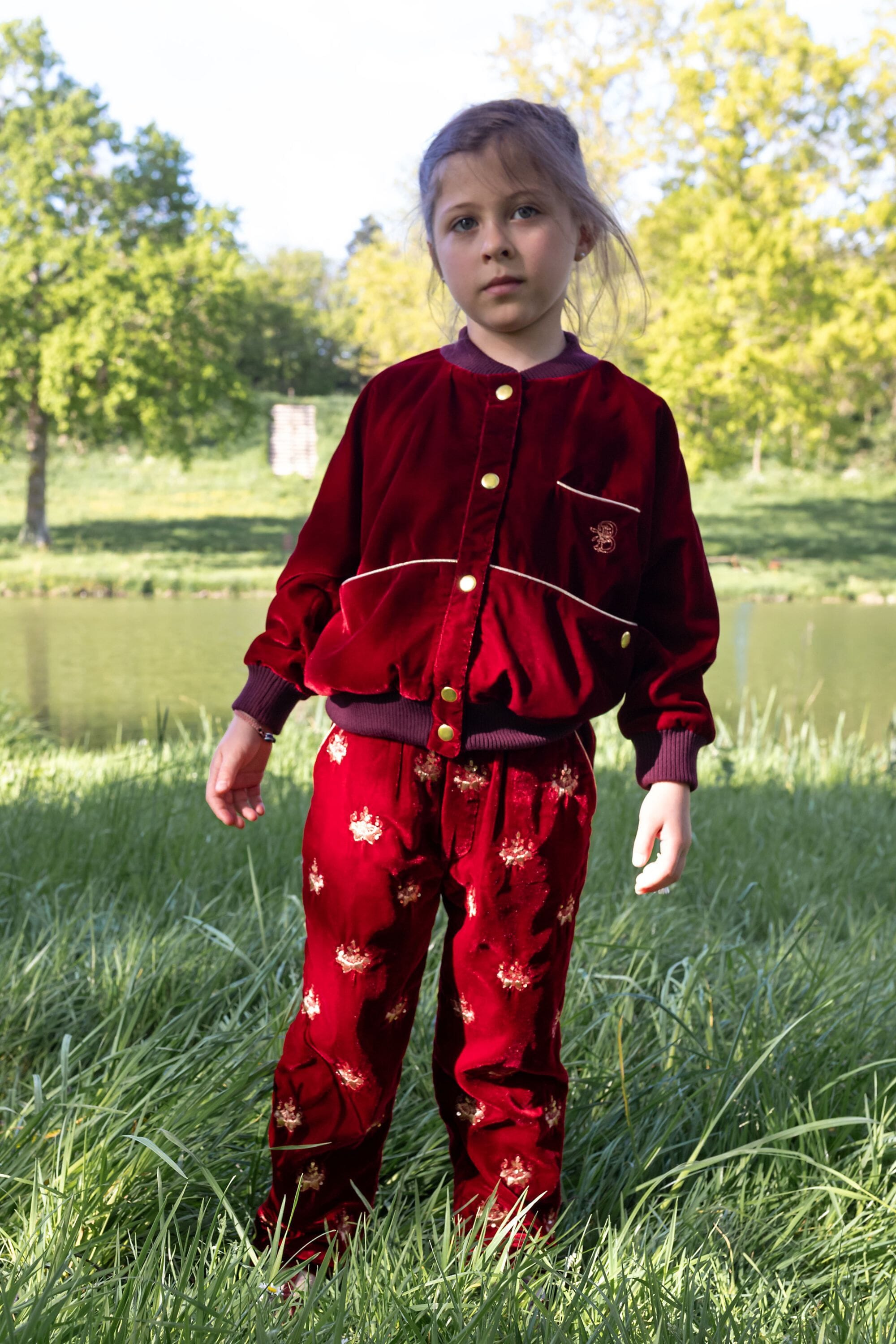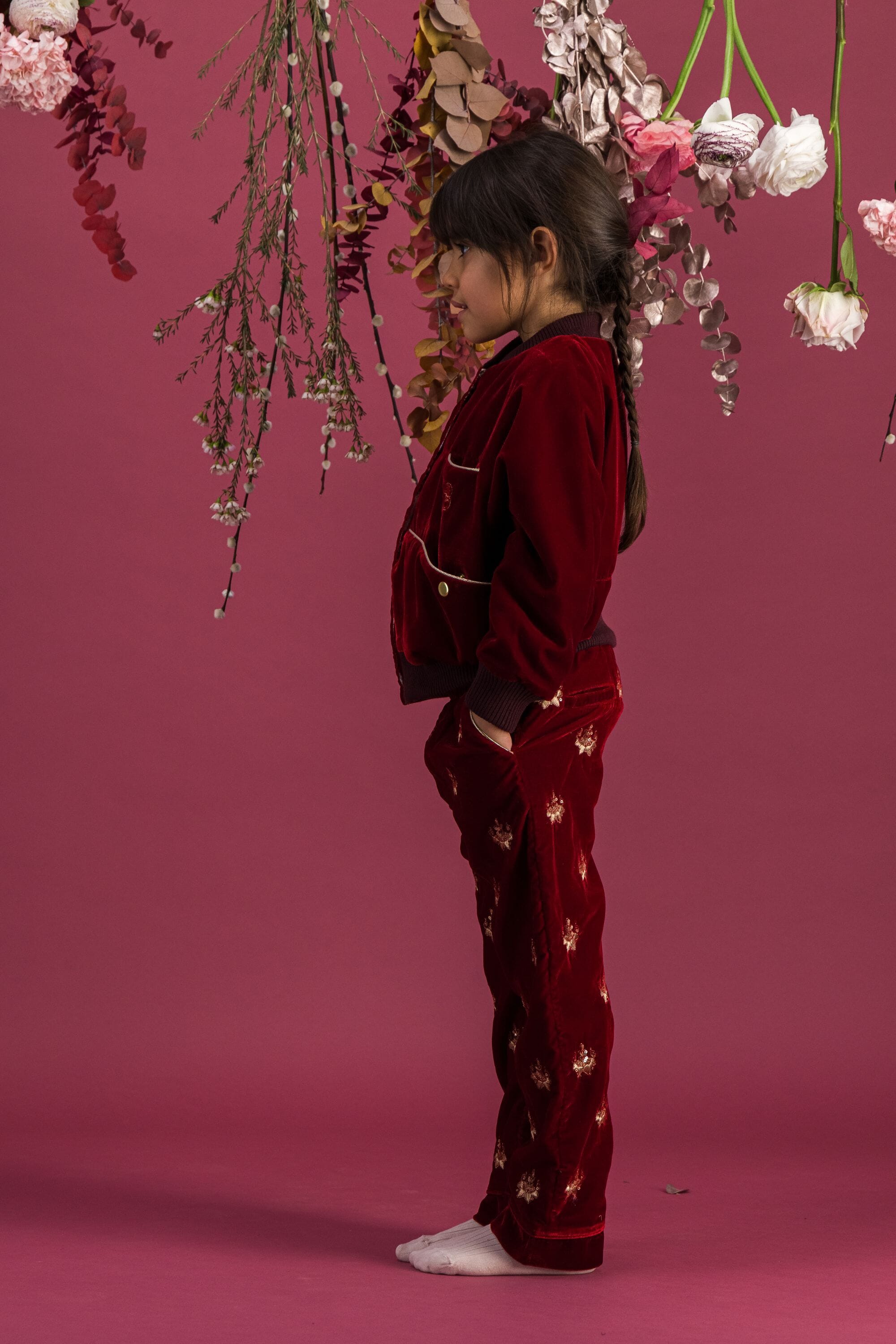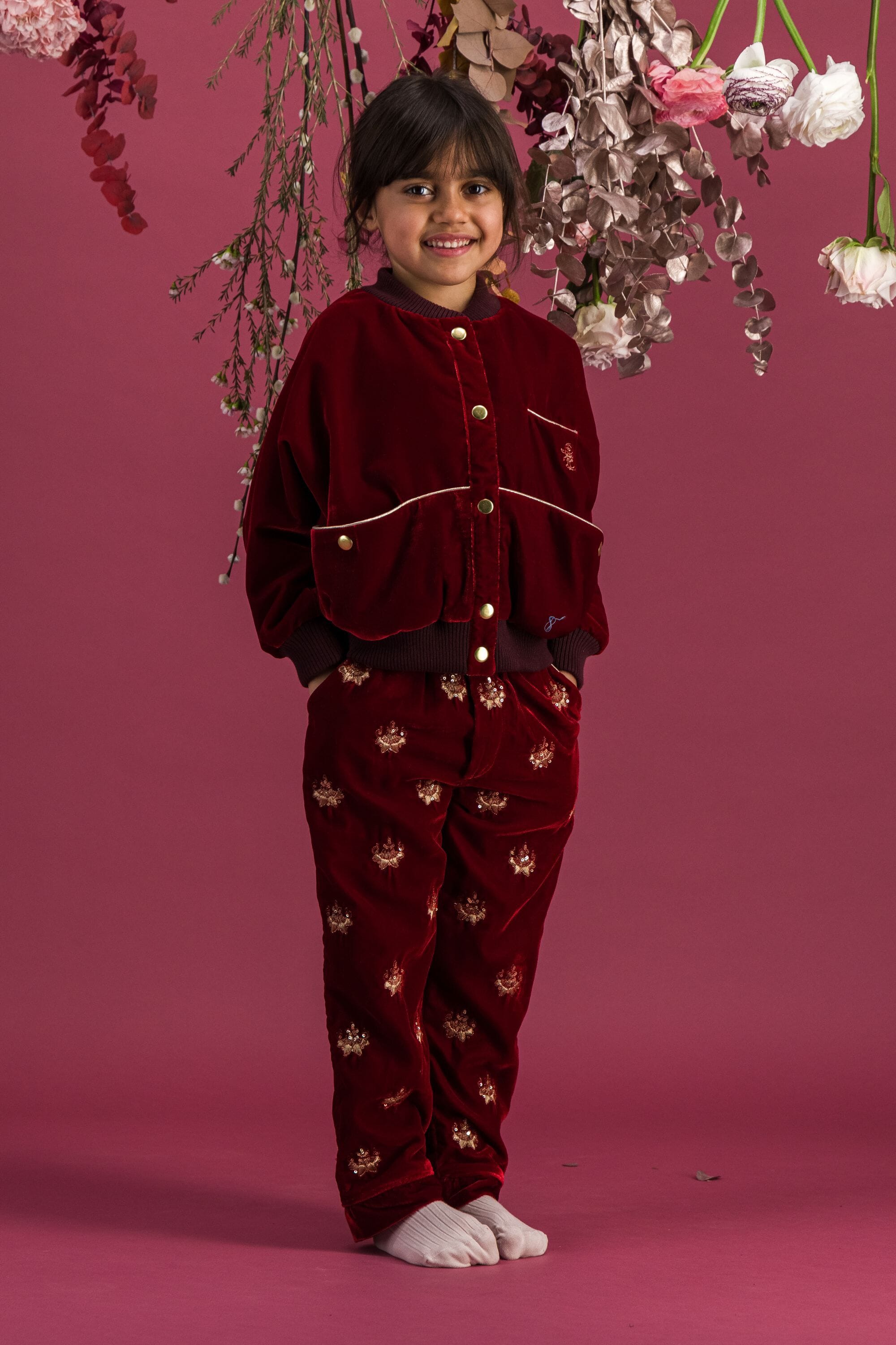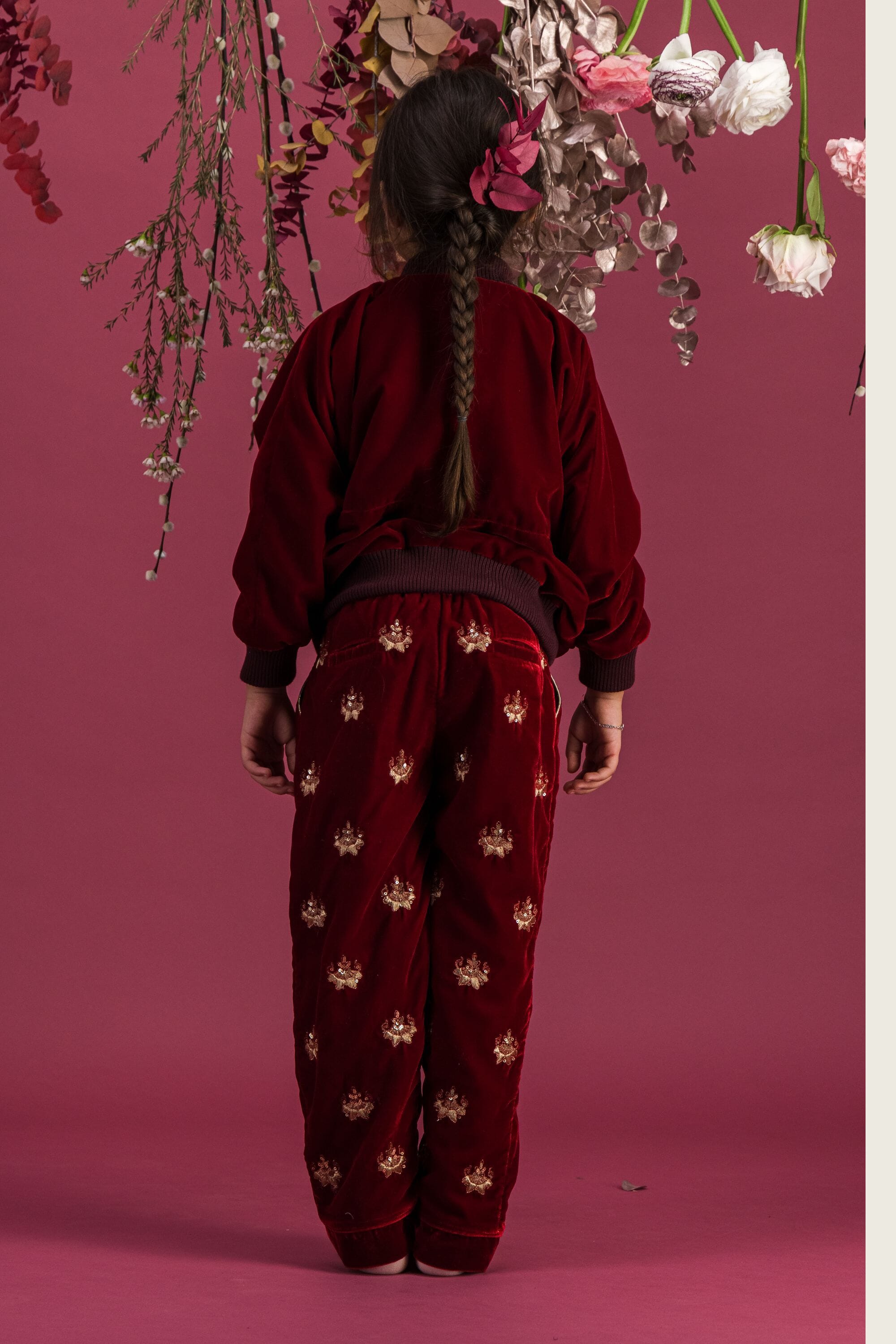 - Pant, Velvet, Rubis color, Plain lining in organic cotton voile, Fully hand embroidered, Golden piping on the pockets, Front pockets, Back pockets, Elasticated at the waist, Elasticated bottom legs.
