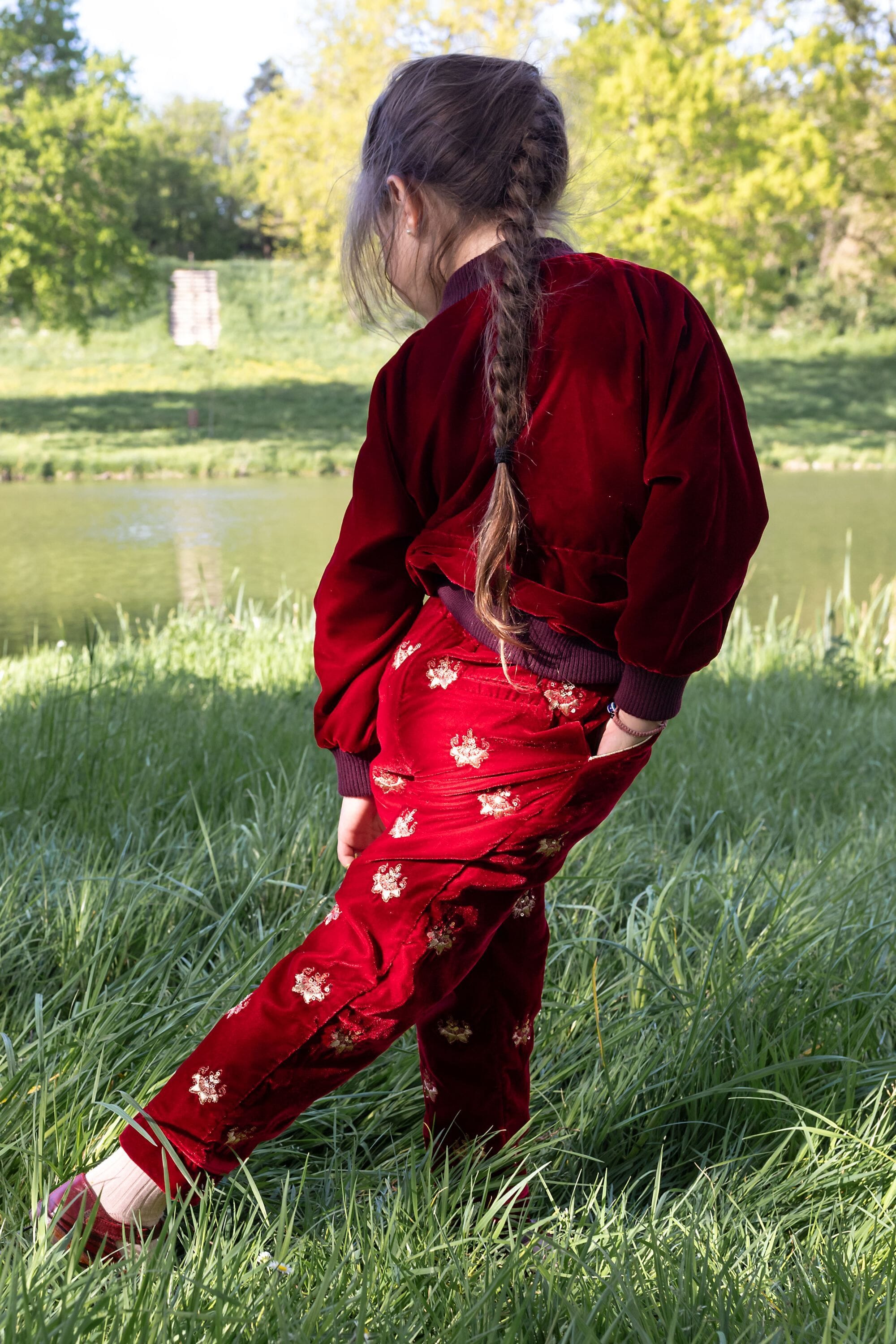 A Rubis colored velvet pants entirely hand embroidered with gold metal thread. The pockets are decorated with gold piping.