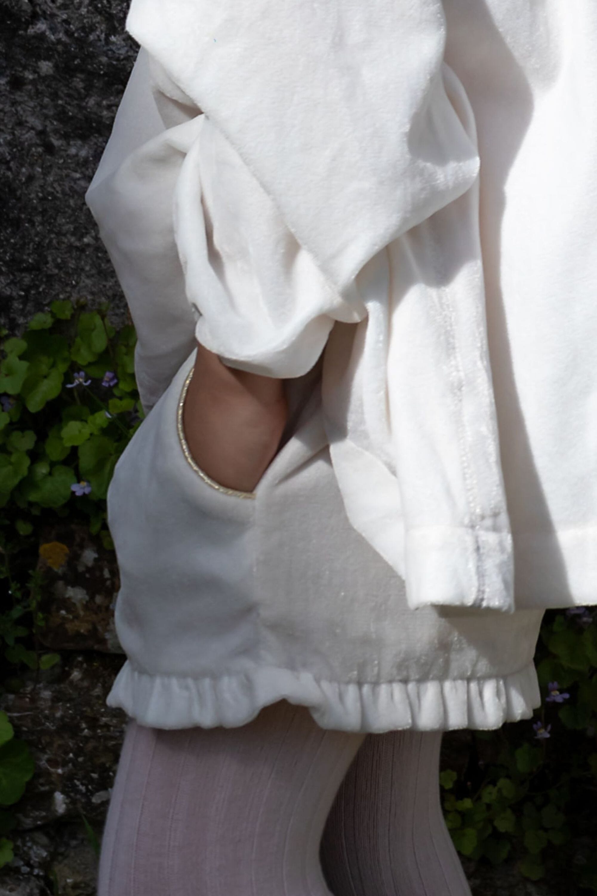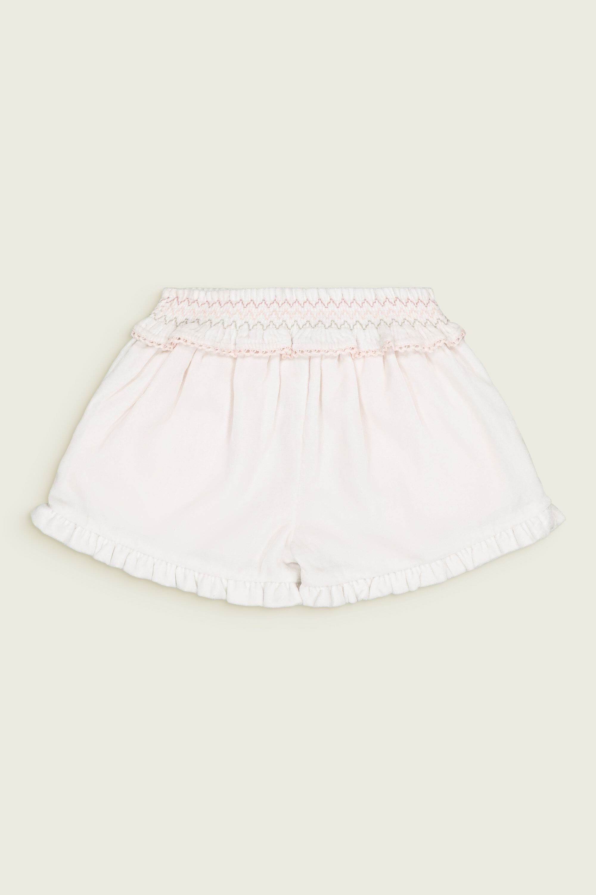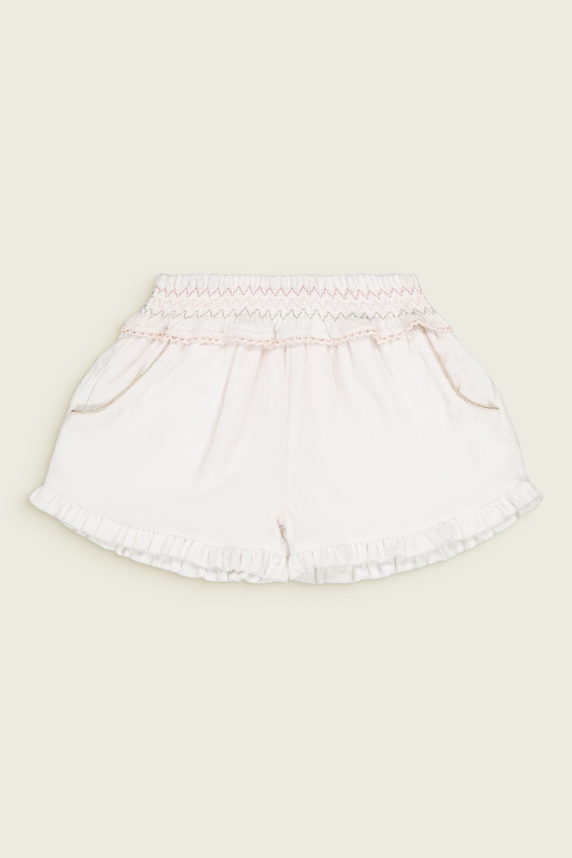 Shorts, Snow colored velvet, Plain lining in organic cotton voile, Multicolor embroidered smocks at the waist with lace finishing, Ruffles on the leg opening, Side pockets with golden piping.