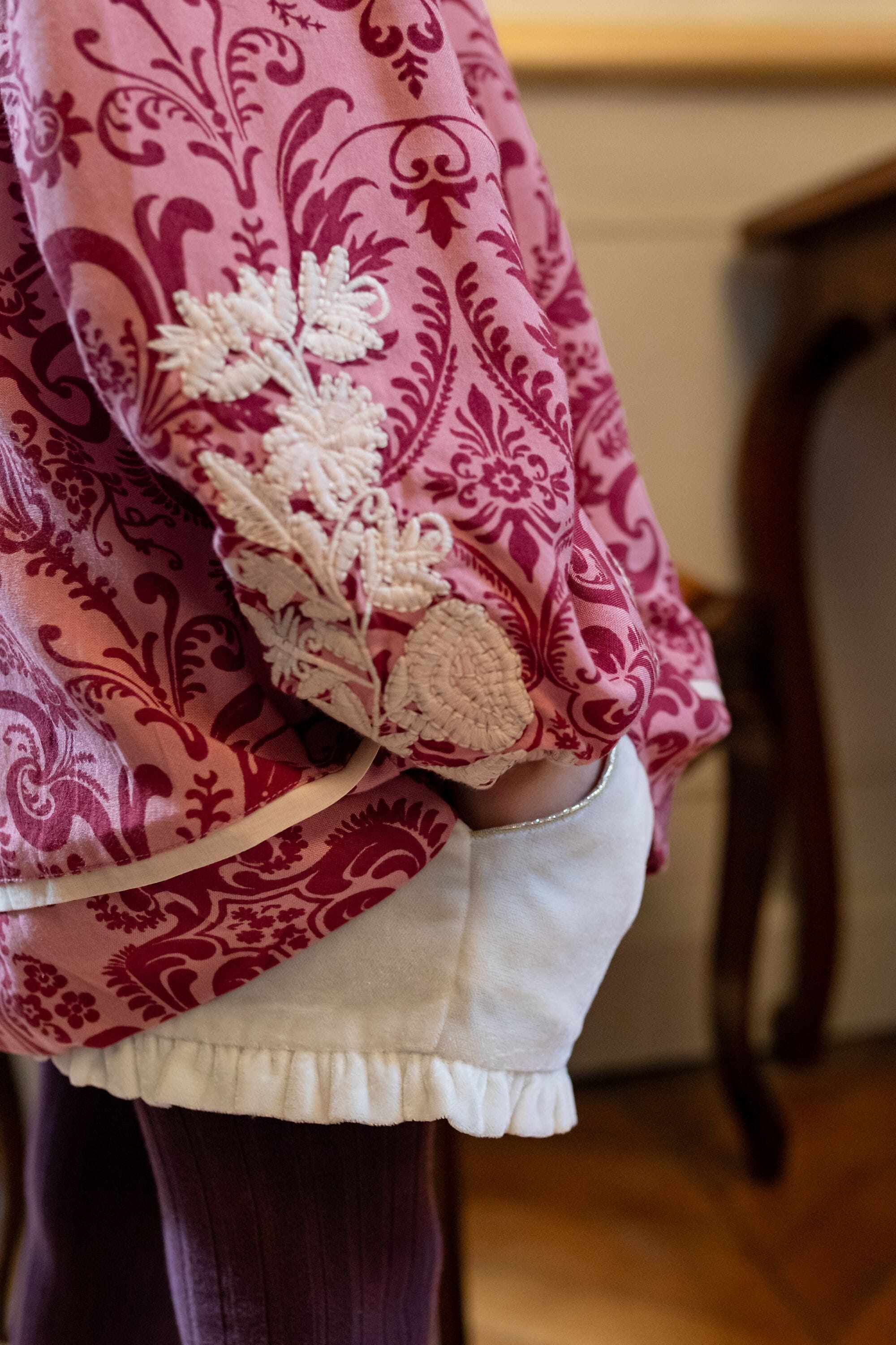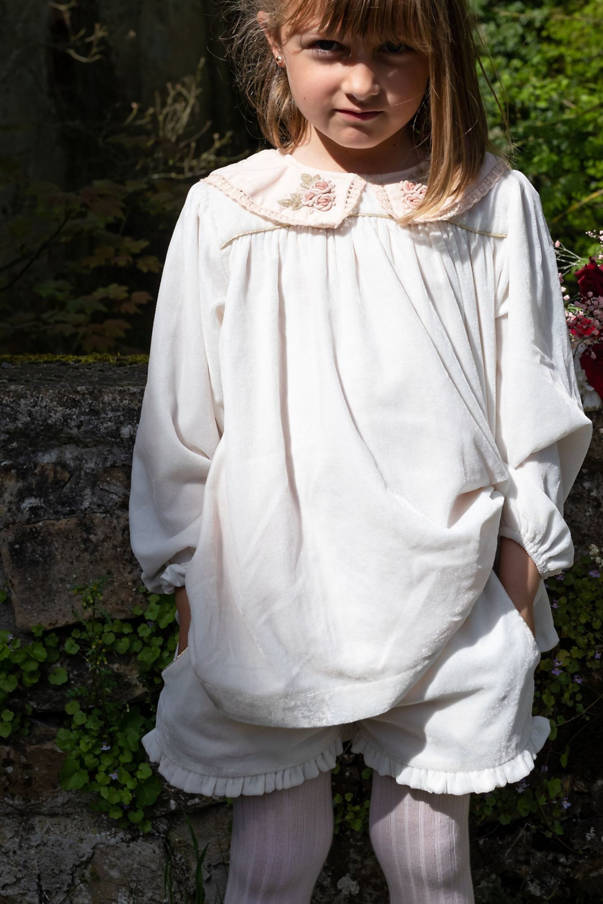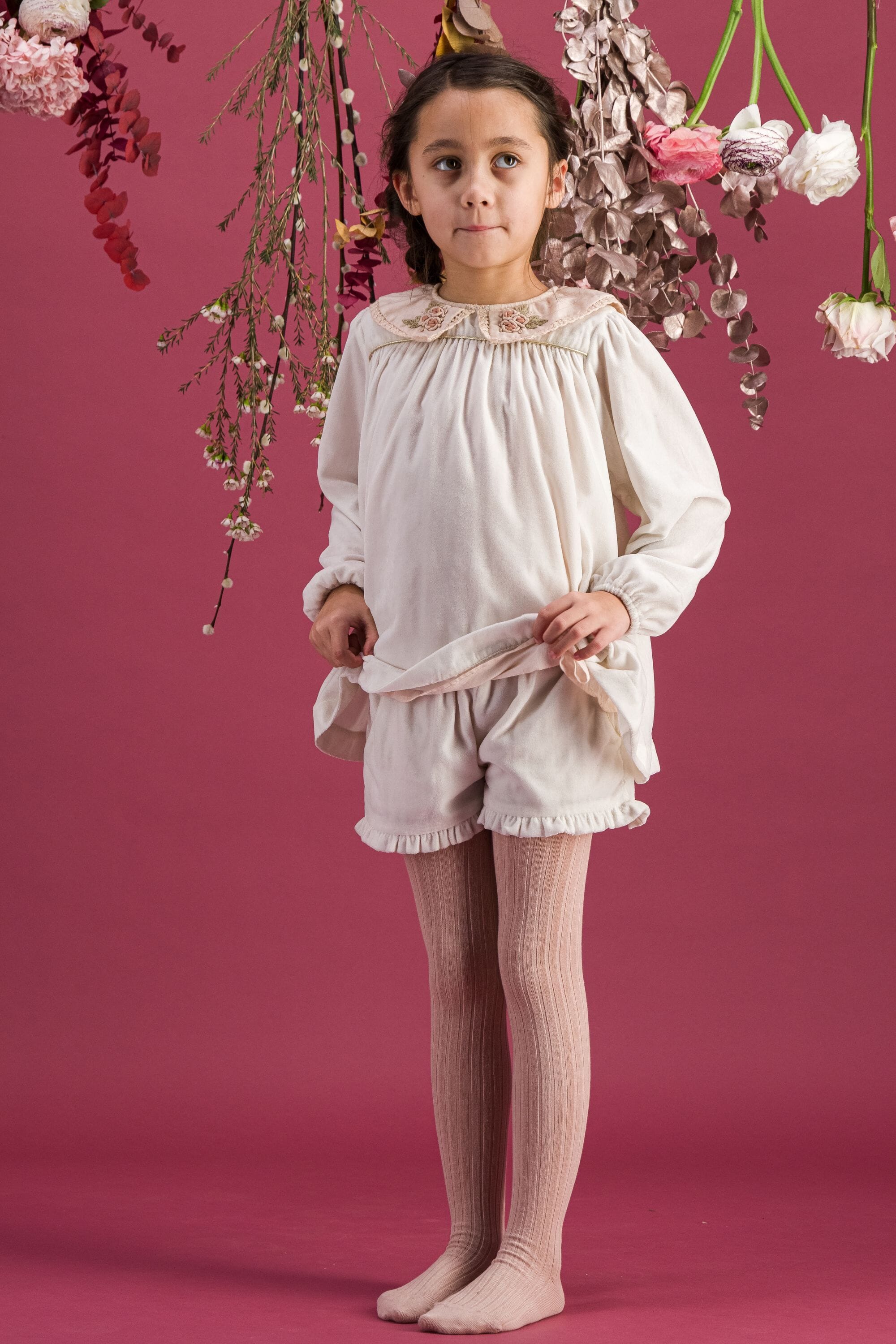 Shorts, Snow colored velvet, Plain lining in organic cotton voile, Multicolor embroidered smocks at the waist with lace finishing, Ruffles on the leg opening, Side pockets with golden piping.