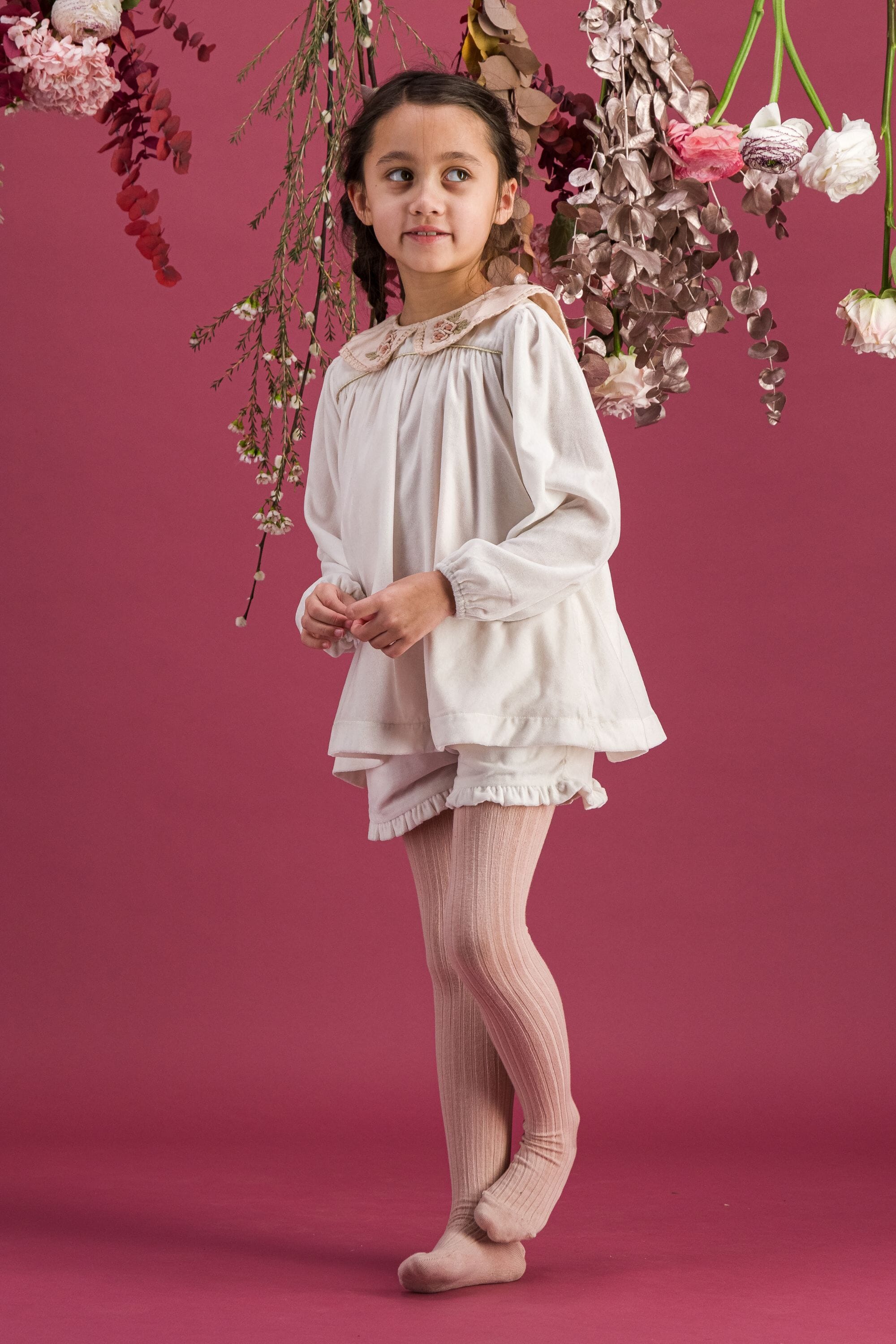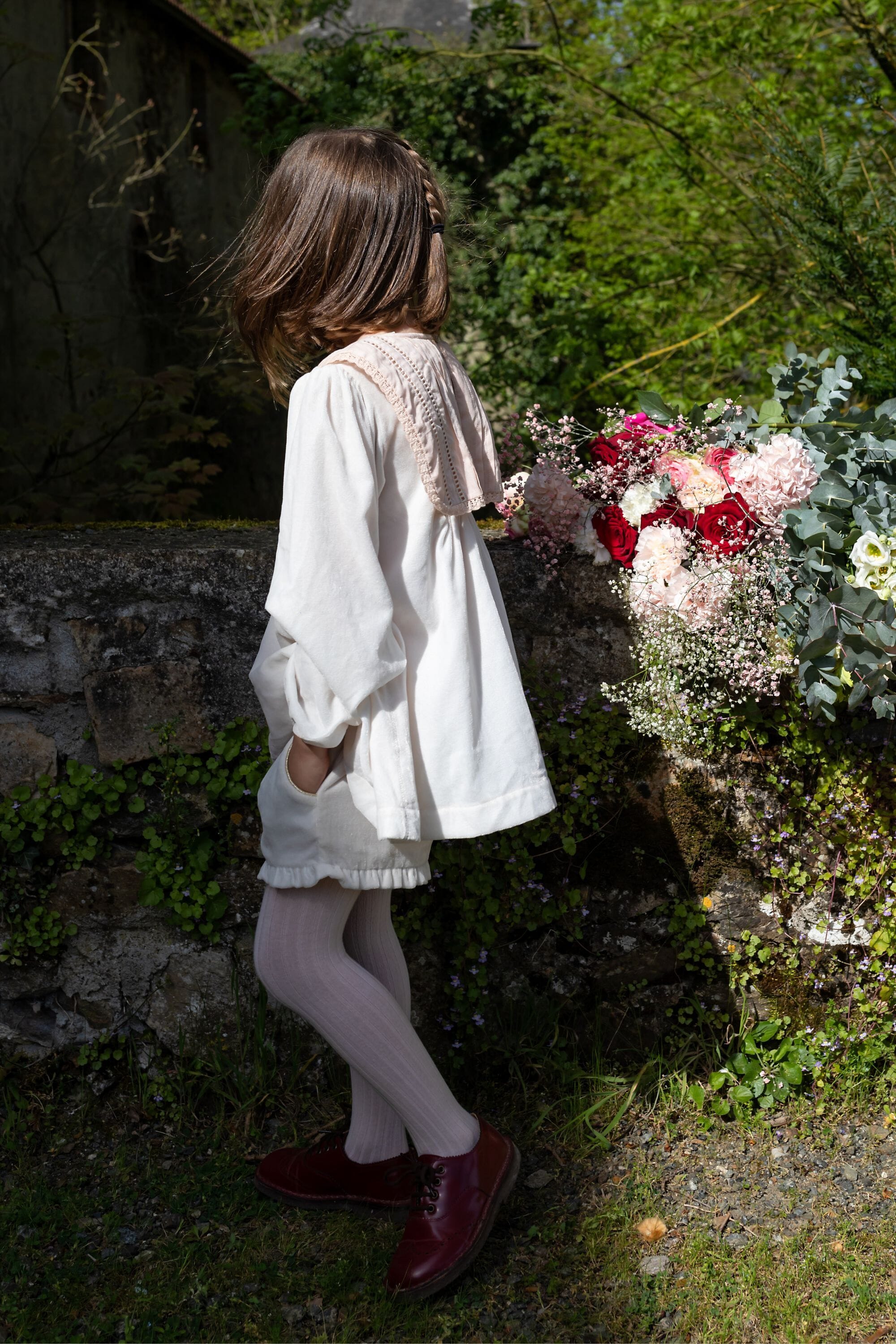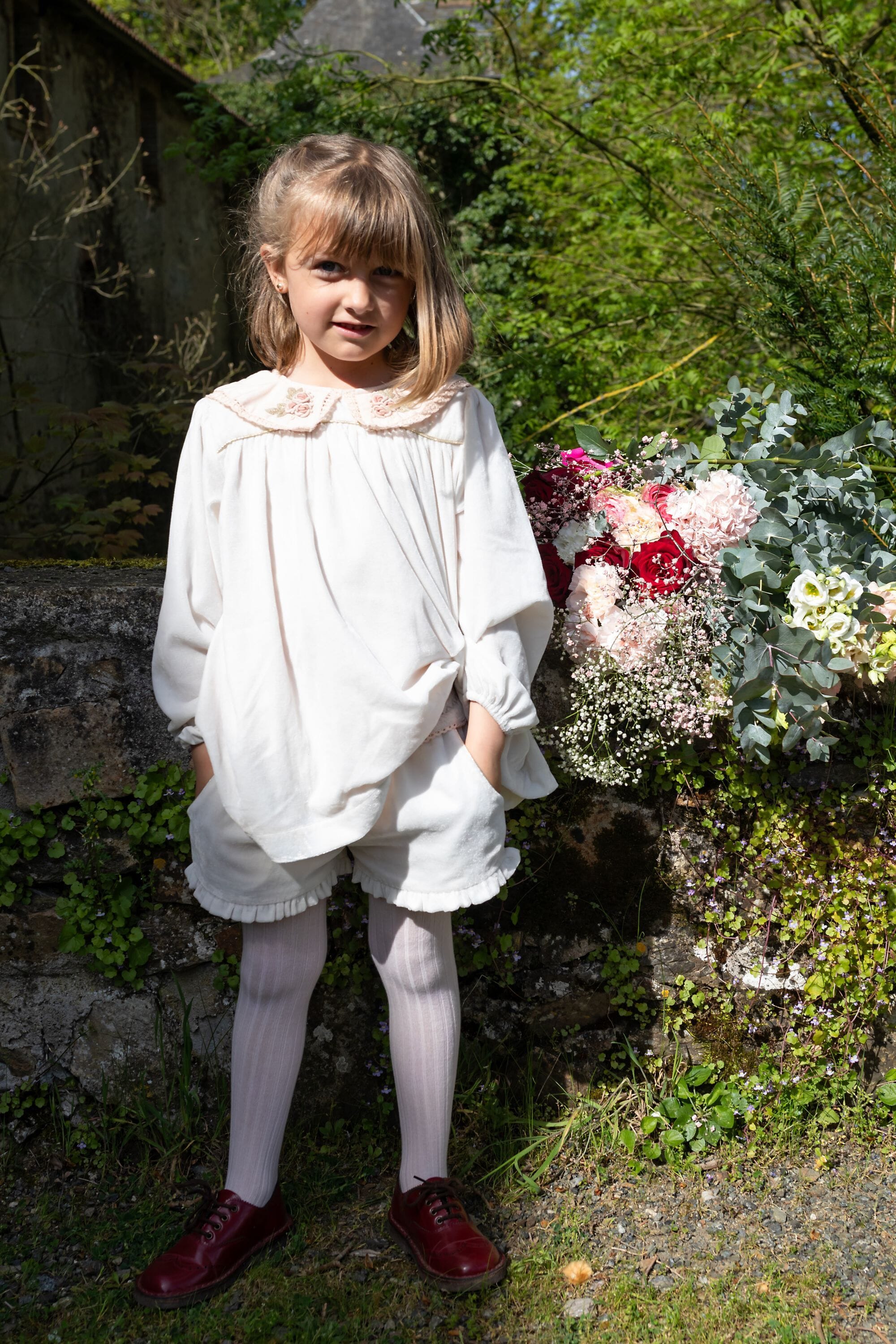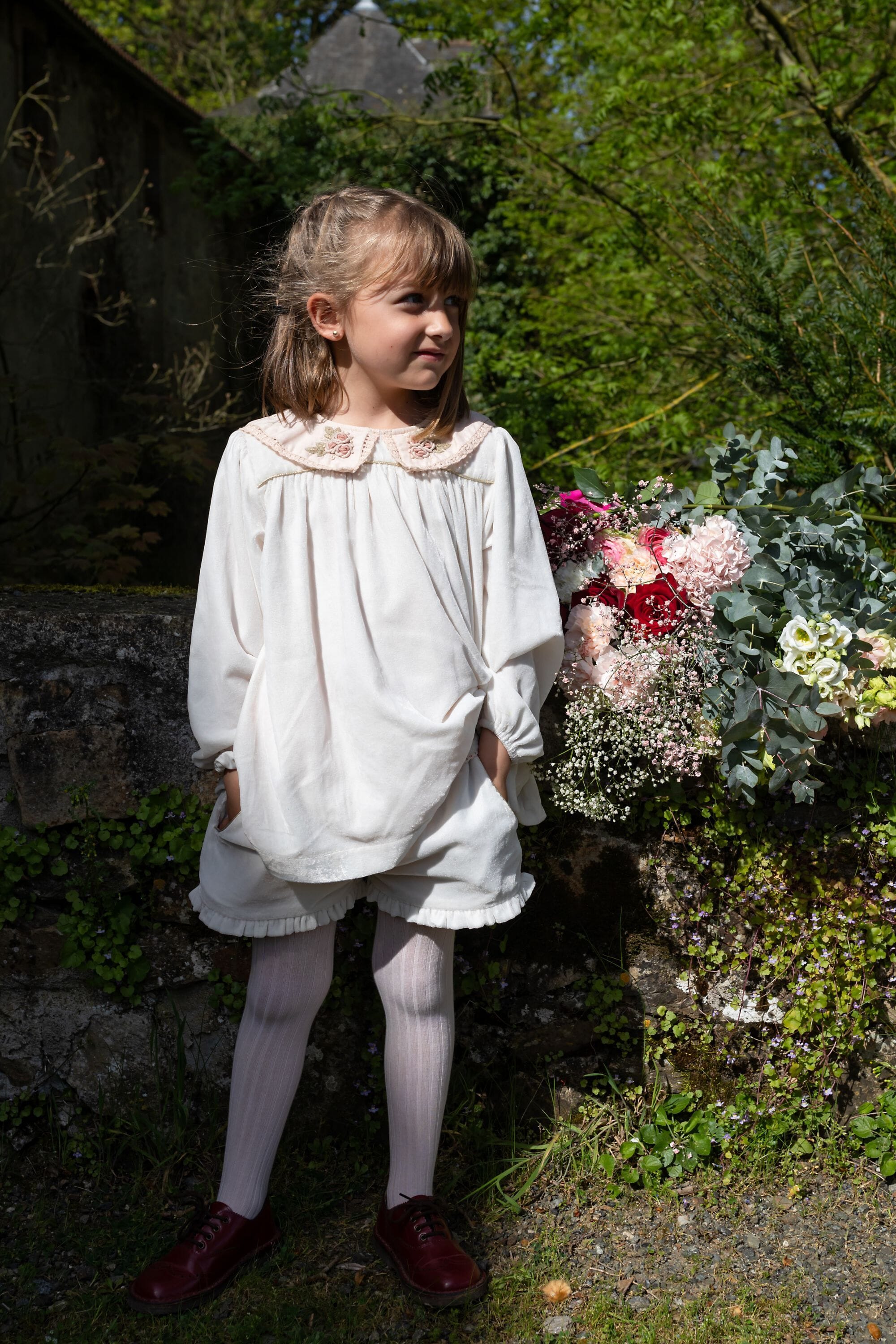 - Blouse, Snow colored velvet, Plain lining in organic cotton voile, Hand embroidery, pintucks and ladder lace on the collar, Golden pipping on the front, Long elasticated sleeves, Gathers on the front and back, One buttoned drop at the back.
