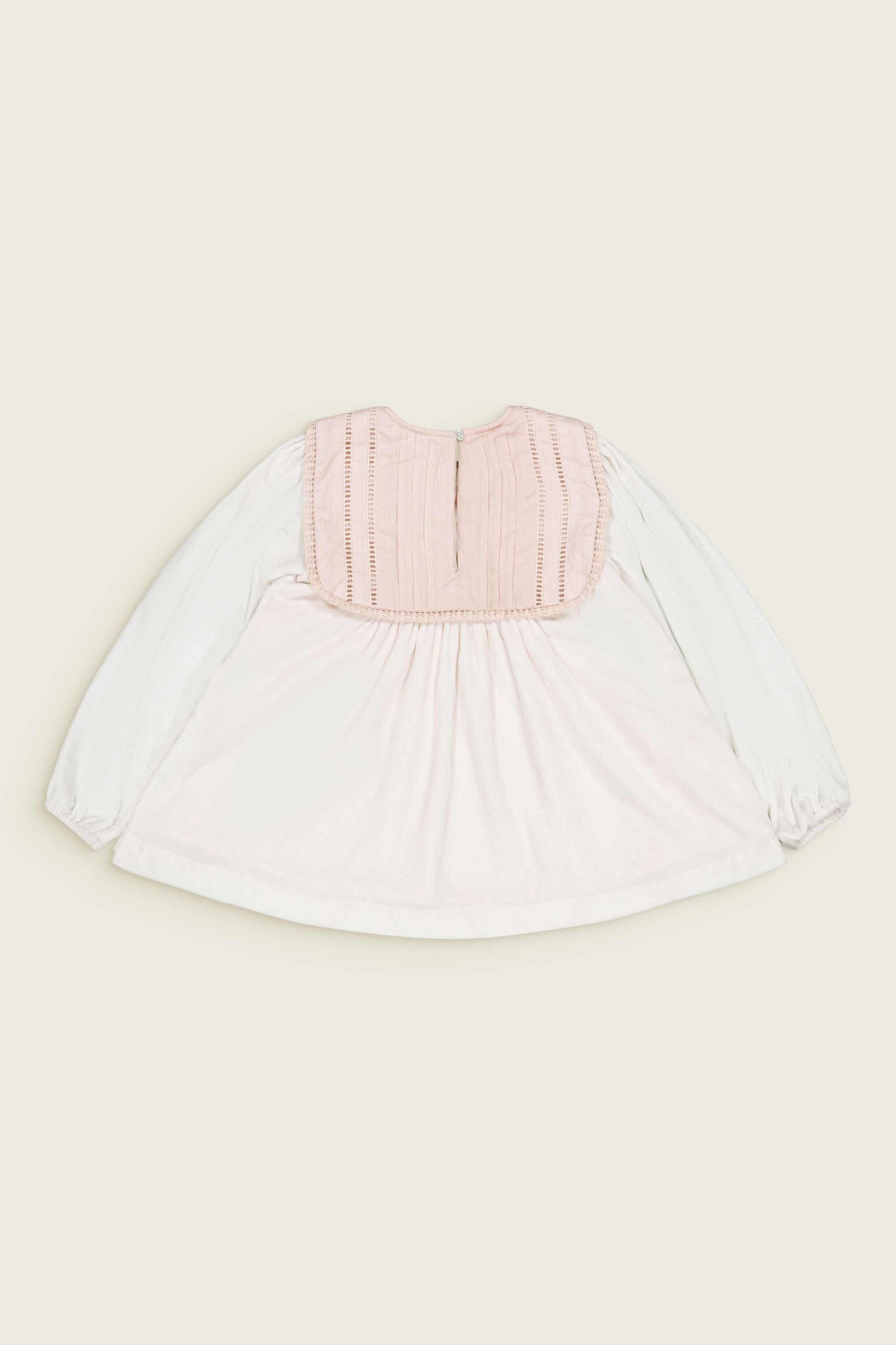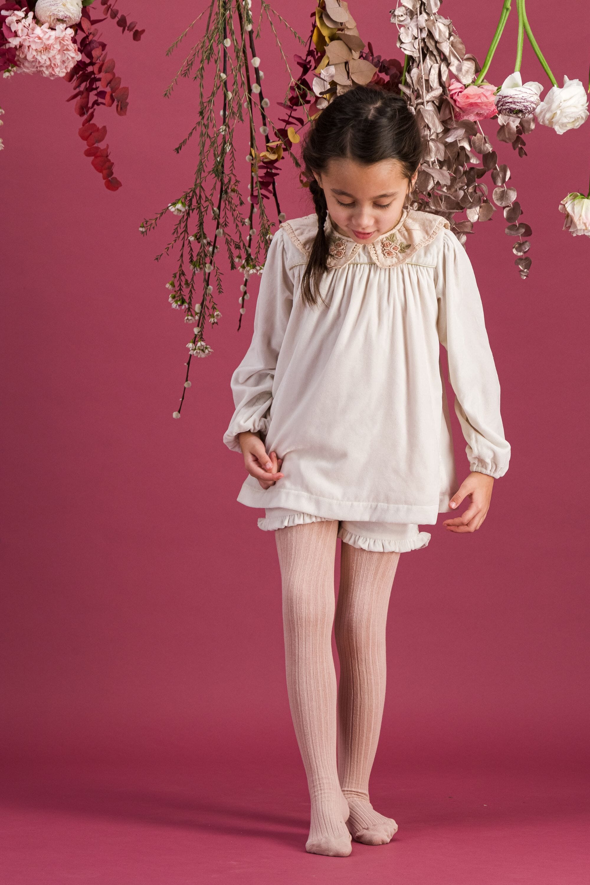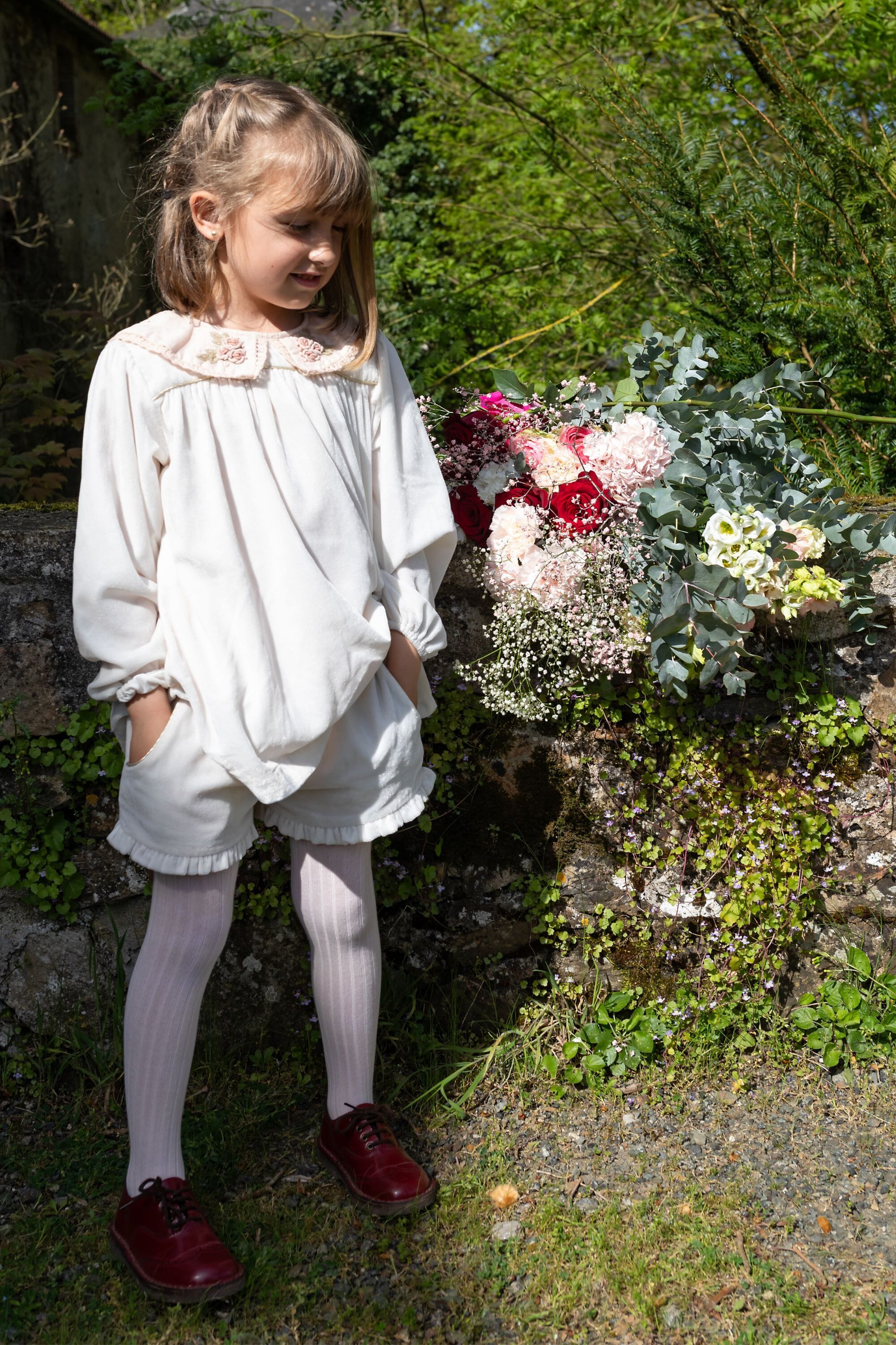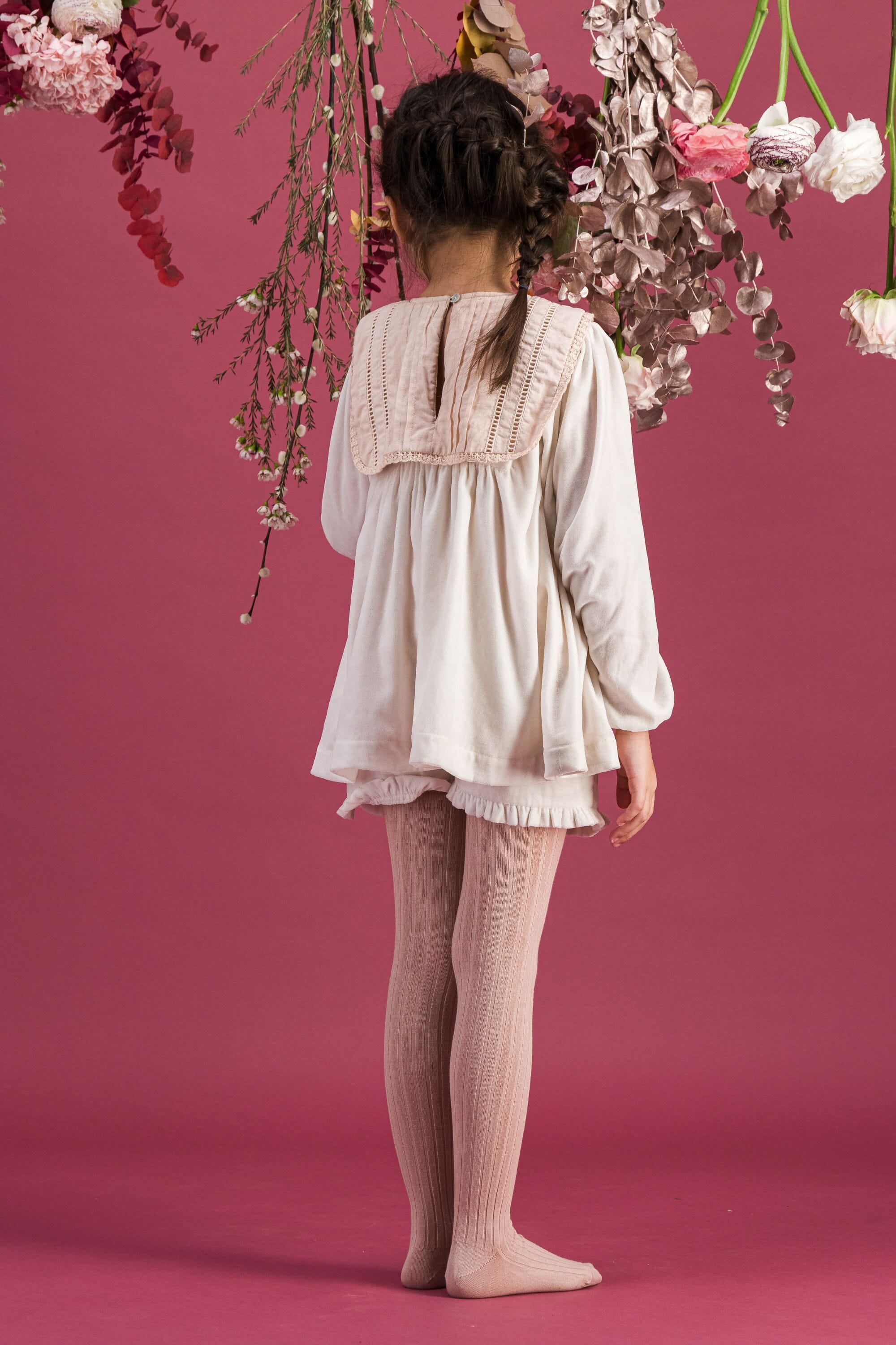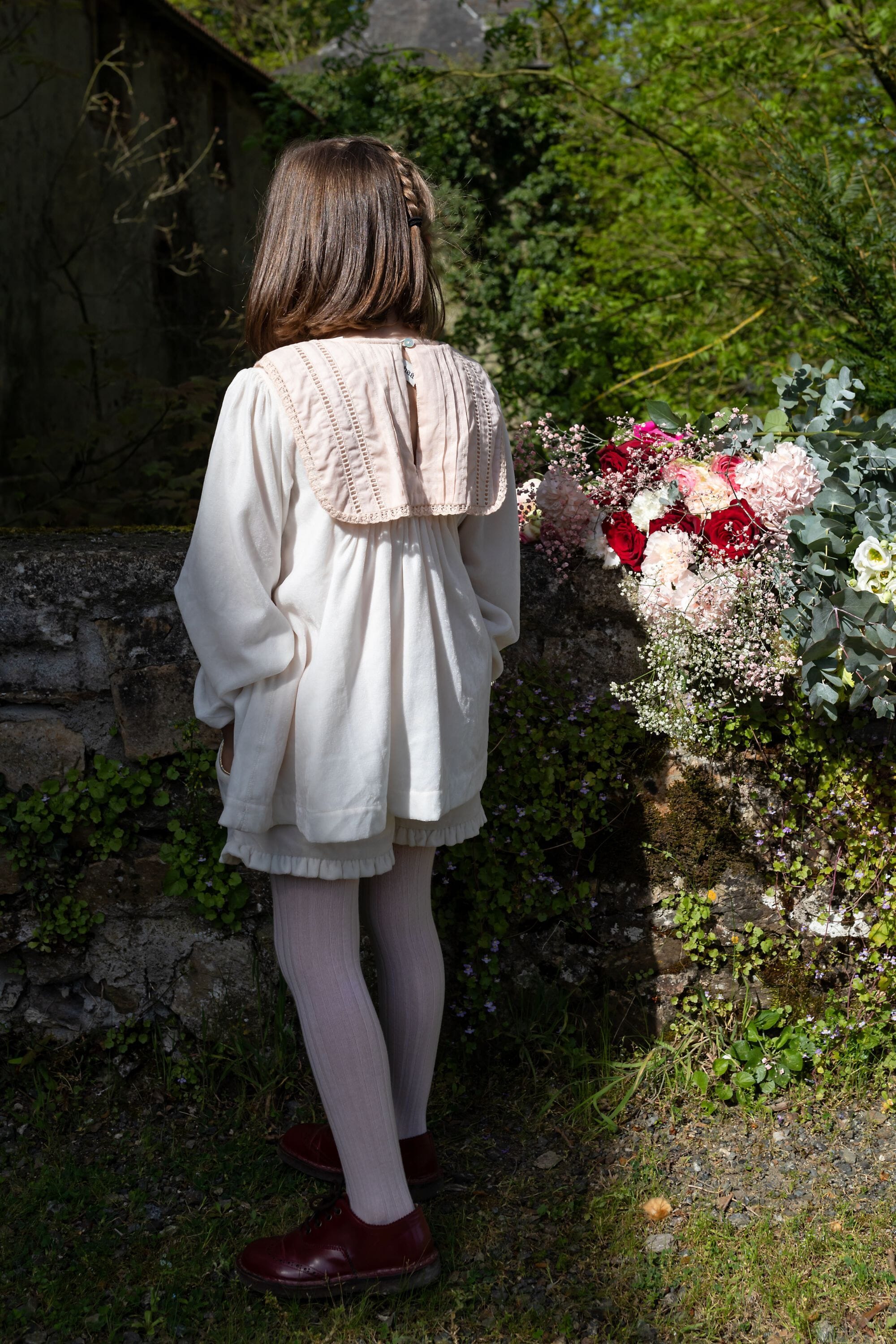 - Blouse, Snow colored velvet, Plain lining in organic cotton voile, Hand embroidery, pintucks and ladder lace on the collar, Golden pipping on the front, Long elasticated sleeves, Gathers on the front and back, One buttoned drop at the back.