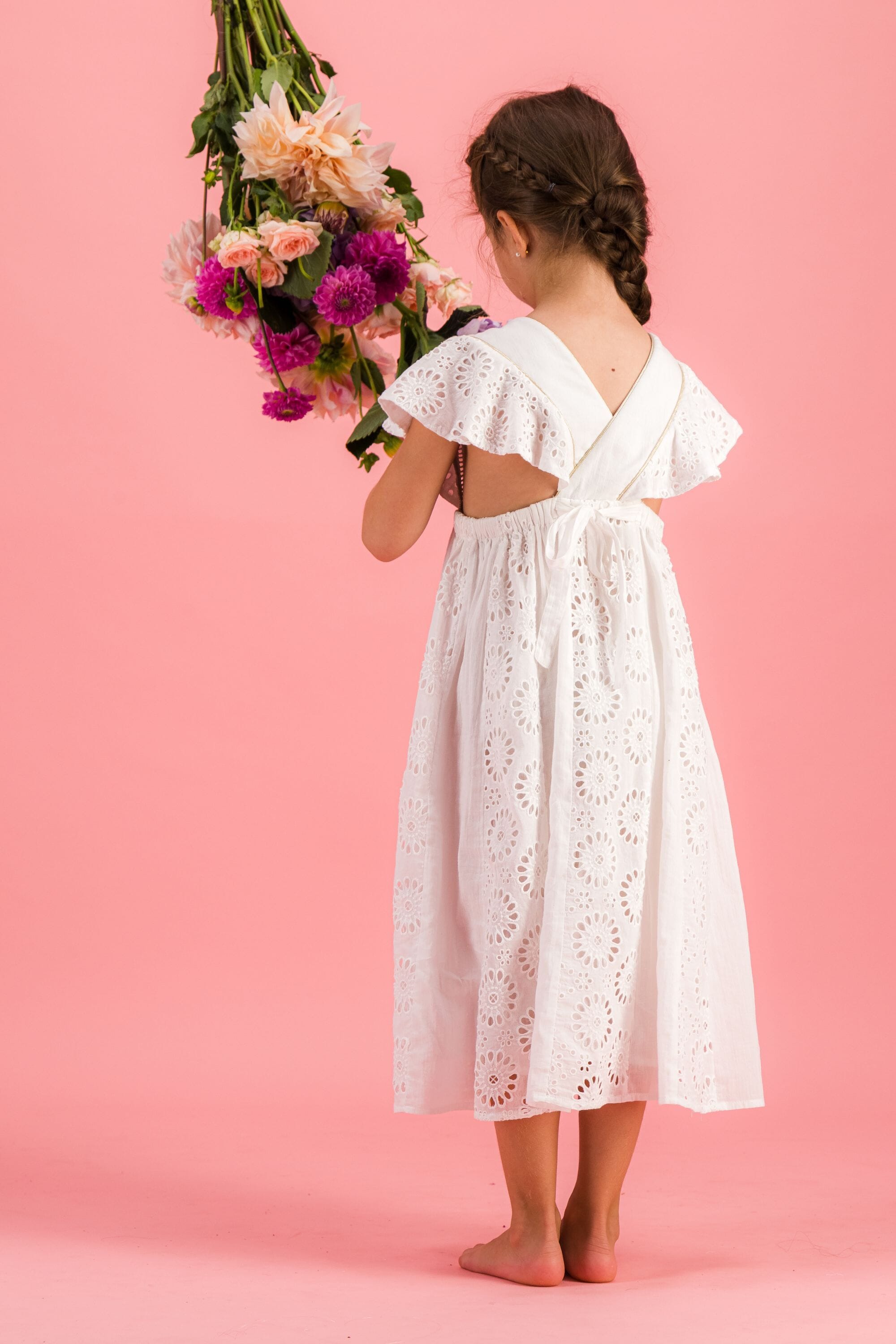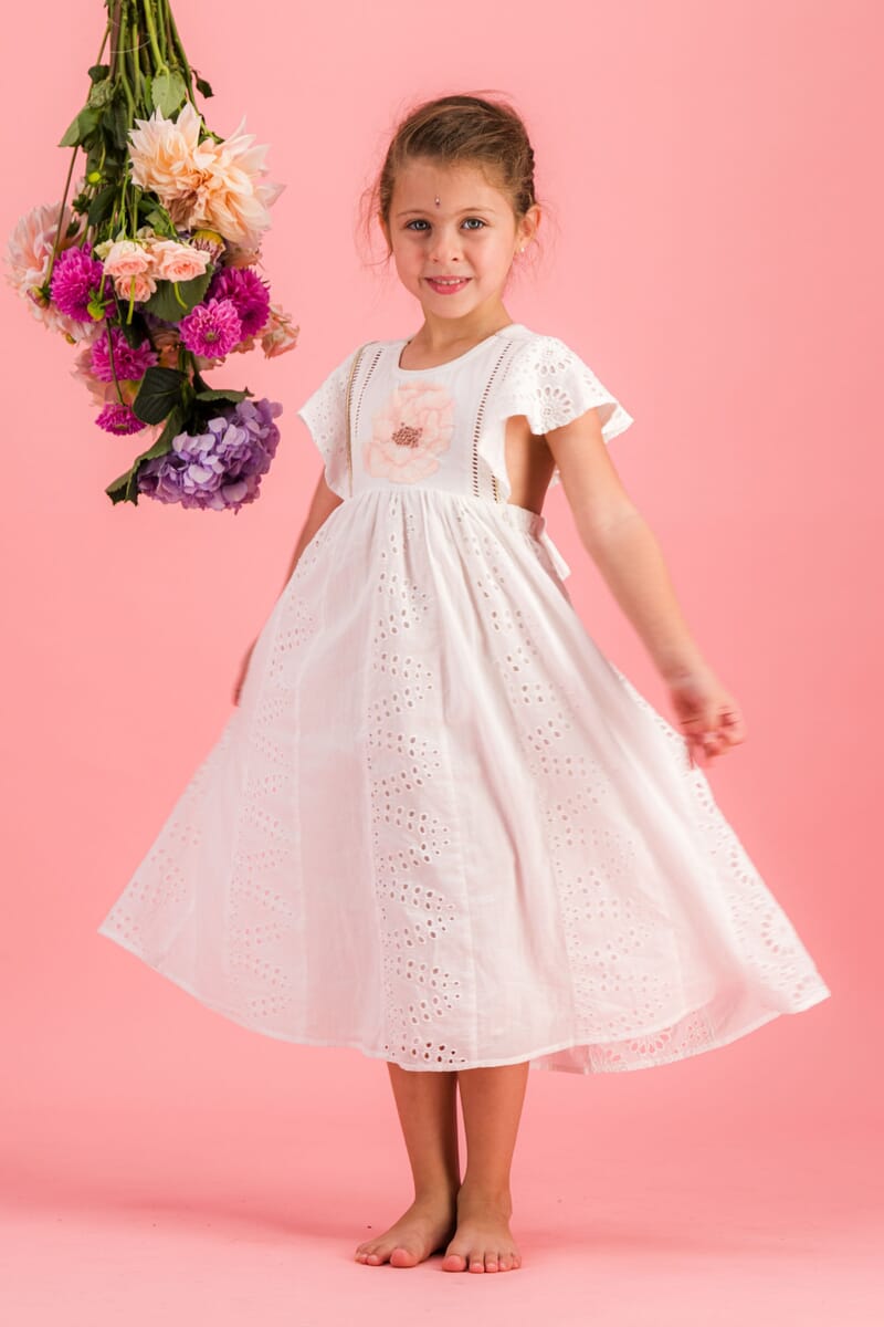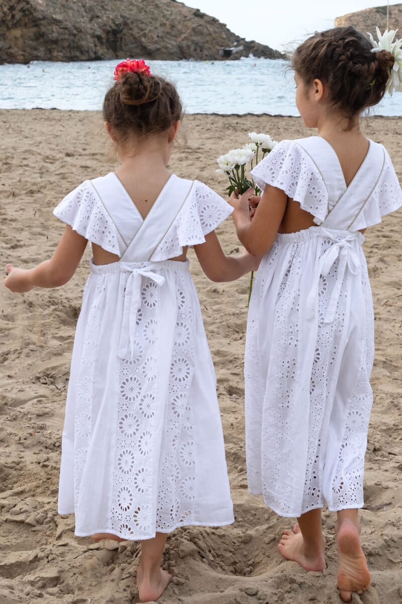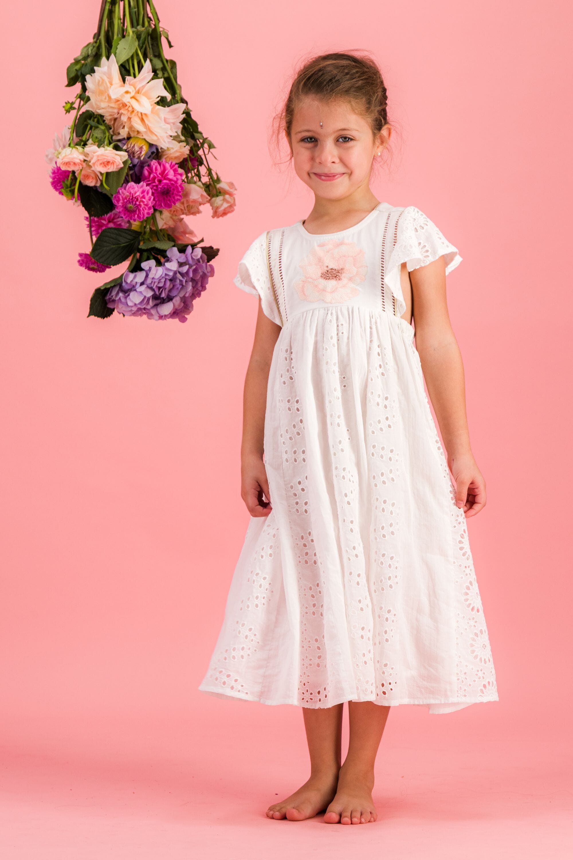 A long organic cotton dress with magnificent broderie anglaise and decorated with hand embroidery, ladder lace and golden piping on the front.