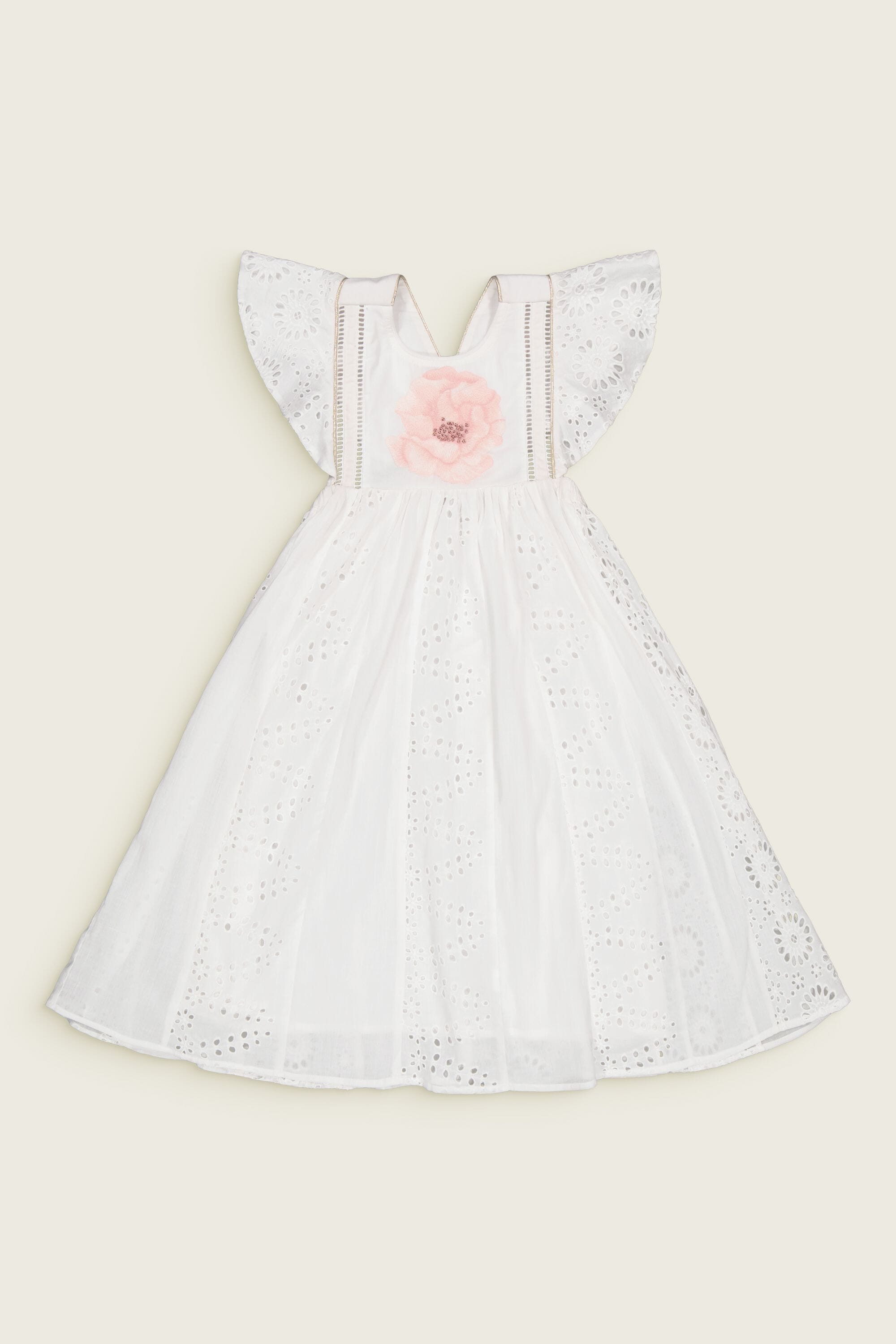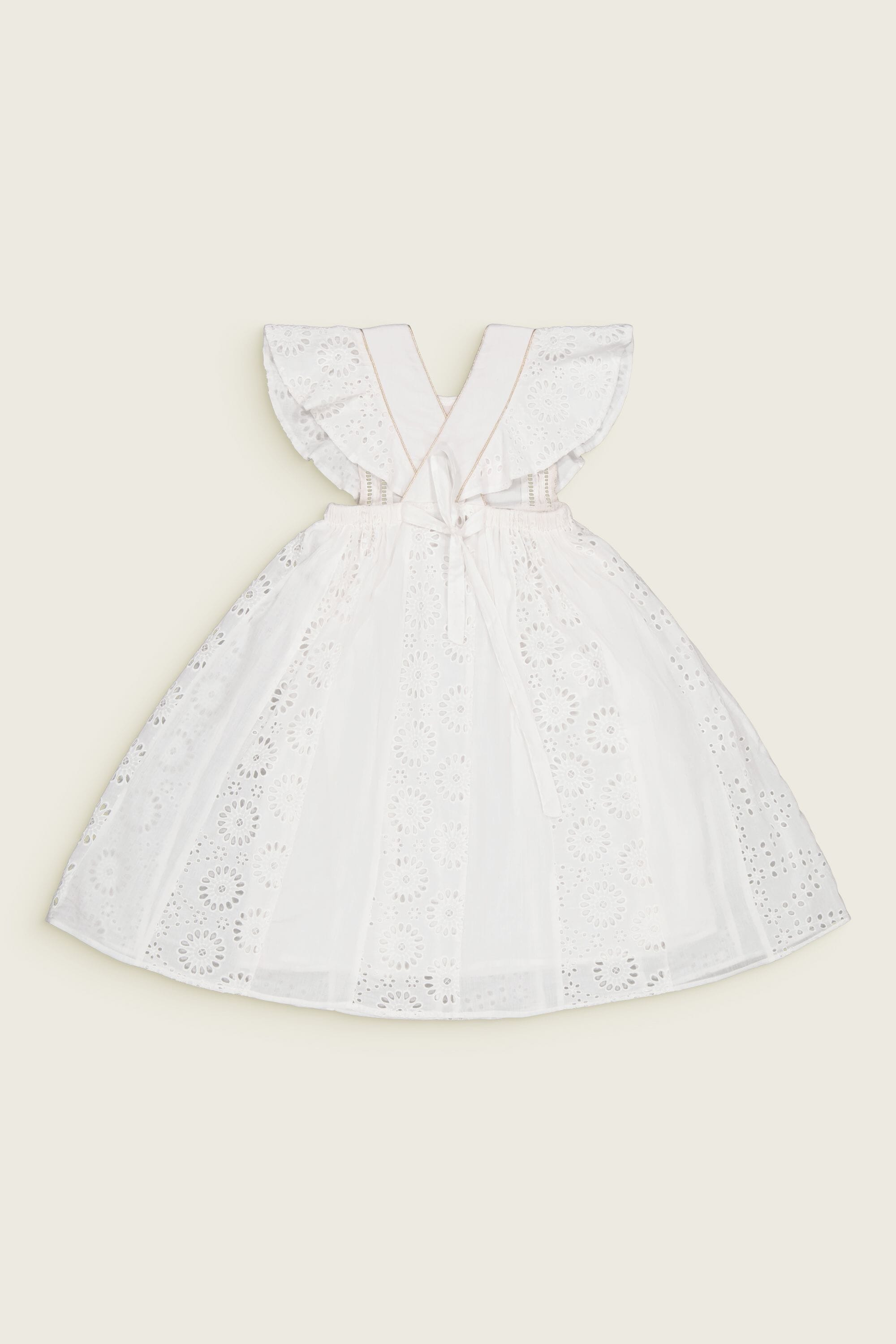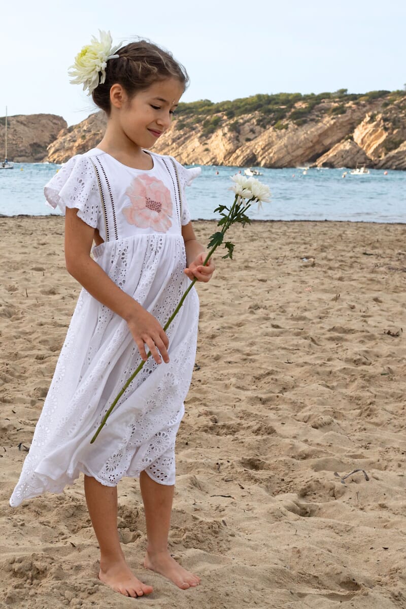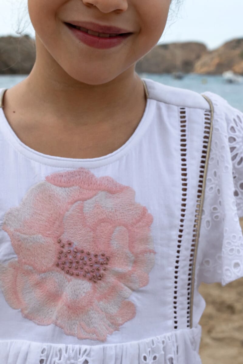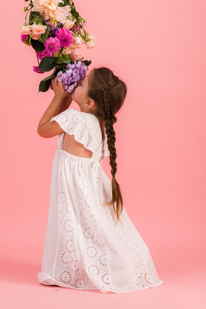 A long organic cotton dress with magnificent broderie anglaise and decorated with hand embroidery, ladder lace and golden piping on the front.