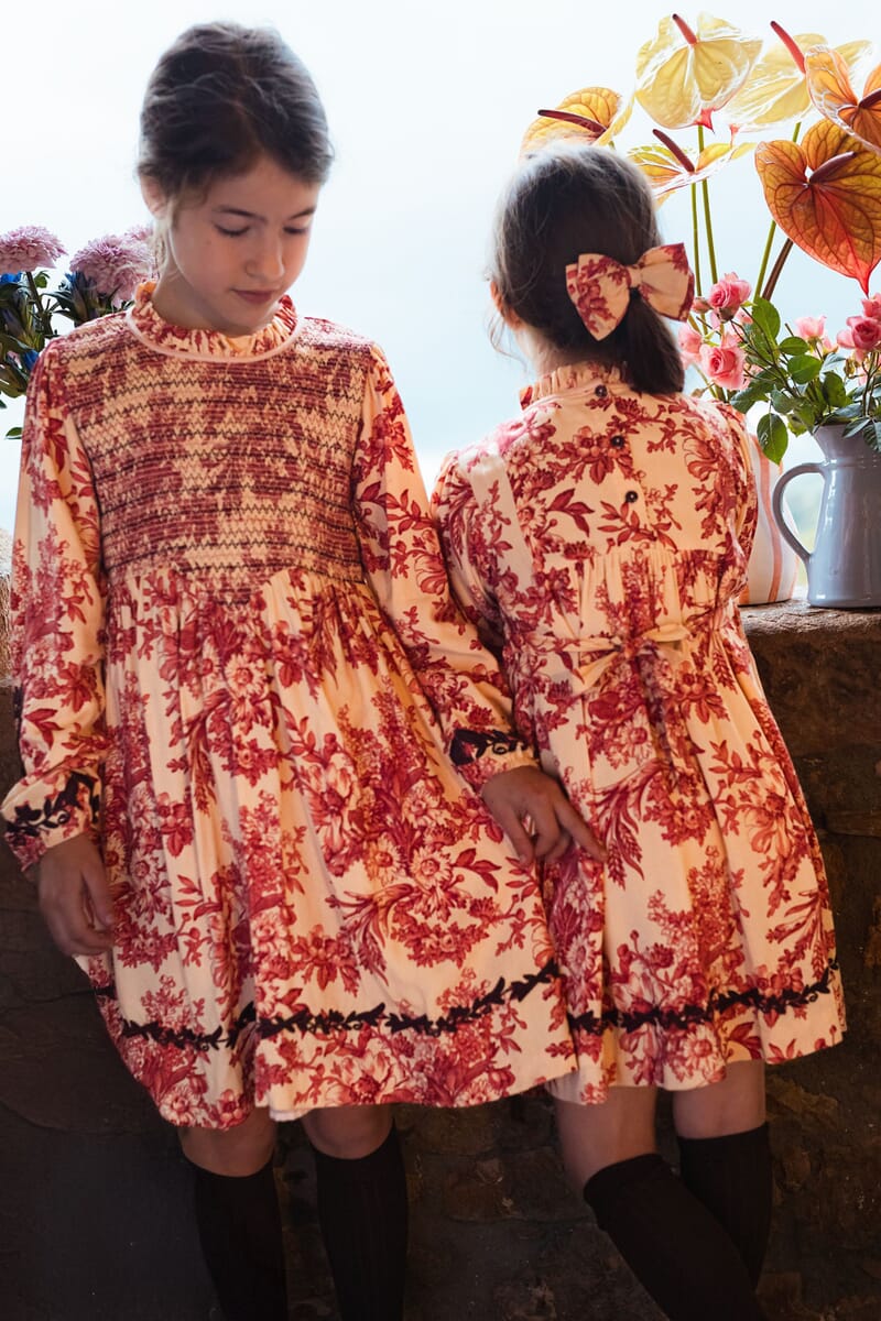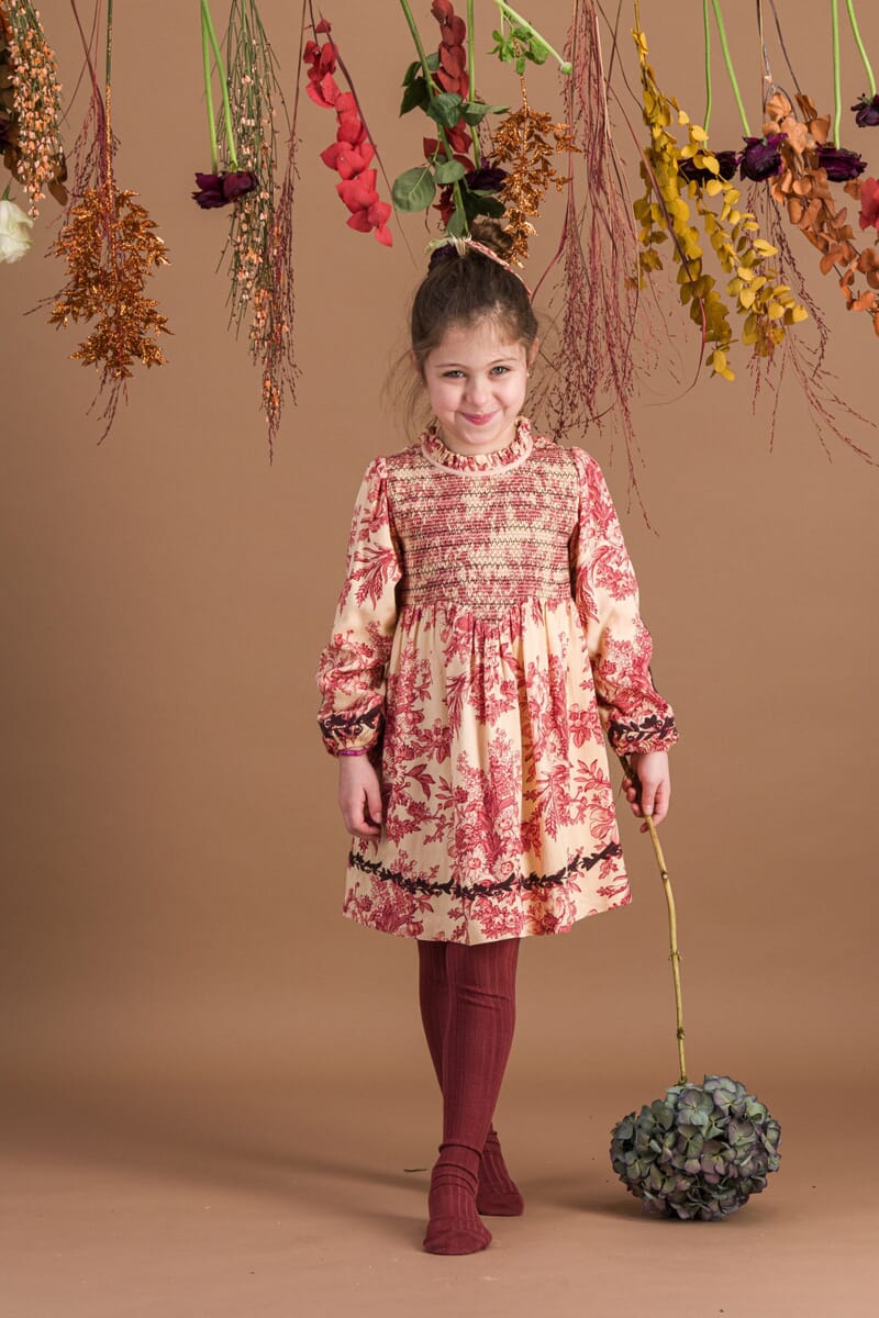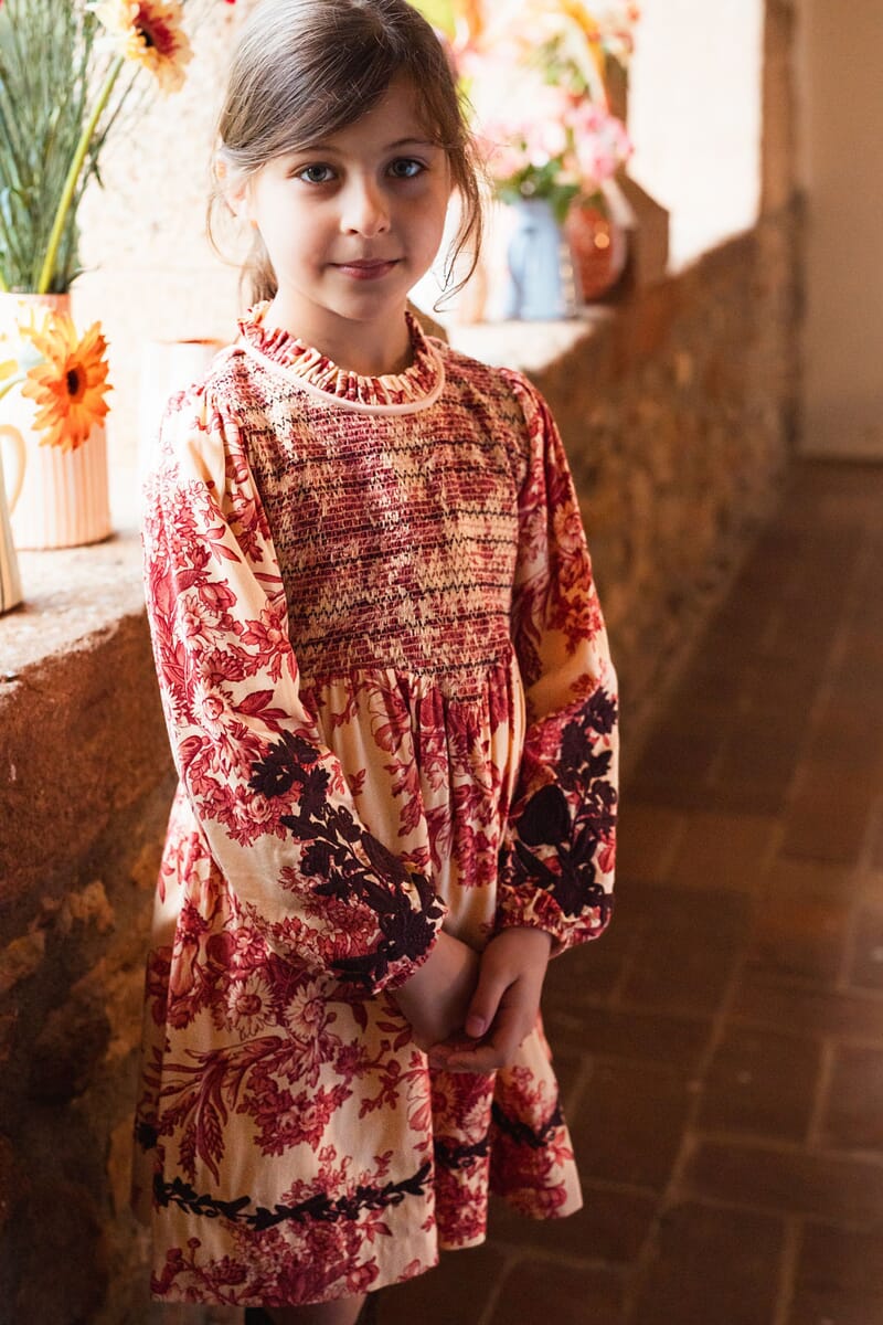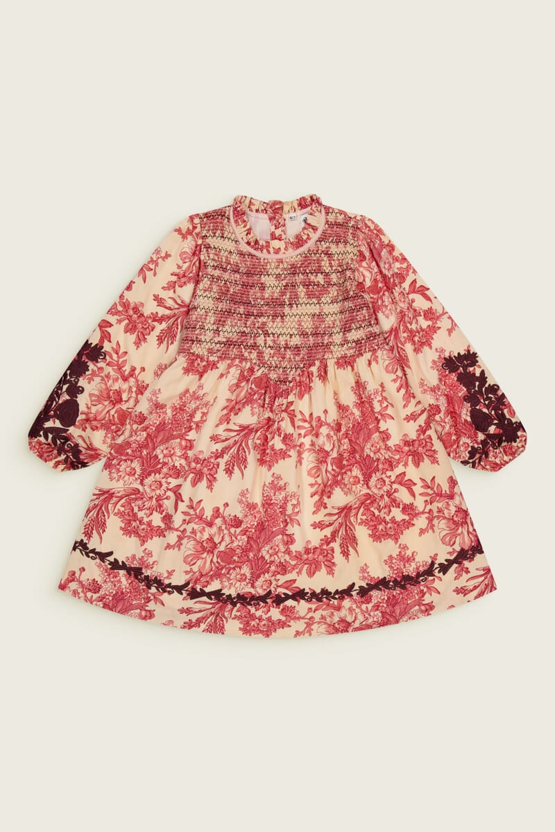 - Dress, 100% ECOVERO® Viscose, Plain lining in organic cotton voile, Block print, Embroidery on the sleeves and at the bottom of the dress, Fully smocked at the front, Long elasticated sleeves, Buttons and belt at the back.