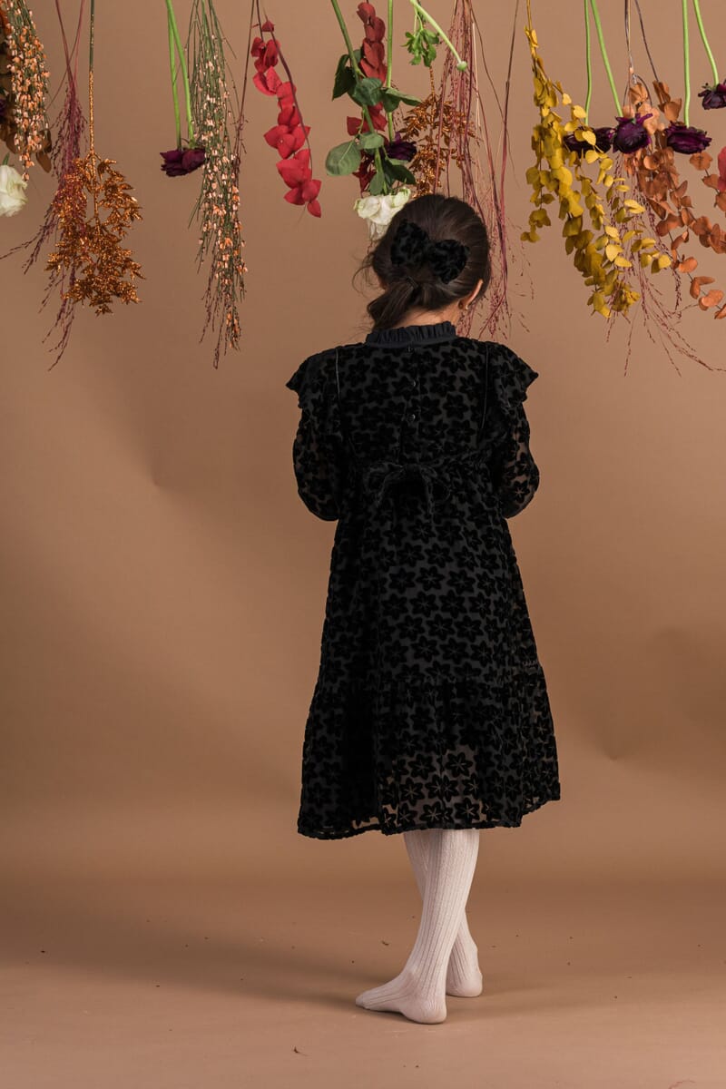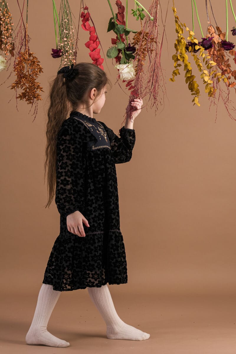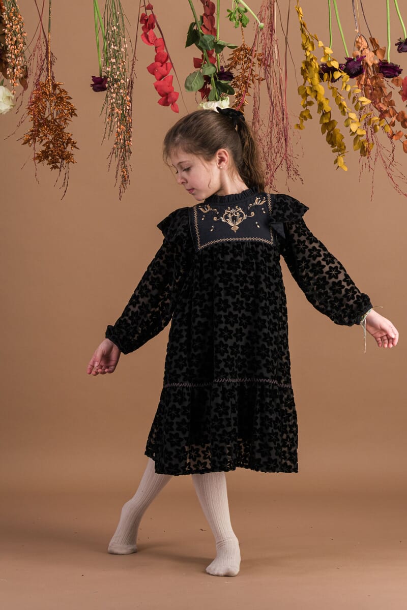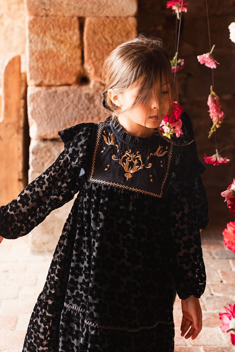 - Long dress, Burnout velvet, Black color, Contrasting lining in organic cotton voile, Golden embroidery and ladder lace on the front, Black metallic thread piping, Long and lined ruffled sleeves, Buttons and Belt at the back.