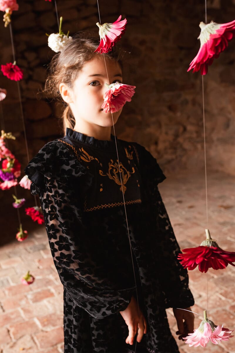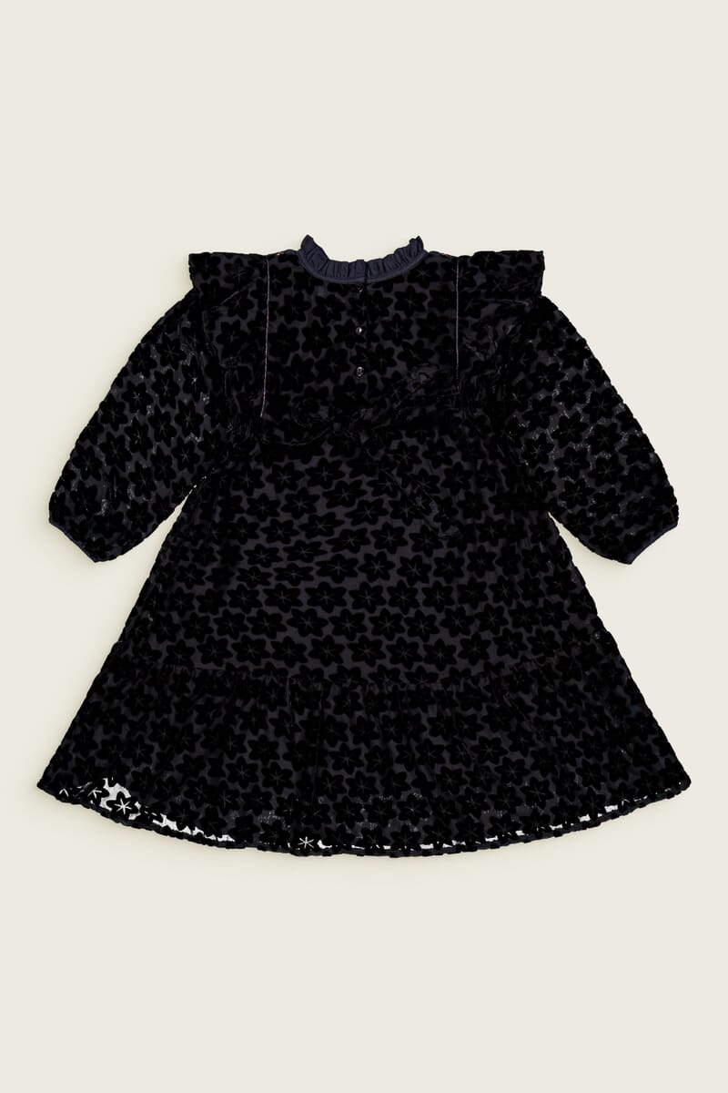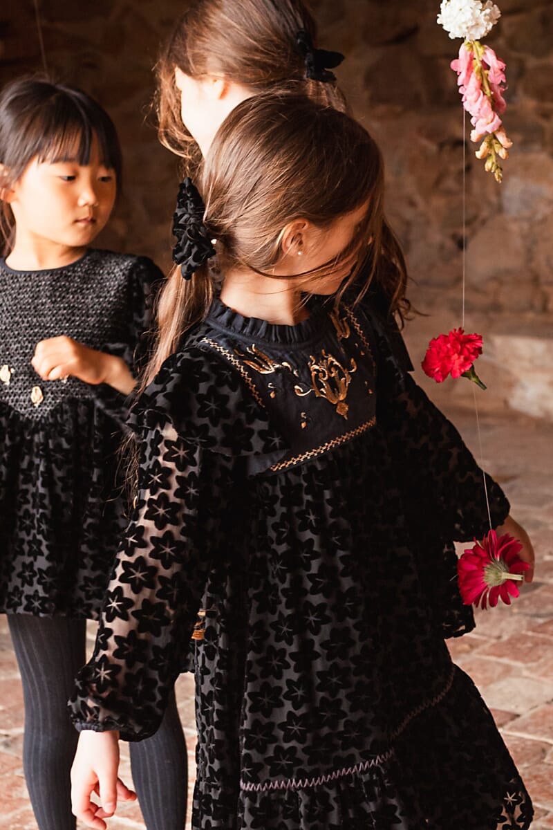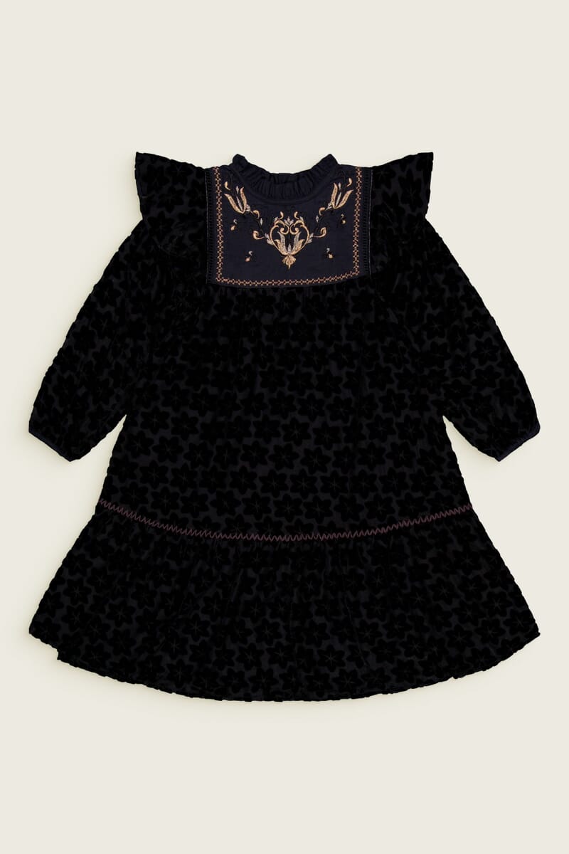 - Long dress, Burnout velvet, Black color, Contrasting lining in organic cotton voile, Golden embroidery and ladder lace on the front, Black metallic thread piping, Long and lined ruffled sleeves, Buttons and Belt at the back.