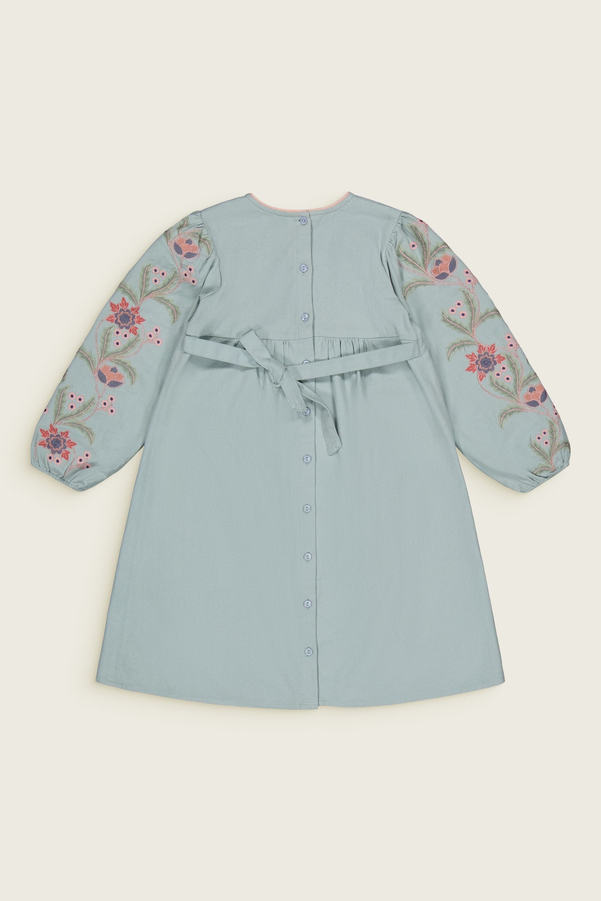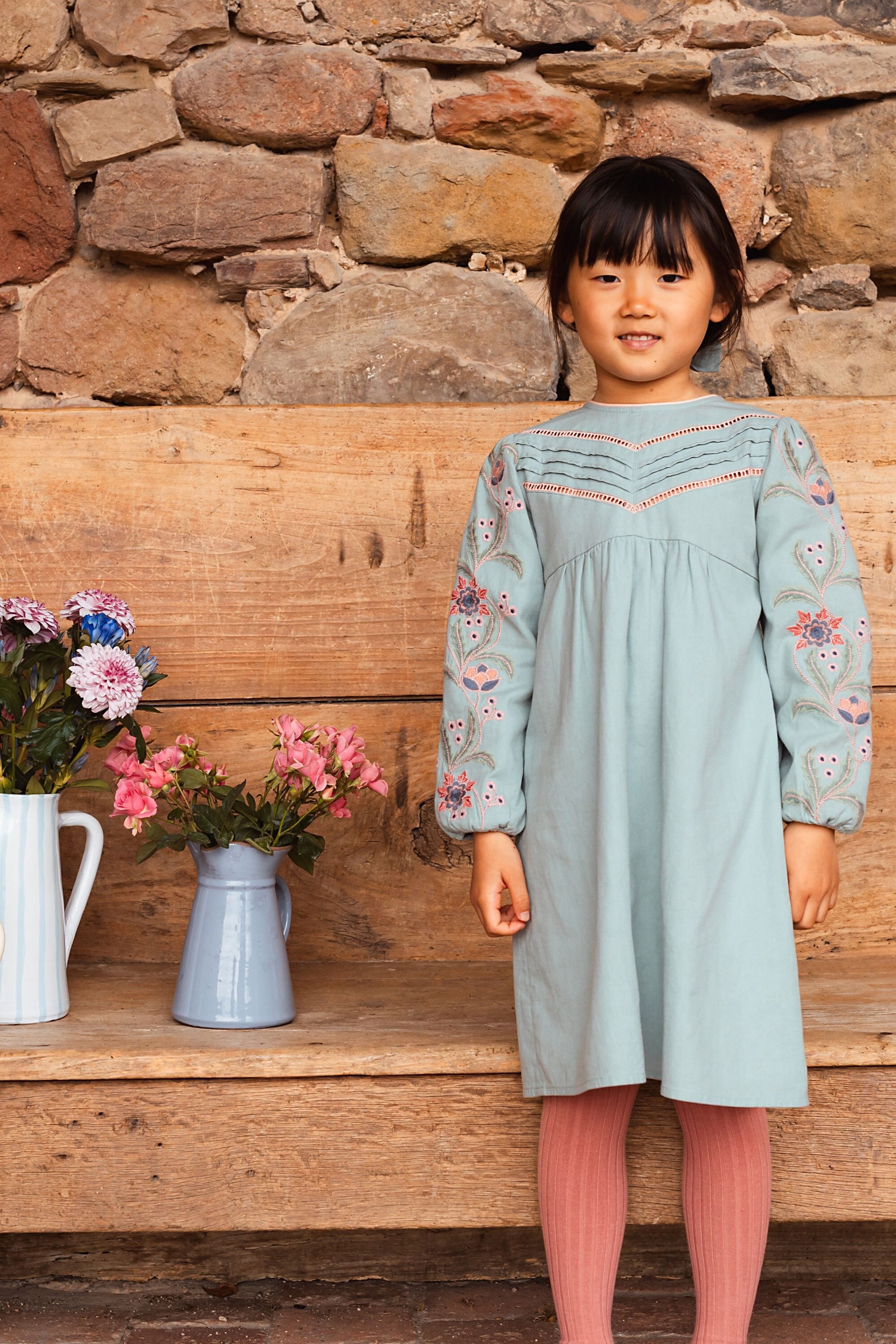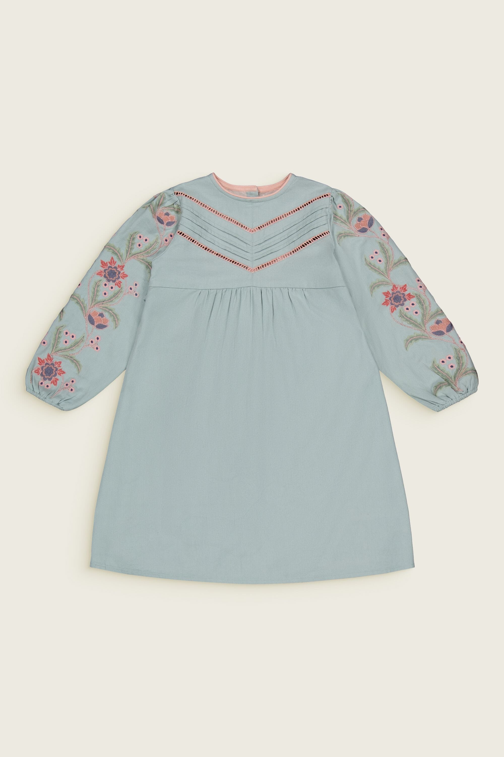 - Dress, Blue color, Organic cotton twill (167 g/m²), Plain lining in organic cotton voile, Pintucks, ladder lace and gathers at the front, Long embroidered and elasticated sleeves, Buttons and belt at the back.