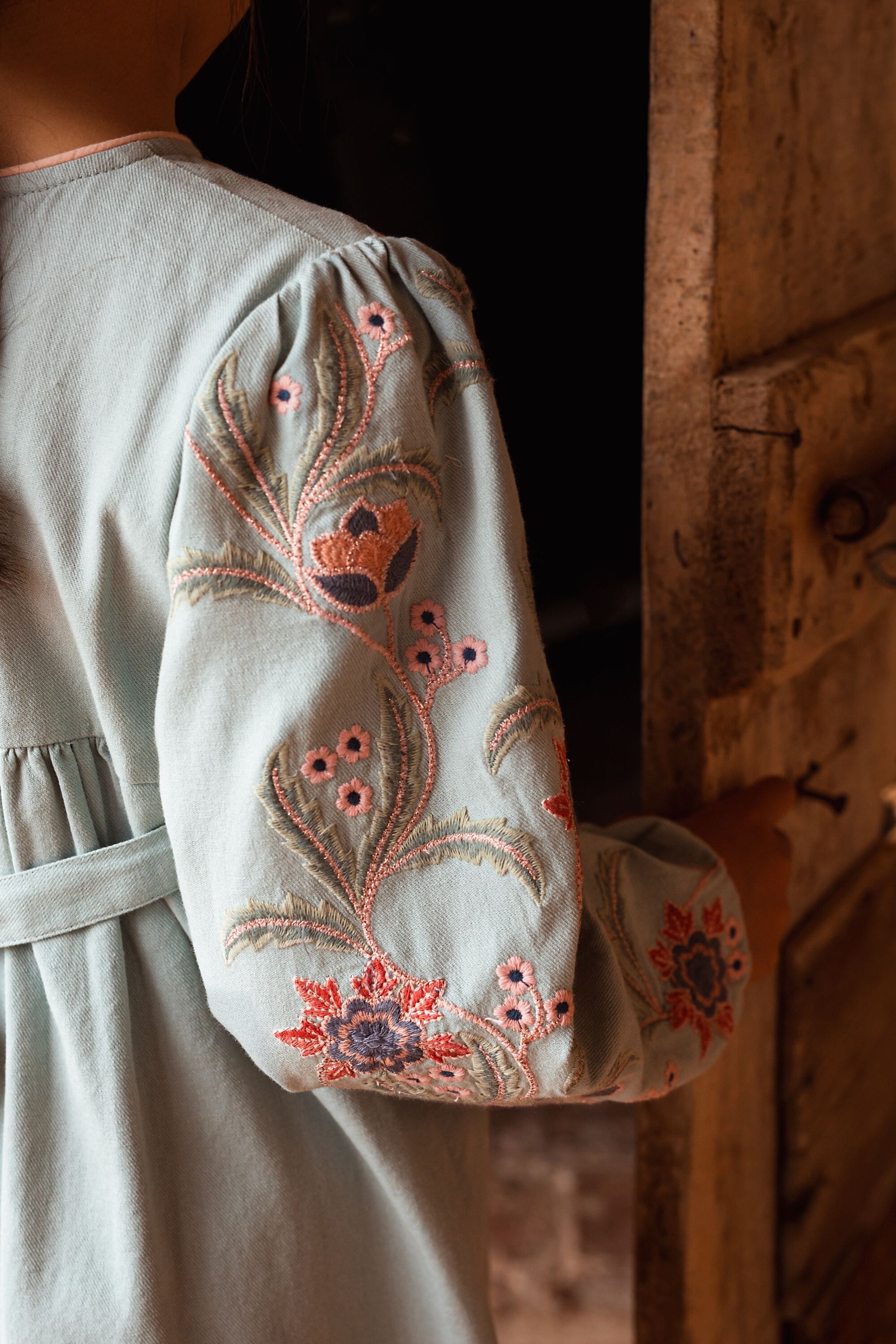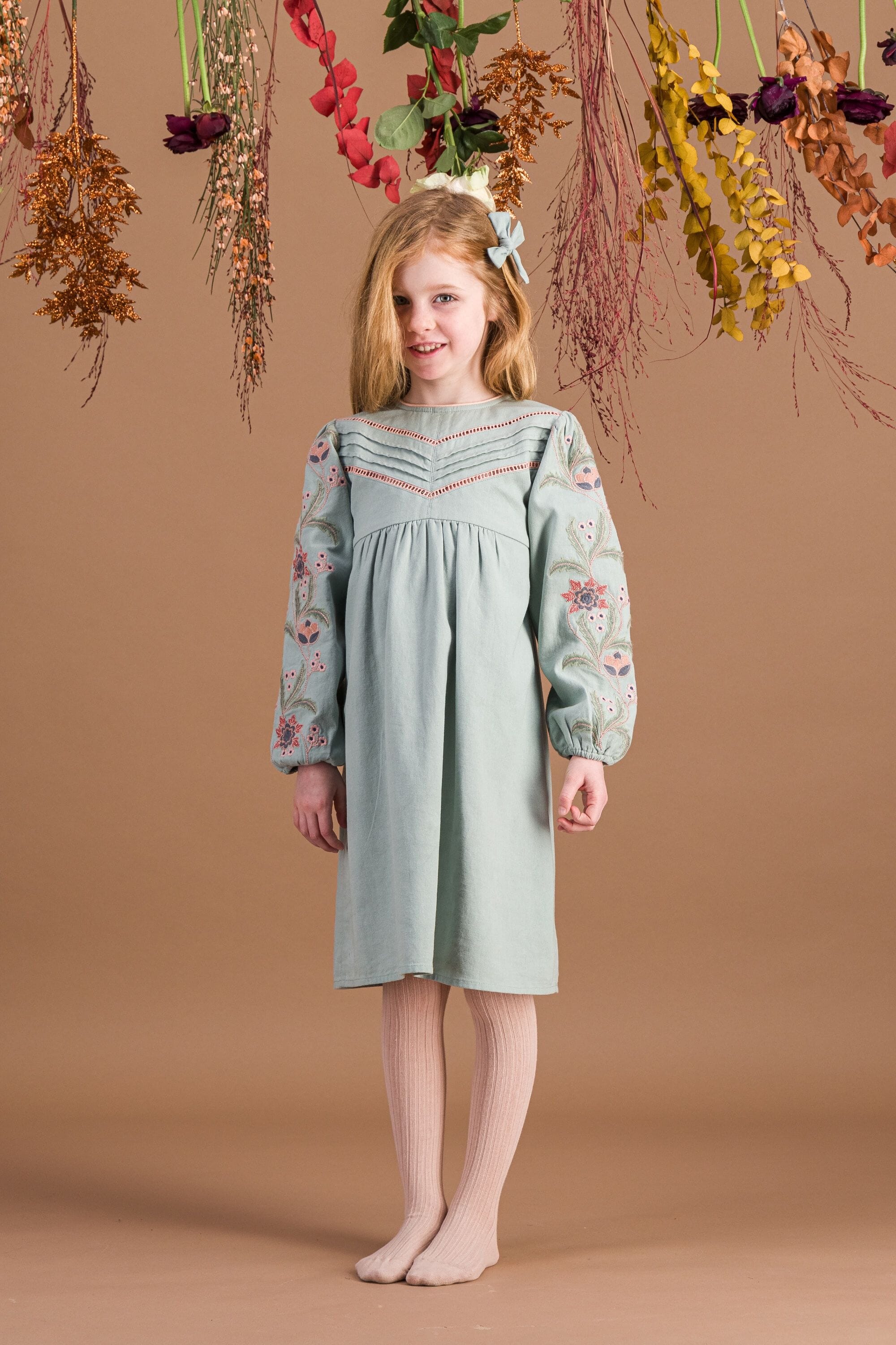 A dress made from heavyweight organic cotton twill (167 g/m²) with fully embroidered sleeves and a front yoke adorned with pintucks and ladder lace.