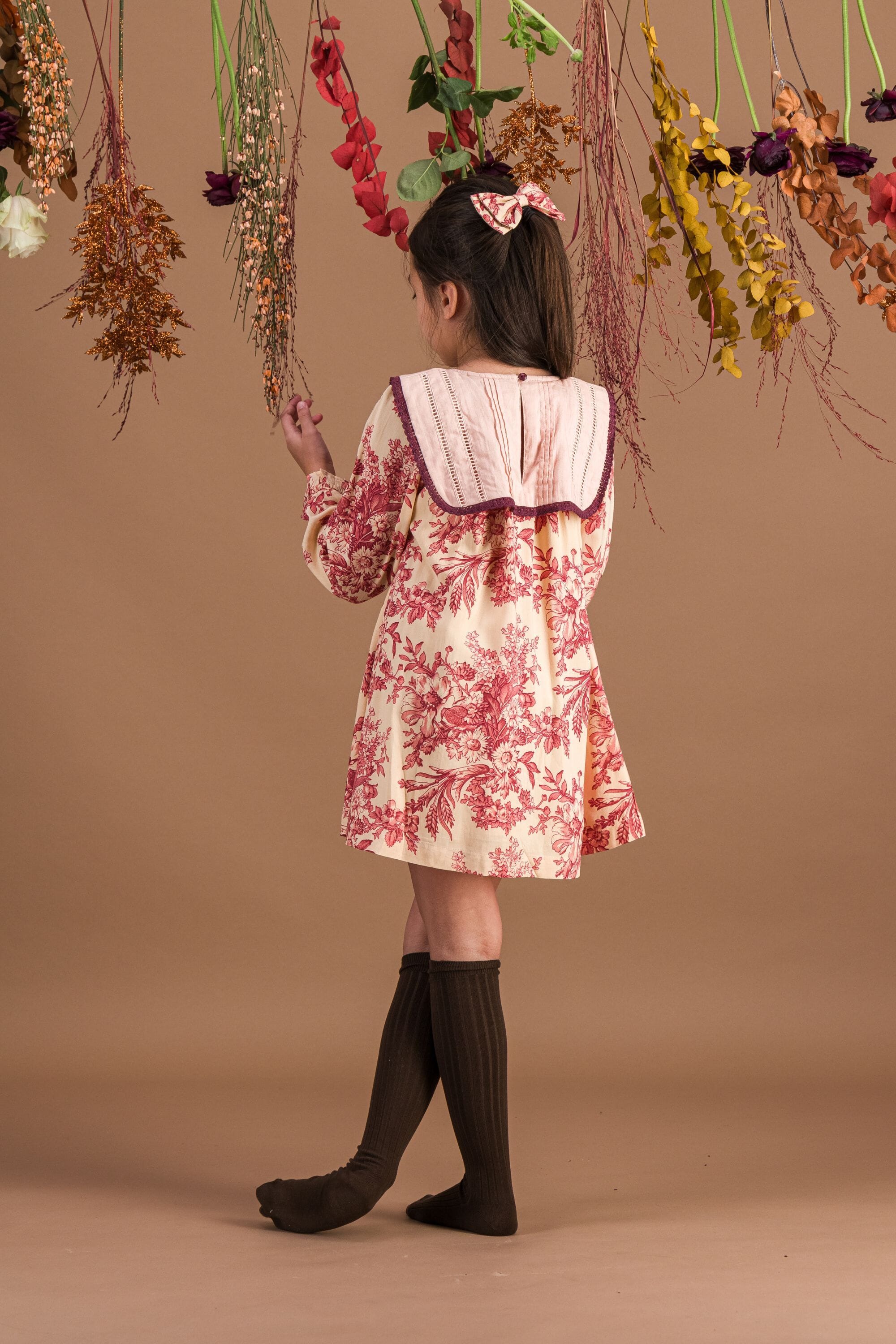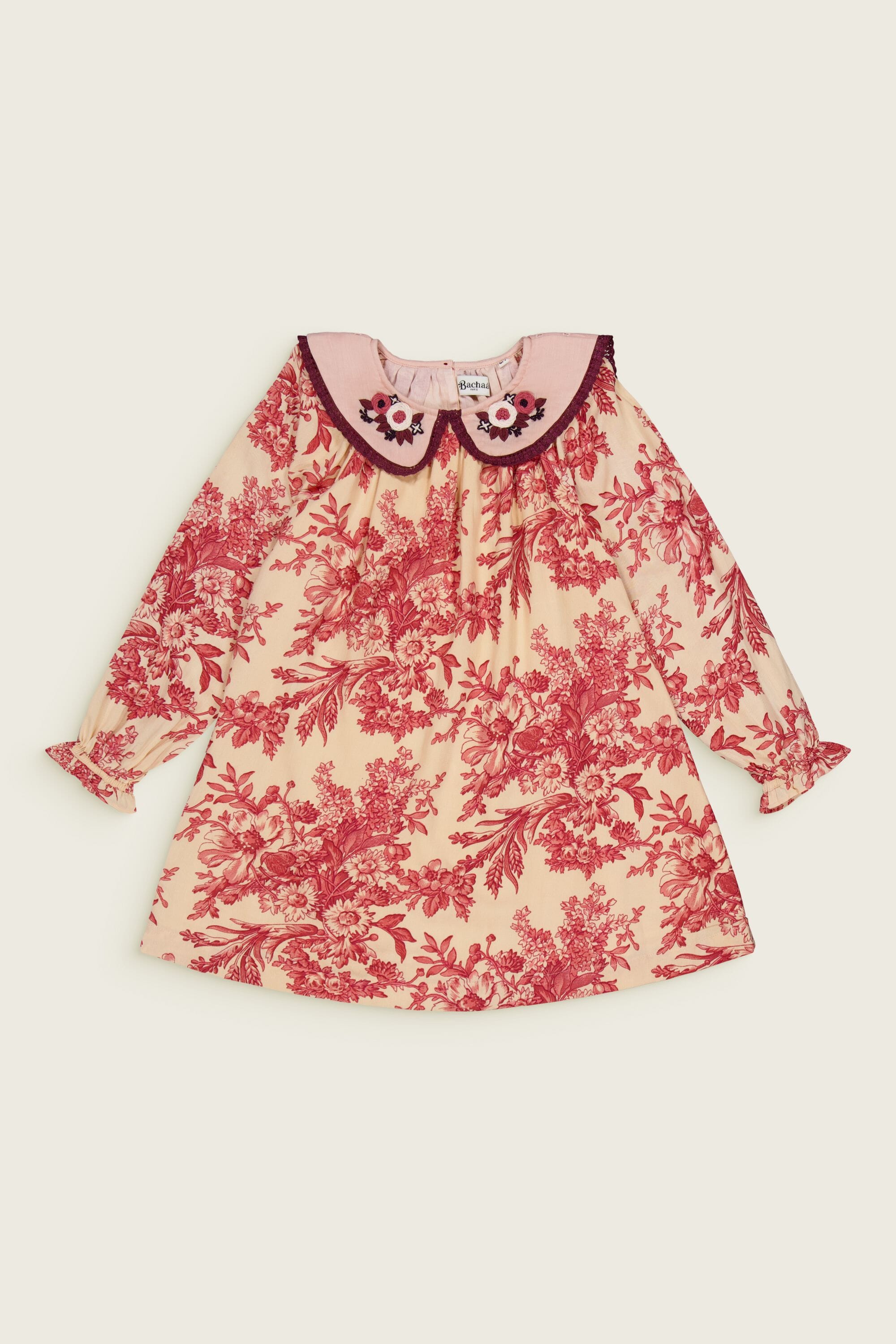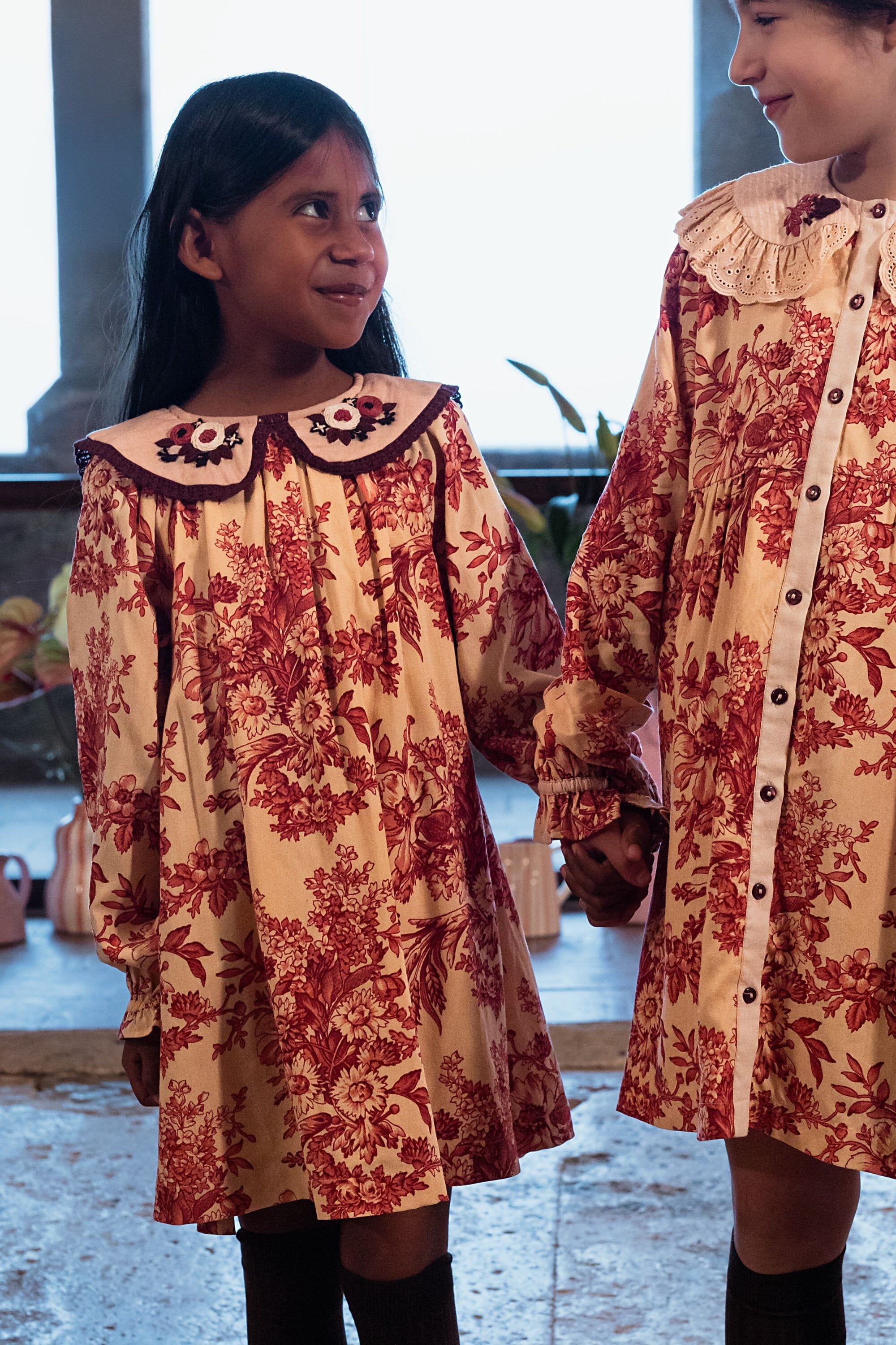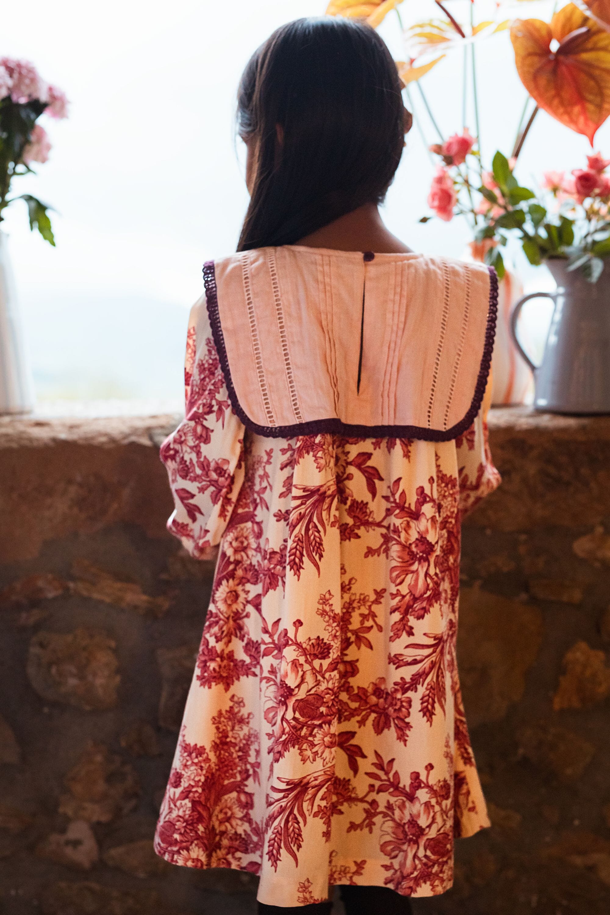 A dress in ECOVERO® viscose with a beautiful contrasting collar adorned with hand embroidery and lace on the front and a long back collar embellished with ladder lace.