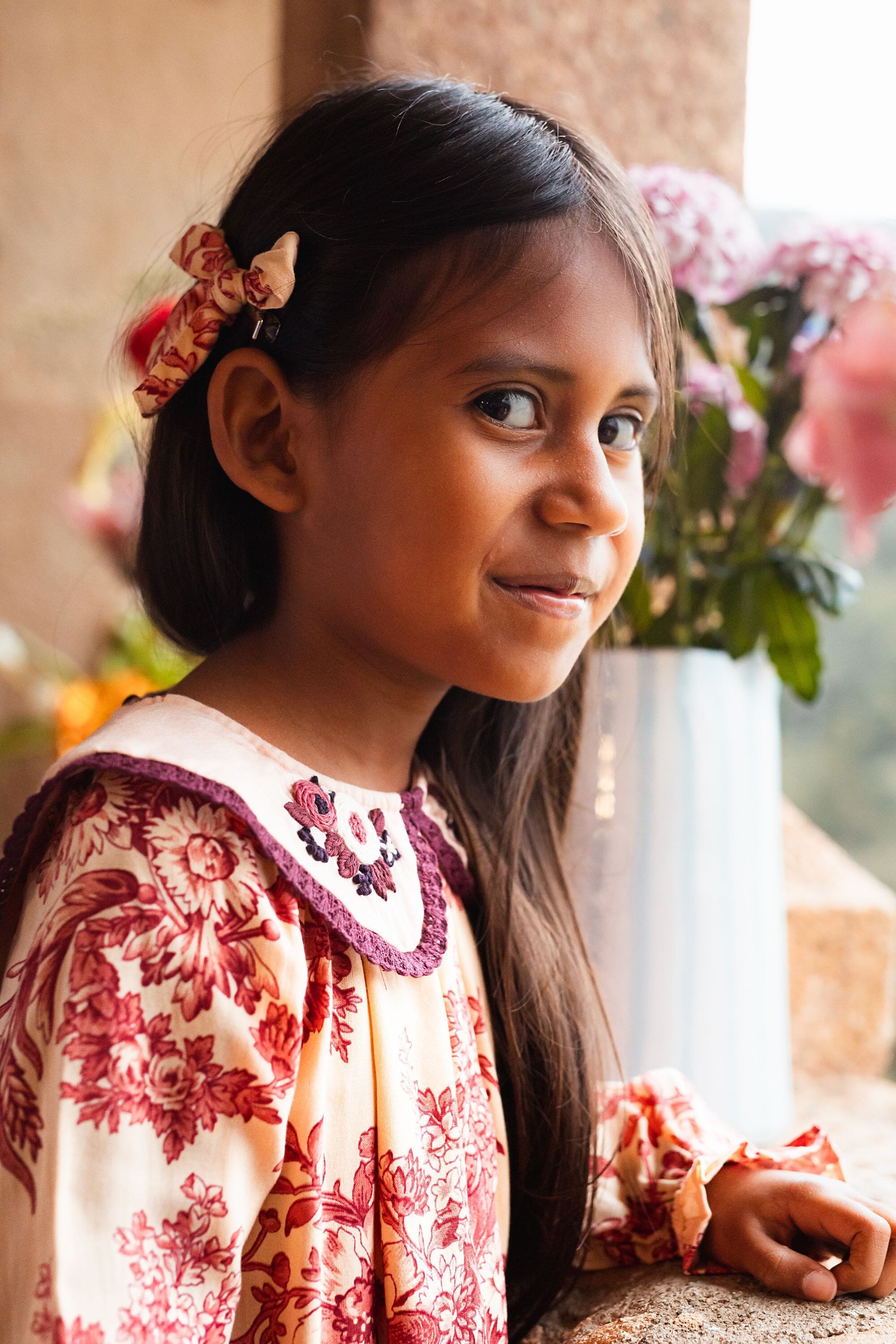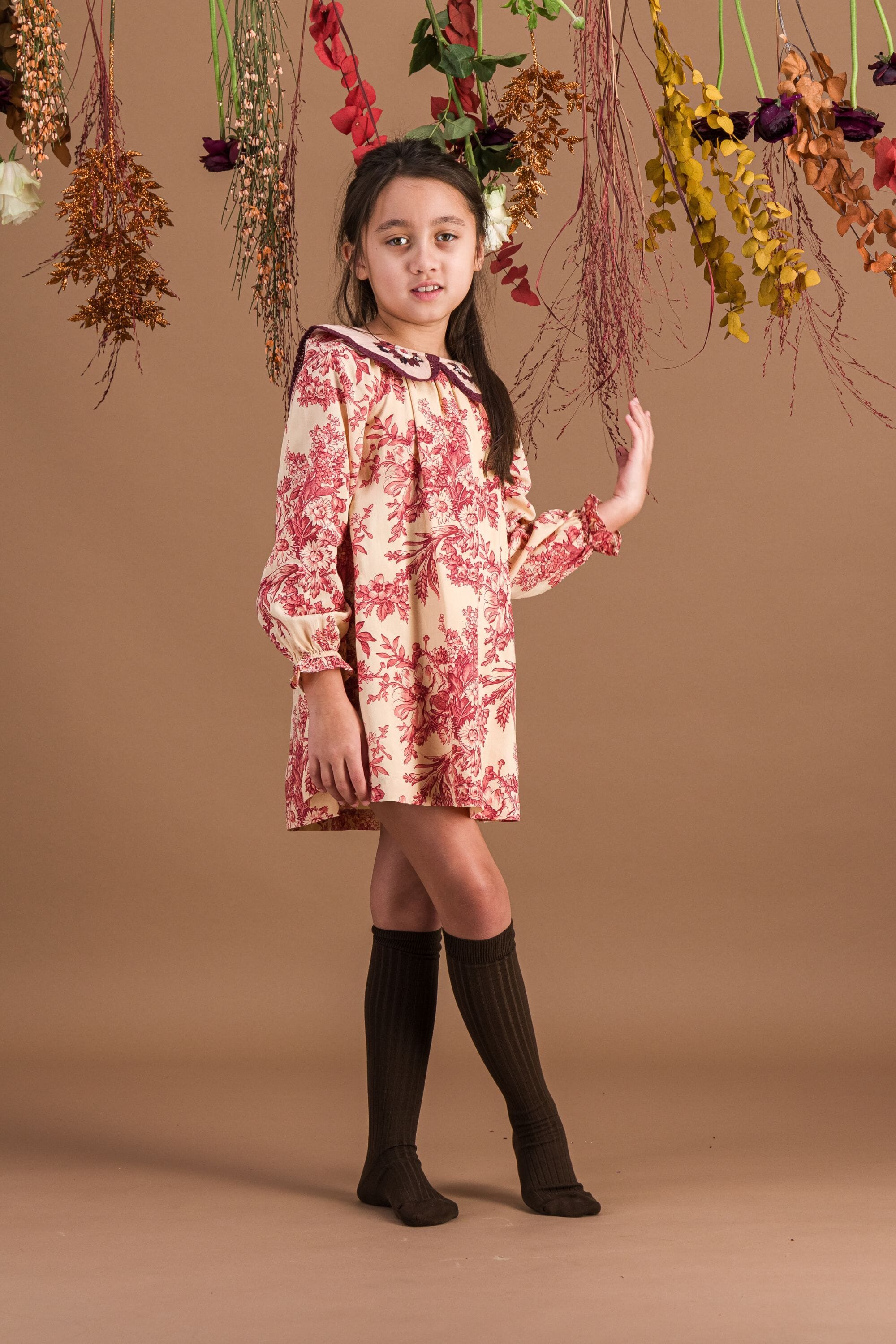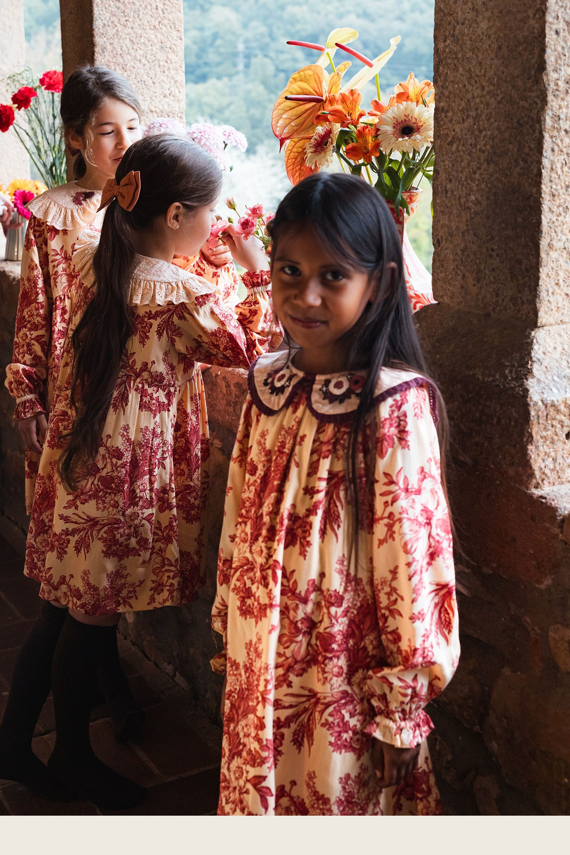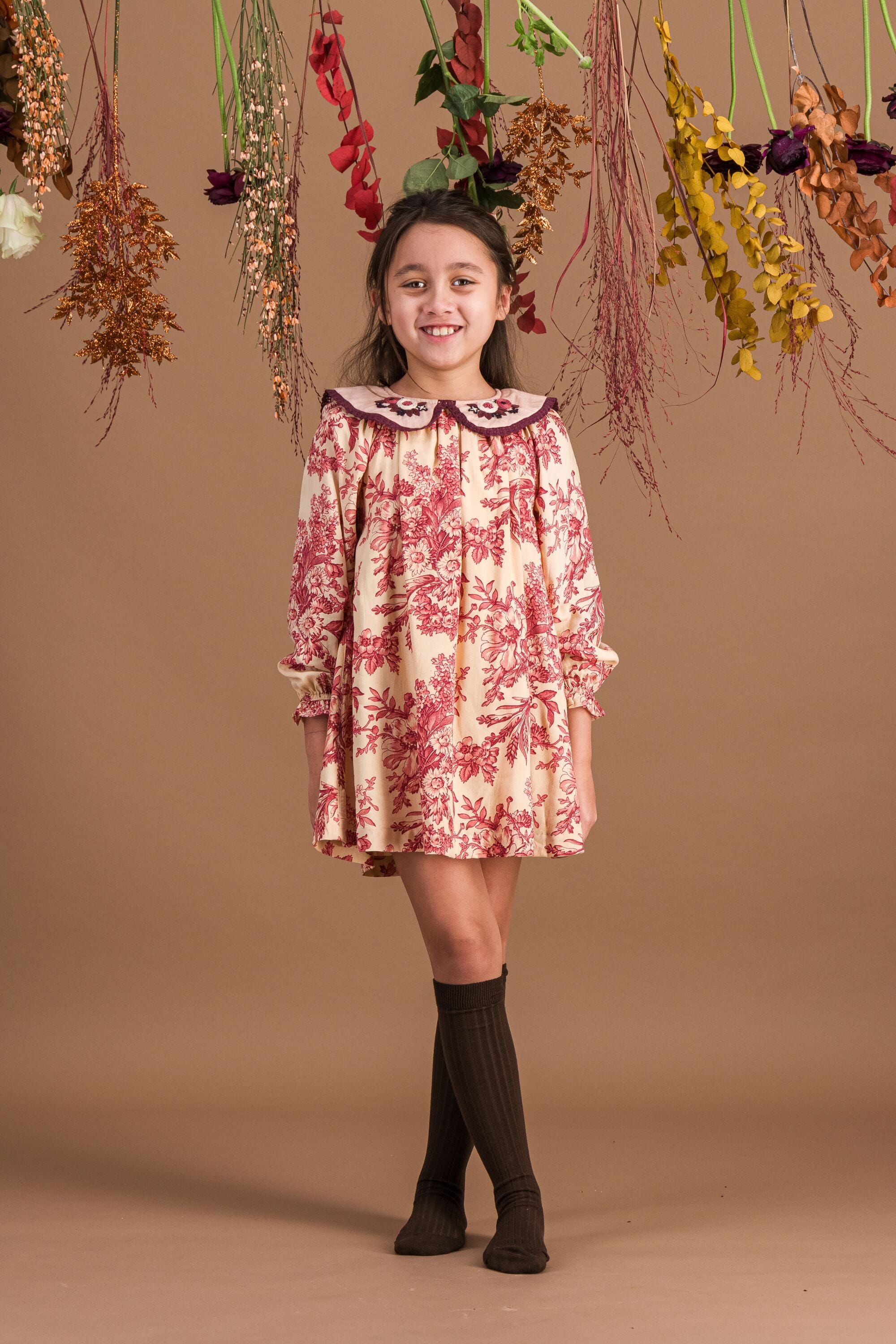 A dress in ECOVERO® viscose with a beautiful contrasting collar adorned with hand embroidery and lace on the front and a long back collar embellished with ladder lace.
