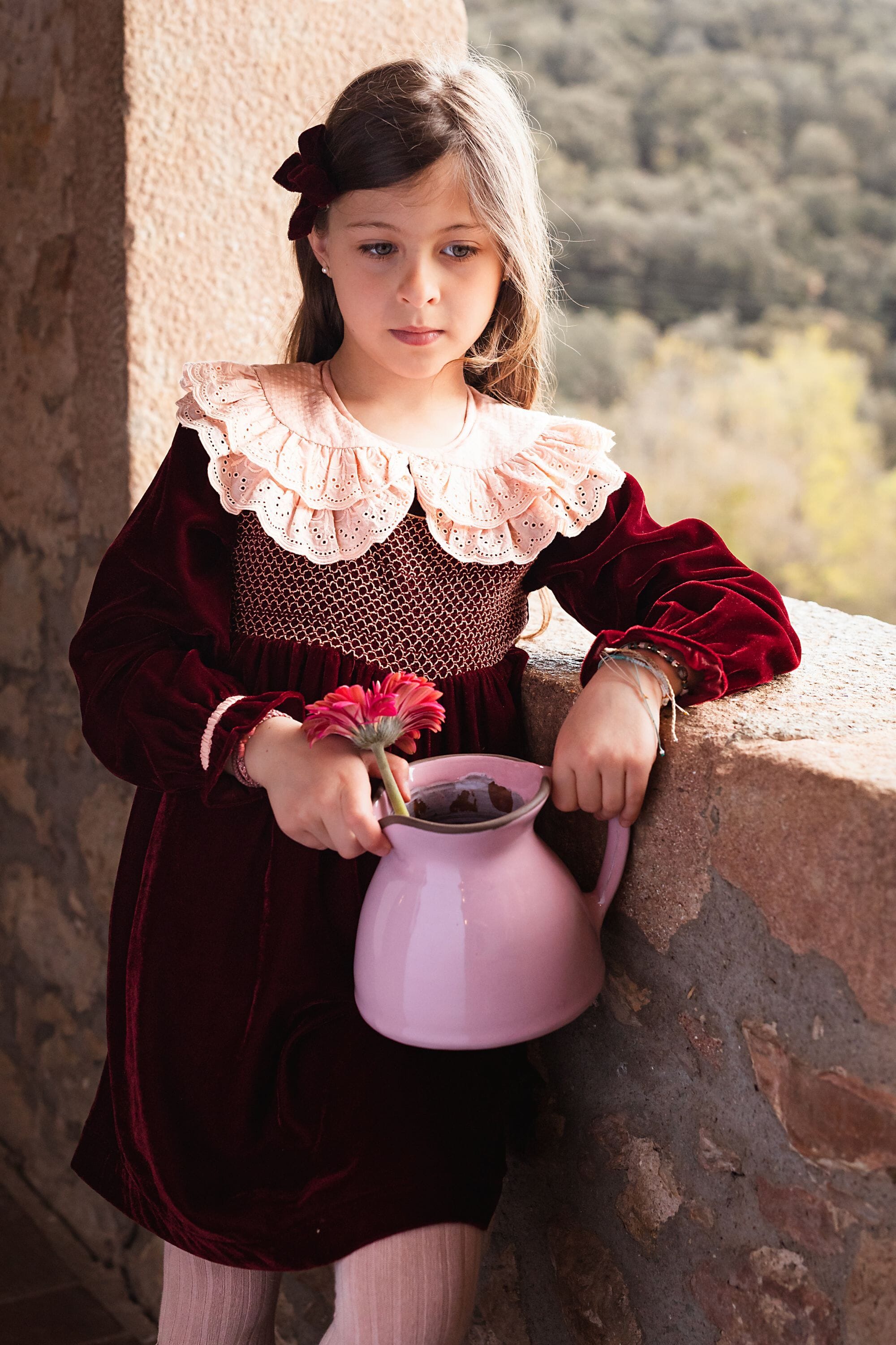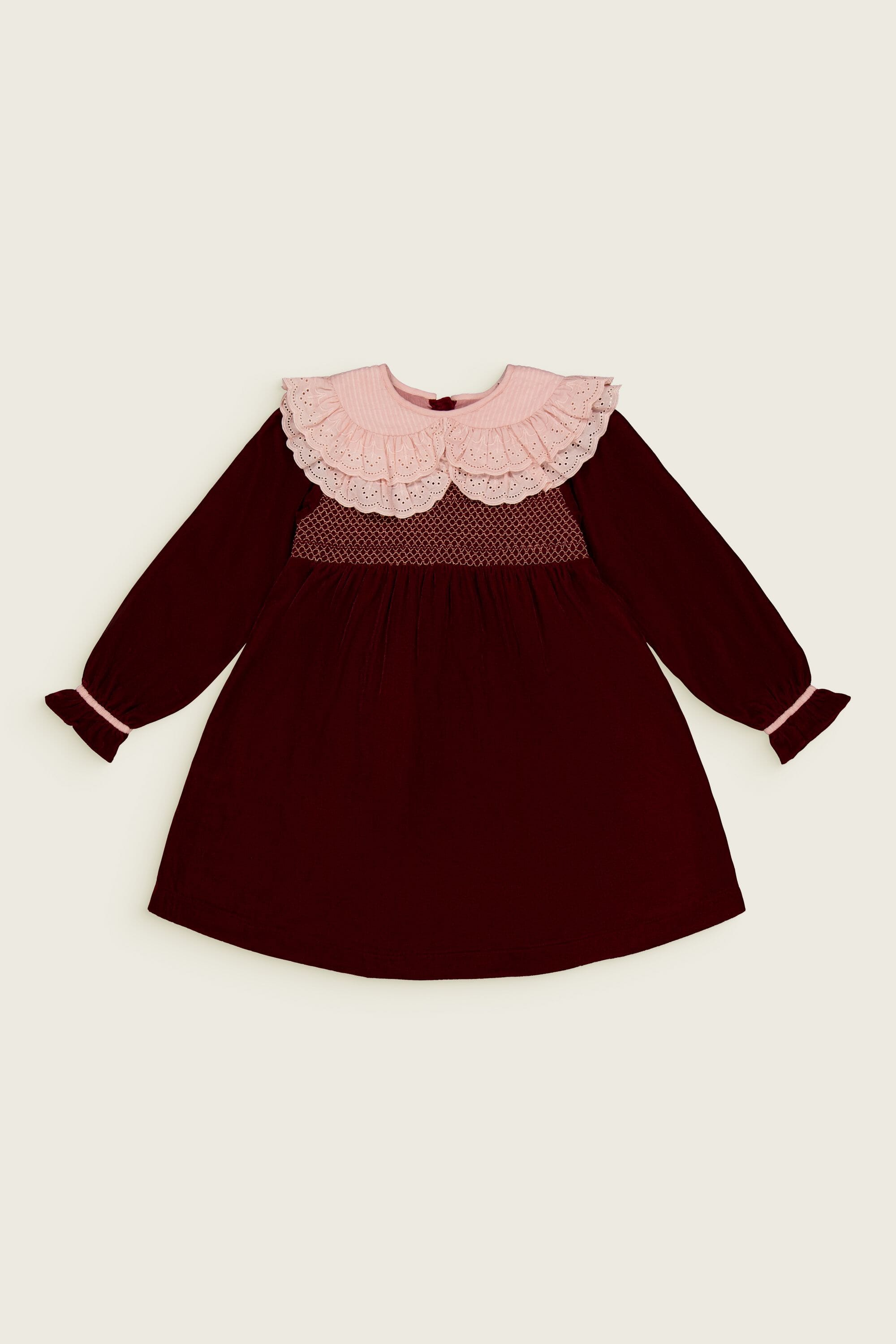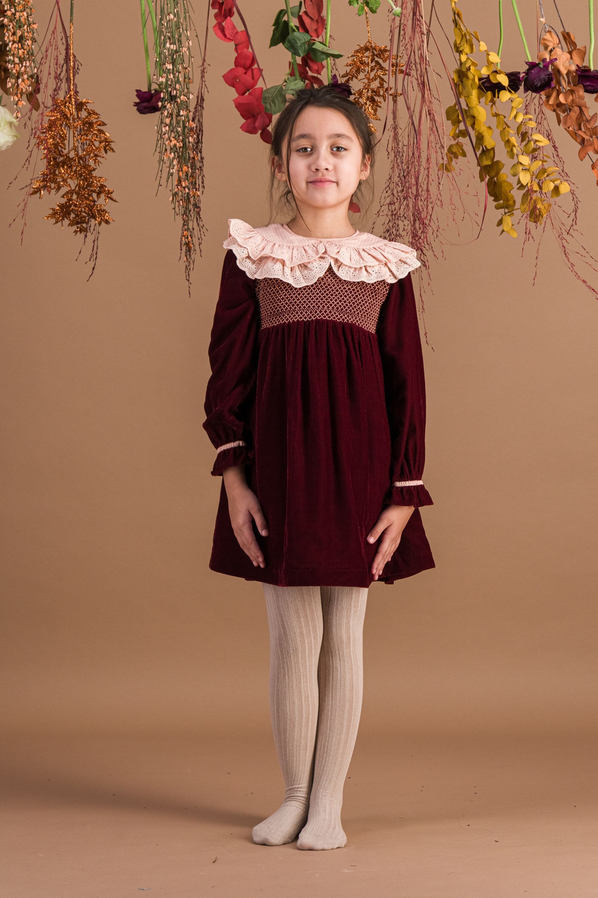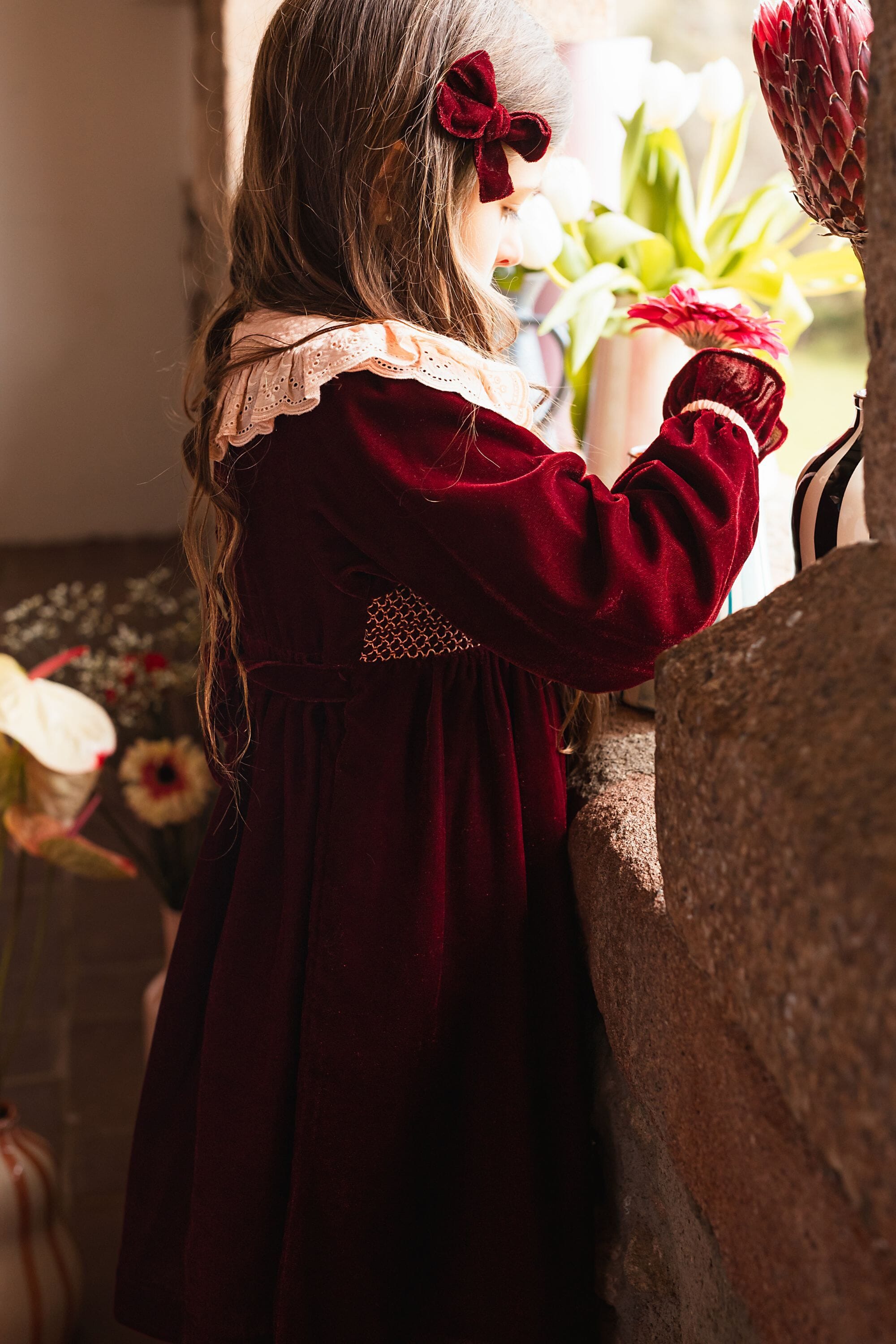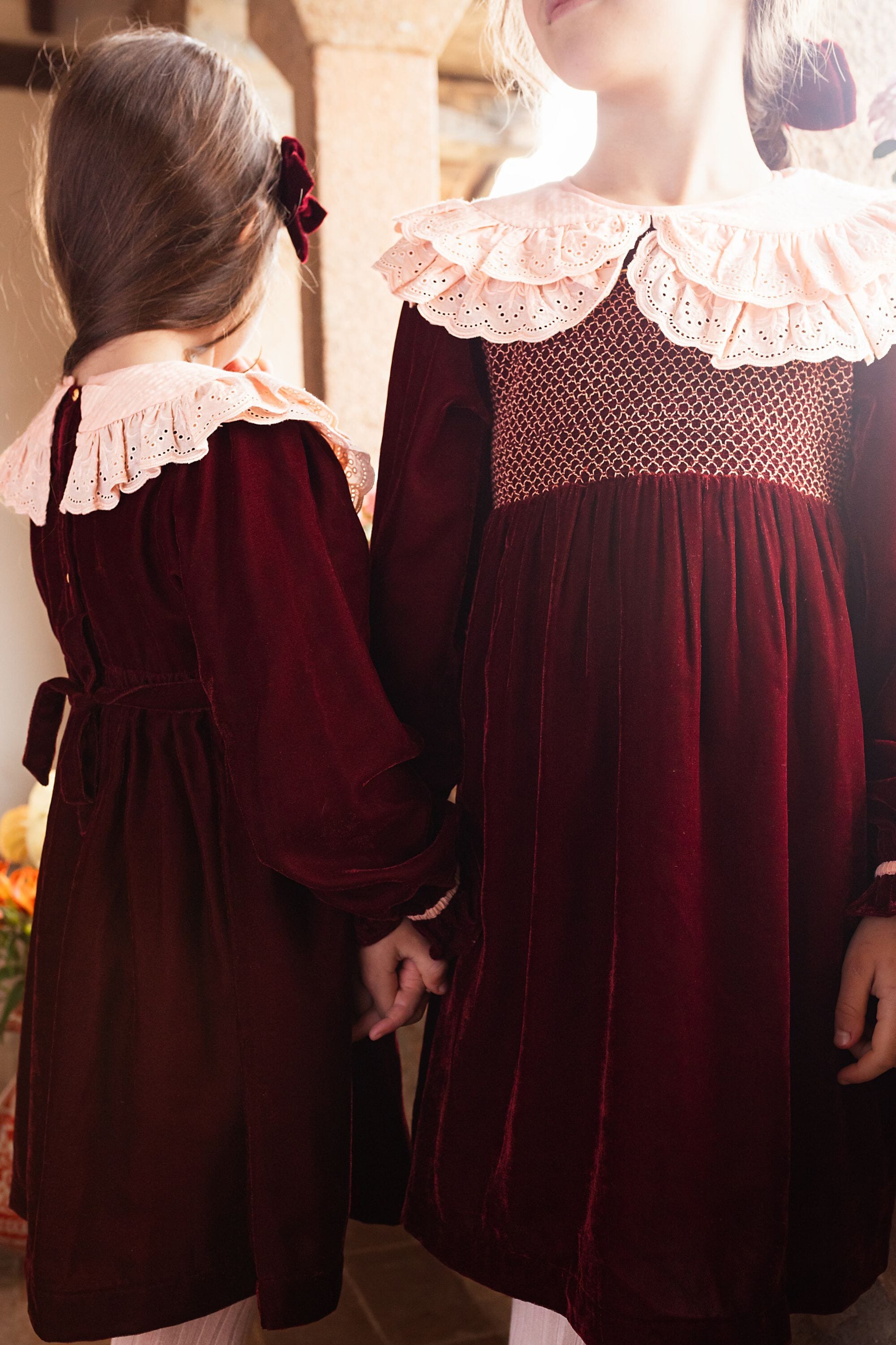 A Burgundy velvet dress with a double Peter Pan collar decorated with broderie anglaise and a beautifully smocked front yoke finished with golden piping.