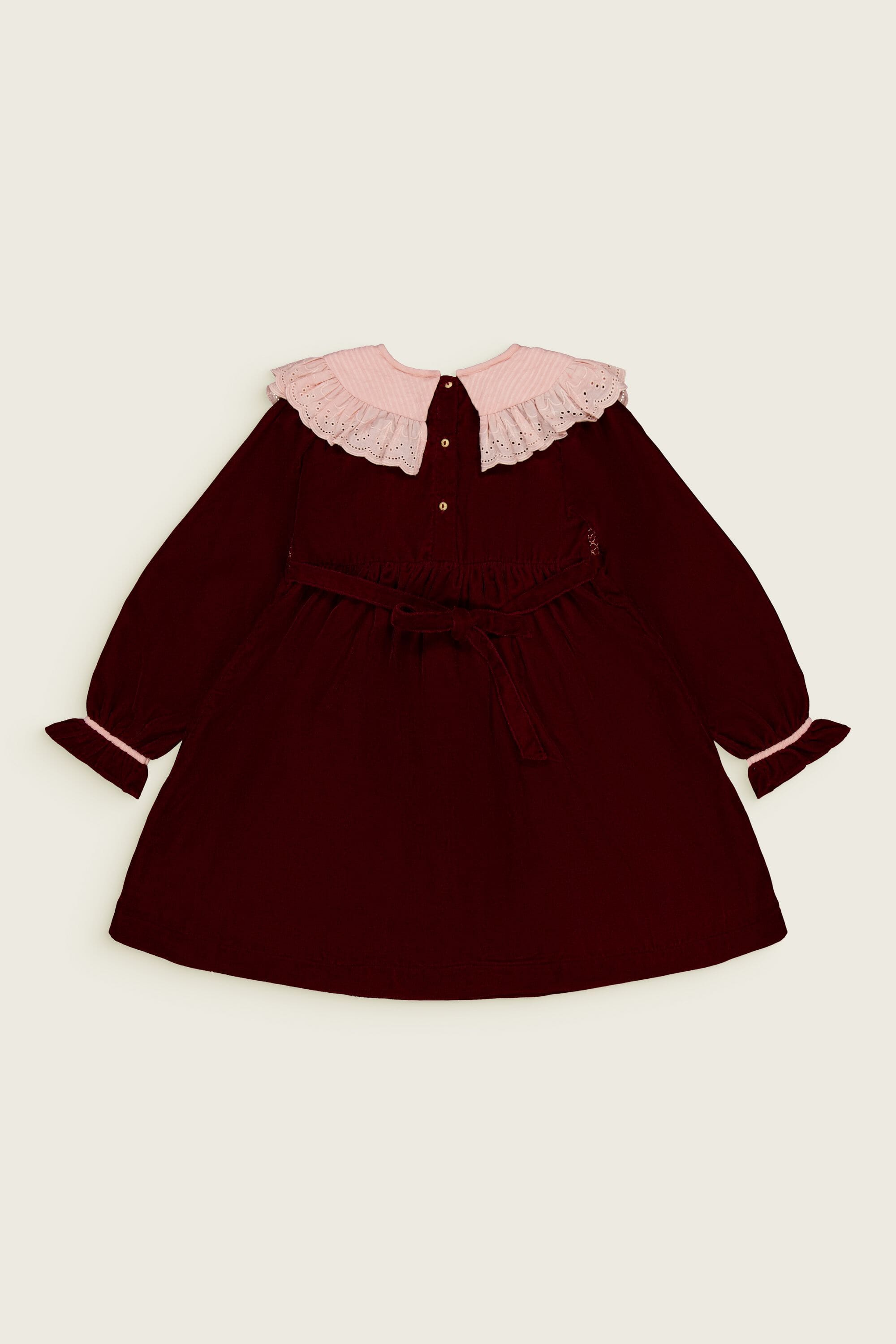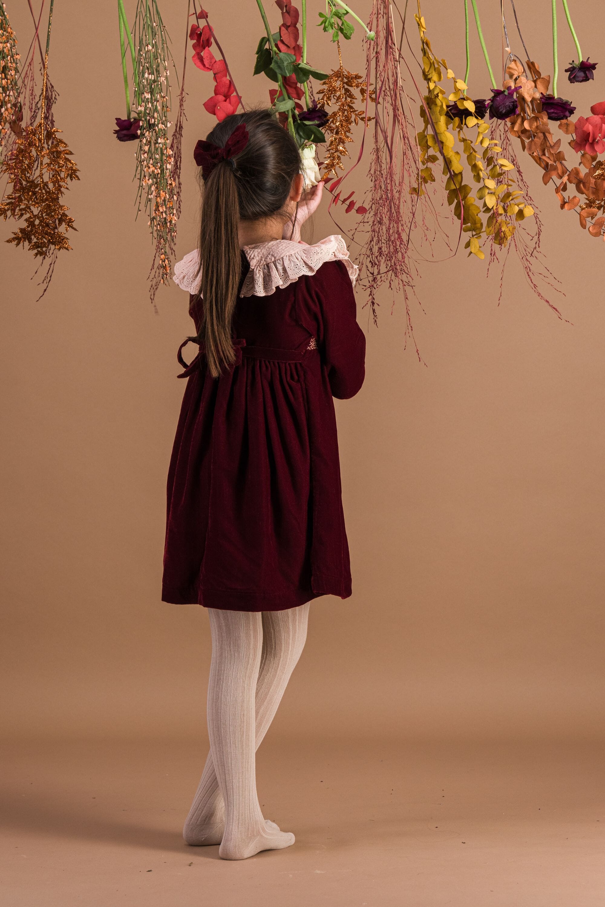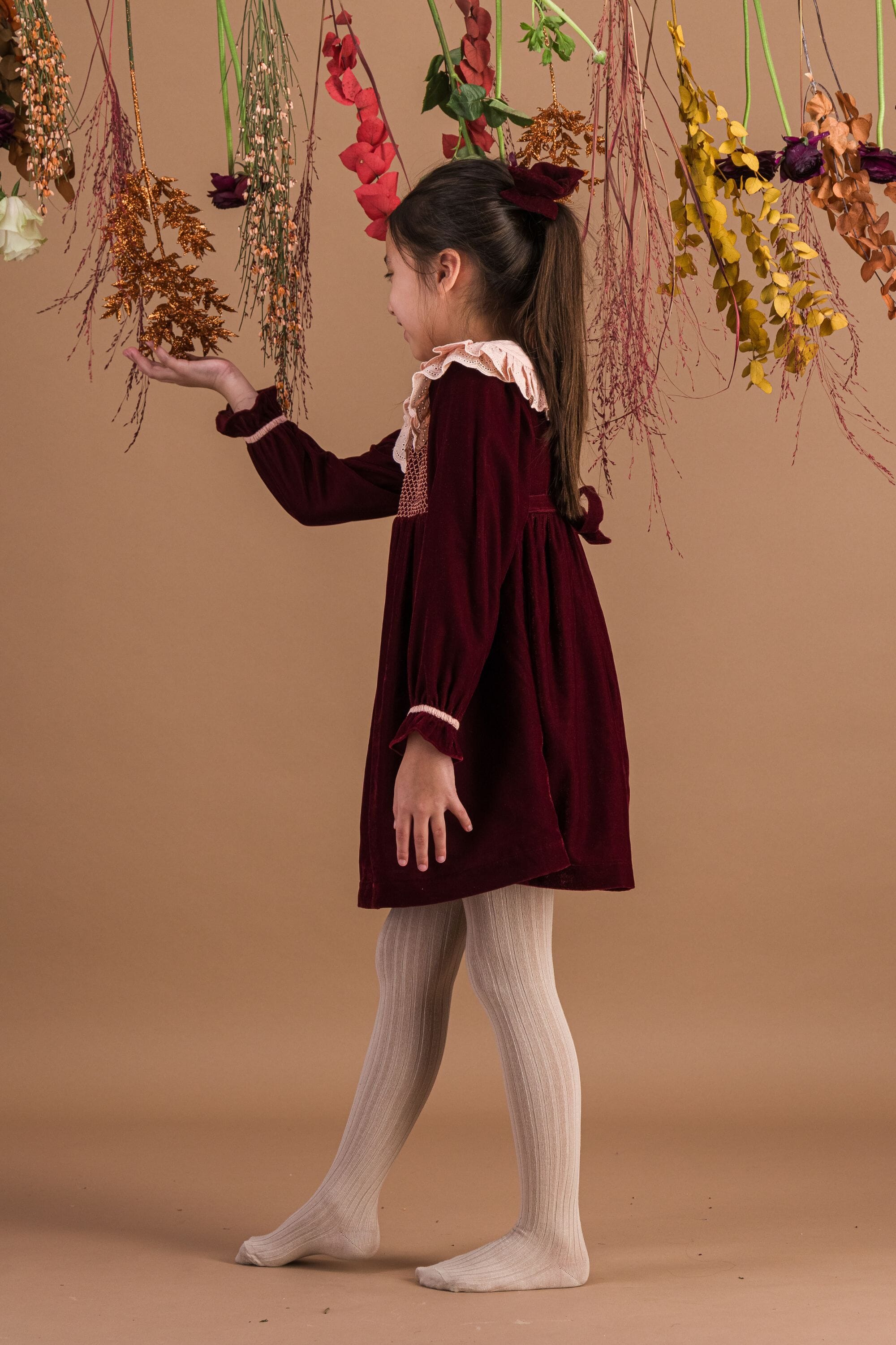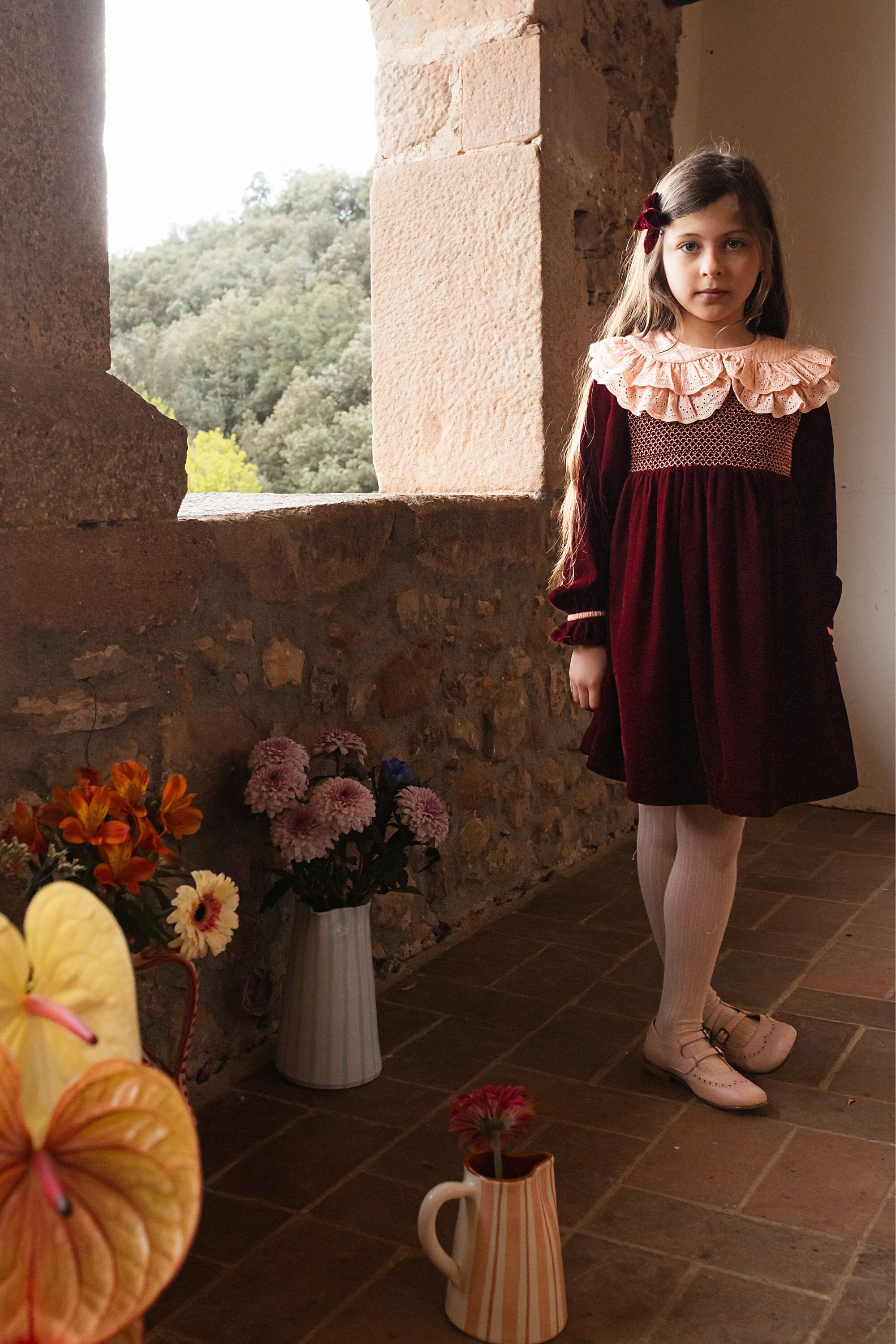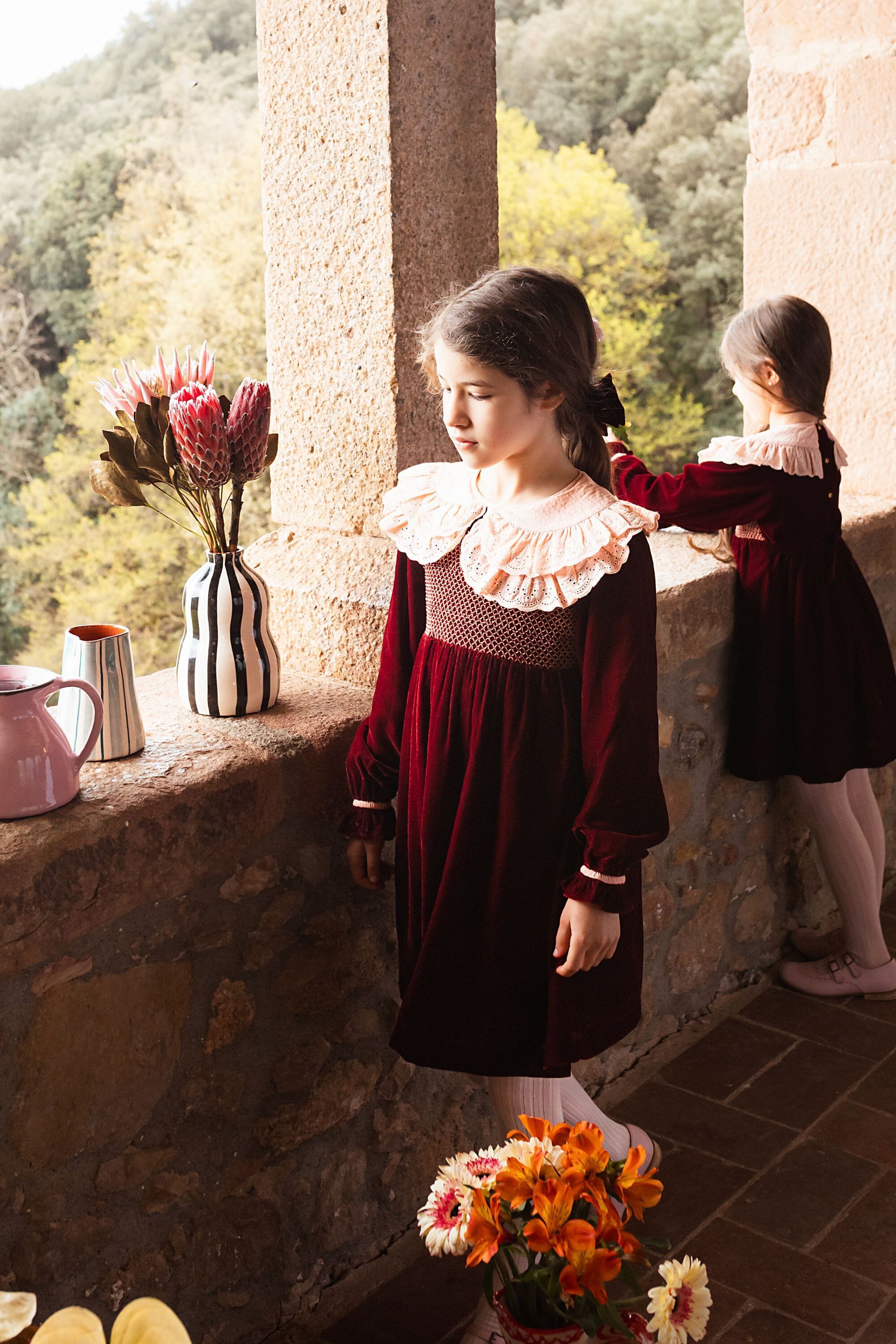 A Burgundy velvet dress with a double Peter Pan collar decorated with broderie anglaise and a beautifully smocked front yoke finished with golden piping.
