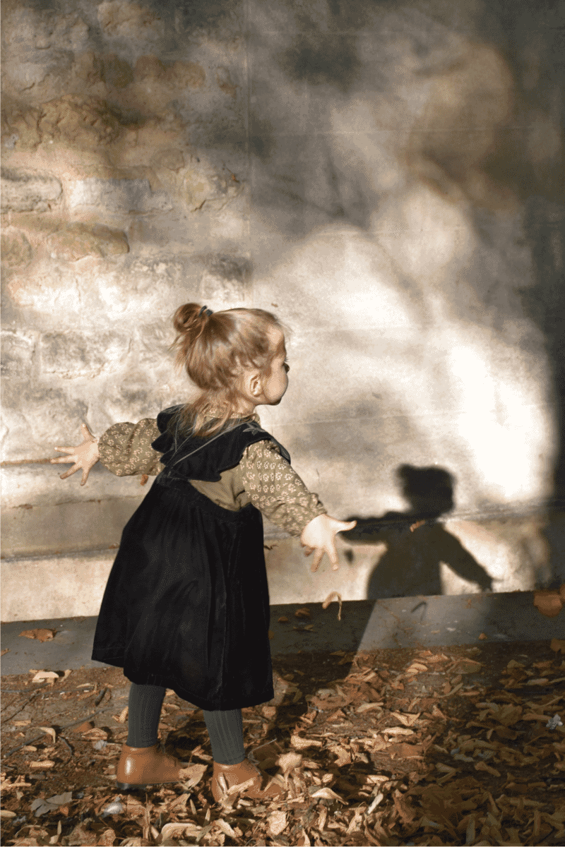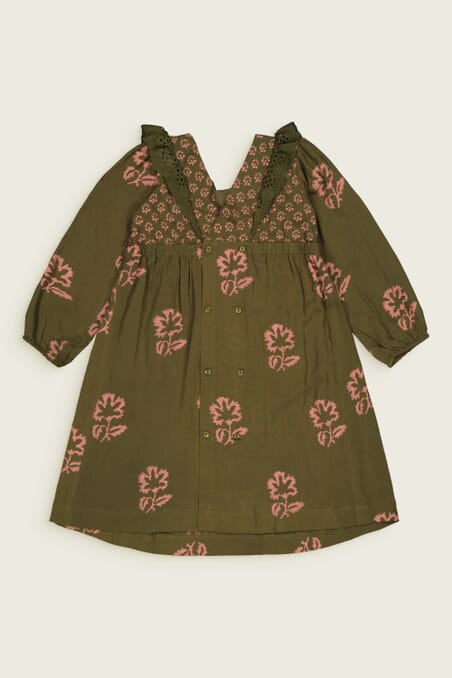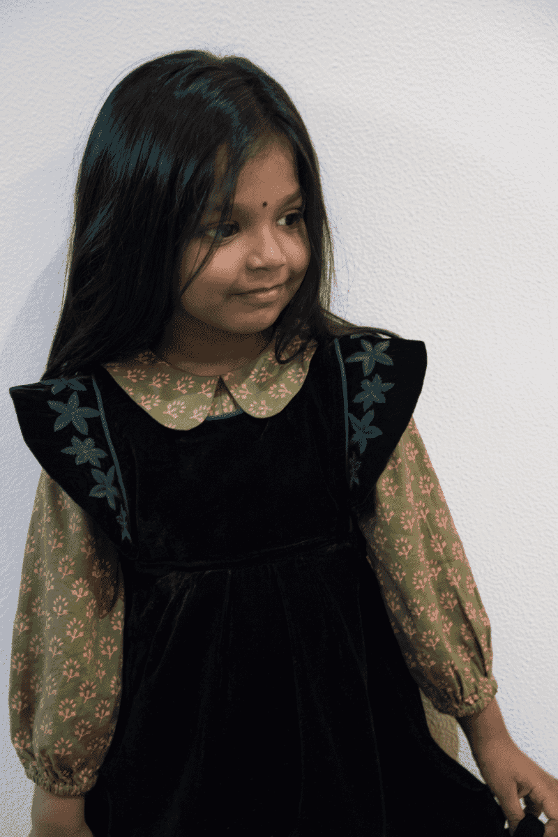 - Midi dress, Velvet, Embroidered ruffled sleeves, Crossed straps at the back, Gathers on the front, Emerald green lining on front and back yoke in organic cotton voile.