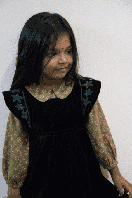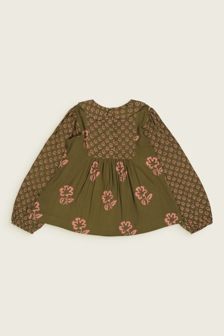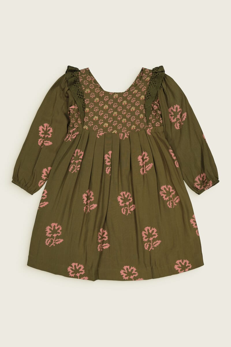 - Apron dress, 100% ECOVERO® Viscose, Block print, Hand embroidery on chest prints, Cotton crochet lace, Buttoned at the back, Fully lined with an olive-colored organic cotton veil, Elastic sleeve at the cuffs.