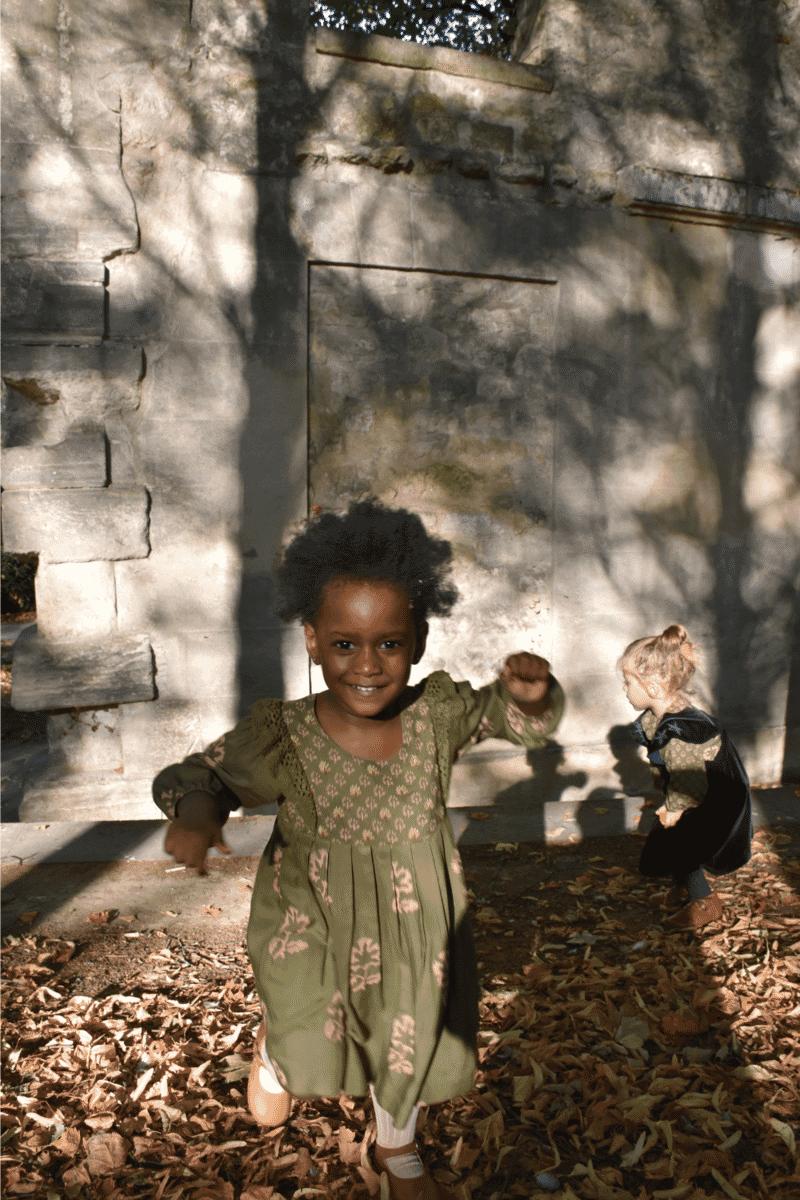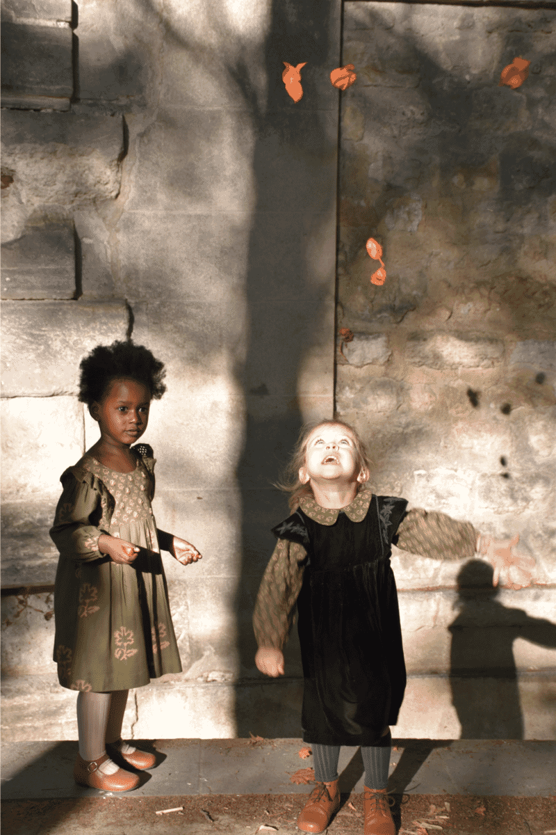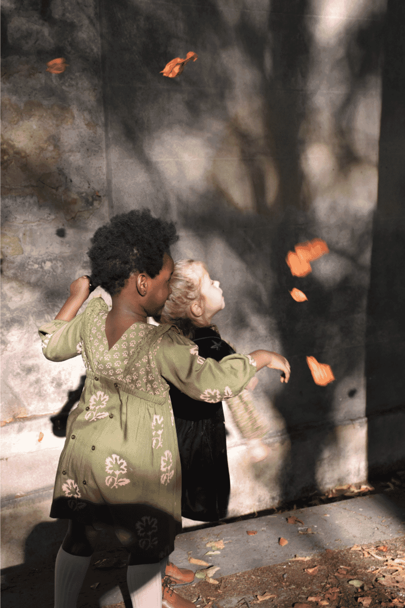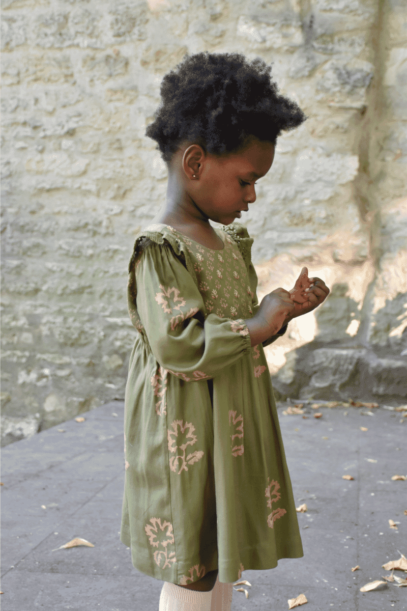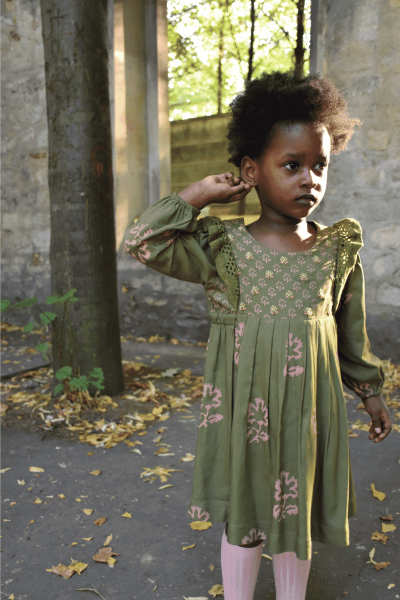 Our iconic Simone Dress with long sleeves ! An apron dress in ECOVERO® Viscose with its pretty hand embroidery on the chest and sublimated by a block print, a print made by hand with a wooden stamp.