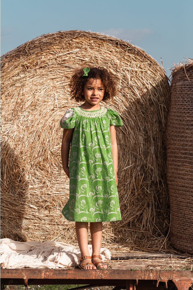 - Dress, 100% Organic cotton voile, Block print, Fully embroidered ruffled sleeves, Hand embroideries, smocked and embroidered collar, One buttoned drop at the back.