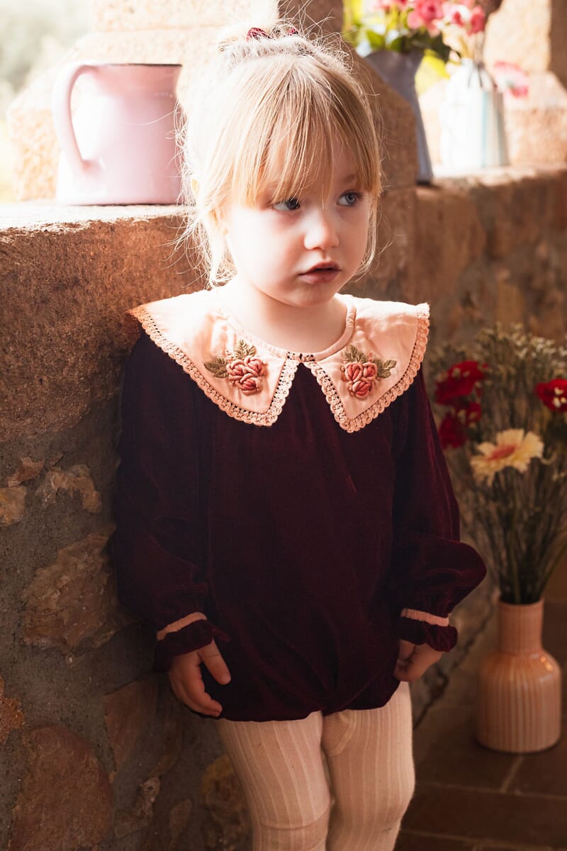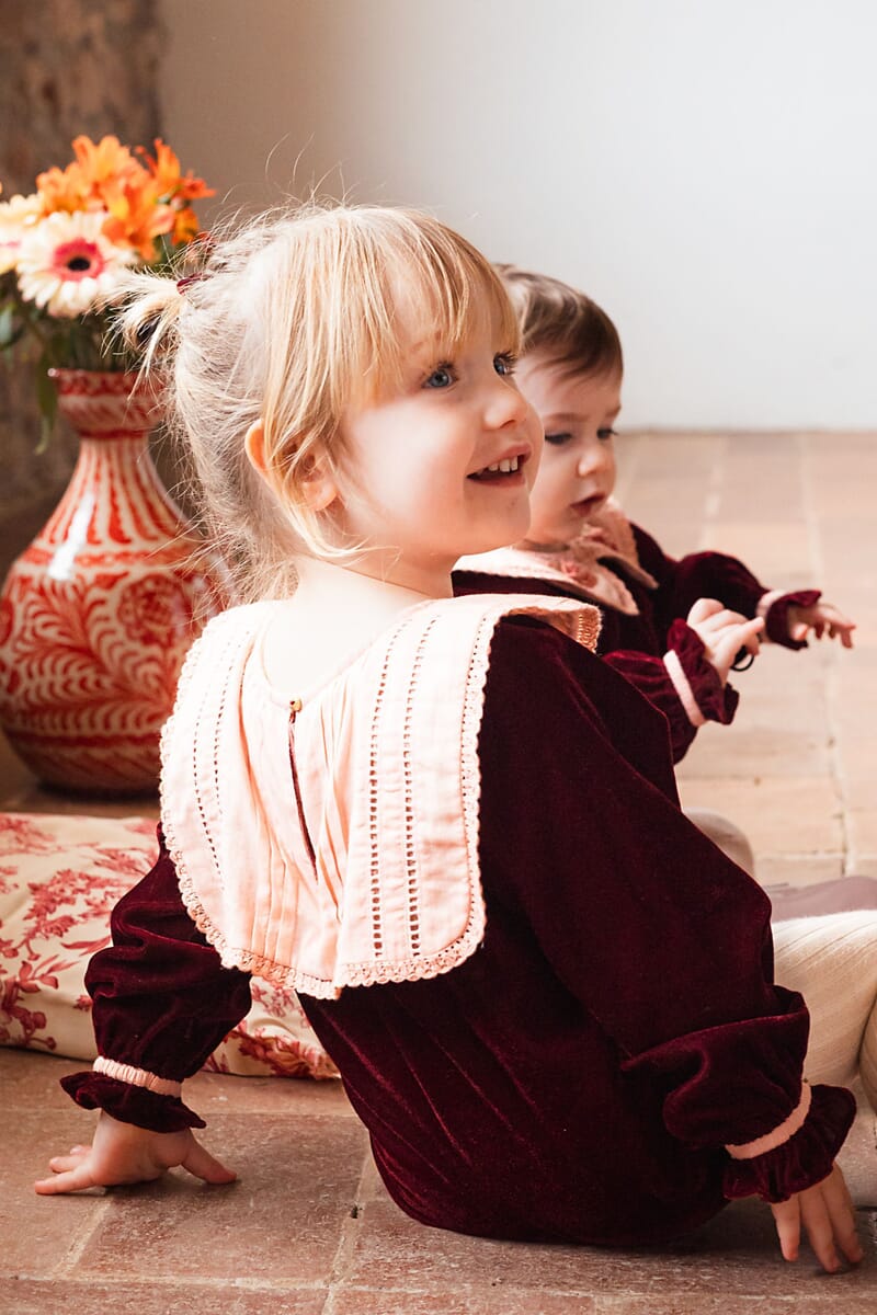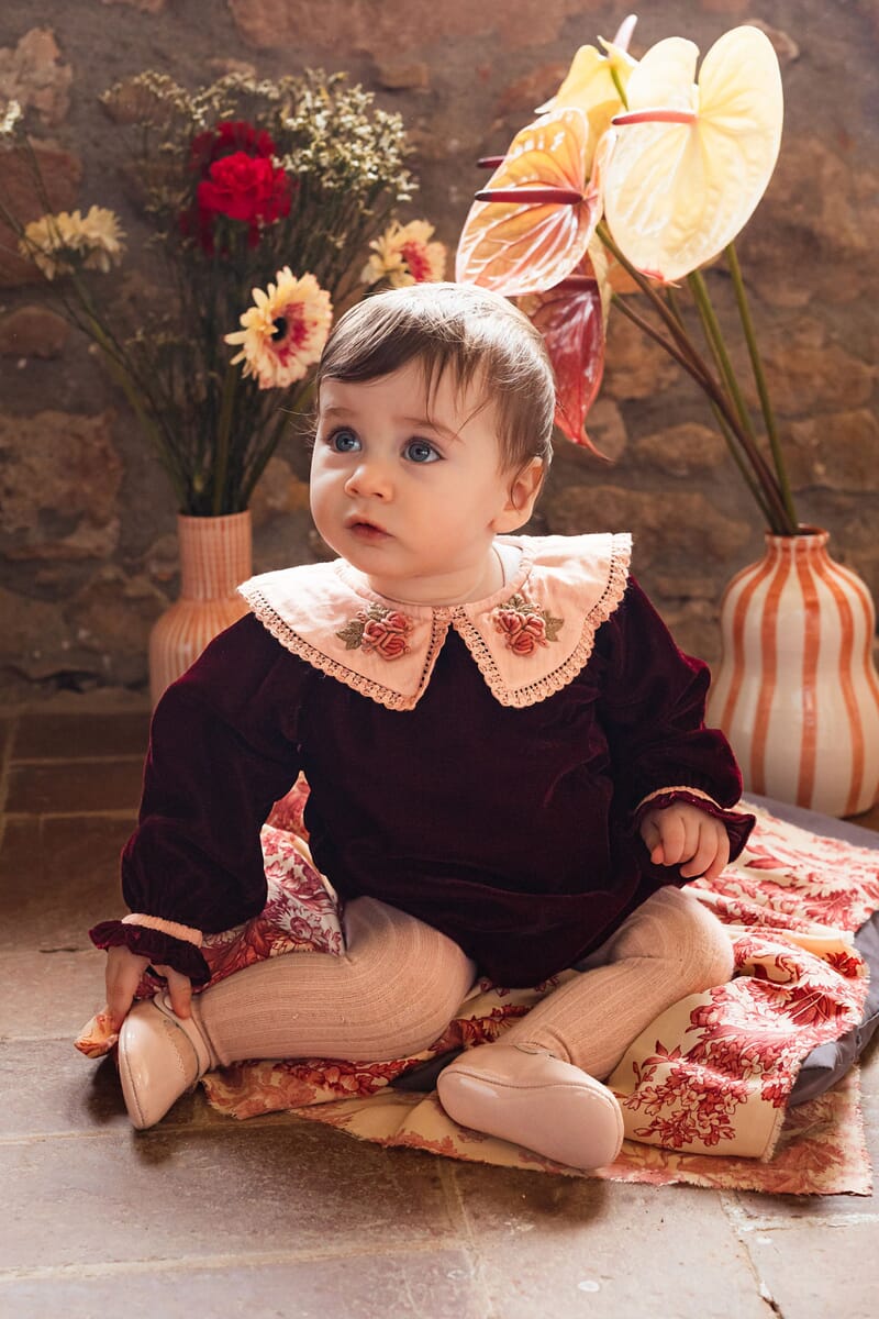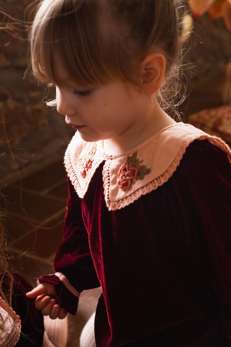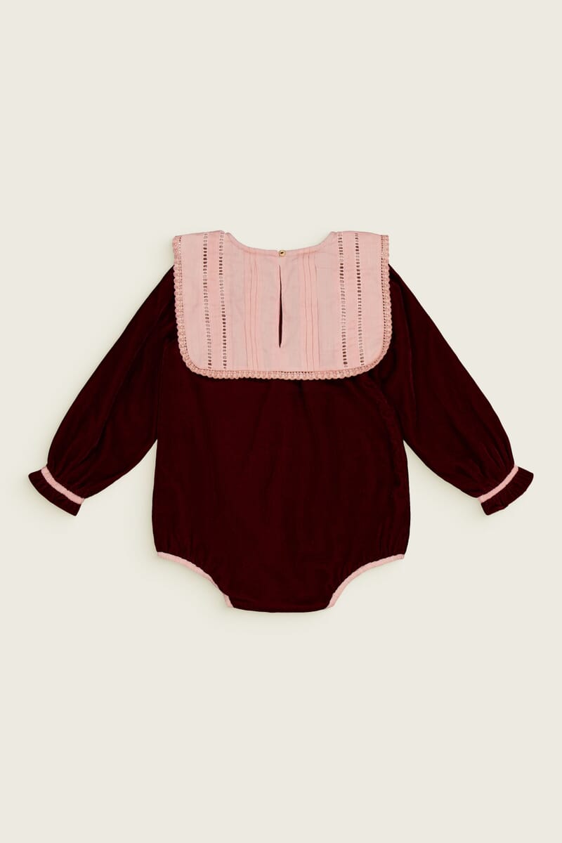 - Romper, Velvet in Burgundy color, Plain lining in organic cotton voile, hand embroidered collar with lace trim, Ladder lace, Long elasticated sleeves, Golden snap buttons at the crotch, Golden buttons at the back.