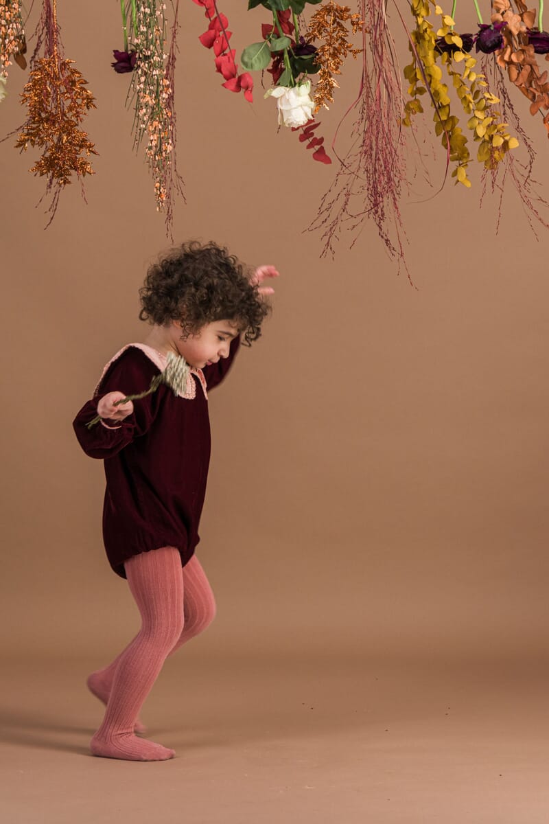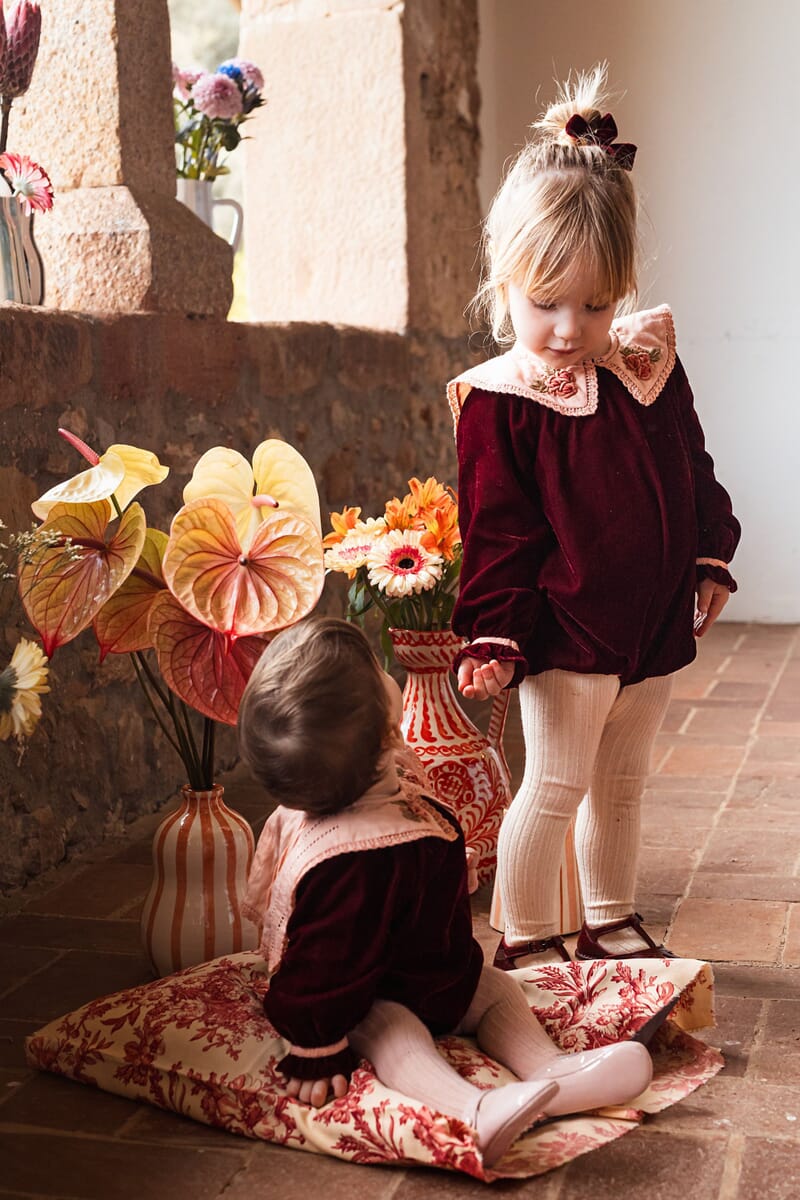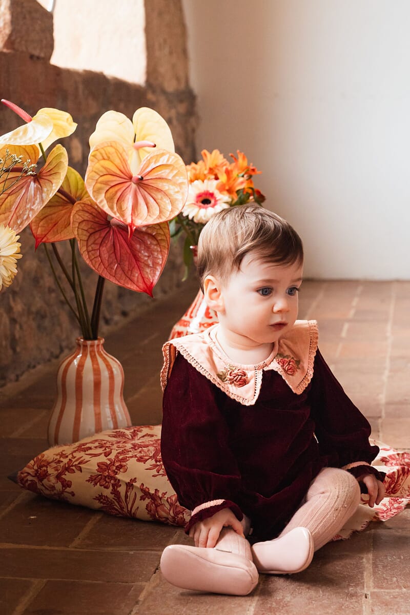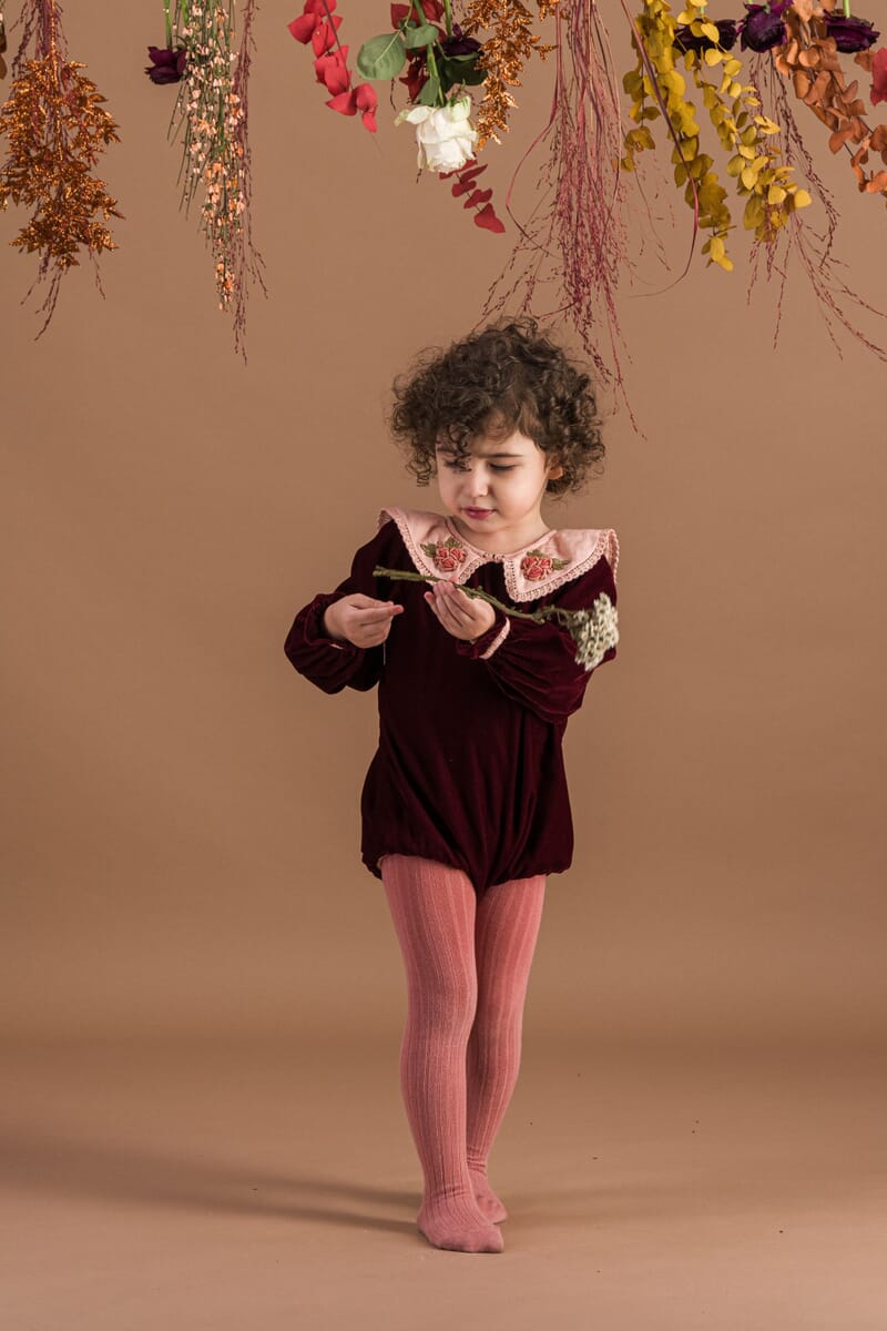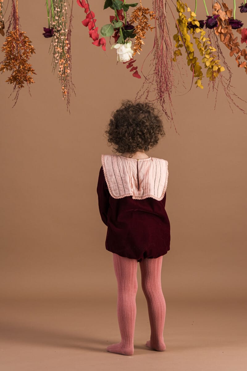 - Romper, Velvet in Burgundy color, Plain lining in organic cotton voile, hand embroidered collar with lace trim, Ladder lace, Long elasticated sleeves, Golden snap buttons at the crotch, Golden buttons at the back.